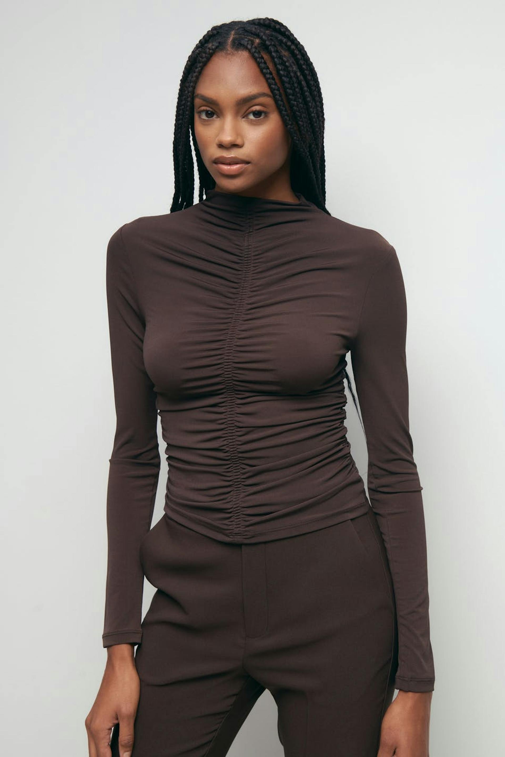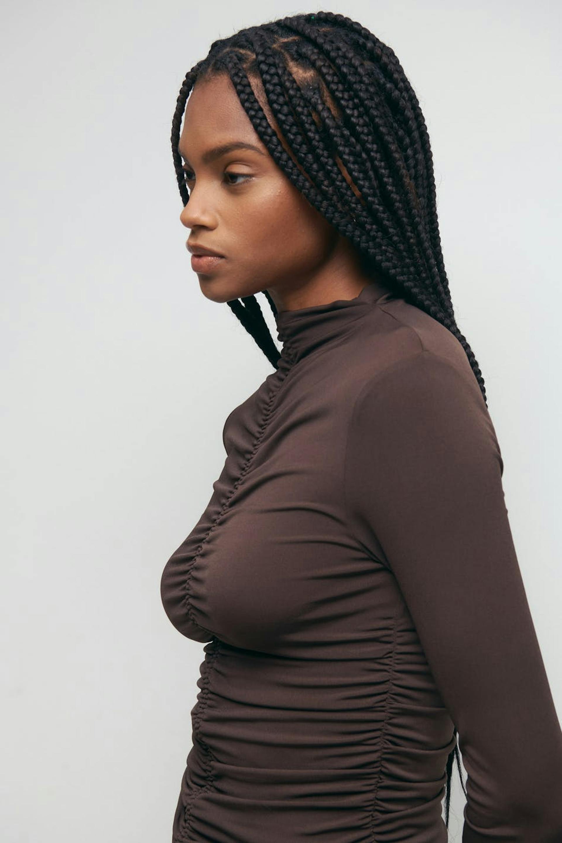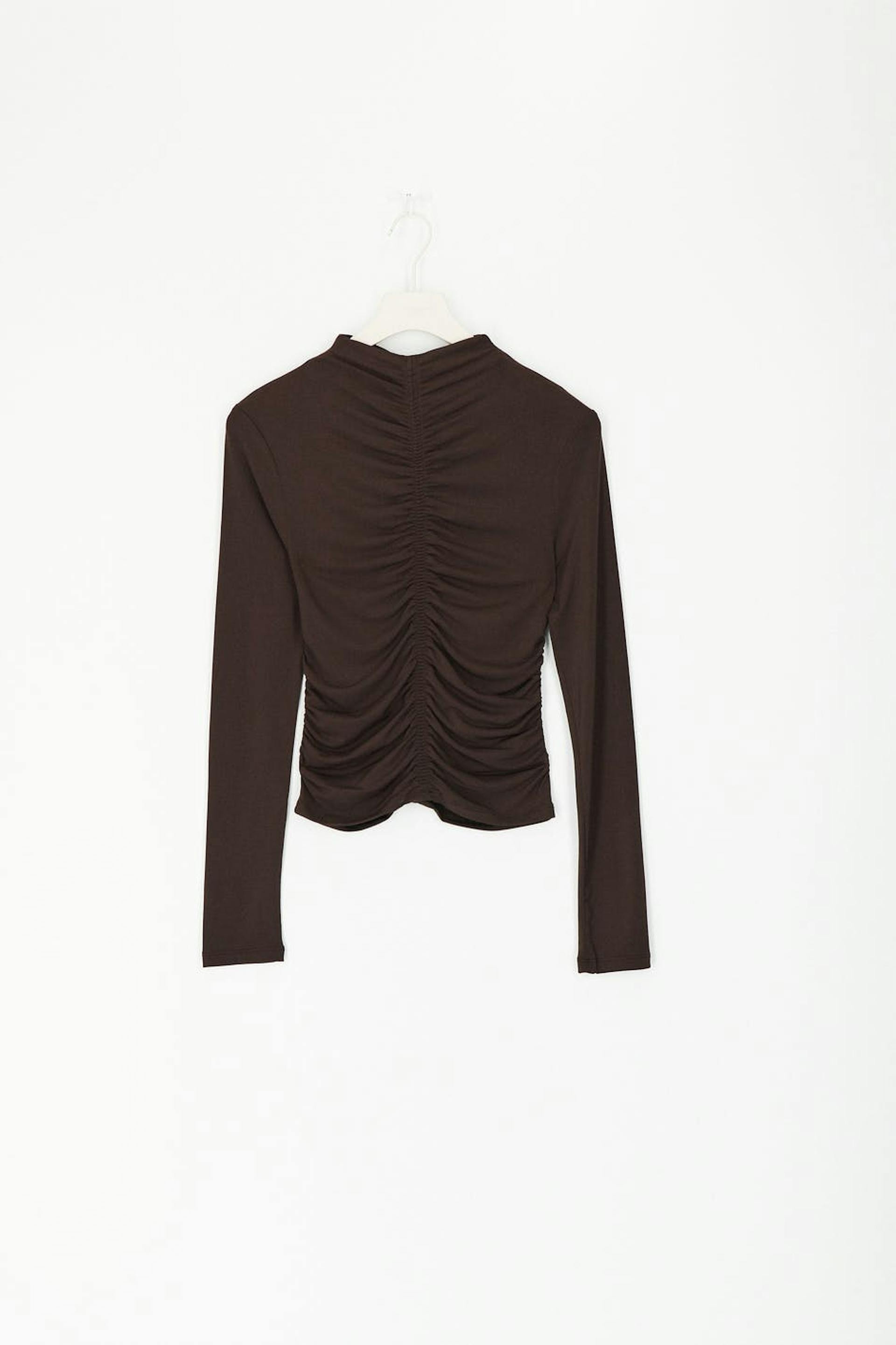 Long-sleeved top in jersey with gathered effect. The top is brown and has a fitted fit.