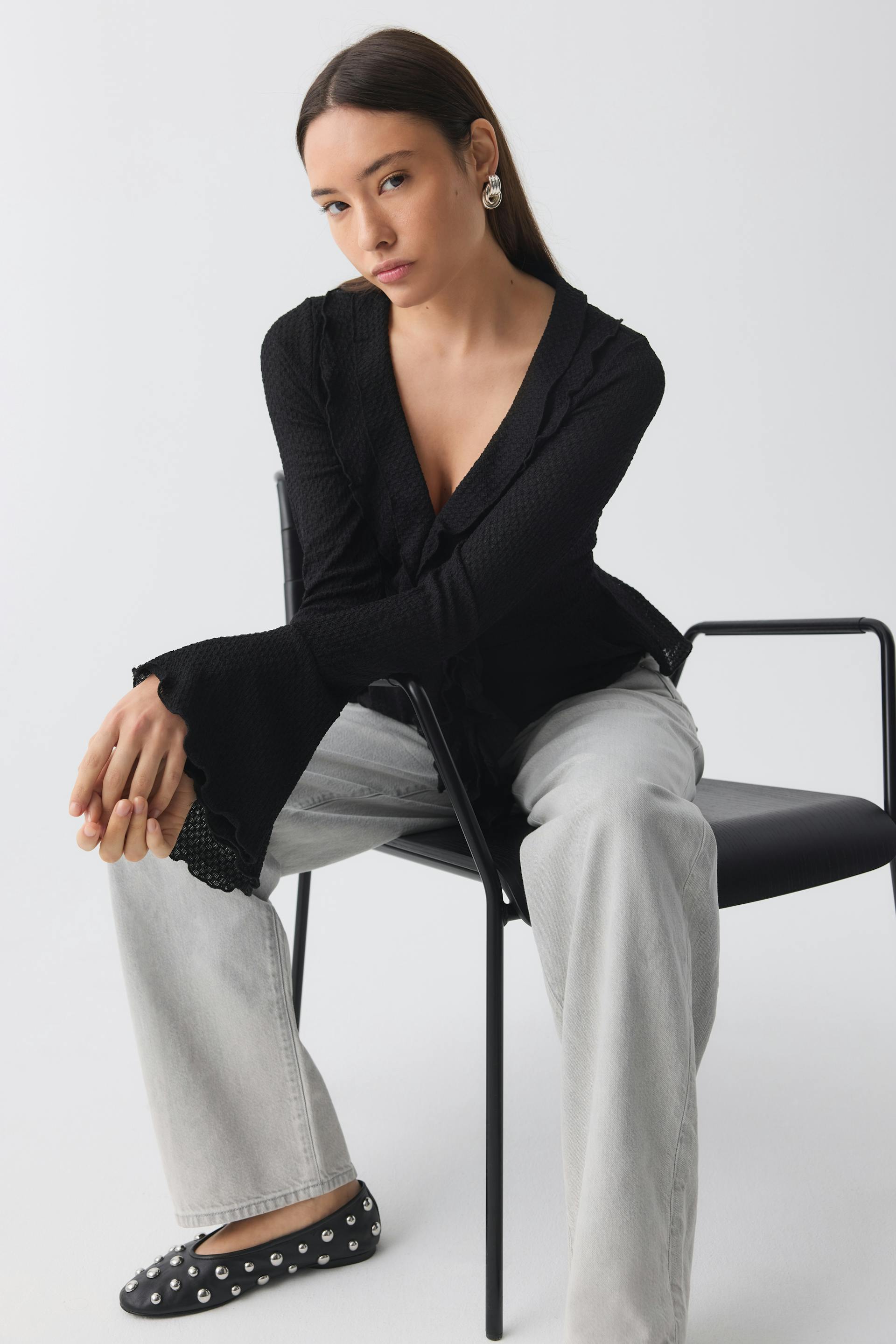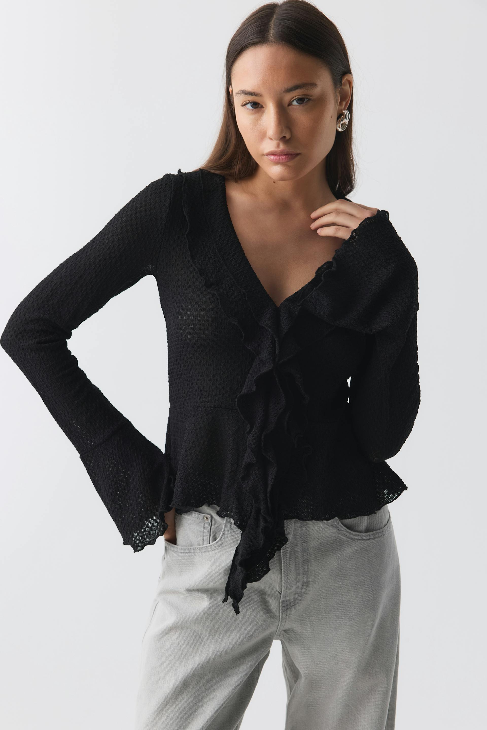 Structured top with frill details at the front and on the neckline. The top is black and has V-neck. It has lantern sleeve and cropped length.