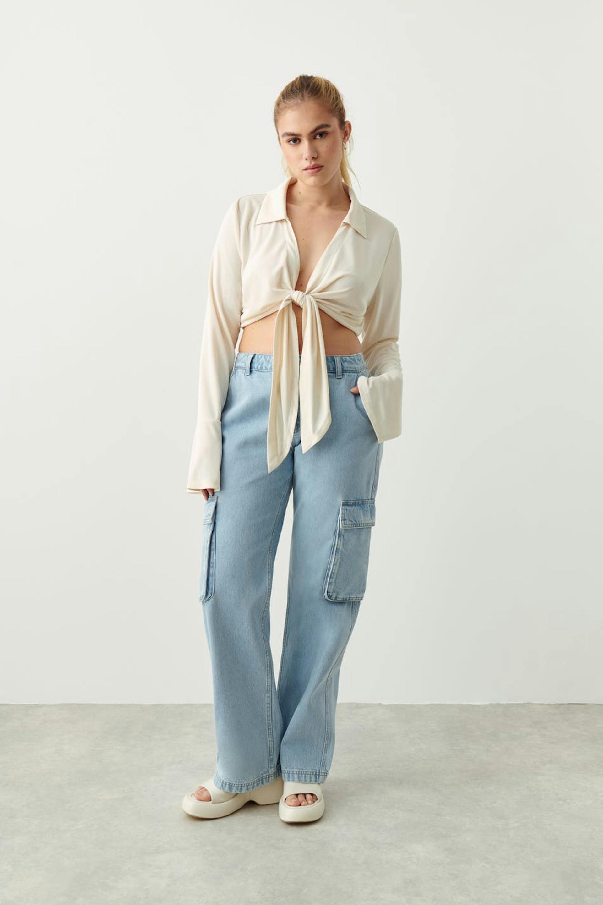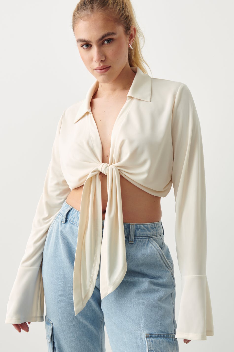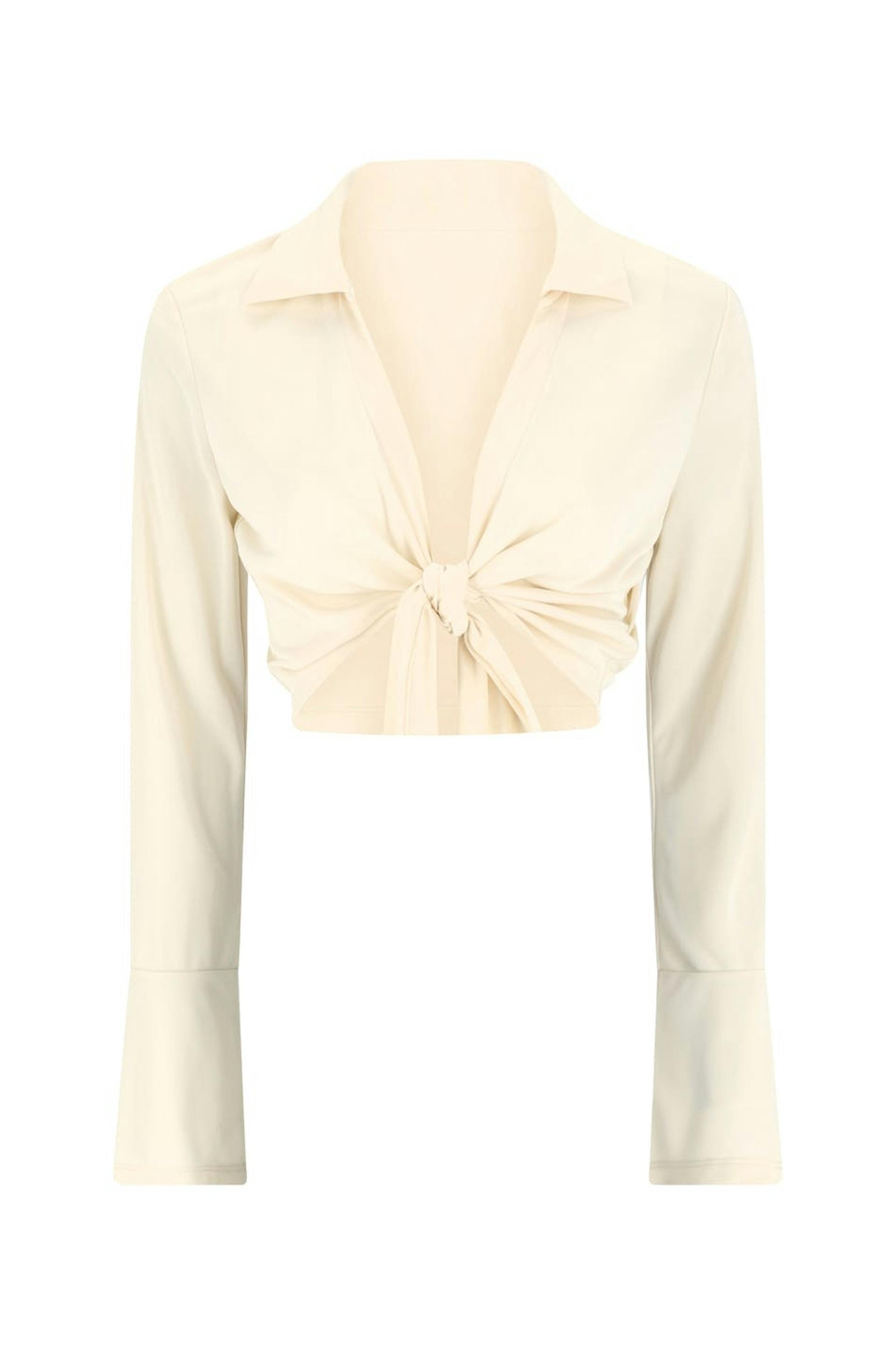 Cropped top with knot closure at the front. The top is white and has v-neck. It has collar and long, flared sleeve with cuff.