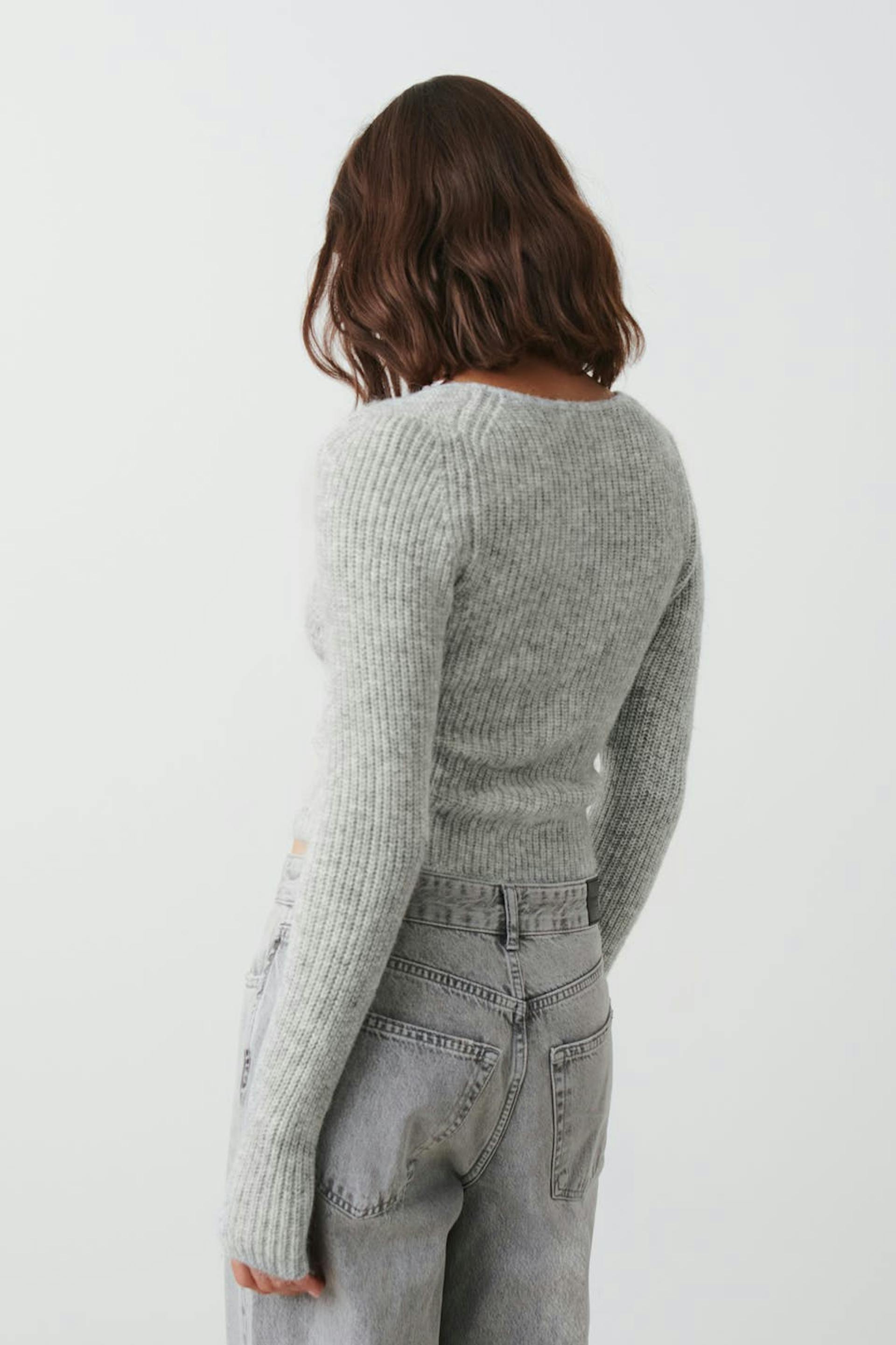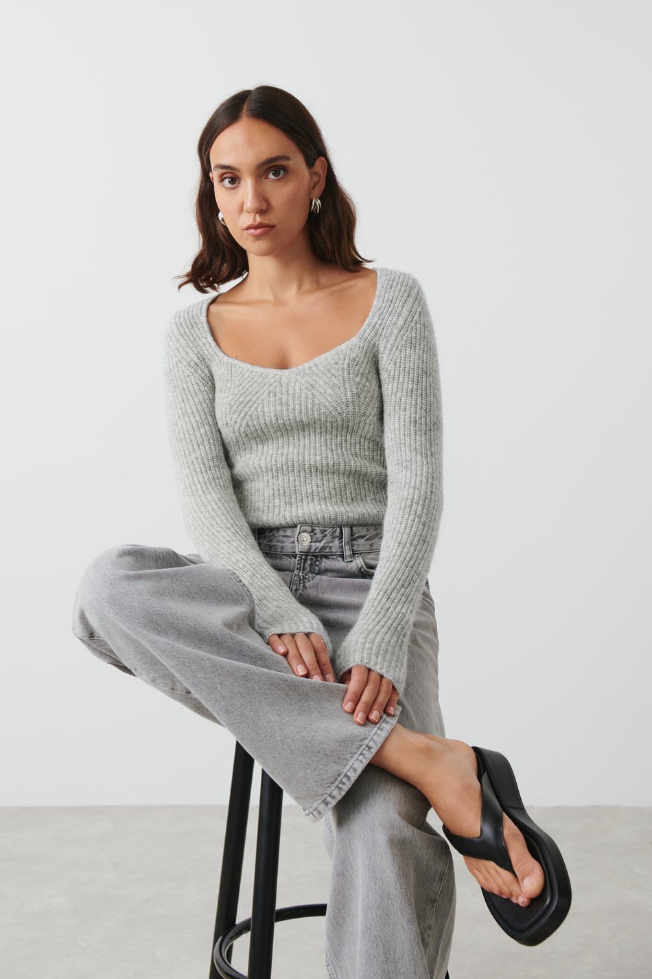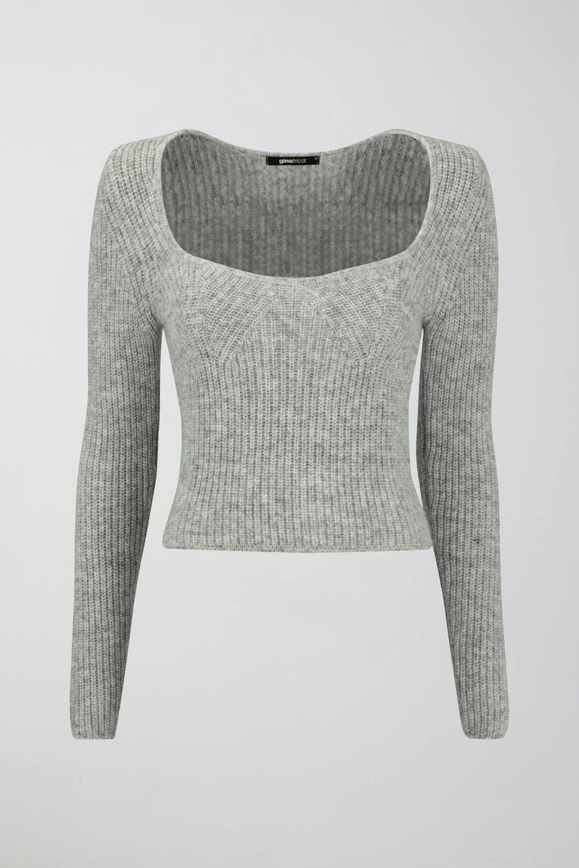 Knitted top with sweetheart neckline. The top is grey and has long sleeve. It has fully-fashioned sections below the bust.