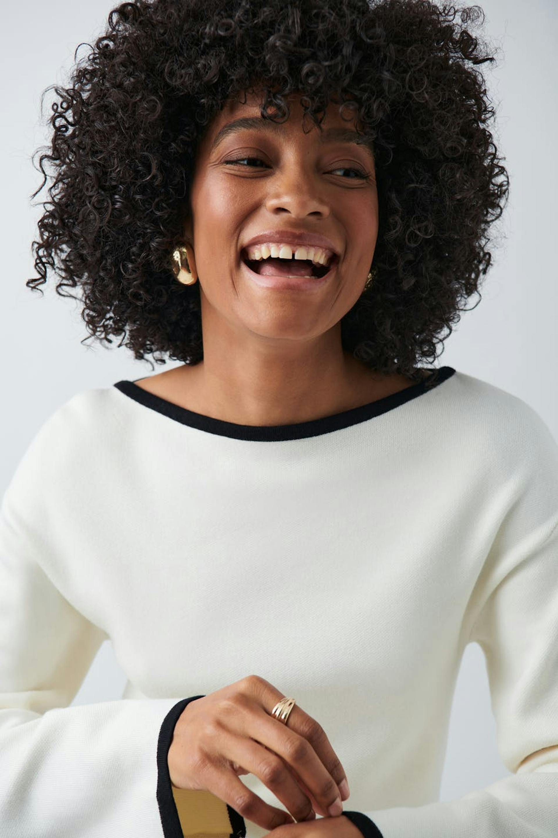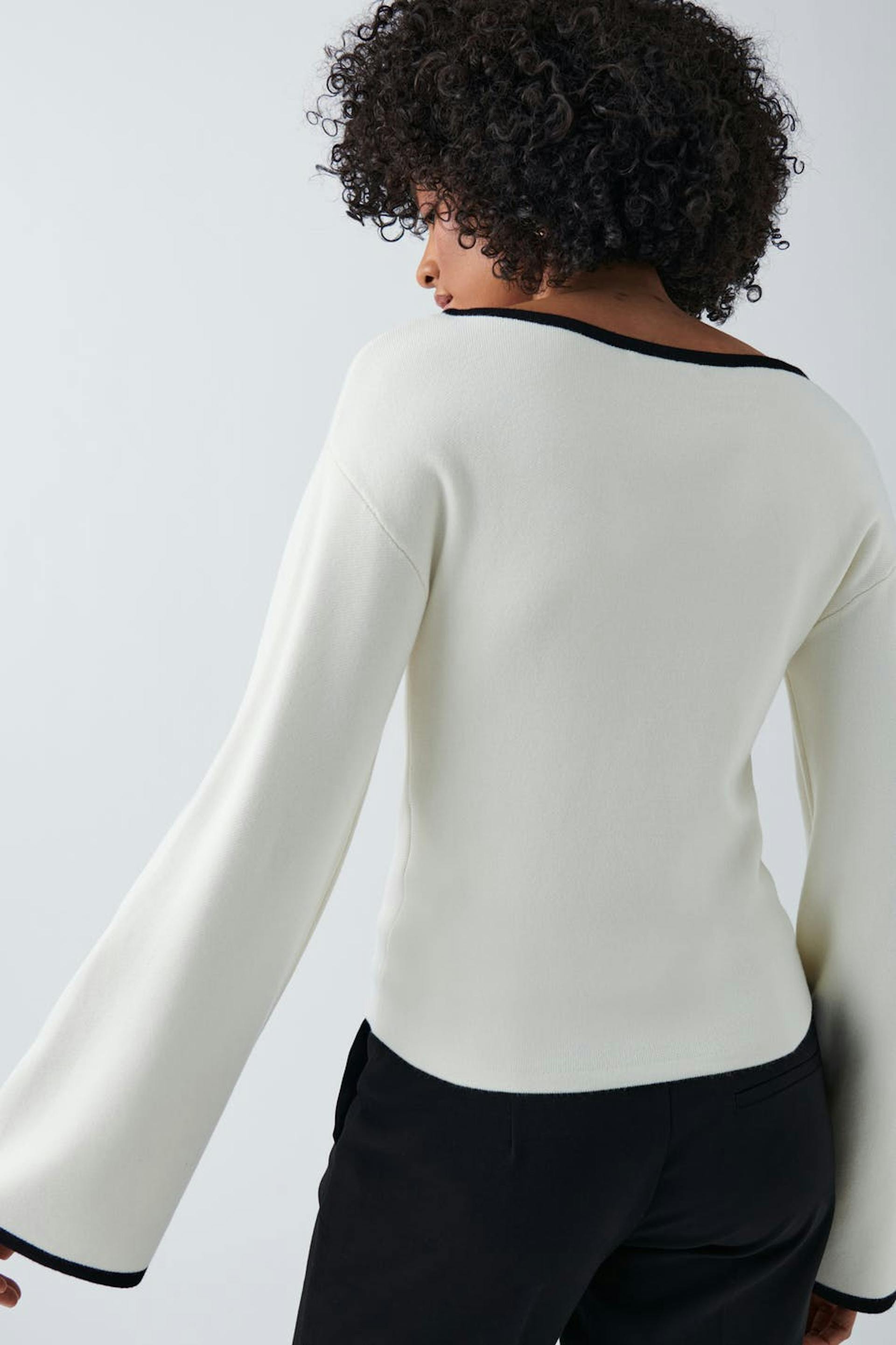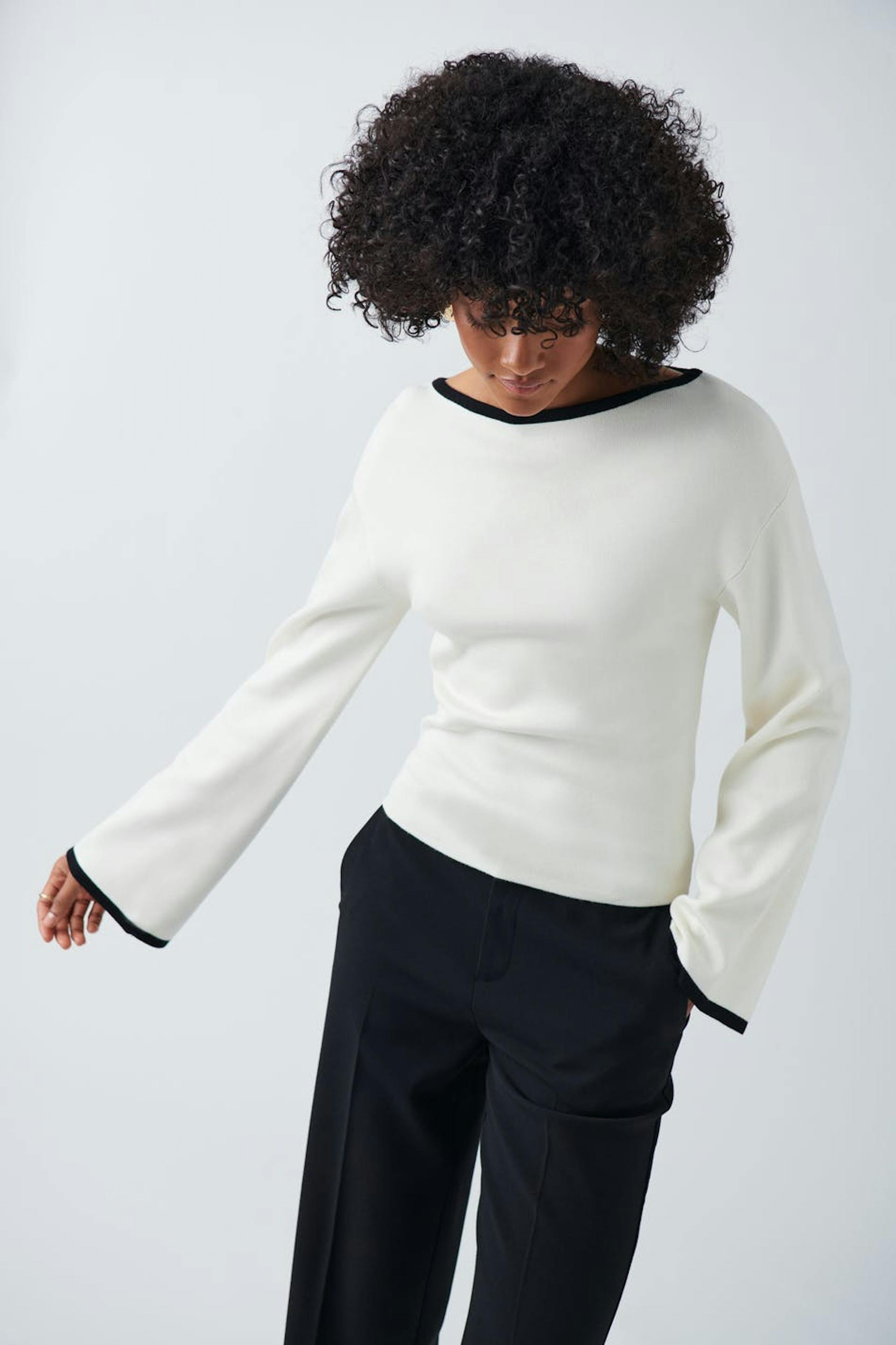 Knitted top with wide neckline. The top is white and has vertical stripes. It has long, wide sleeve and contrast-coloured details at sleeve ends and on the neckline.