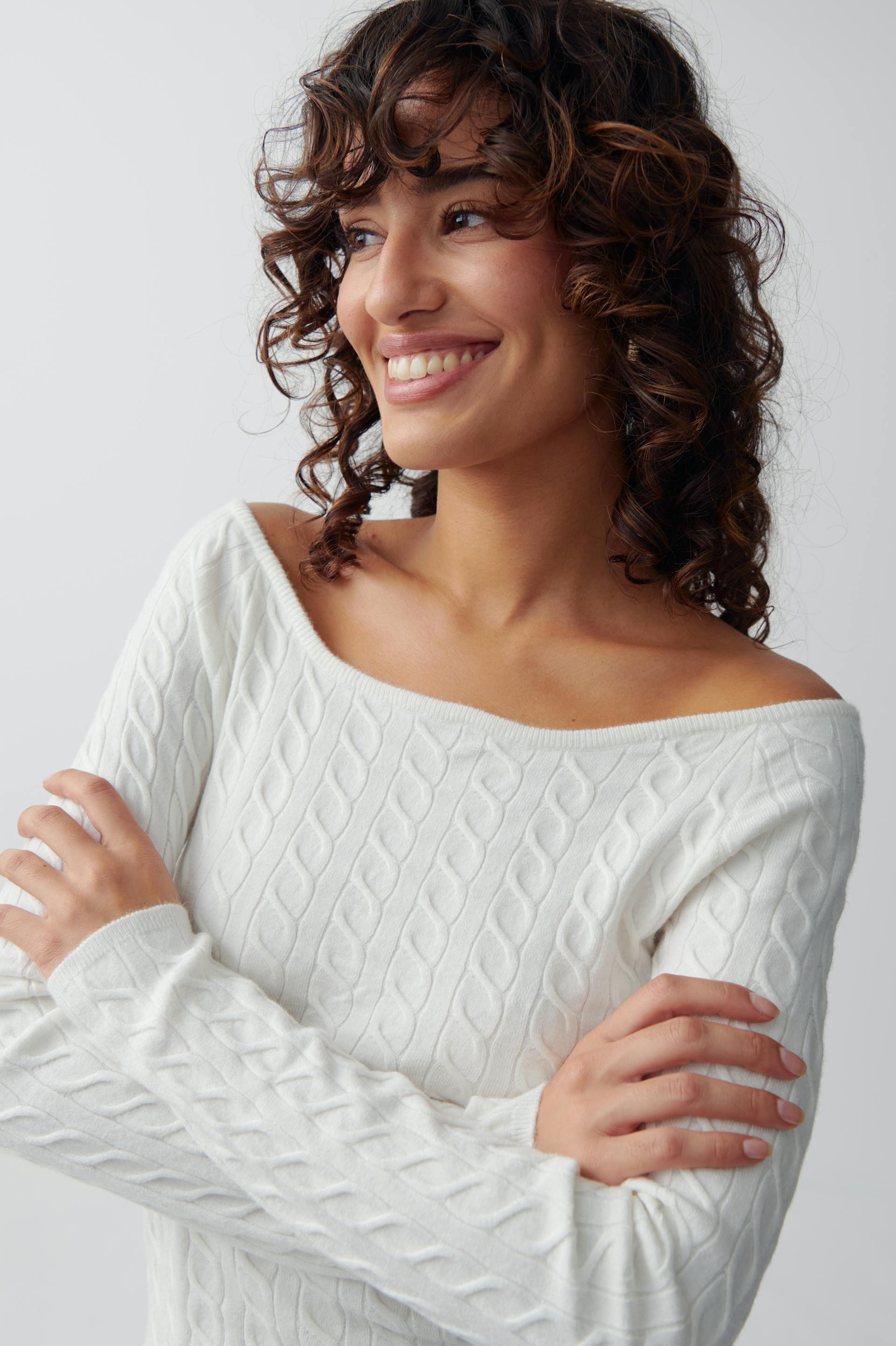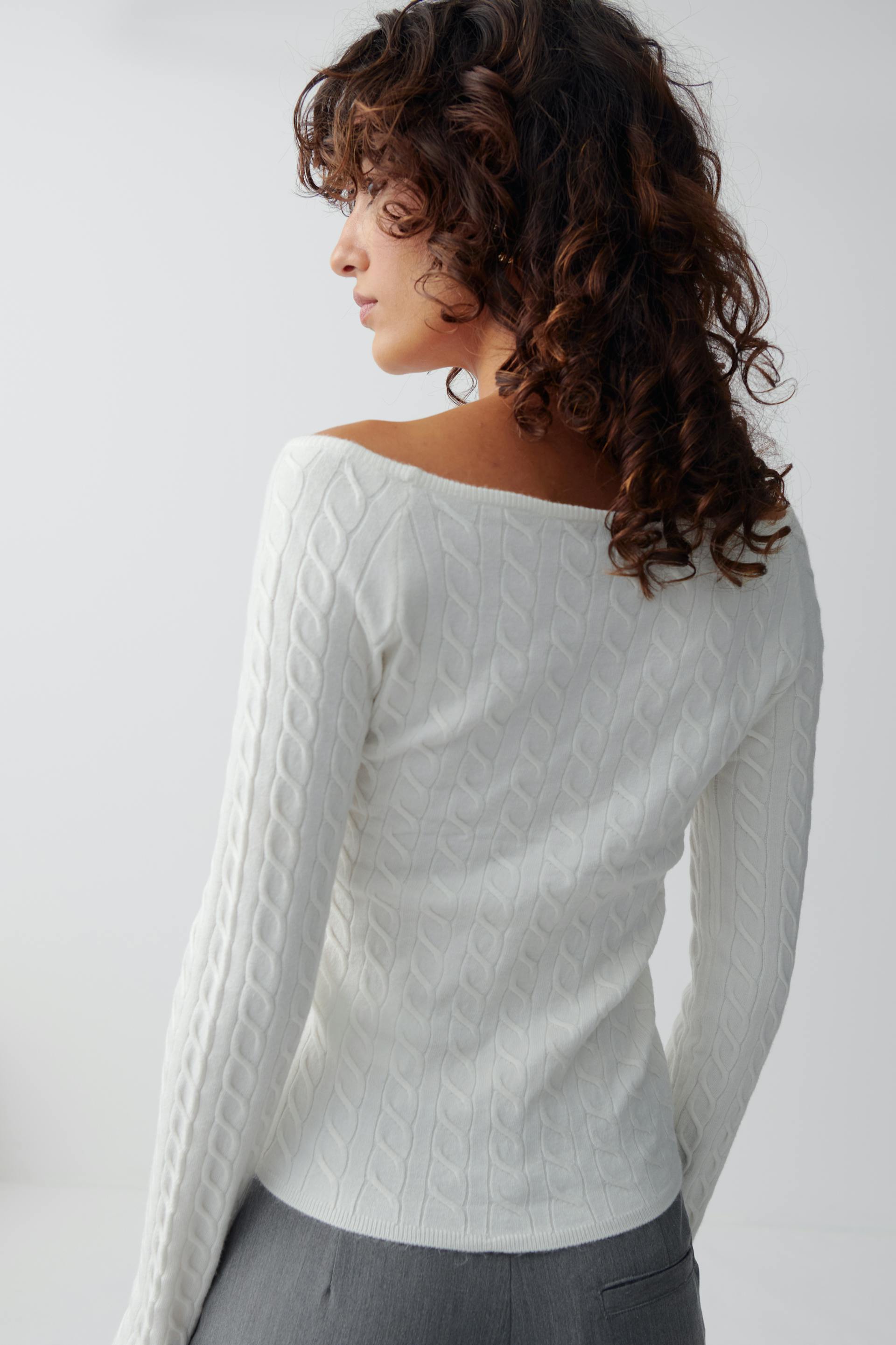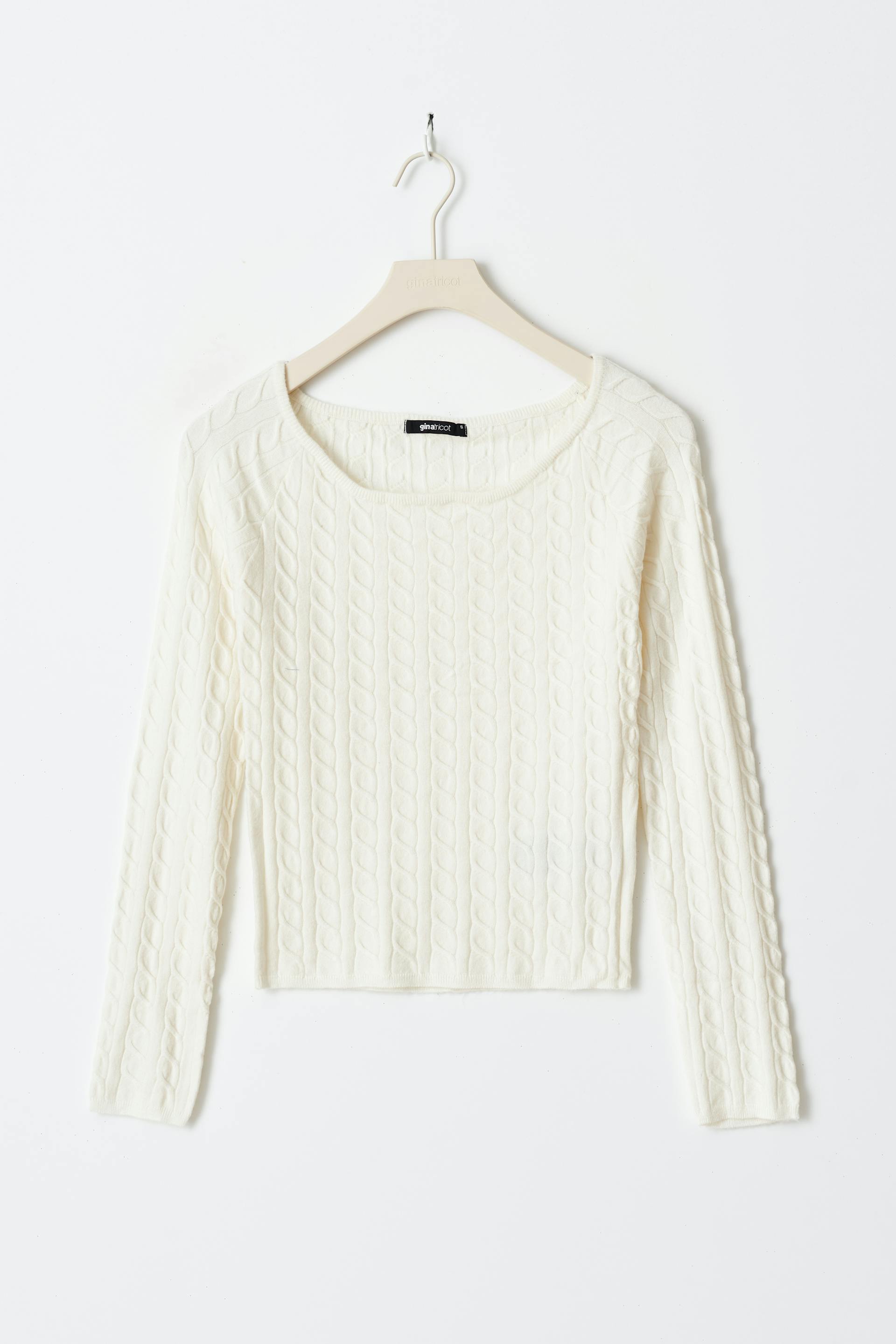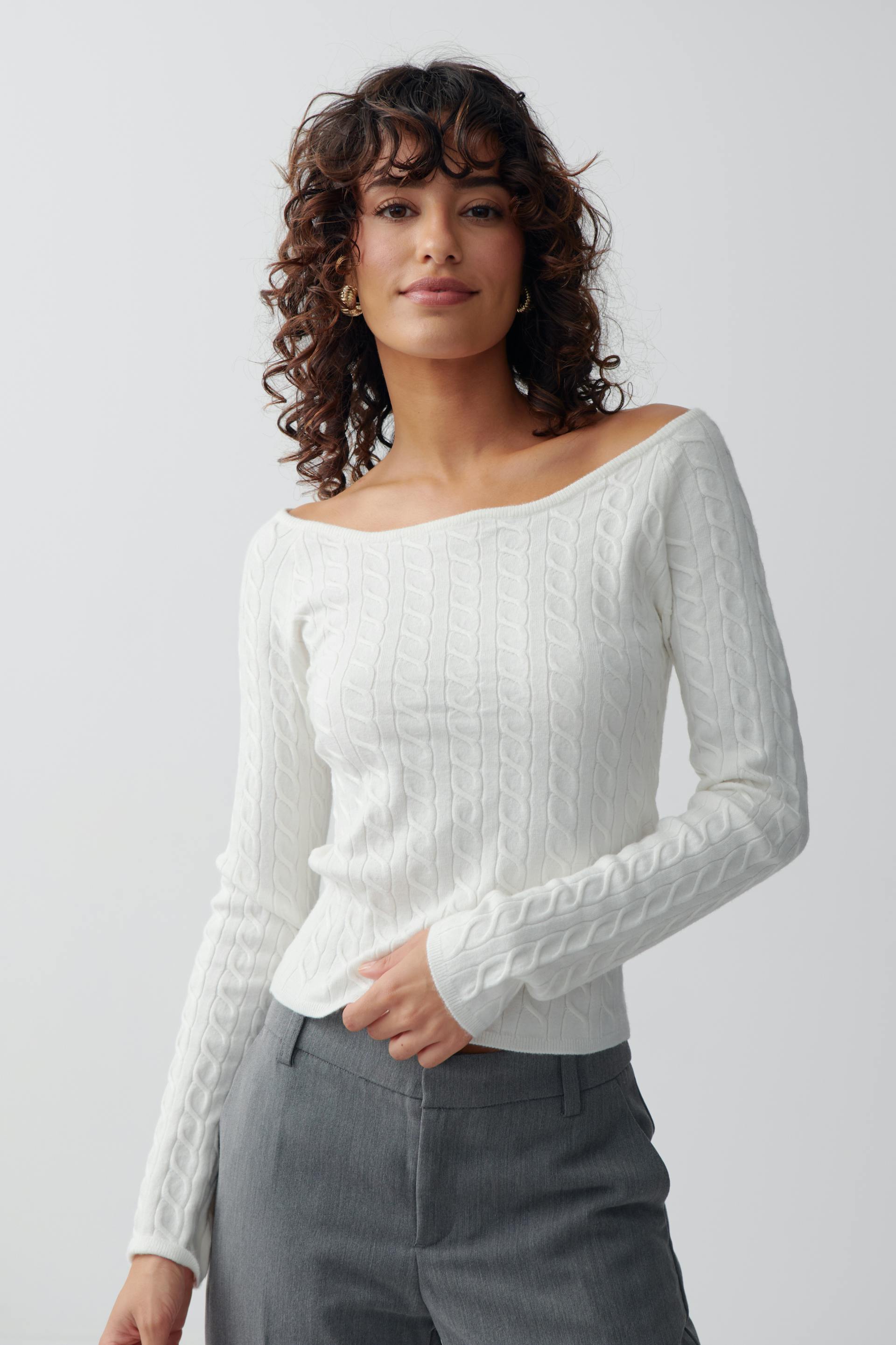 Cable knit top with figure-hugging fit. The top is white and has boat neckline. It has long sleeve and regular length.