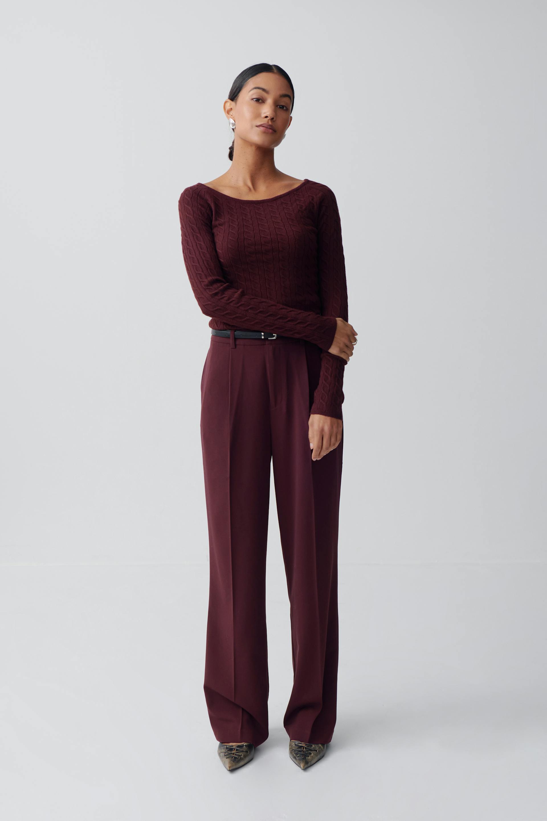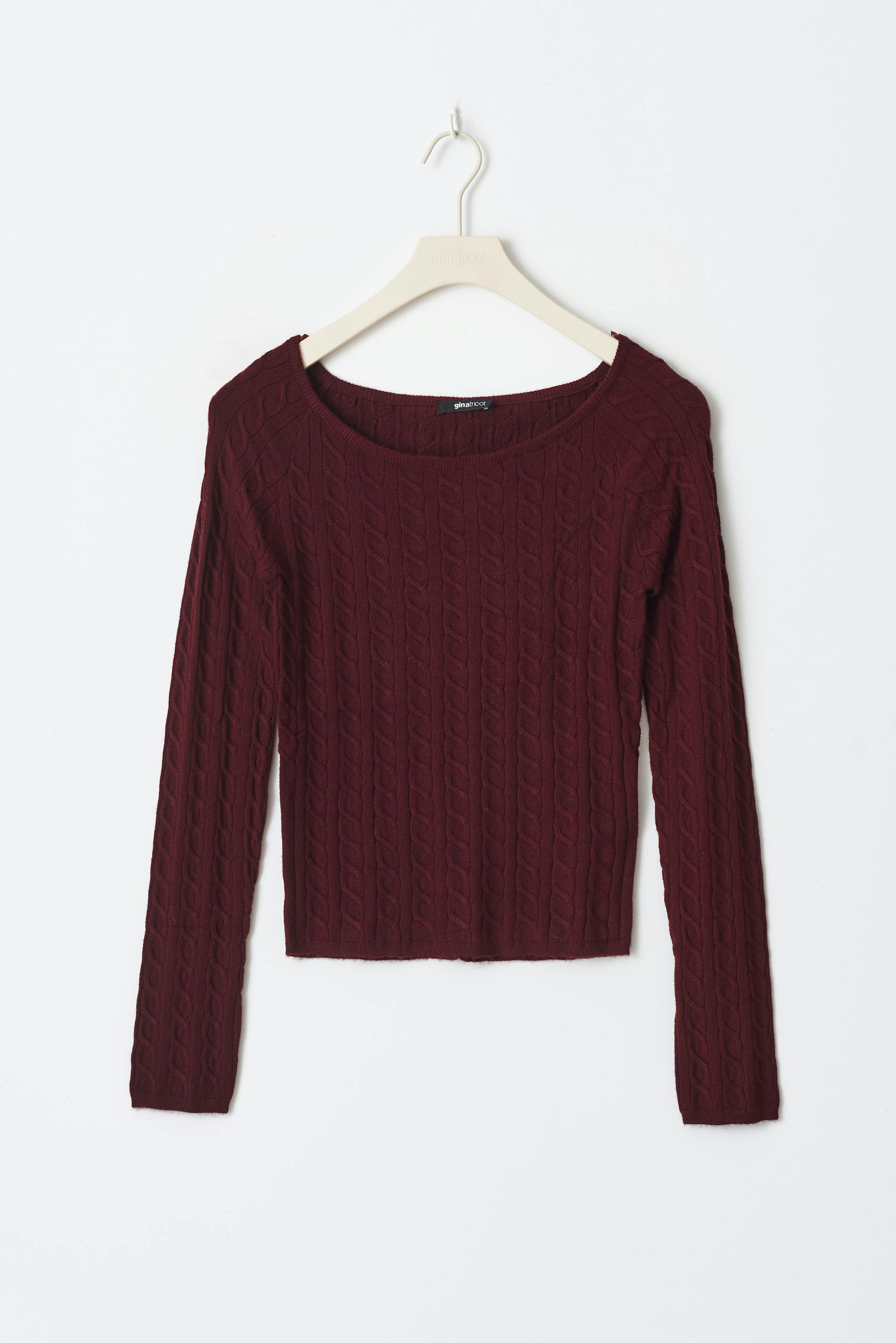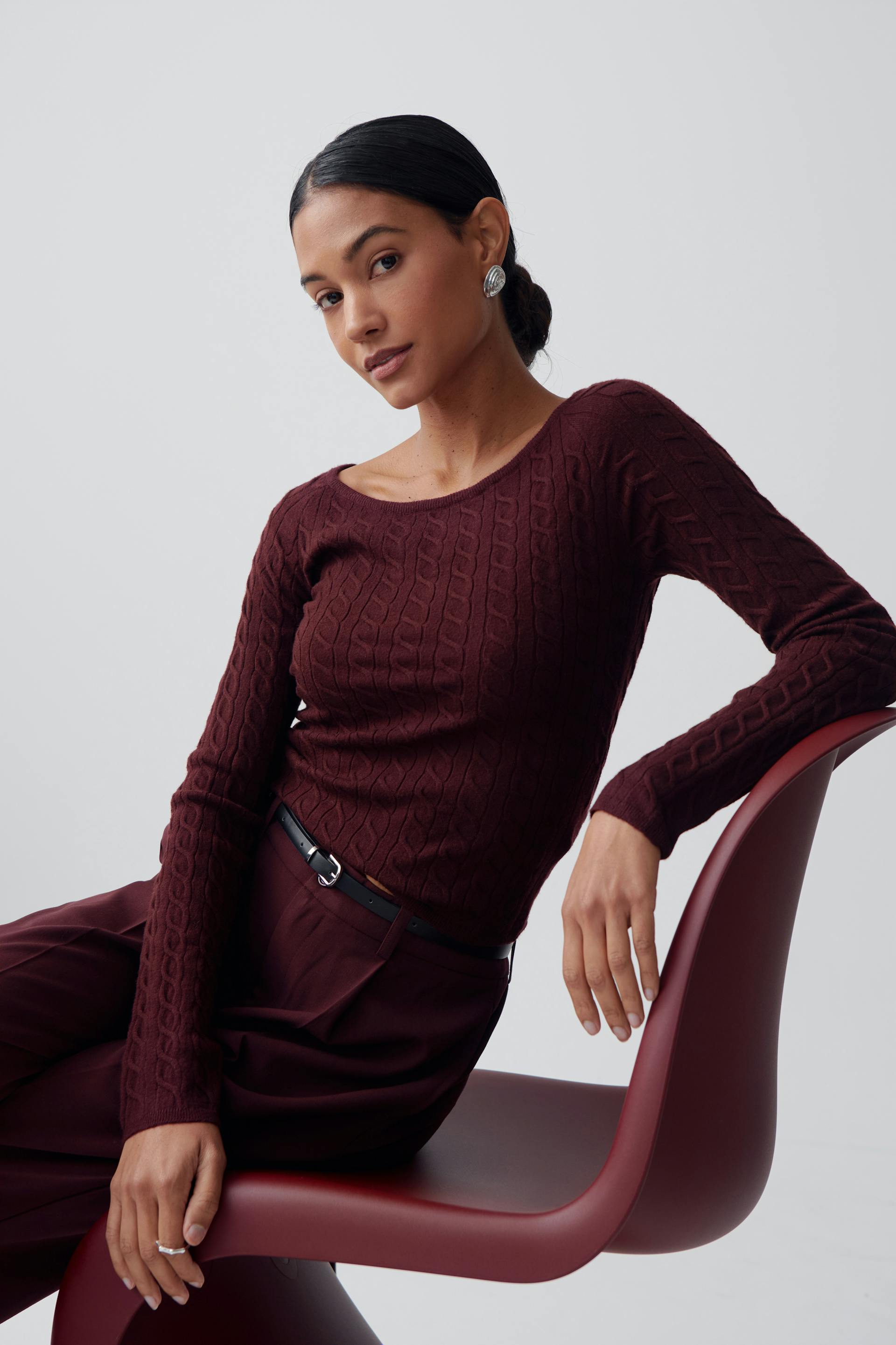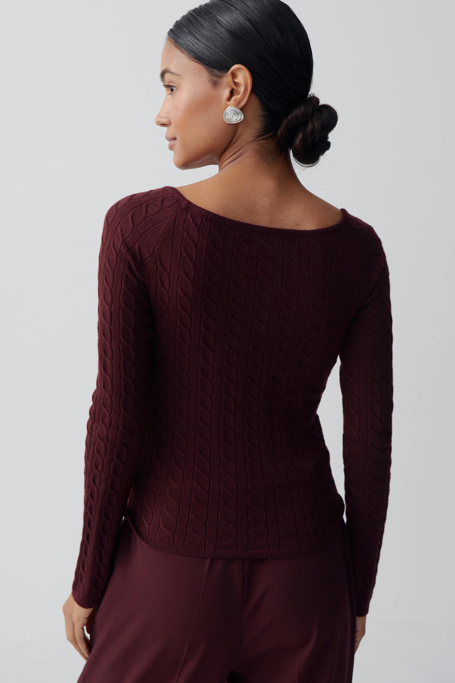Cable knit top with figure-hugging fit. The top is wine and has boat neckline. It has long sleeve and regular length.