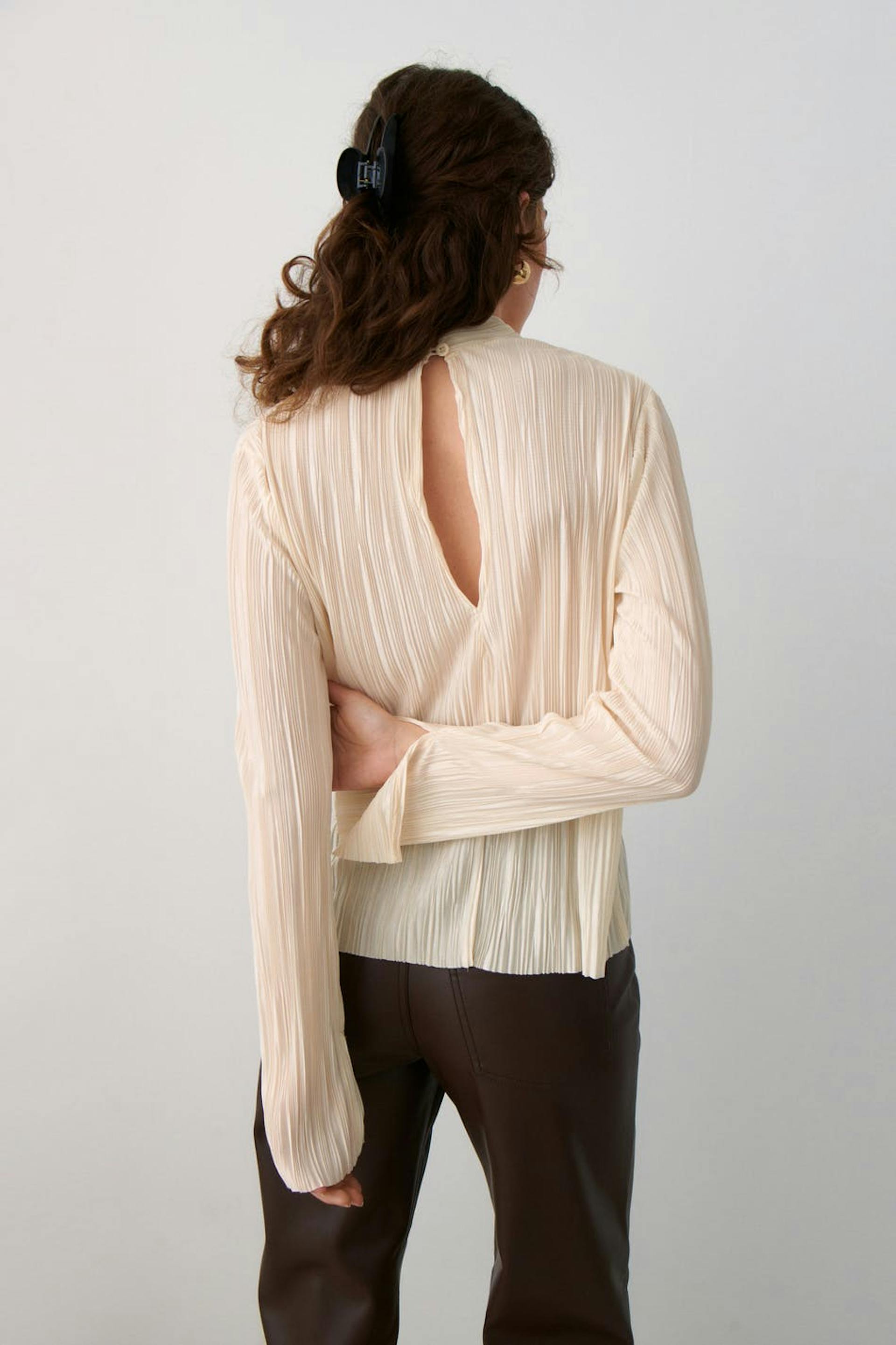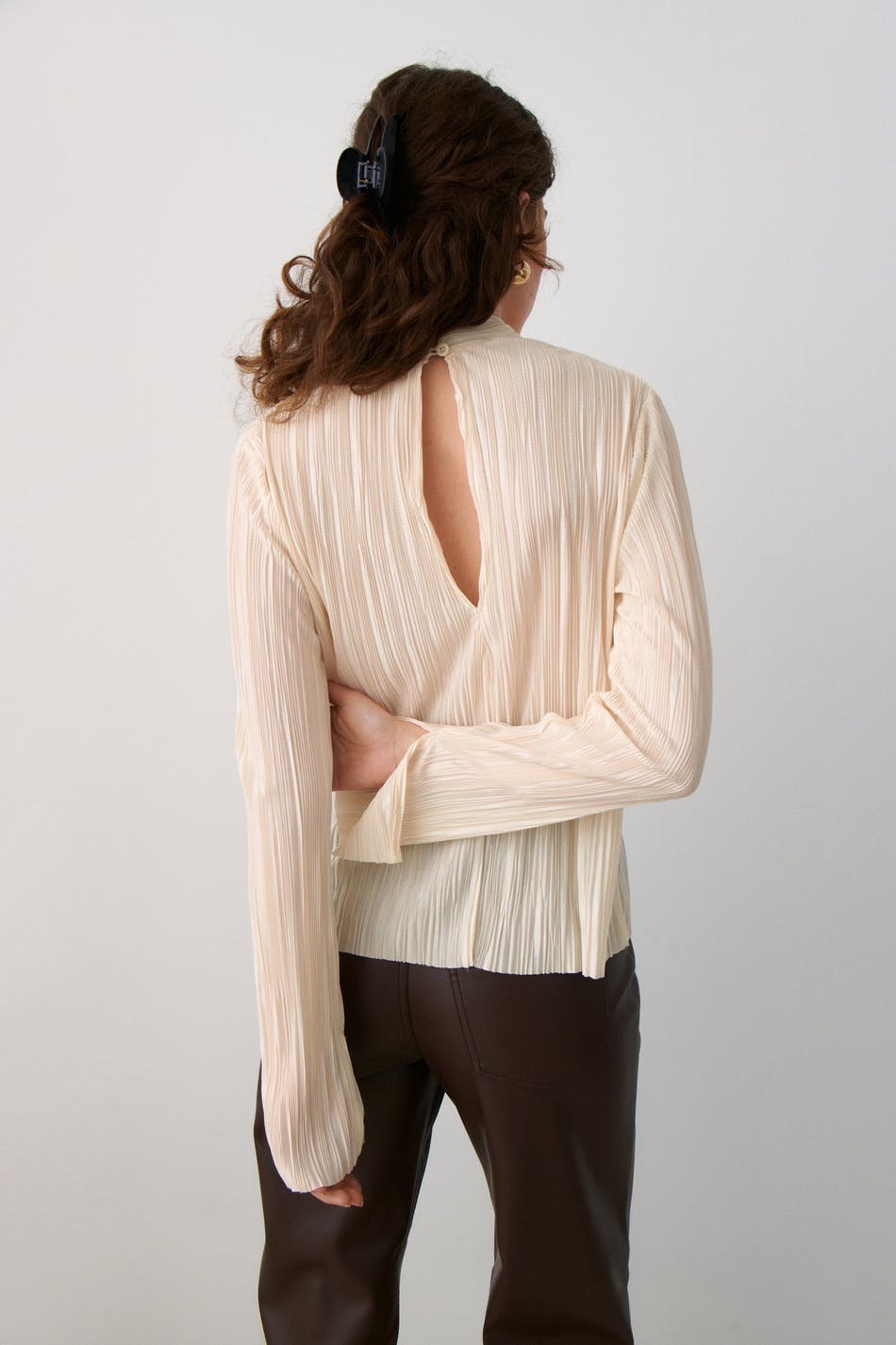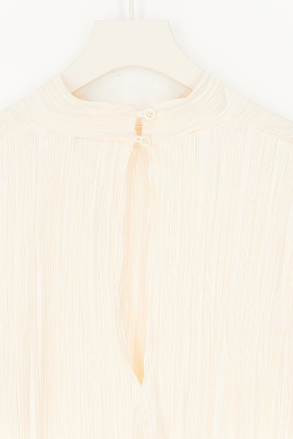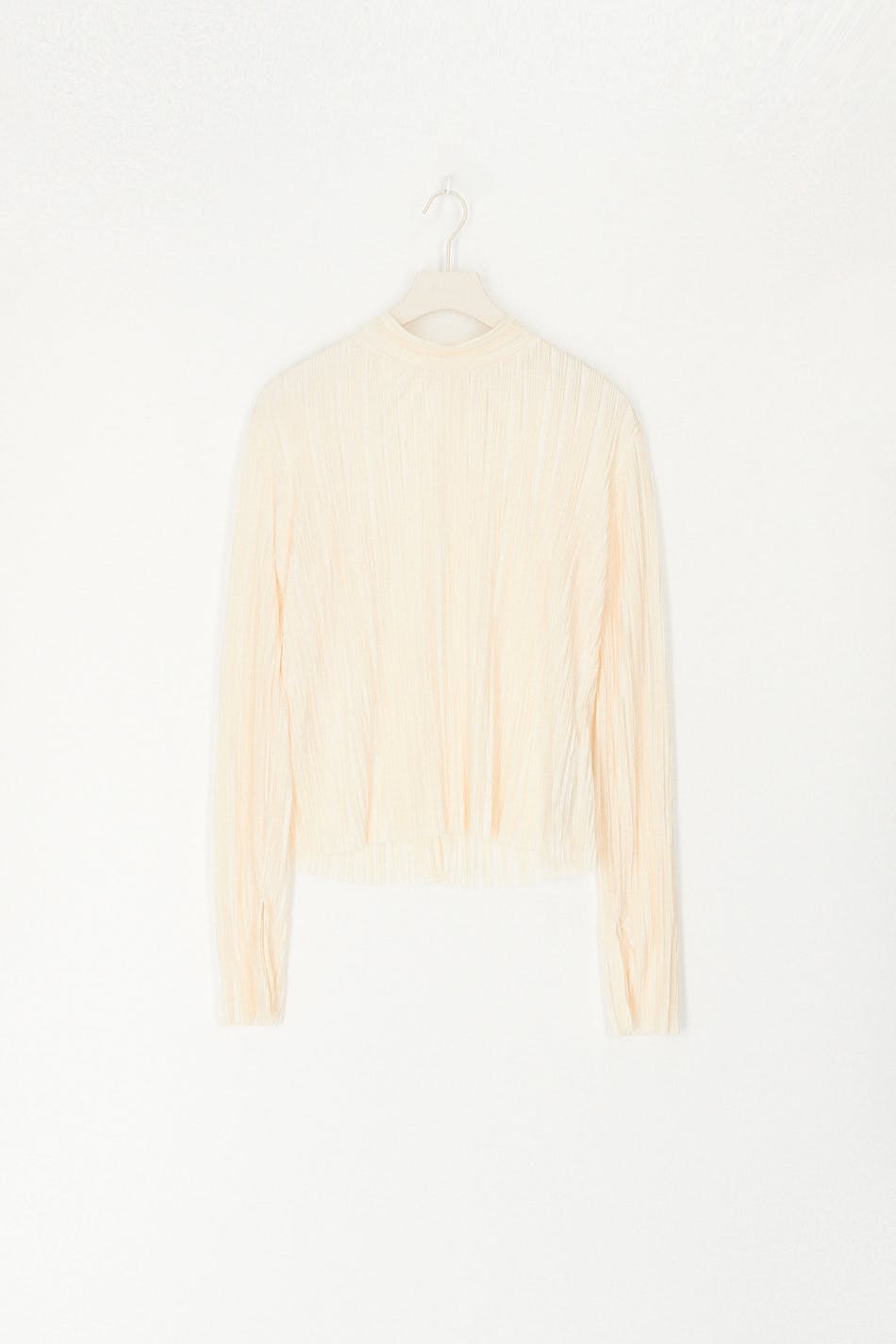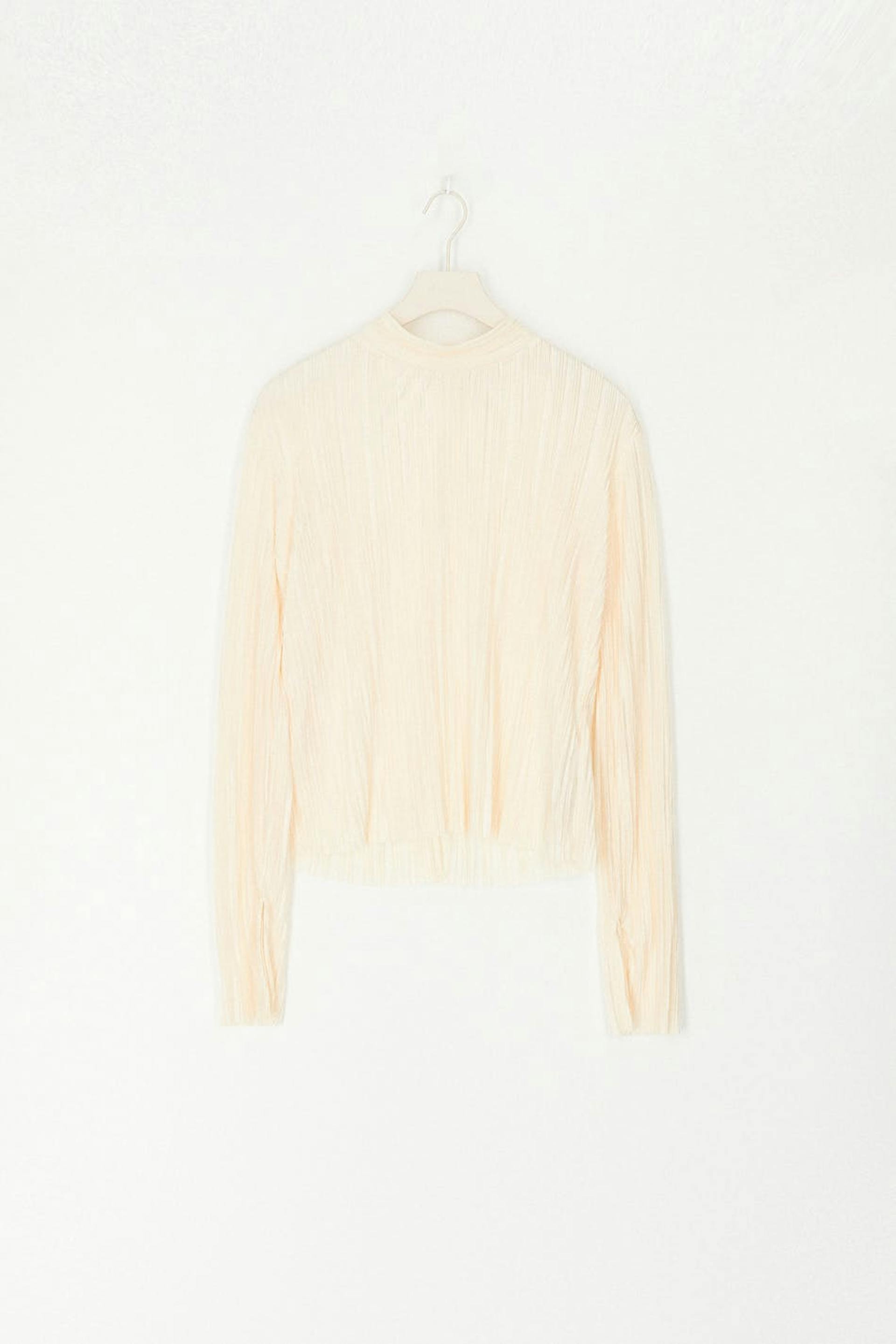 Pleated top in jersey with turtleneck. The top is white and has a slim fit. It has slit on the sleeve ends, opening in the back and button closure at neck.