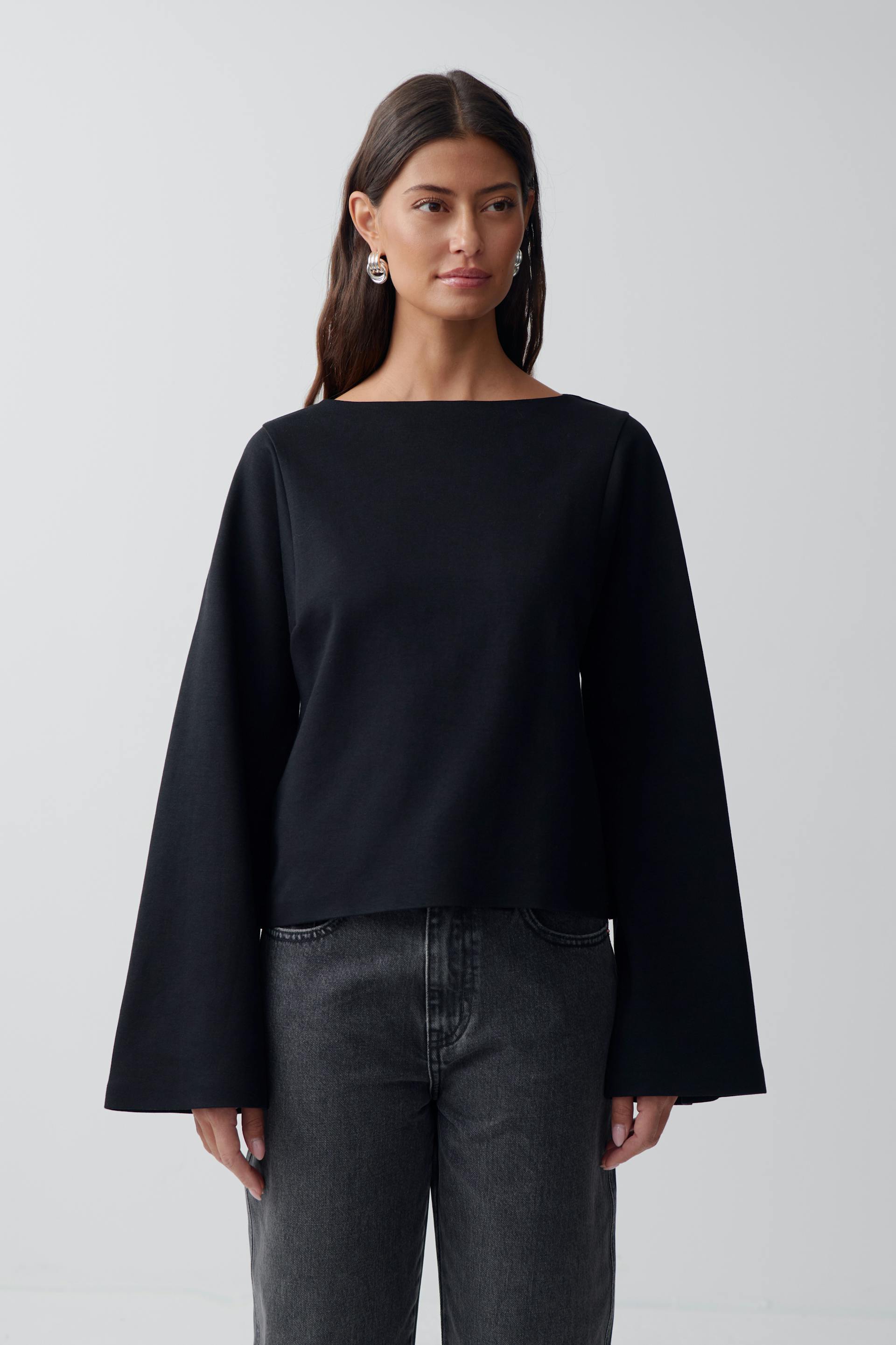 Long sleeve tee with boat neckline. The t-shirt is black and has oversize fit. It has lantern sleeve and regular length. The garment is made with Tex2Tex™, a textile-to-textile polyester recycling technology that transforms textile waste into new fibers, yarns, and fabrics.