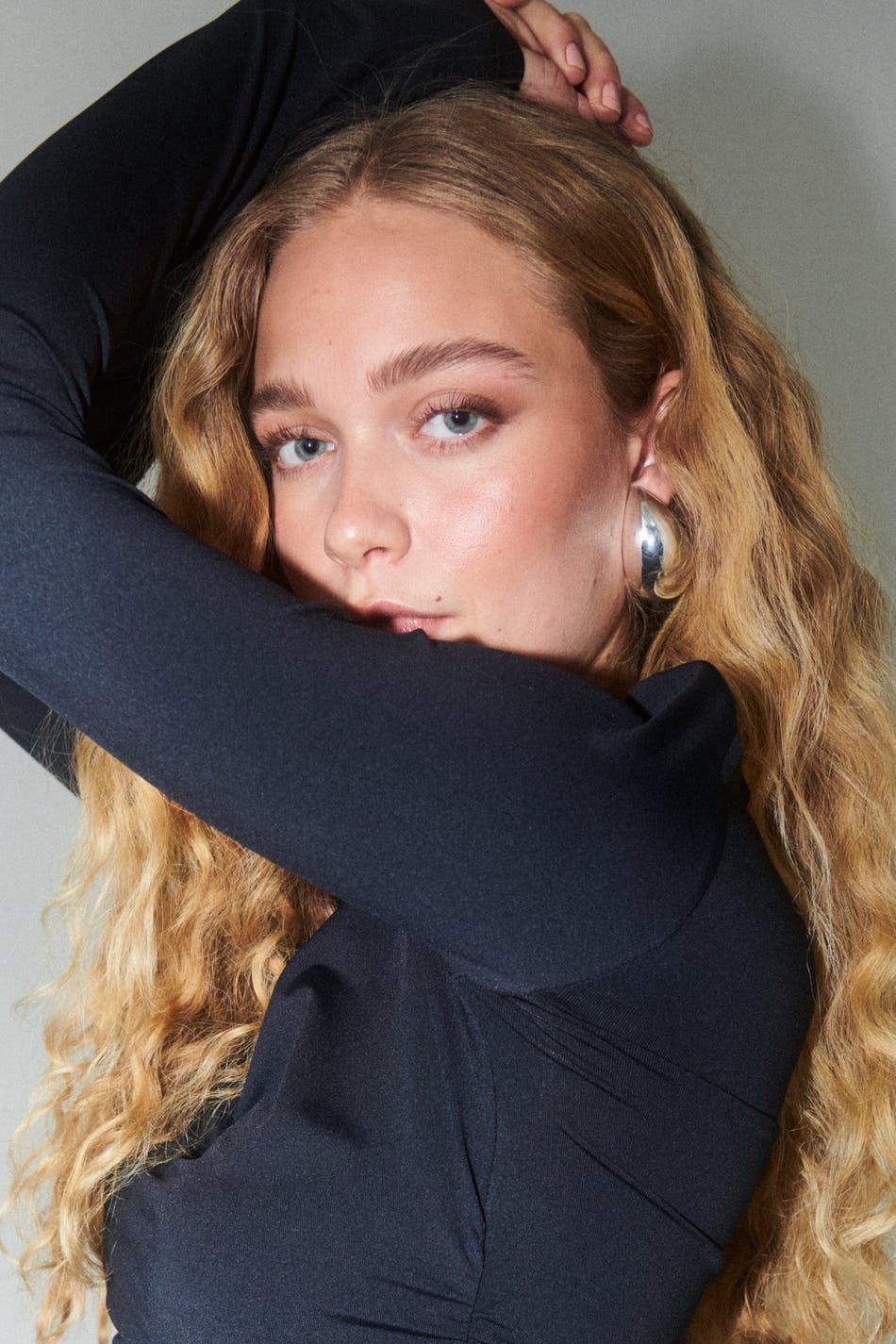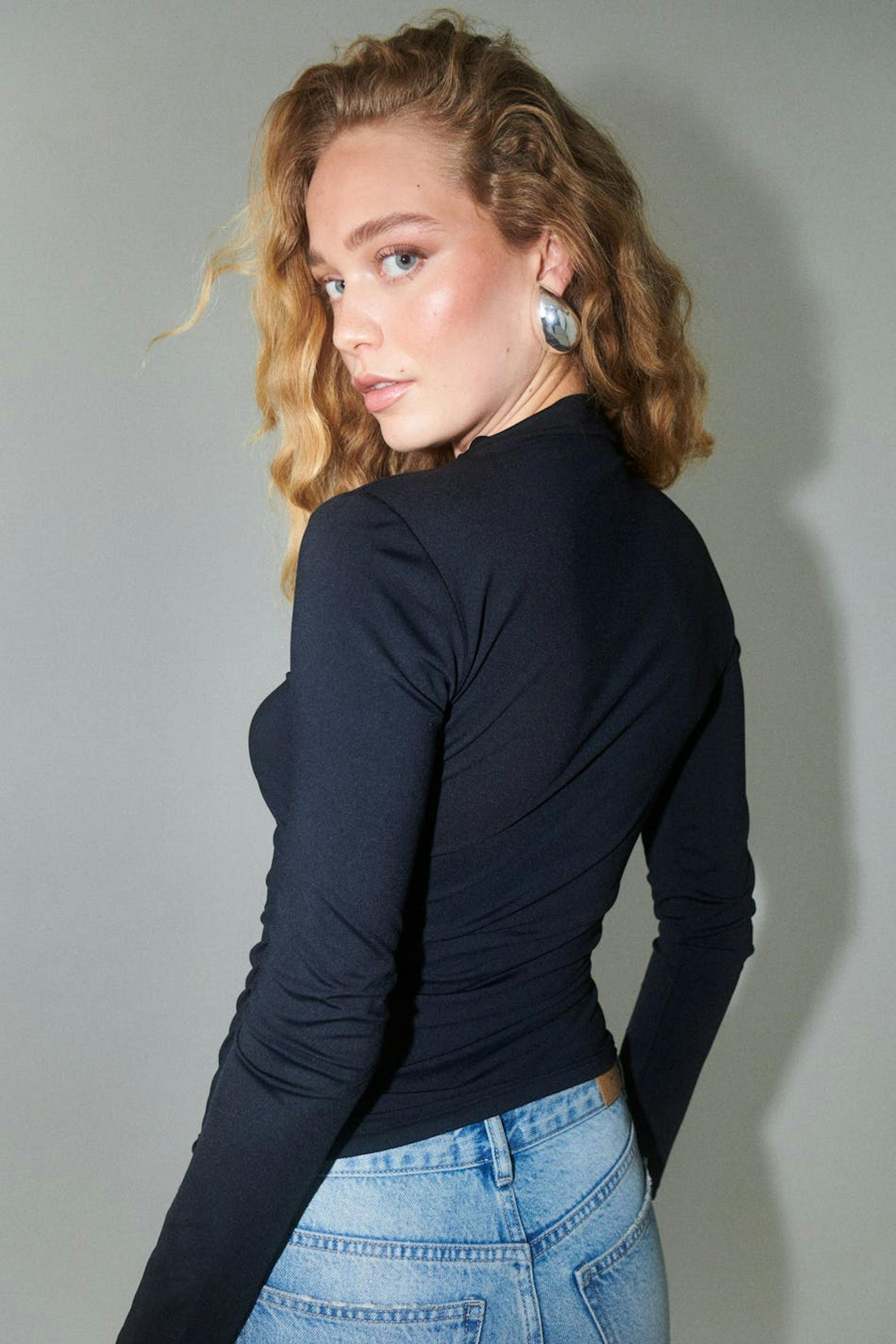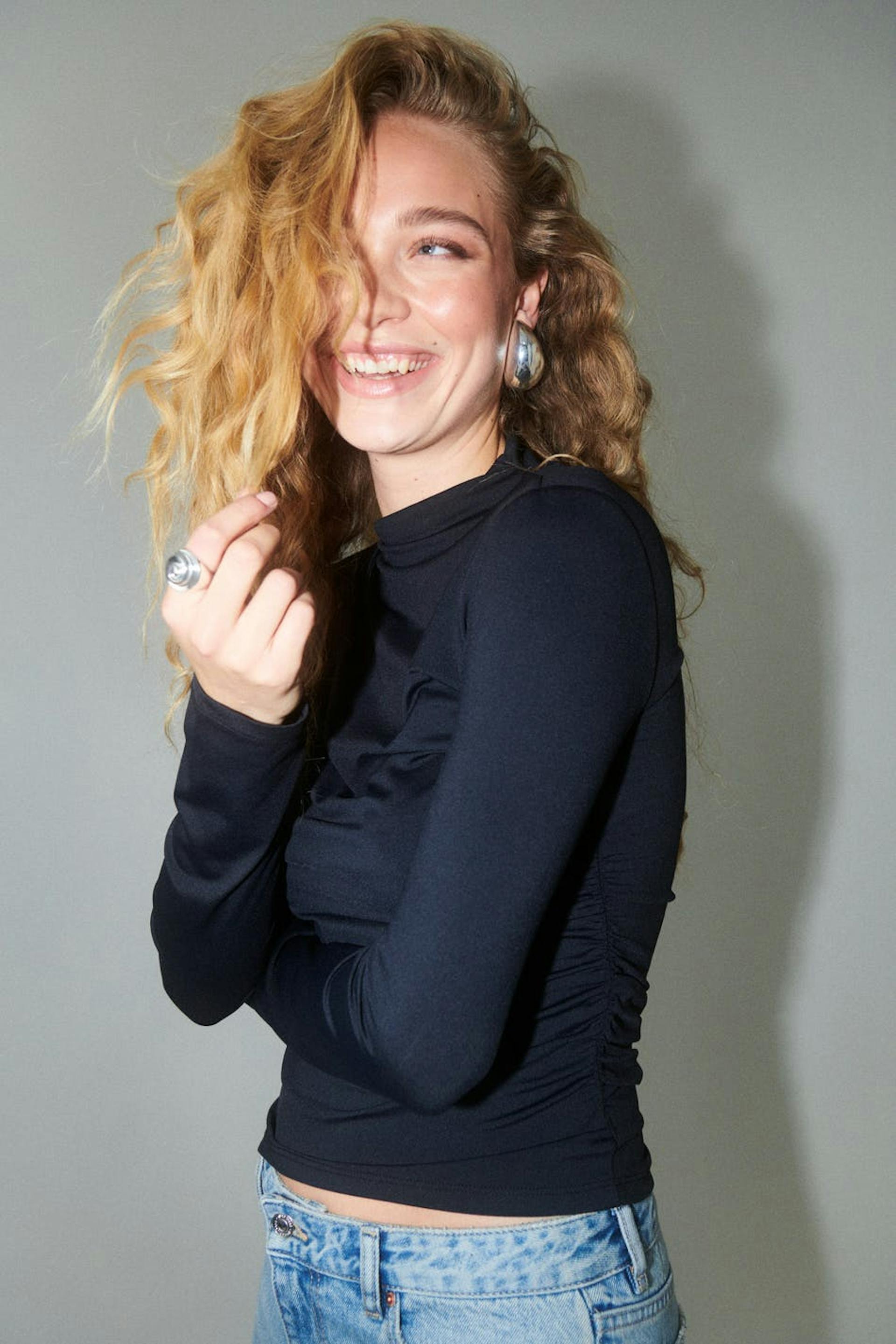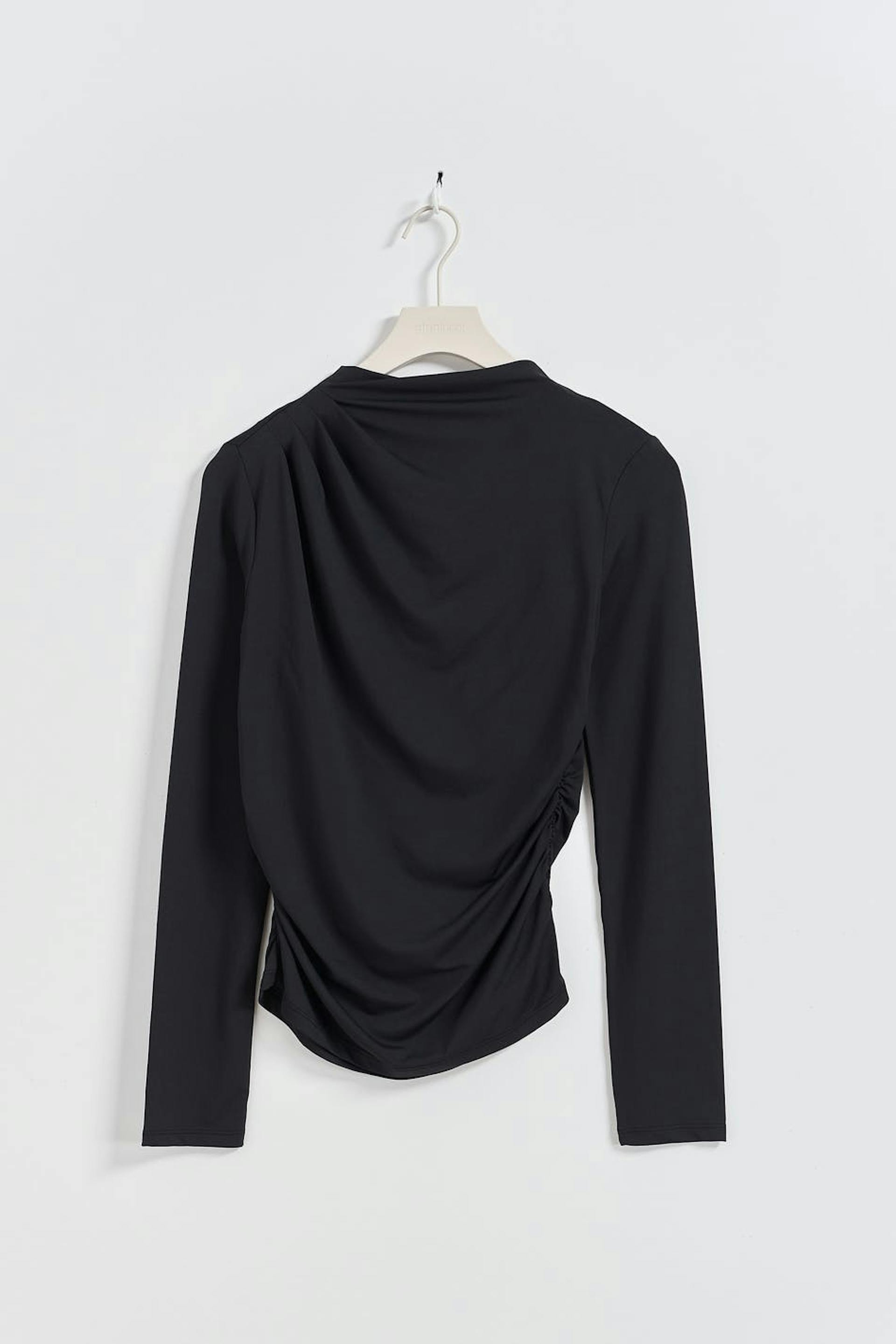 Long-sleeved top with gathering in the sides. The top is black and has funnel neck. It has figure-hugging fit and stretchy quality.