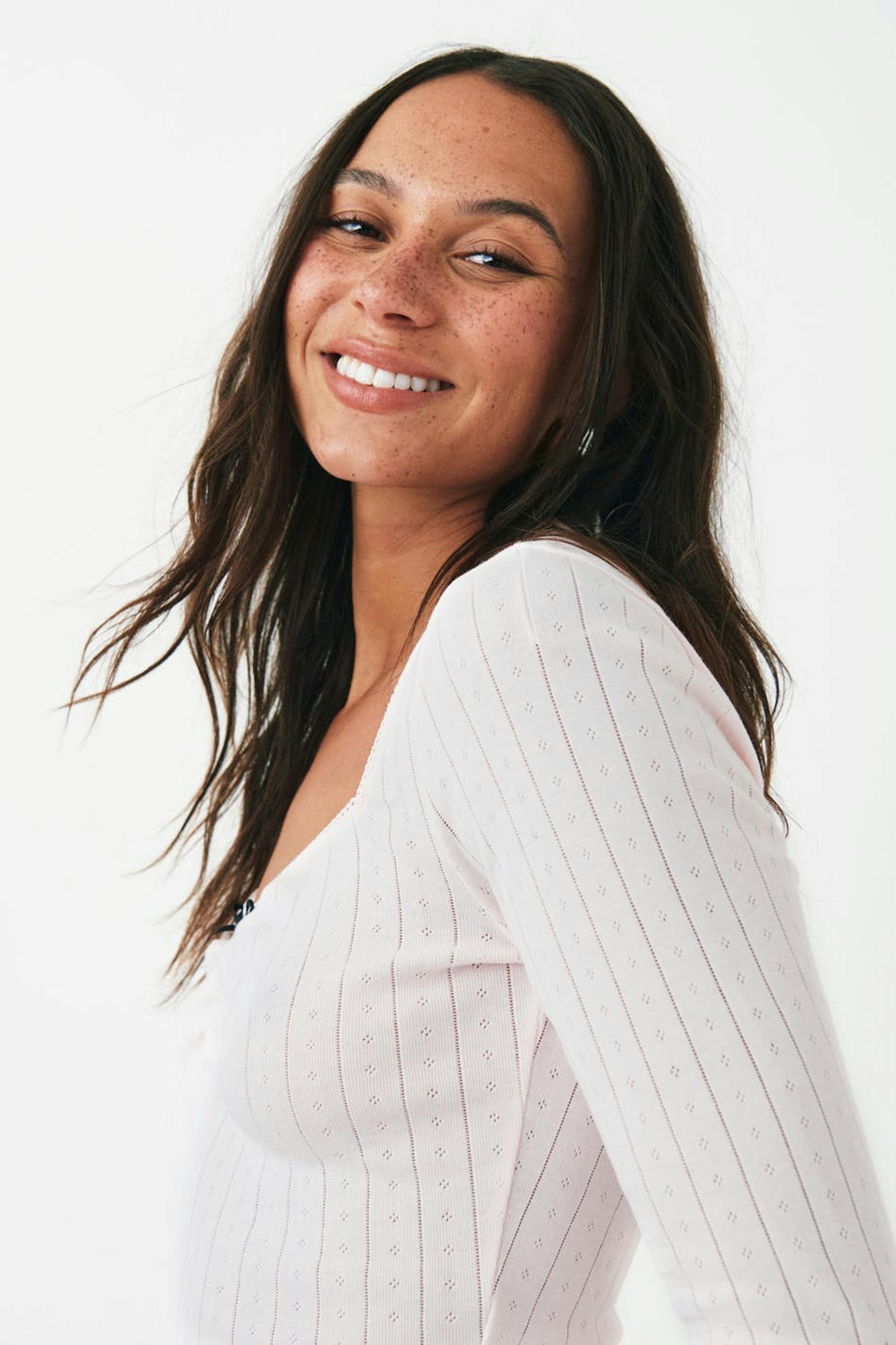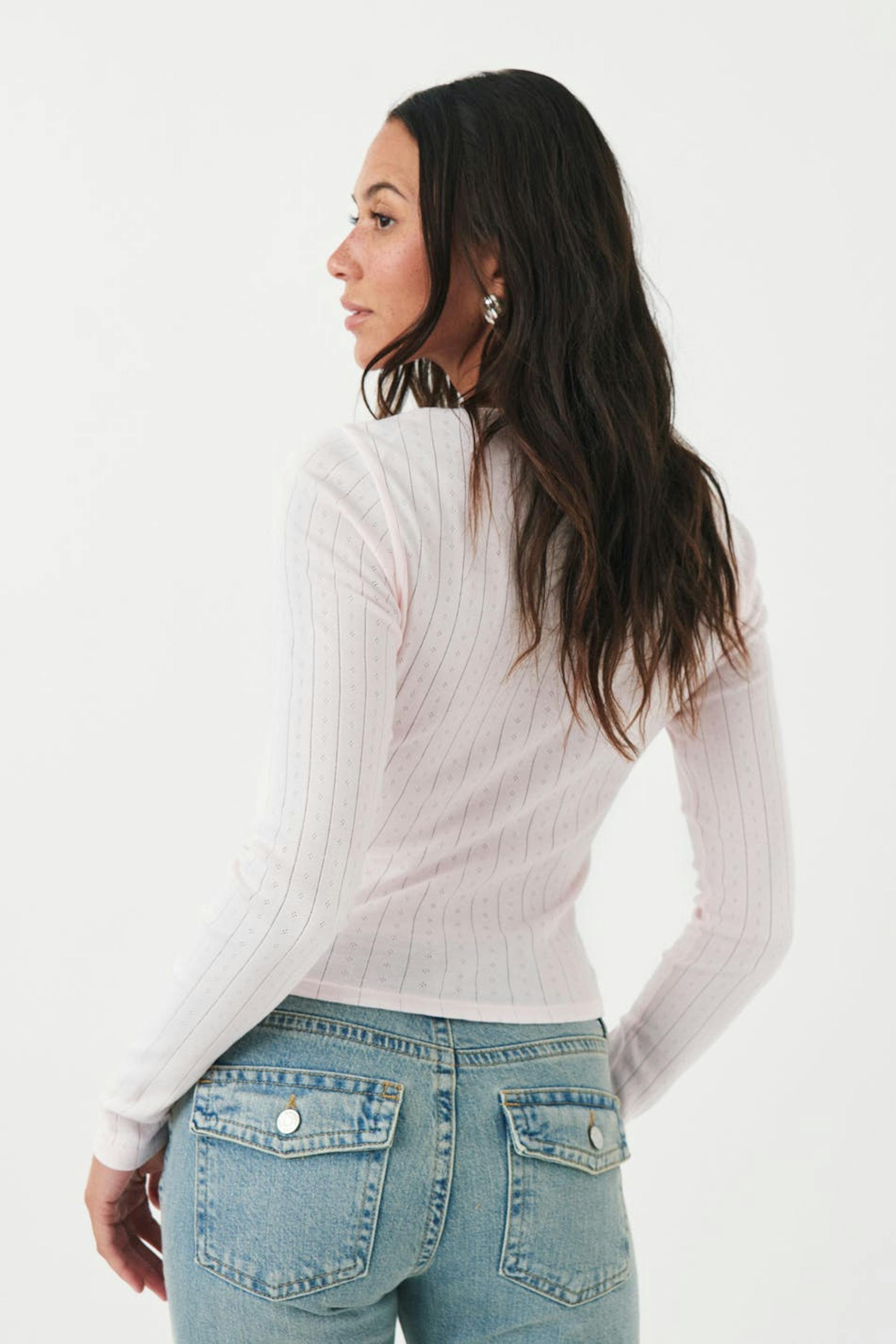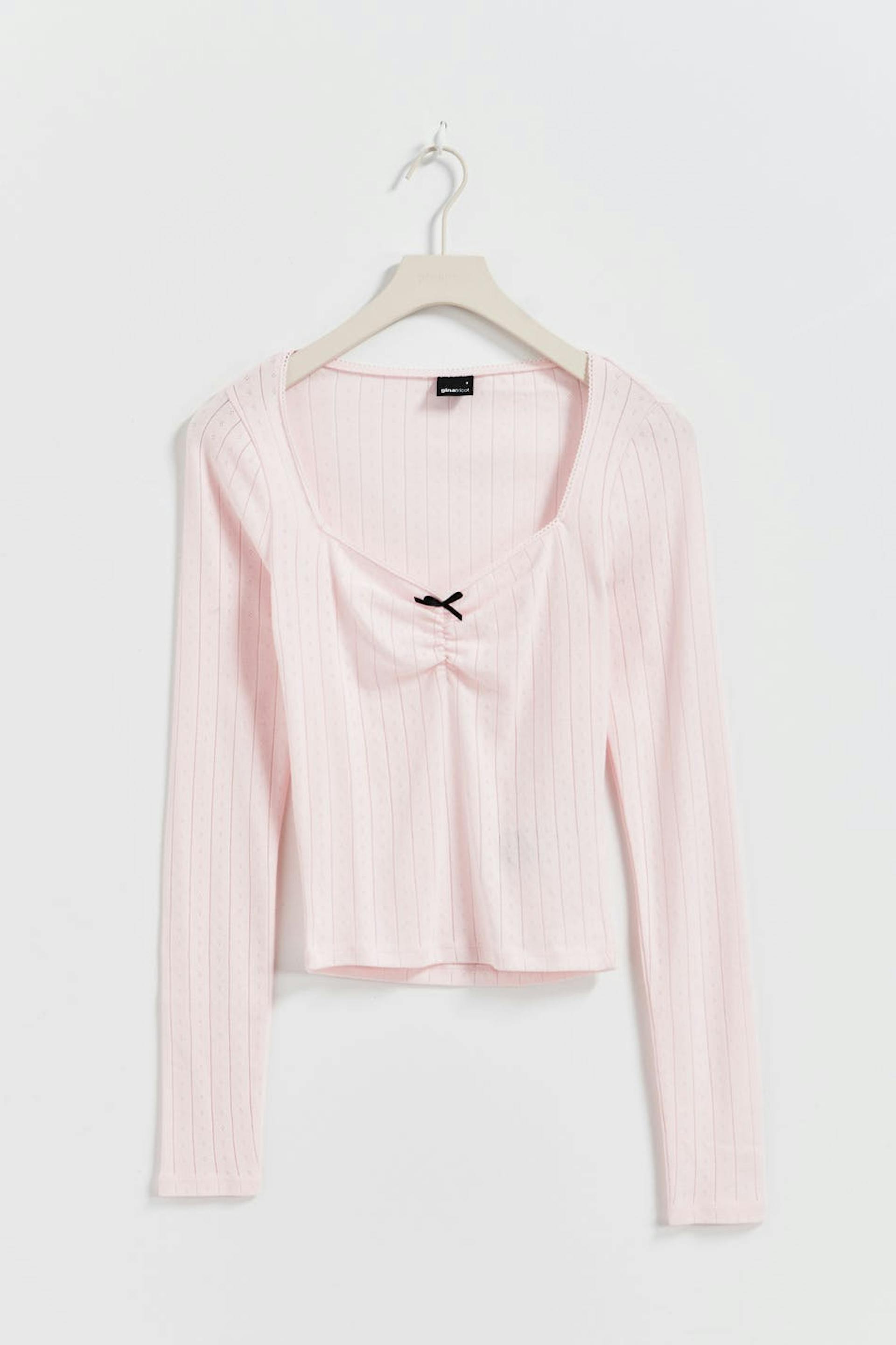 Pointelle knit top with sweetheart neckline. The top is pink and has ruched bust with bow at the front. It has long sleeve, figure-hugging fit and regular length.