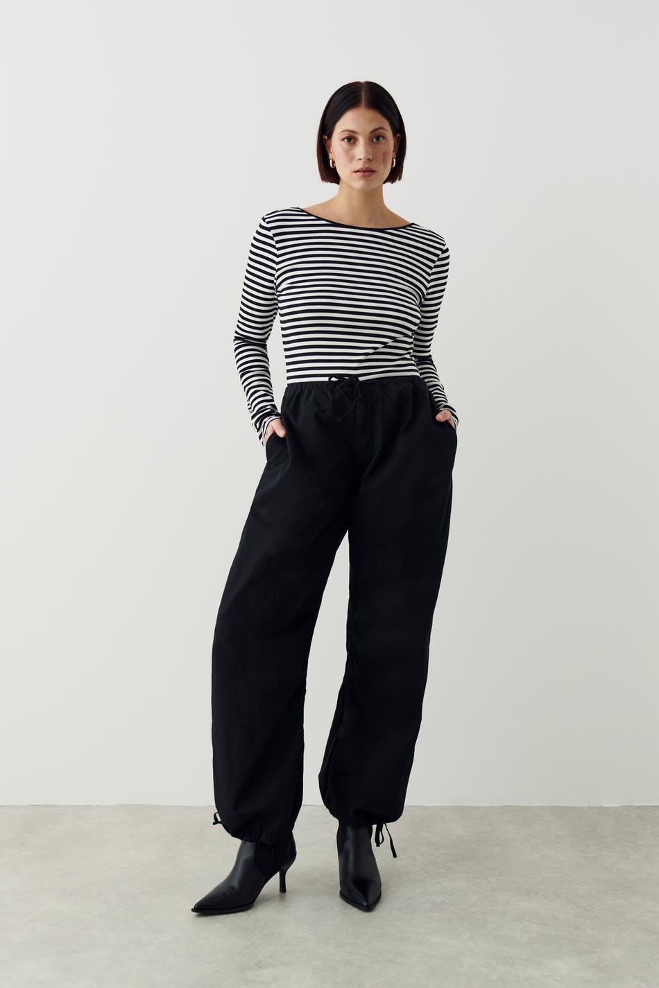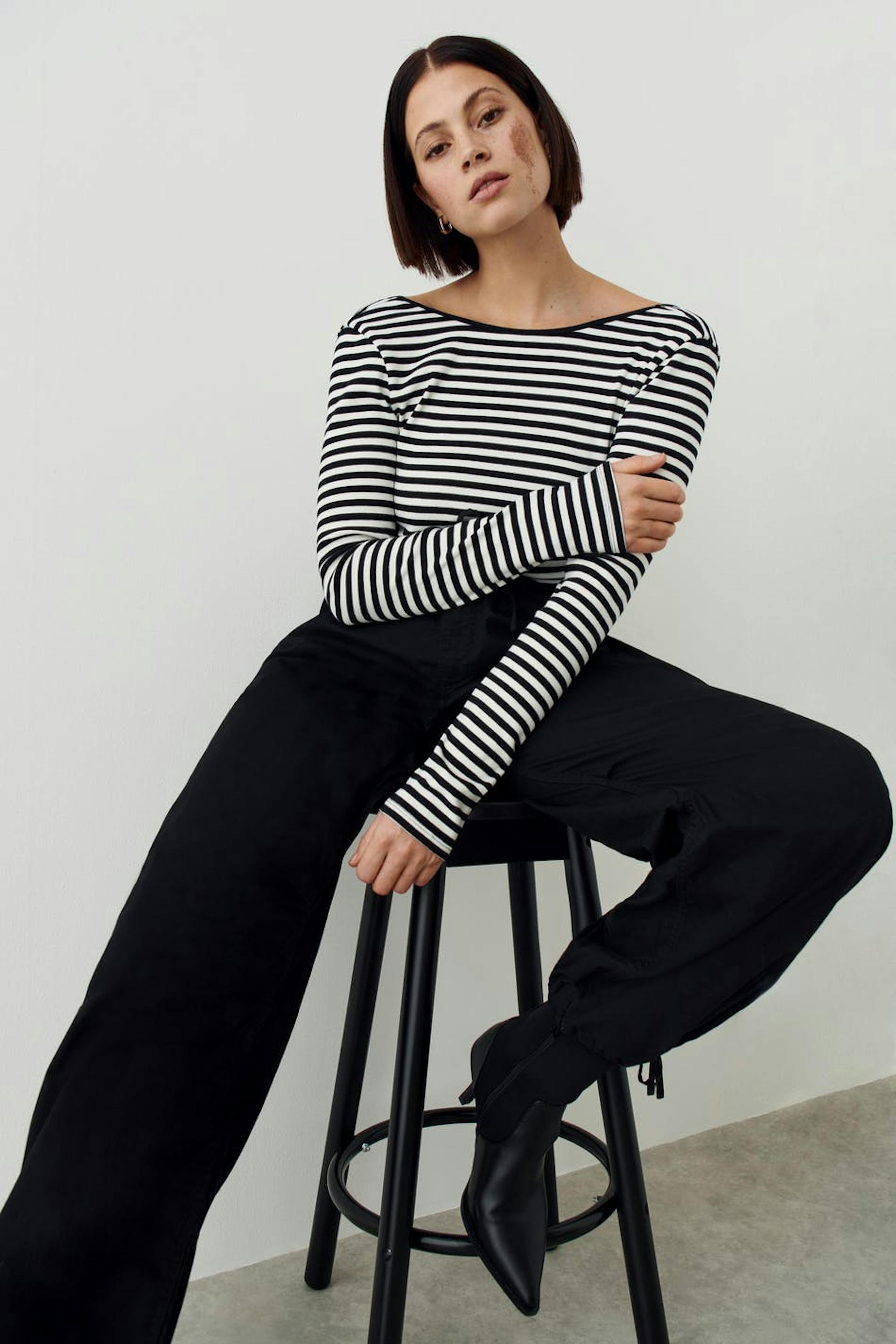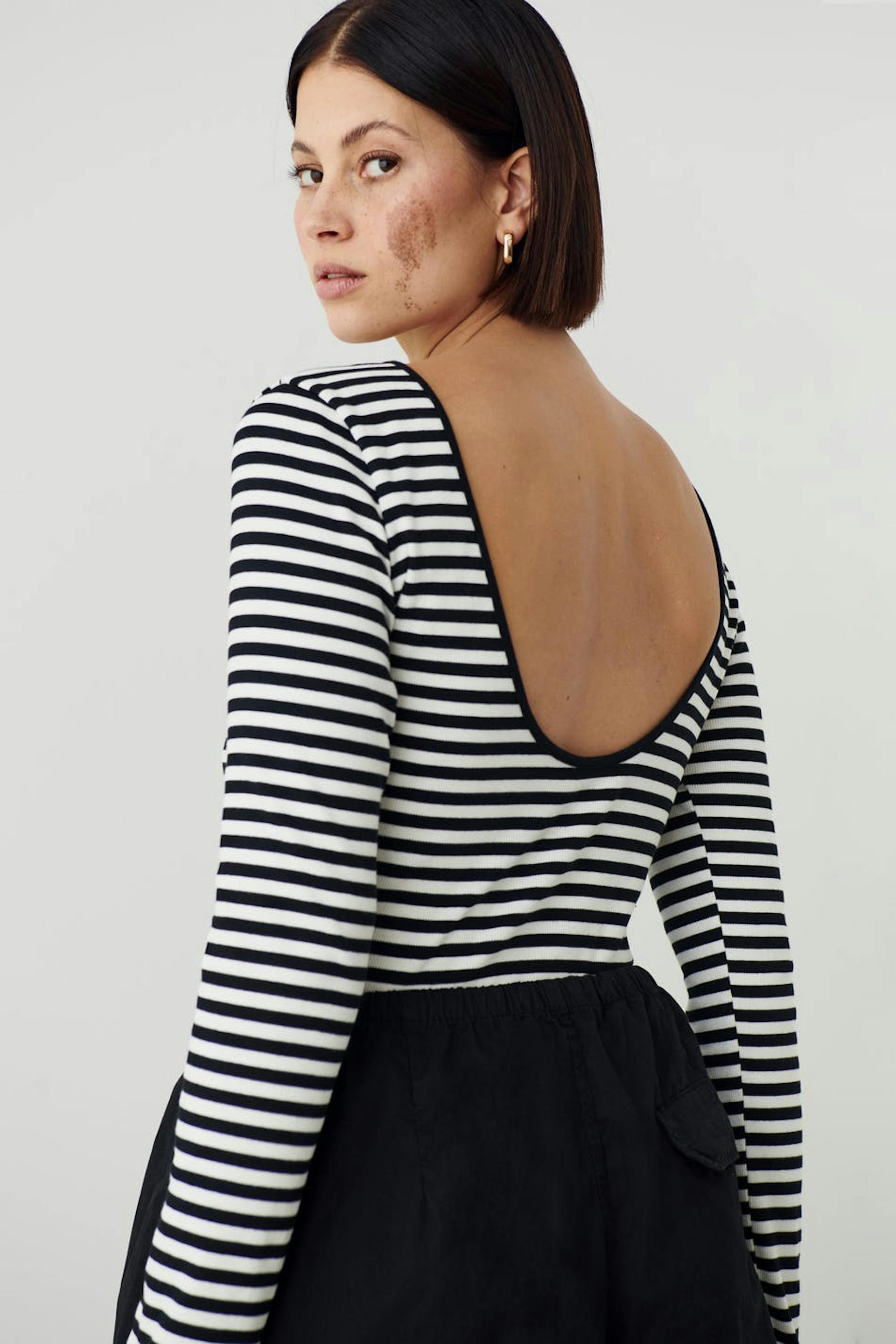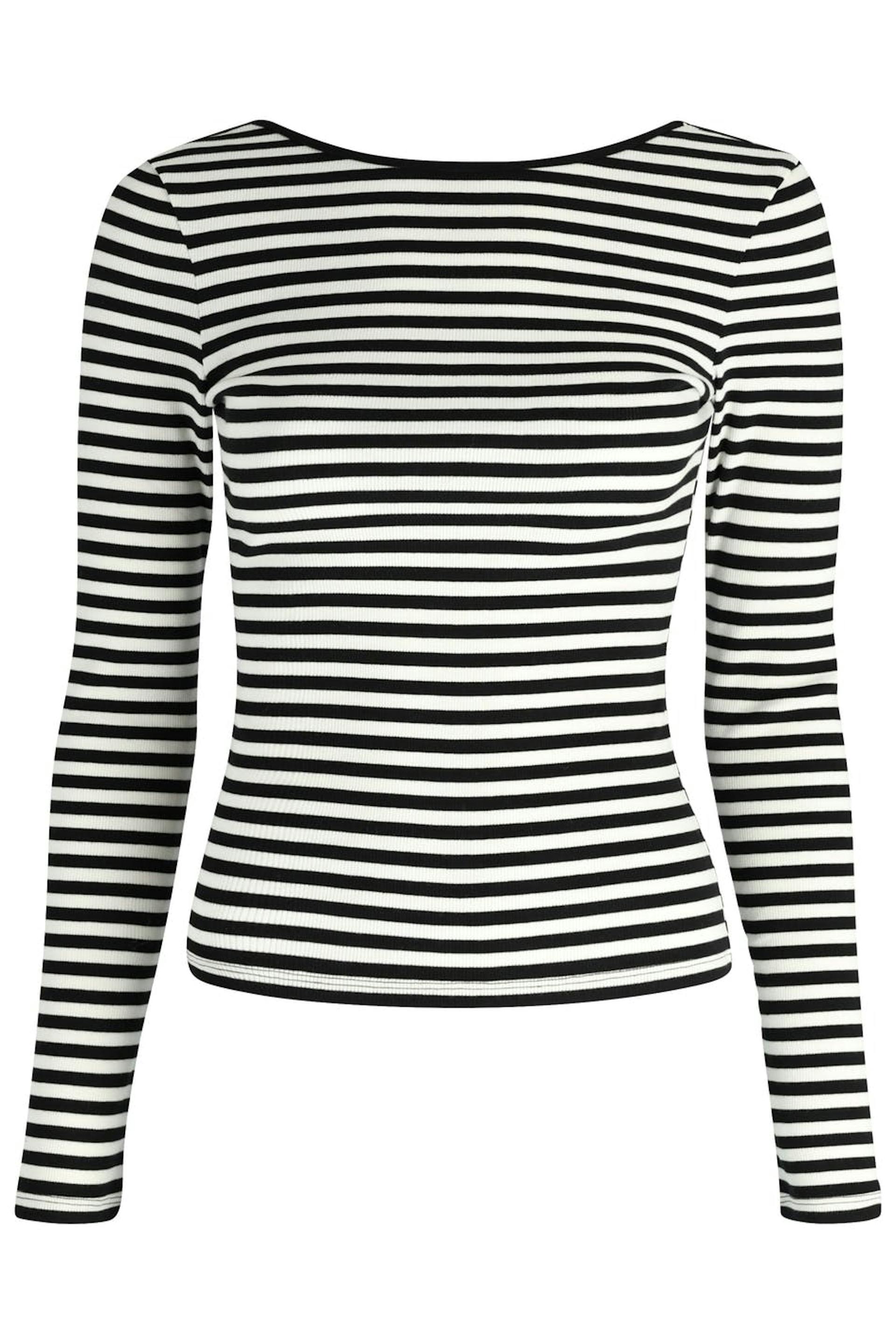 Striped top with low back. The top is white, black and long-sleeved. It has figure-hugging fit, ribbed quality in jersey and bindings on the neckline.