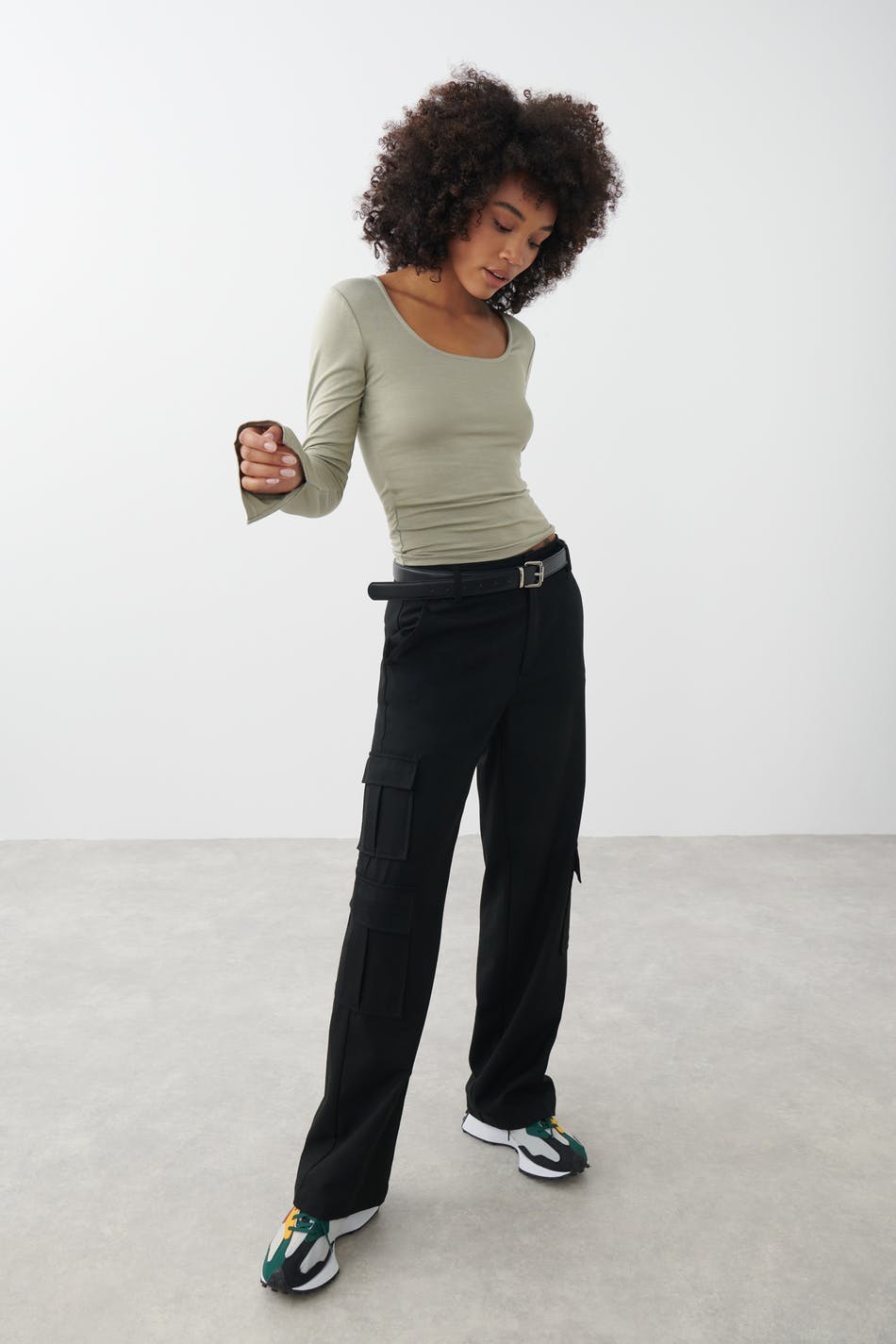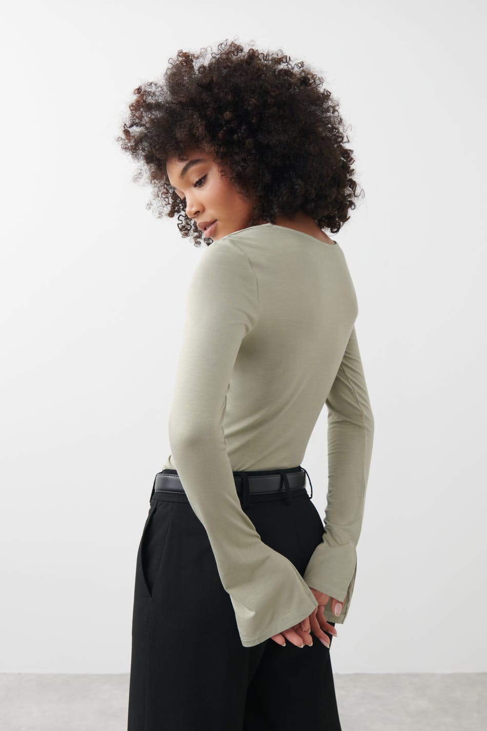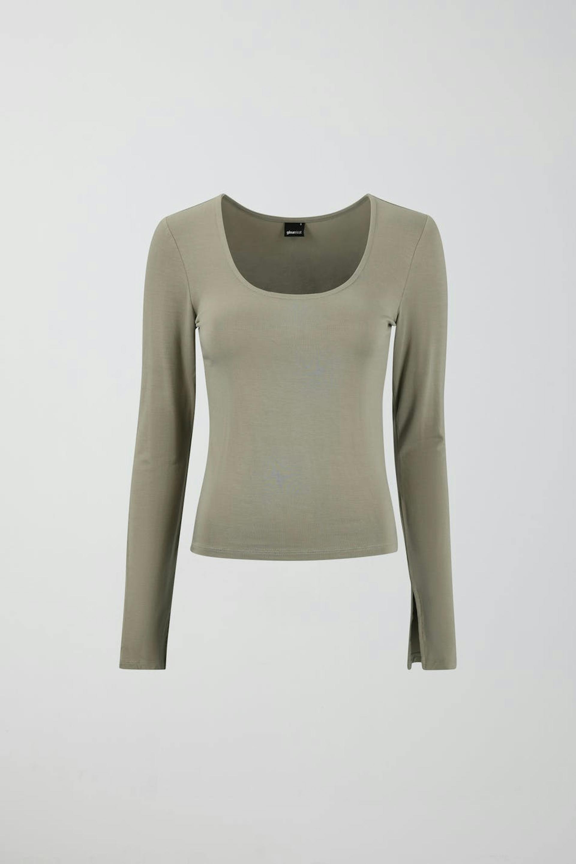 Soft touch – second skin comfort. Long-sleeved top in soft viscose with fitted fit. The top is beige and has rounded neckline. It has long sleeves with slit on the sleeve ends.