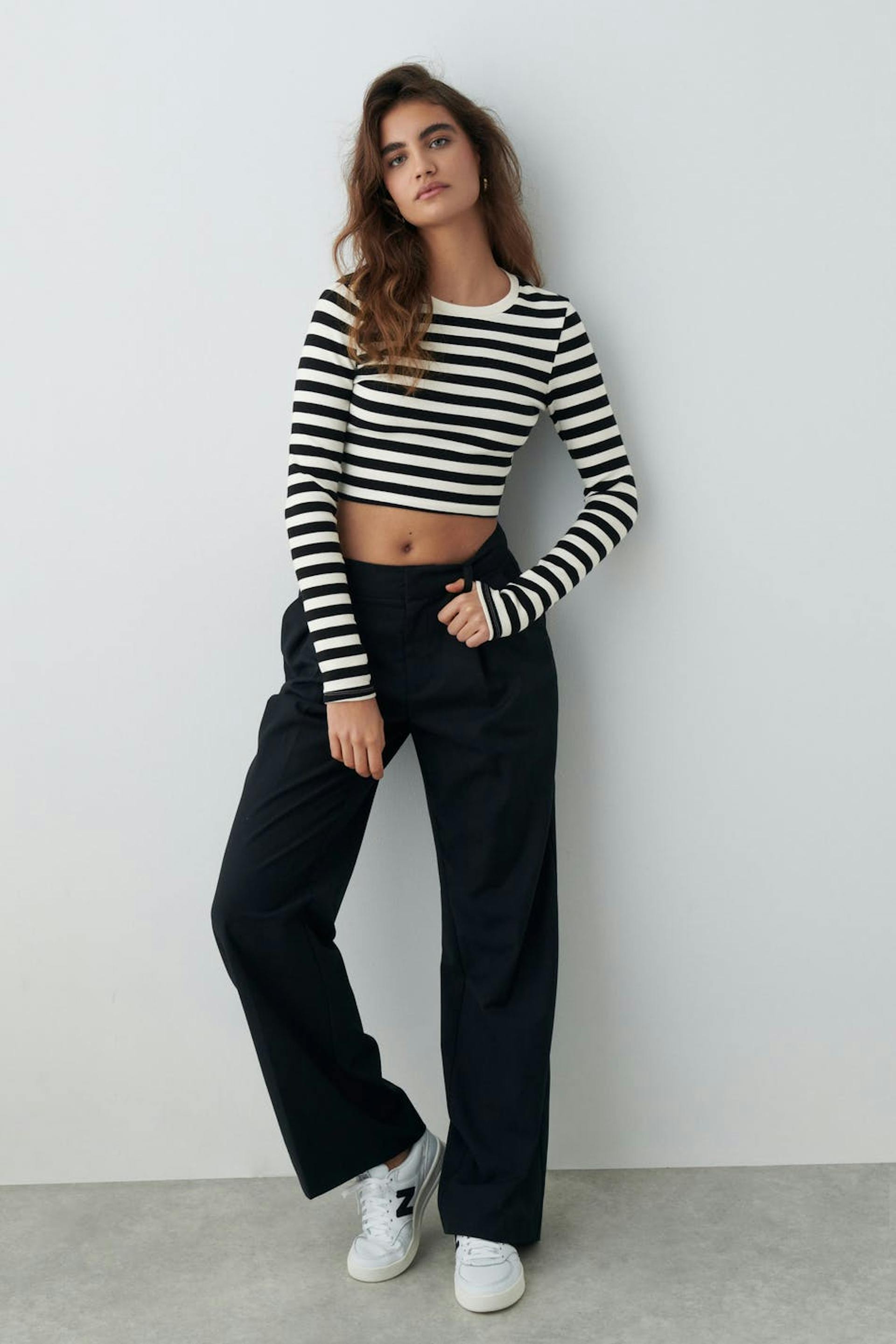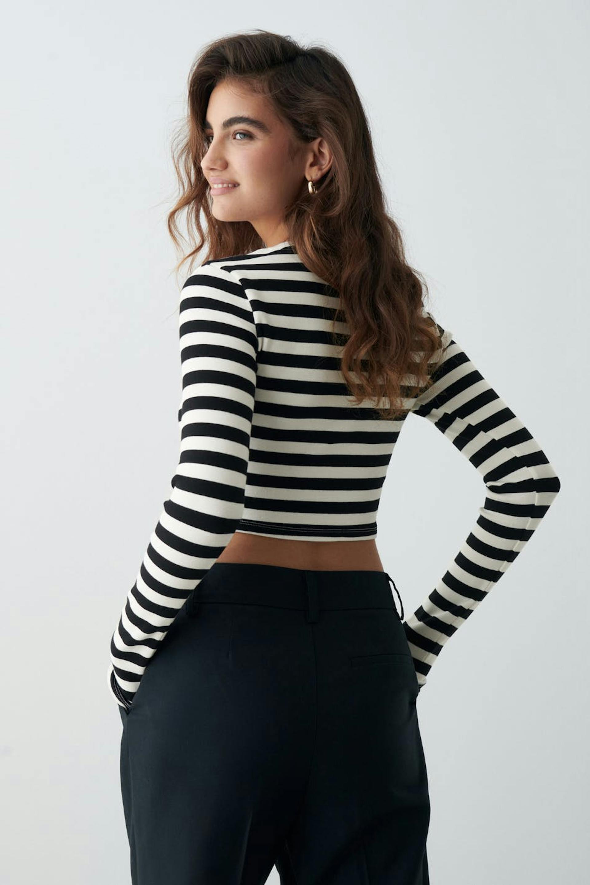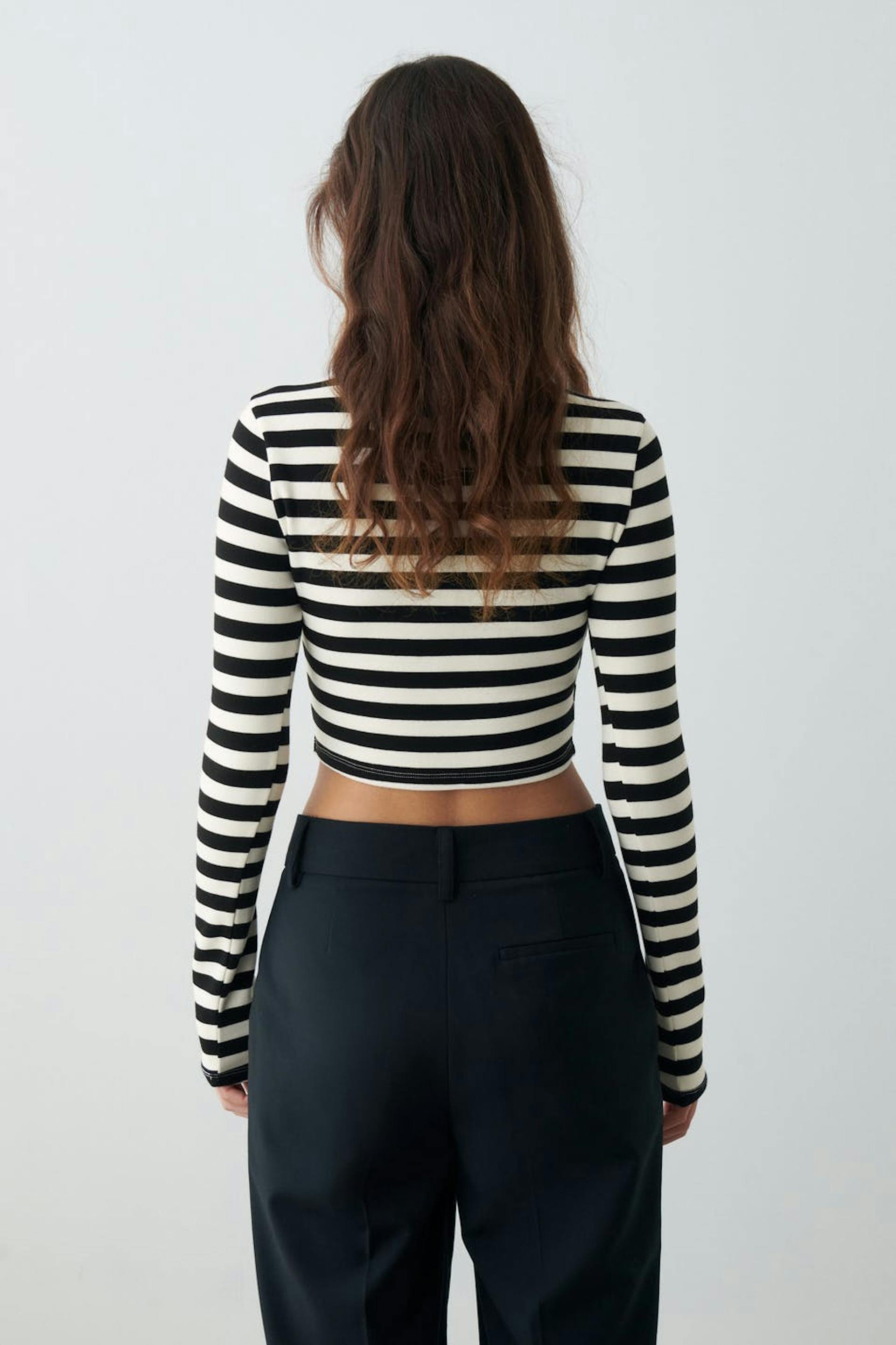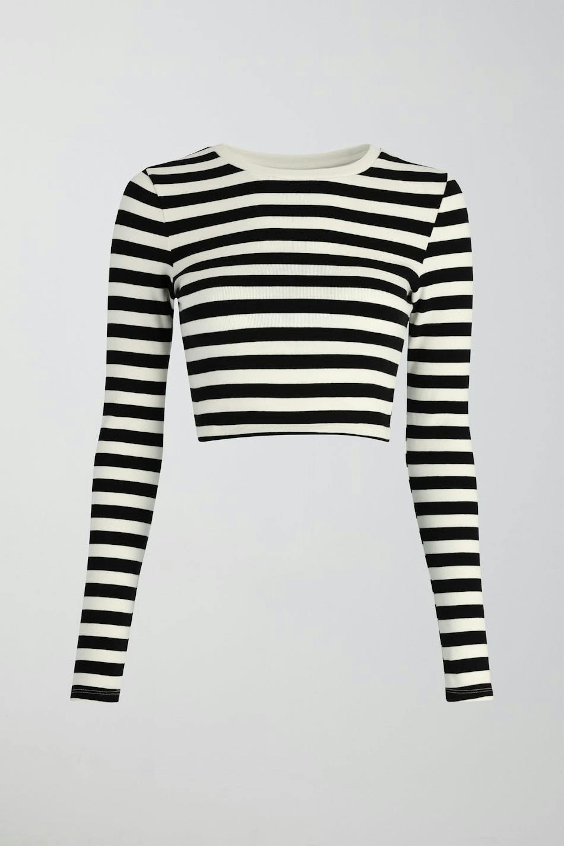 Striped top in jersey with figure-hugging fit. The top is black, white and long-sleeved. It has cropped length, round neckline and a stretchy quality.