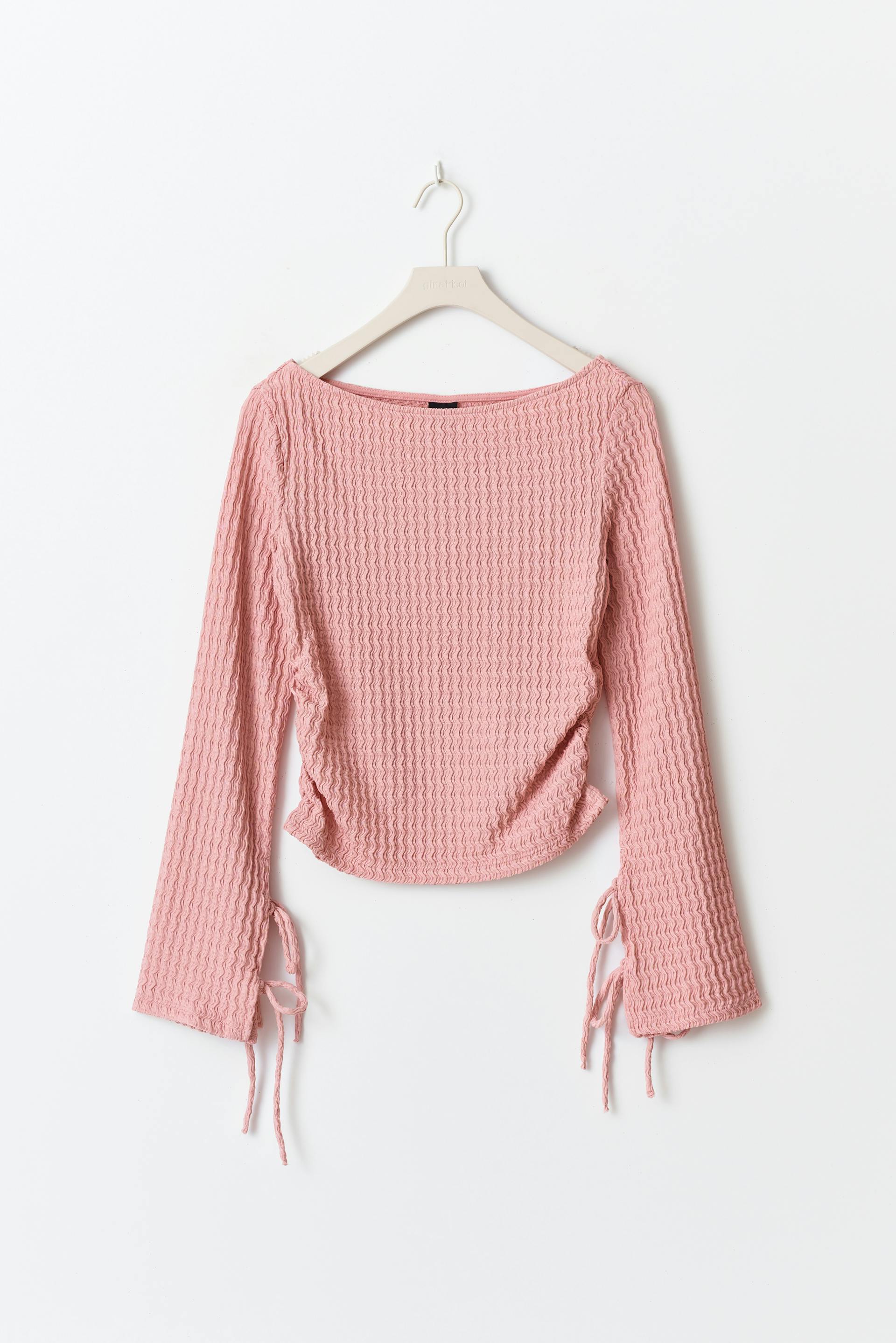 Structured top with boat neckline. The top is pink and has ruching in the sides. It has figure-hugging fit and long sleeve with tie details and slit on the sleeve ends.