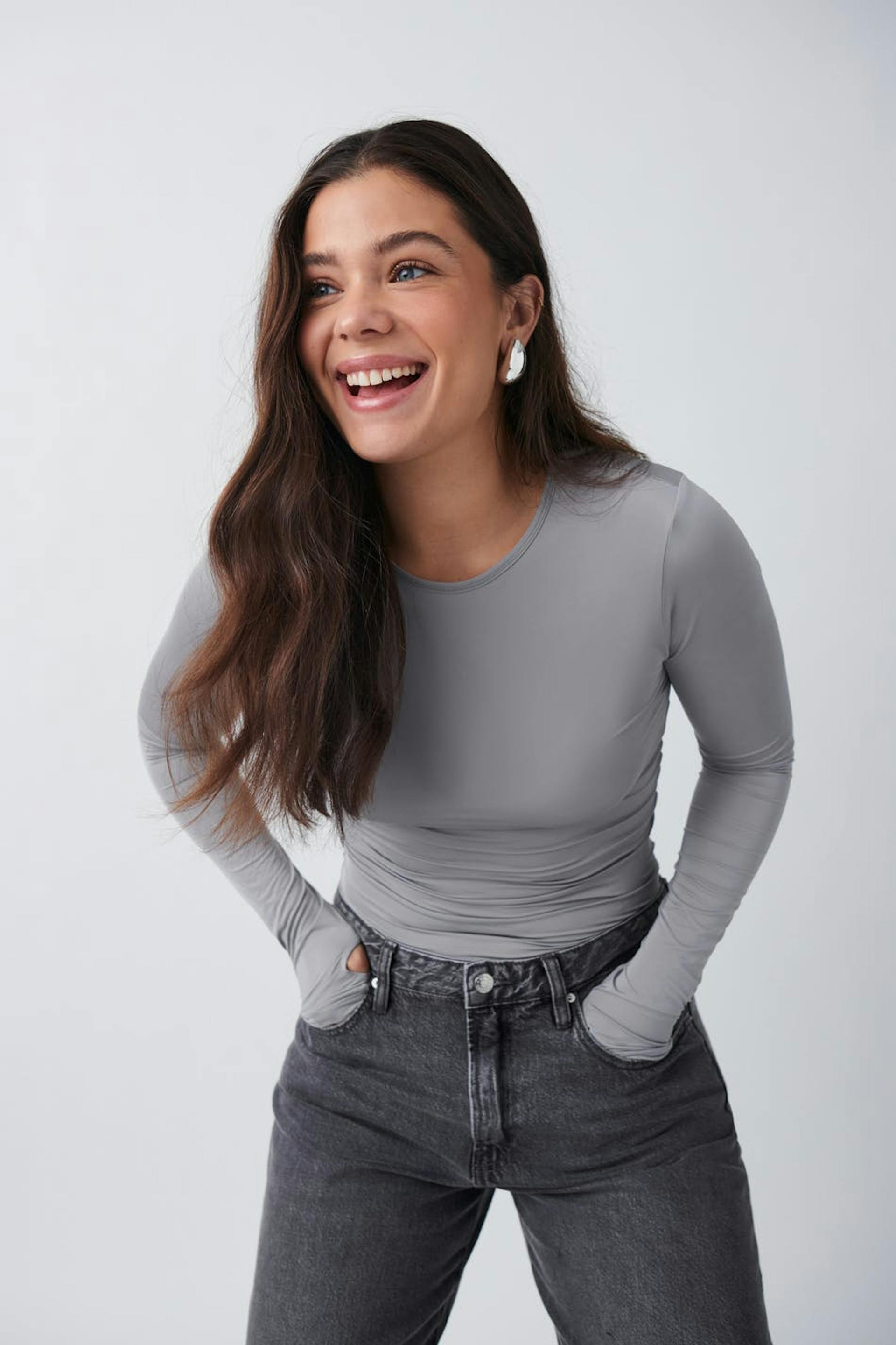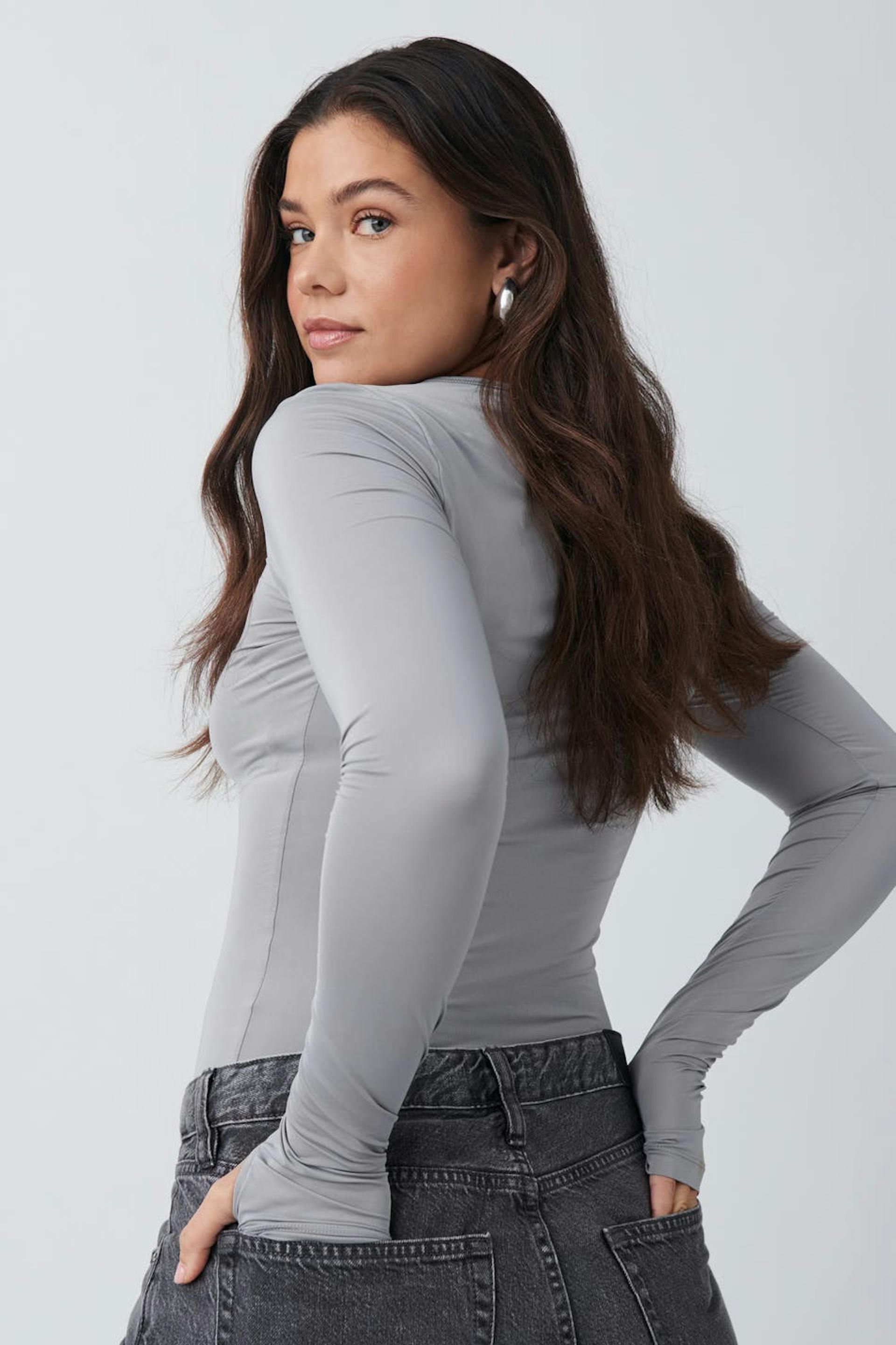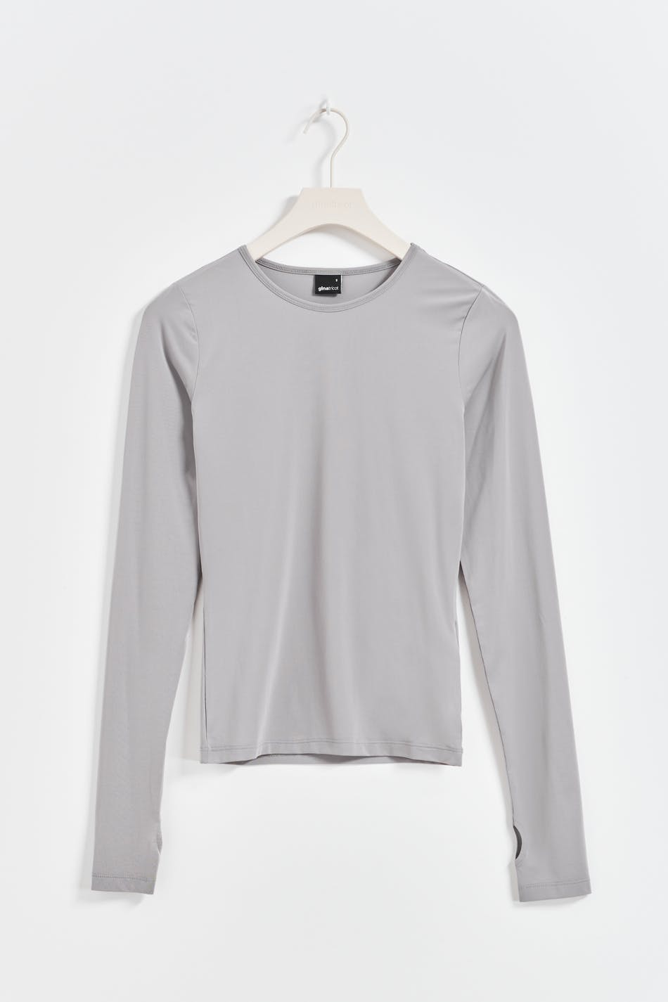 Long-sleeved top in jersey with thumbholes. The top is grey and has figure-hugging fit. It has crew neckline and stretchy quality.