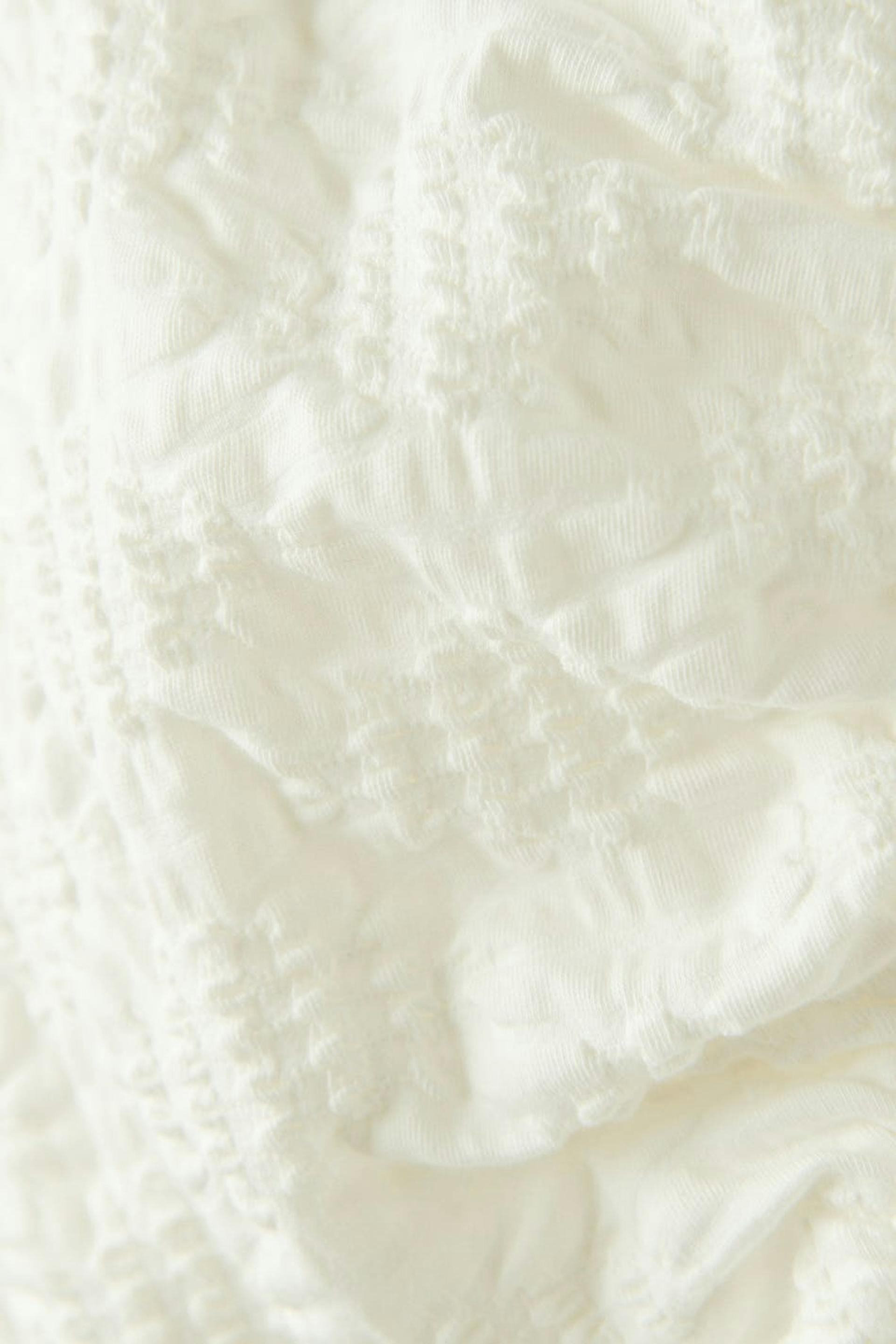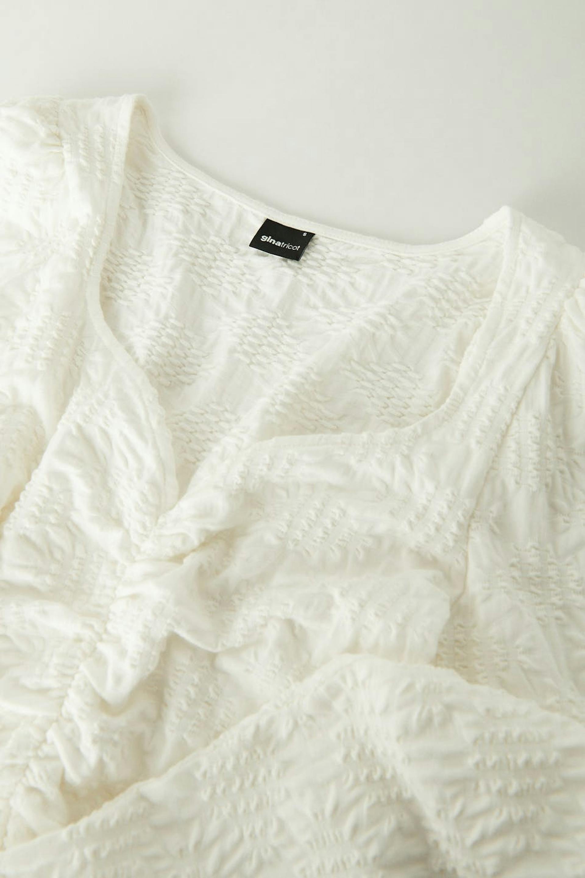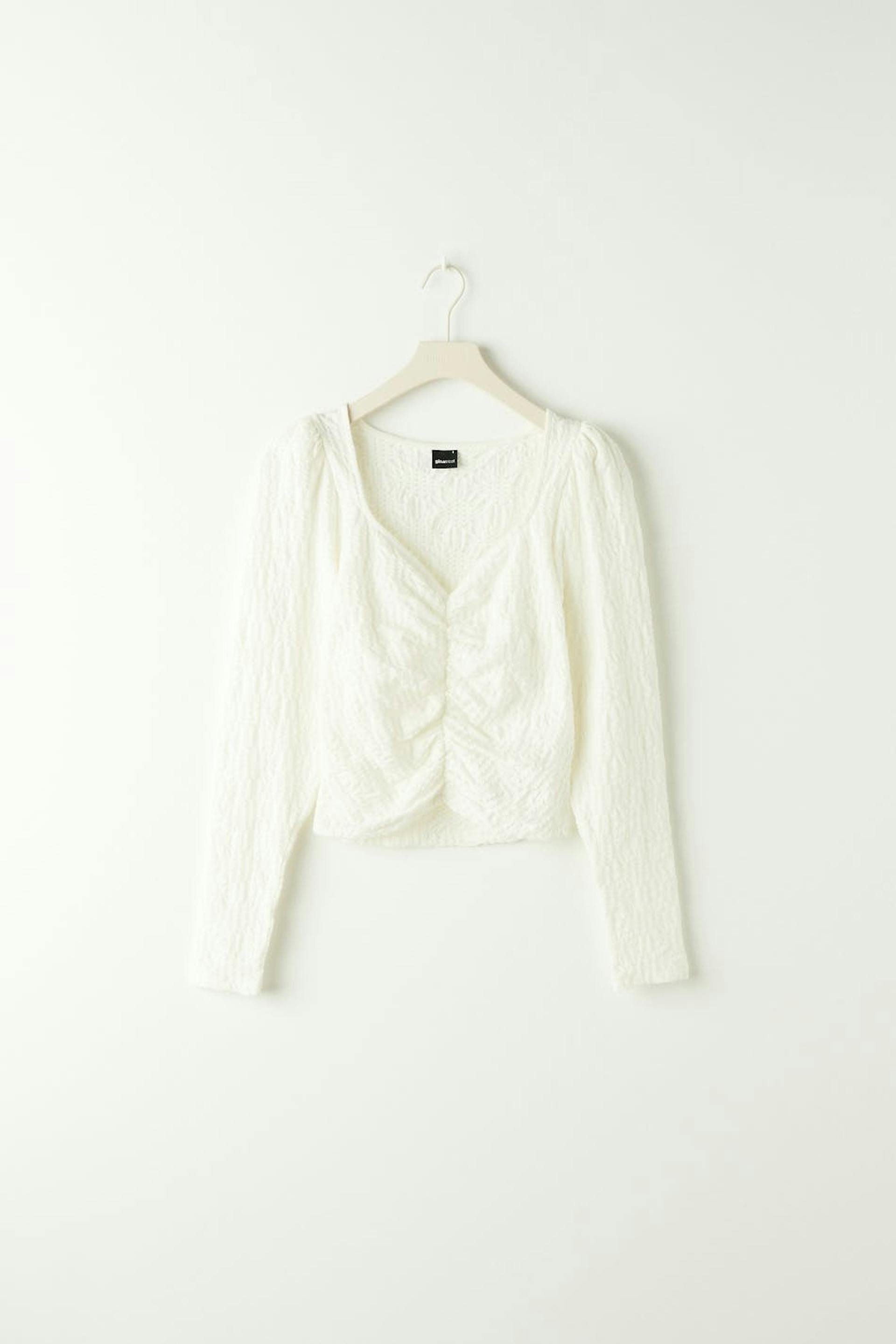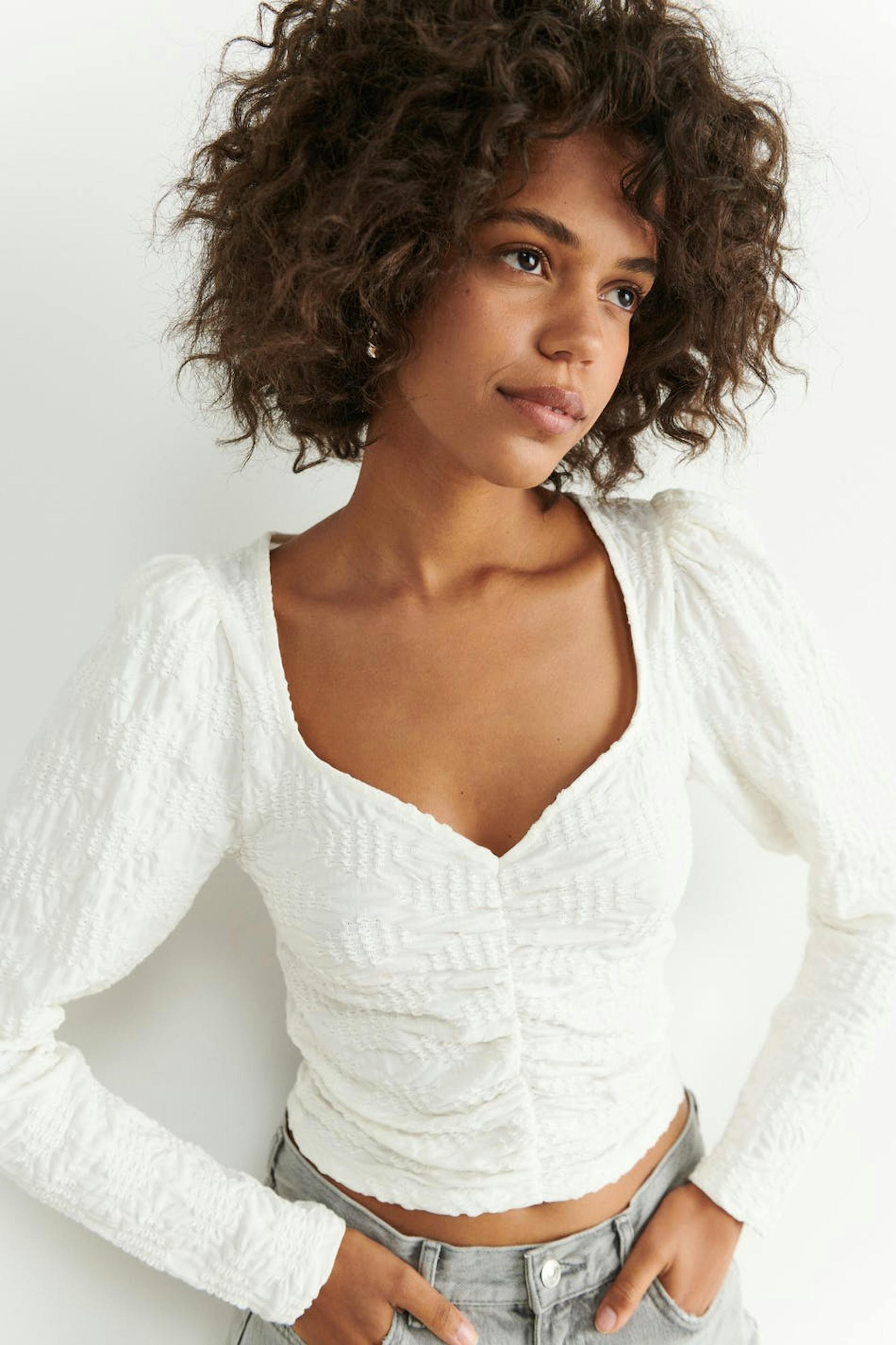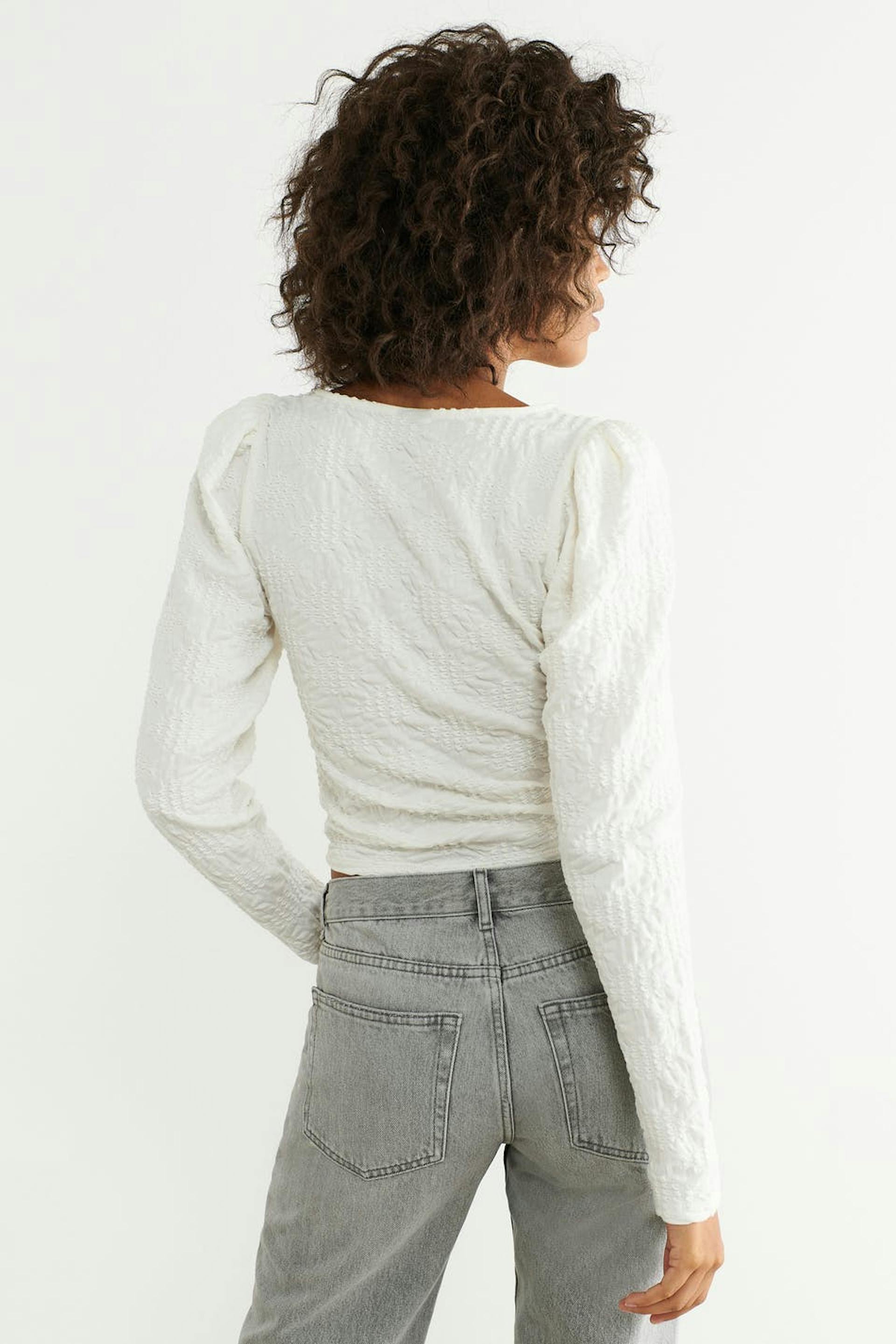 Jersey top with puff sleeves. The jersey top is white and has a fitted fit. It has v-neck cut and gathering at the front.