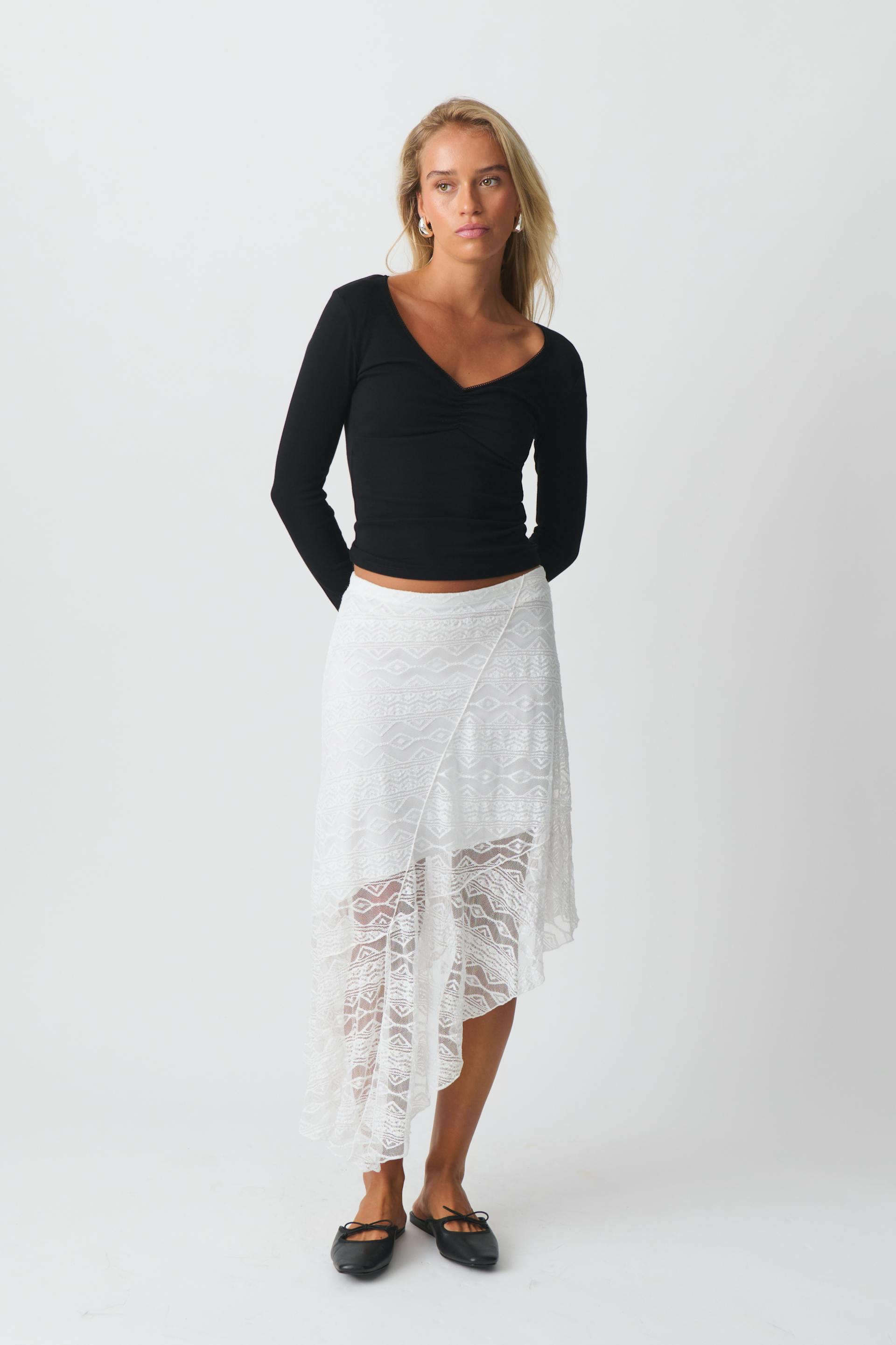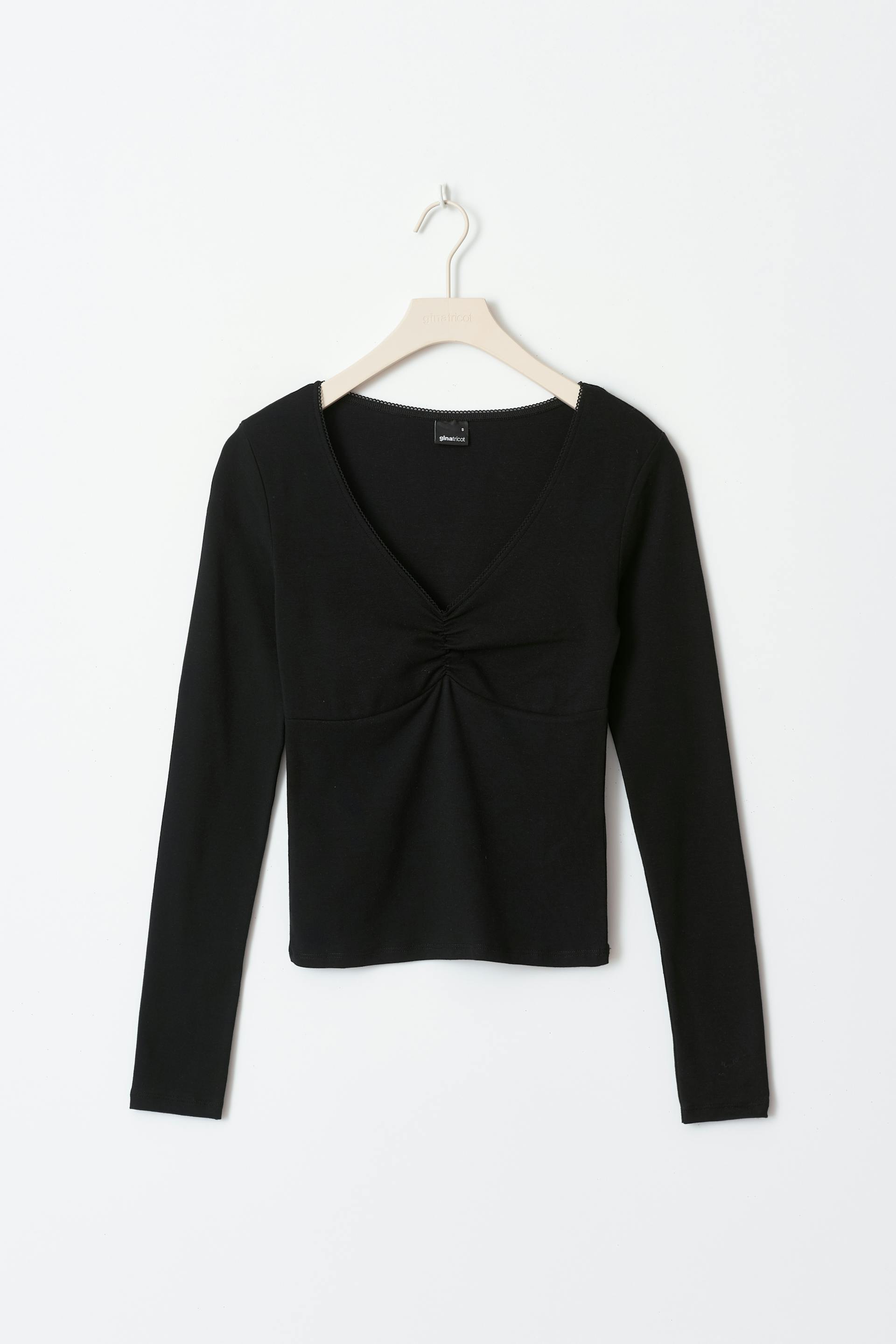 Long-sleeved top with ruched bust. The top is black and has v-neck. It has normal fit and ribbed quality.
