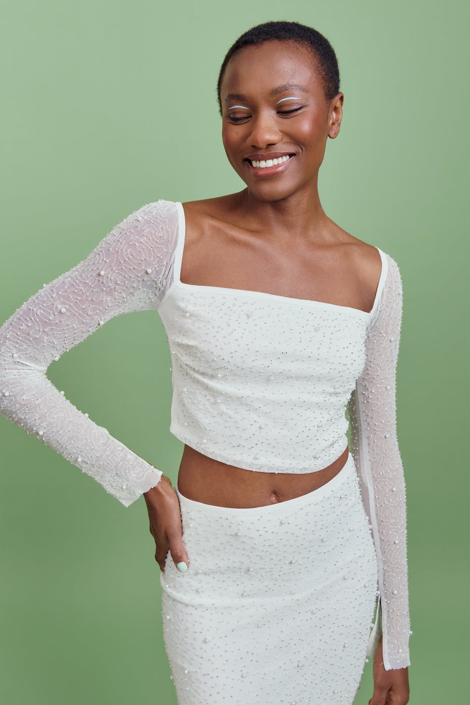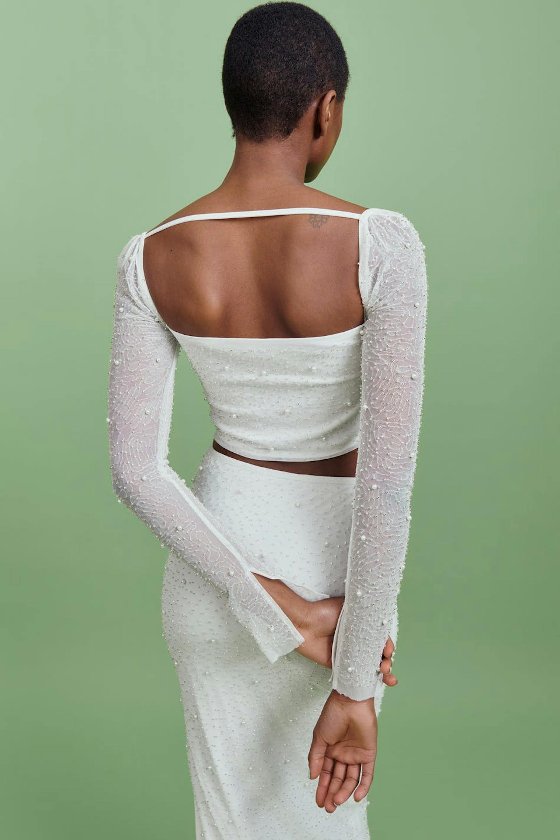 Long-sleeved top with pearls. The top is perfect for the party, white and cropped. It has figure-hugging fit, open back, square neckline and sheer sleeve with slit.