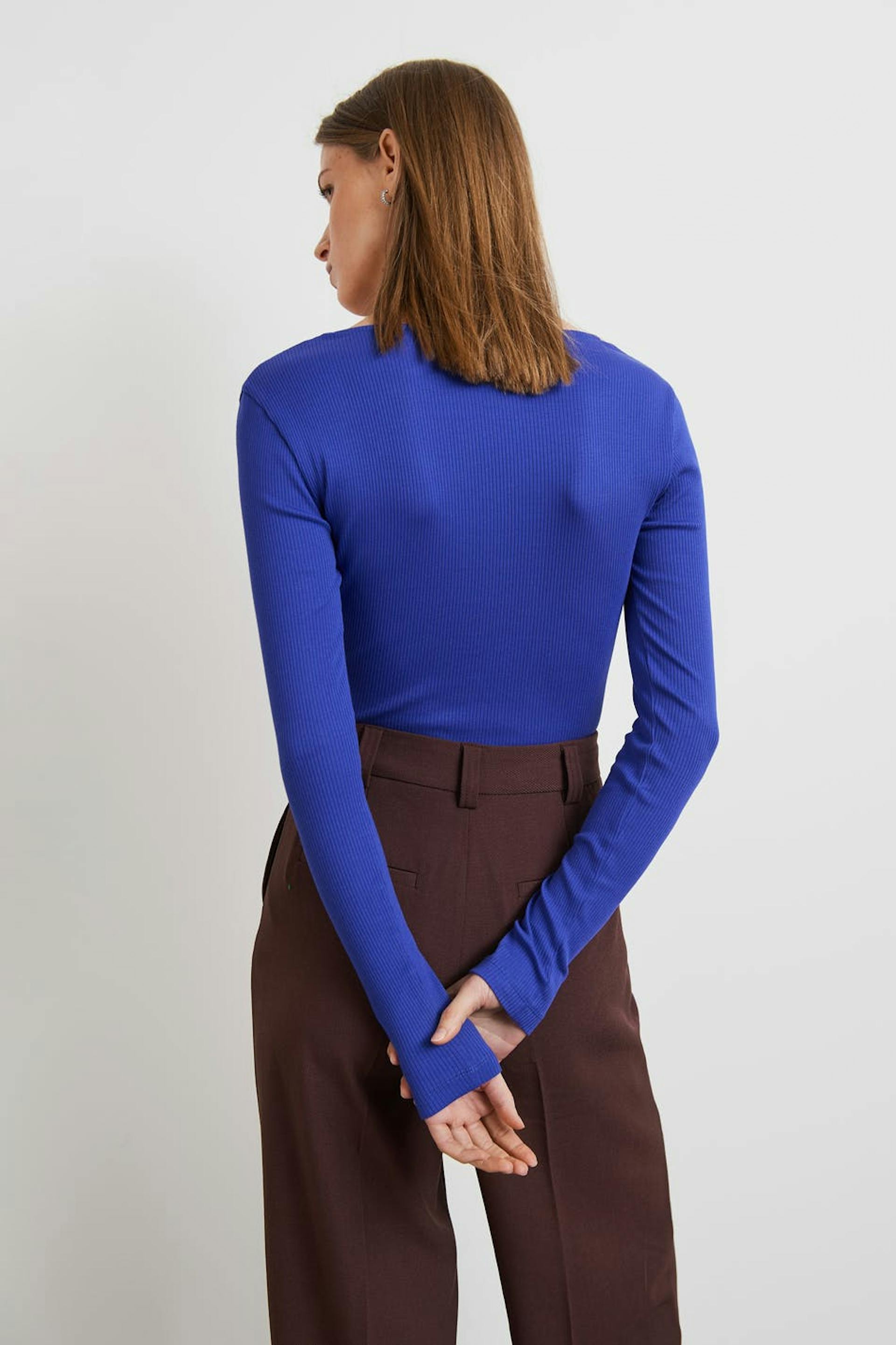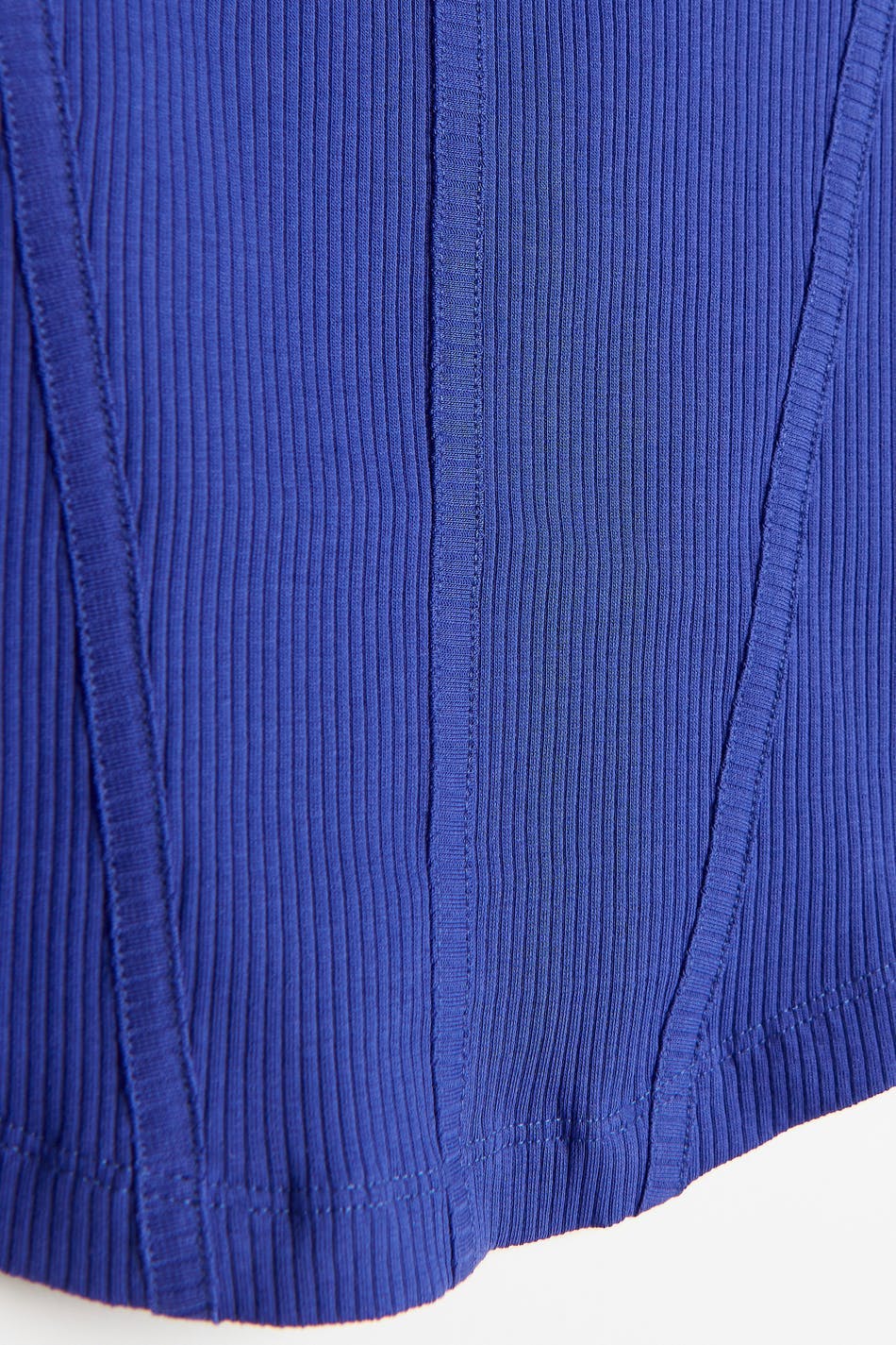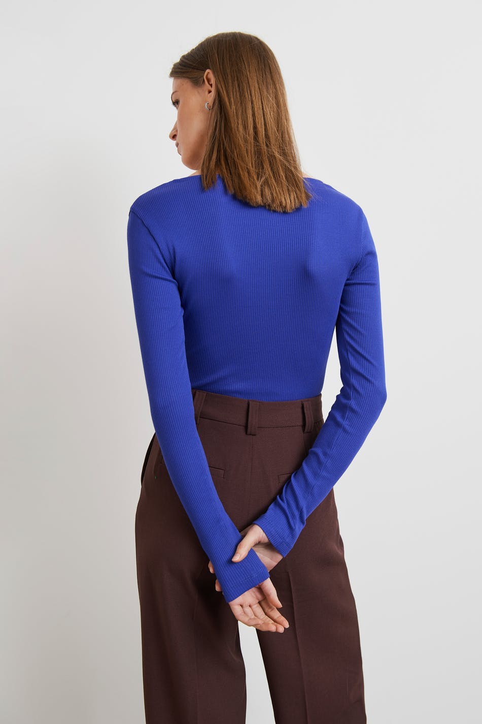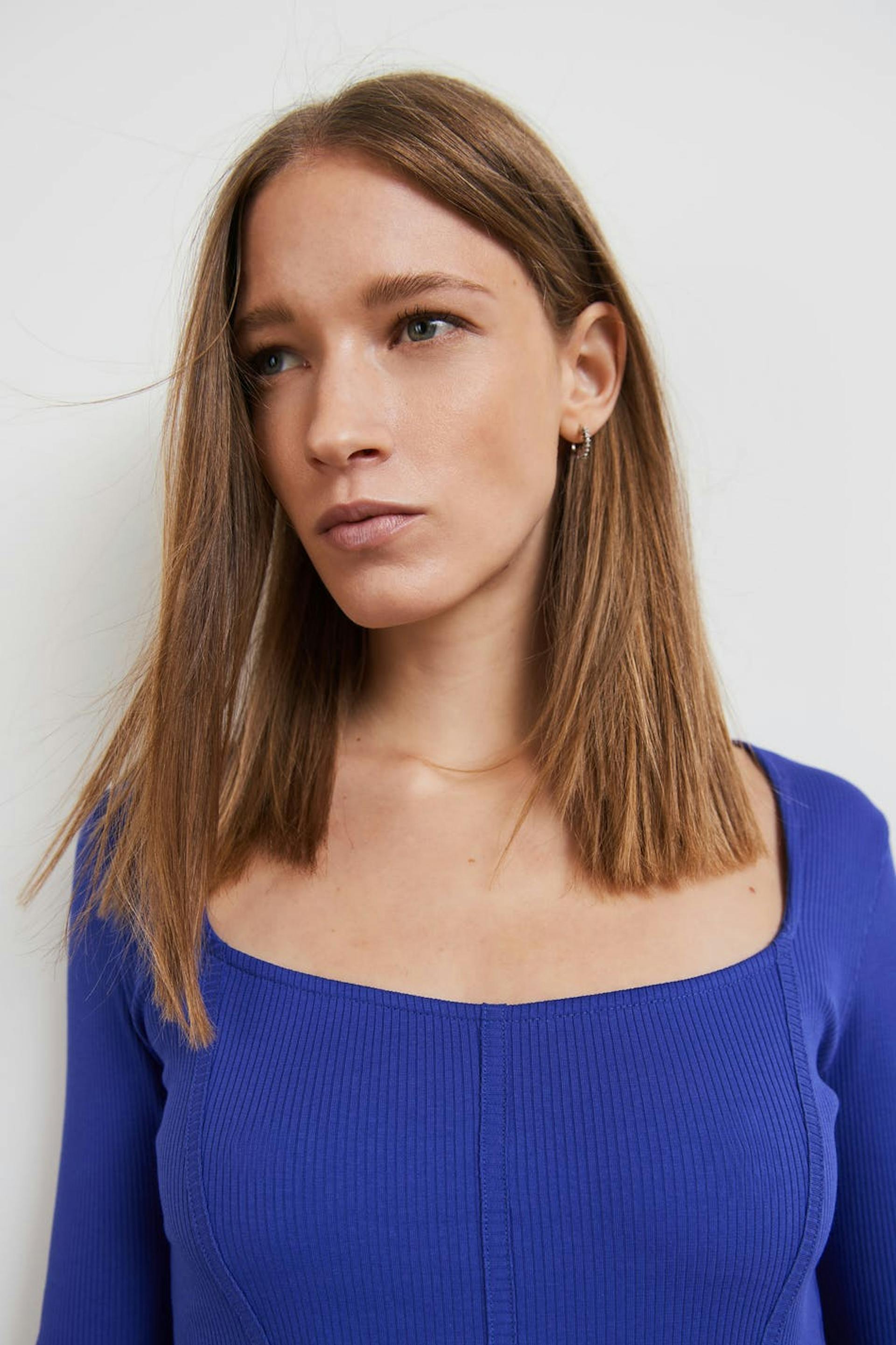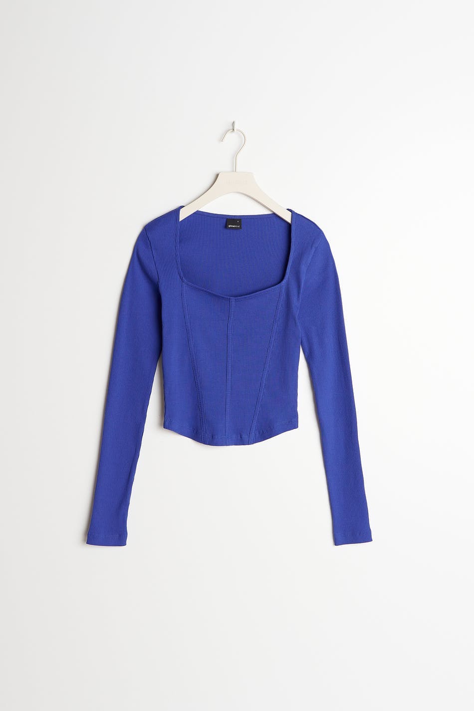 Ribbed top with square neckline. The top is blue and has a fitted fit. It is made of jersey and has long sleeves and seam details at the front.