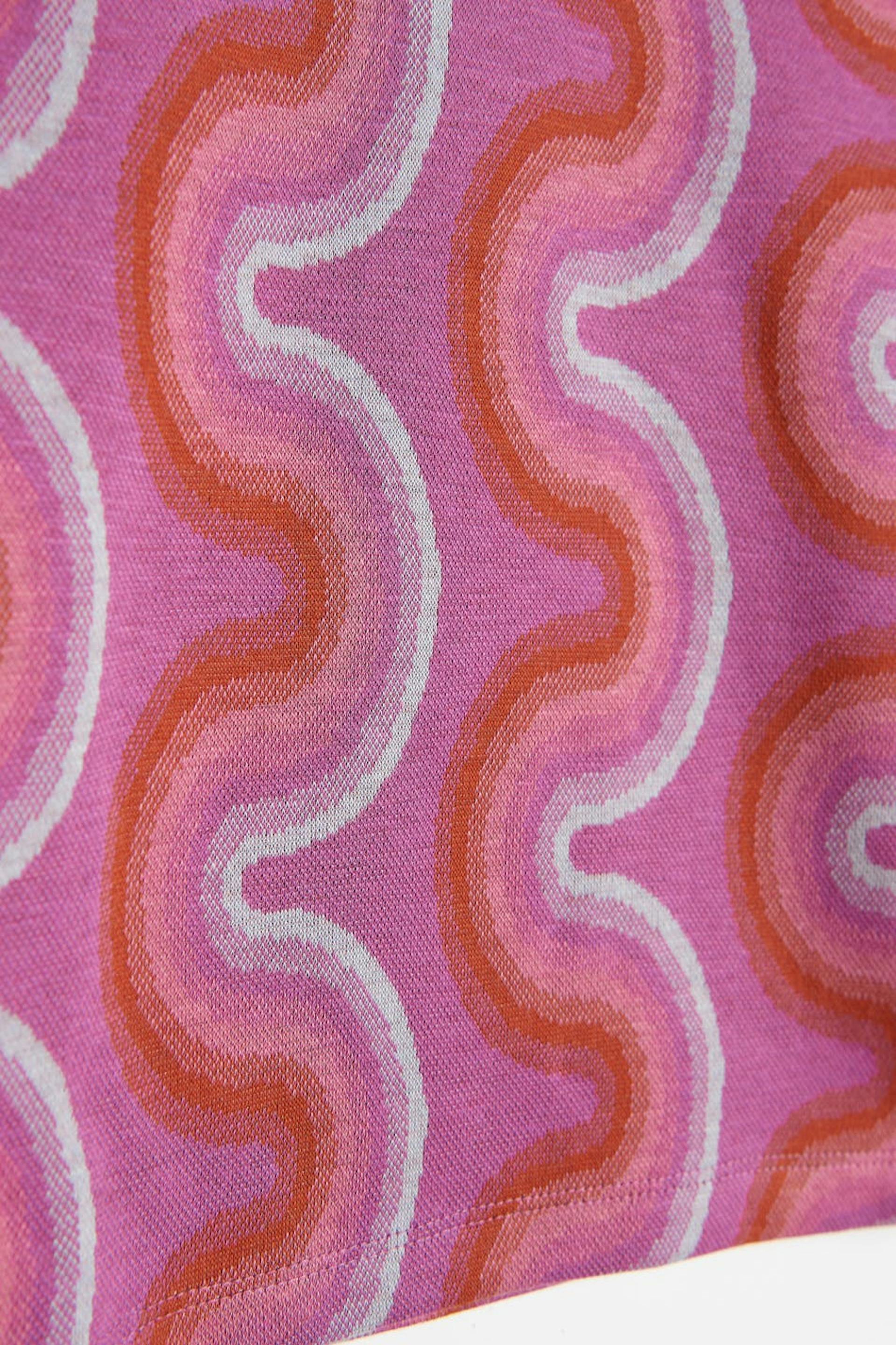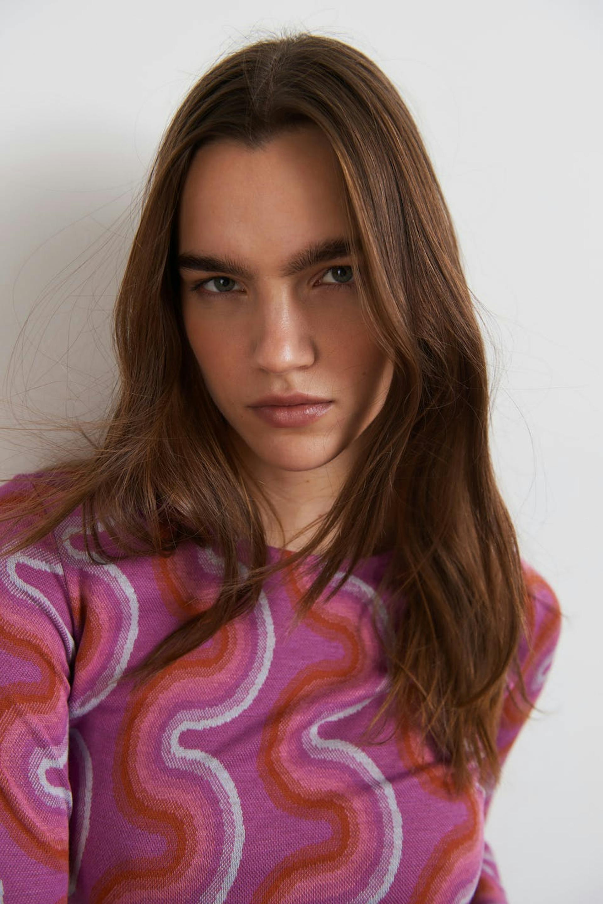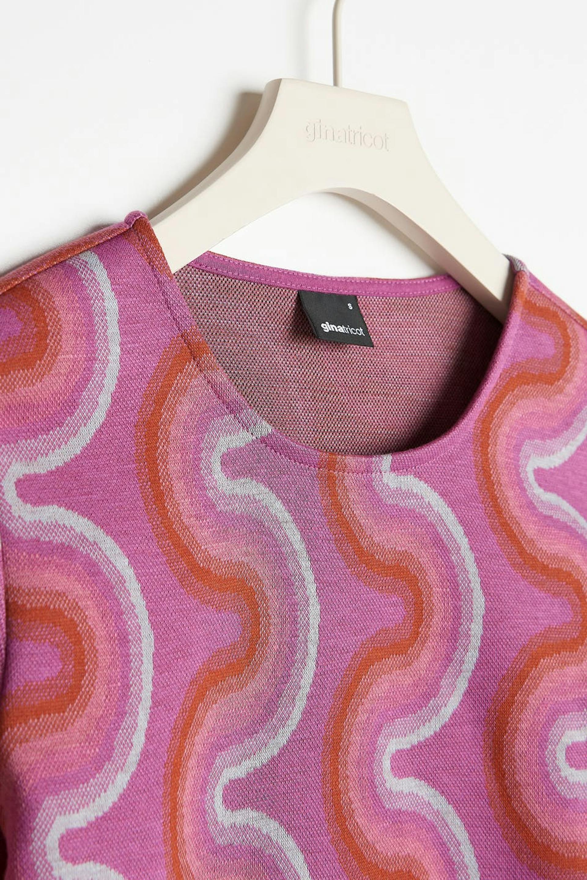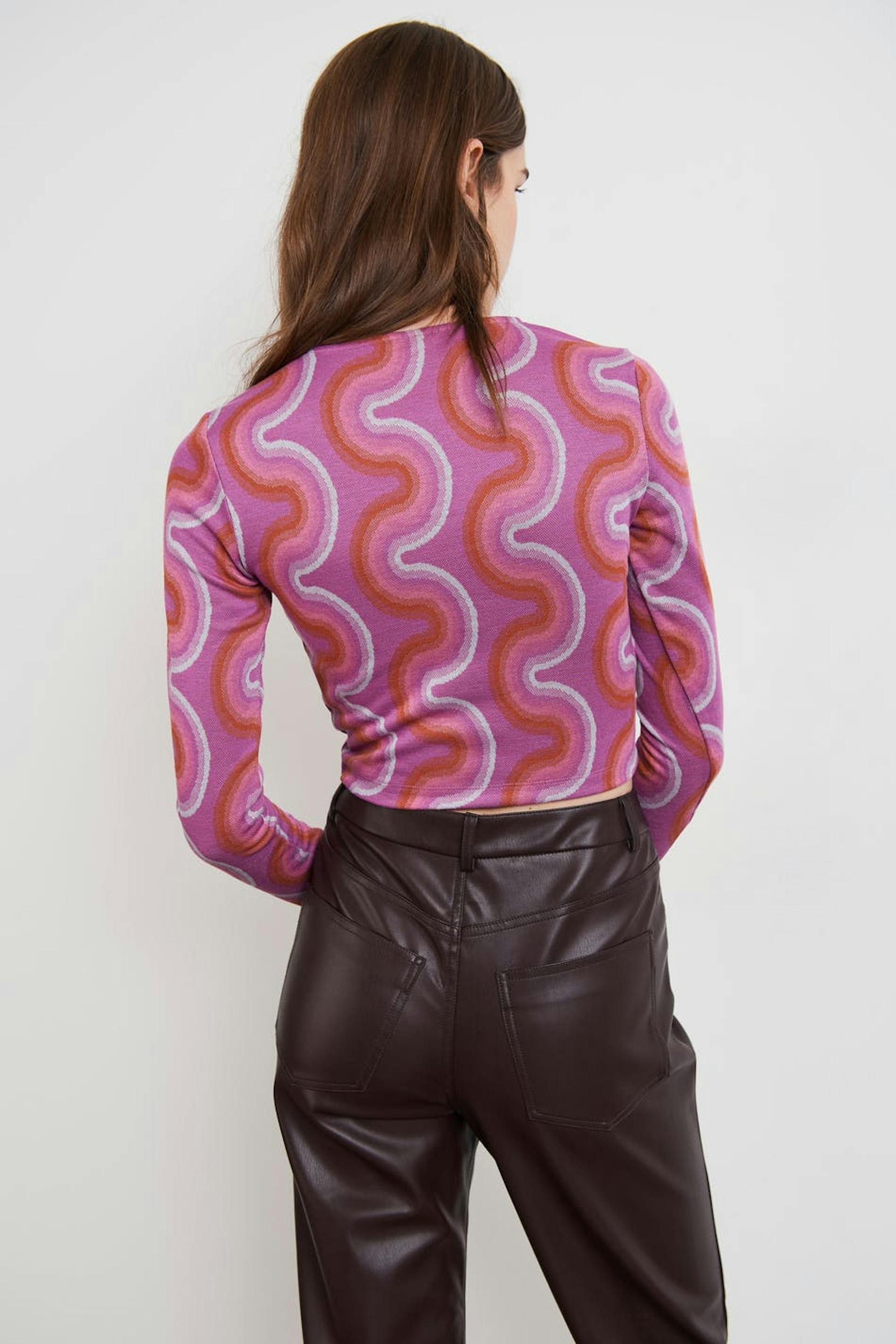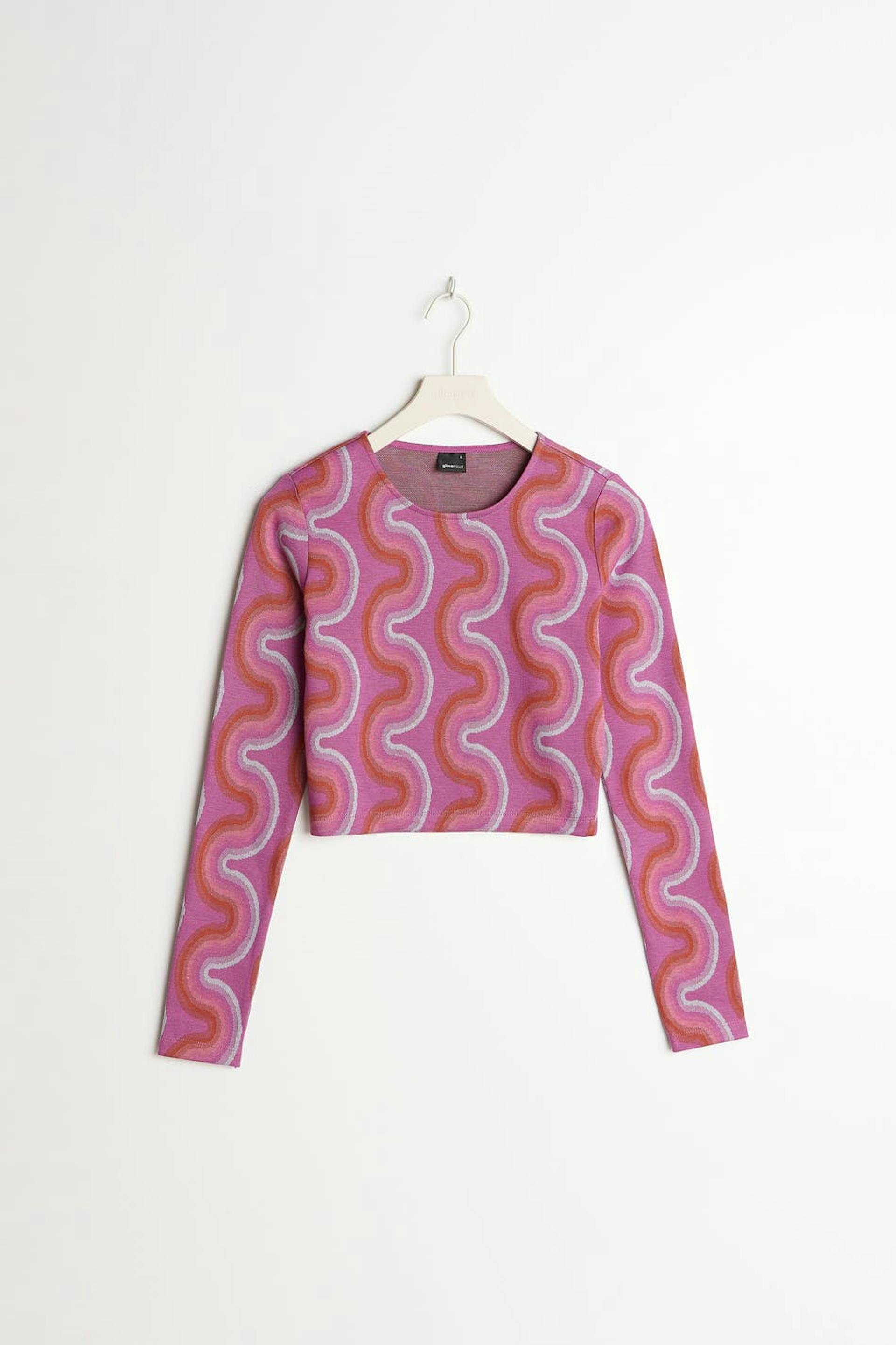 Jacquard patterned top with a fitted fit. The top is pink and has long sleeves. It has a crew neckline and a cropped length.