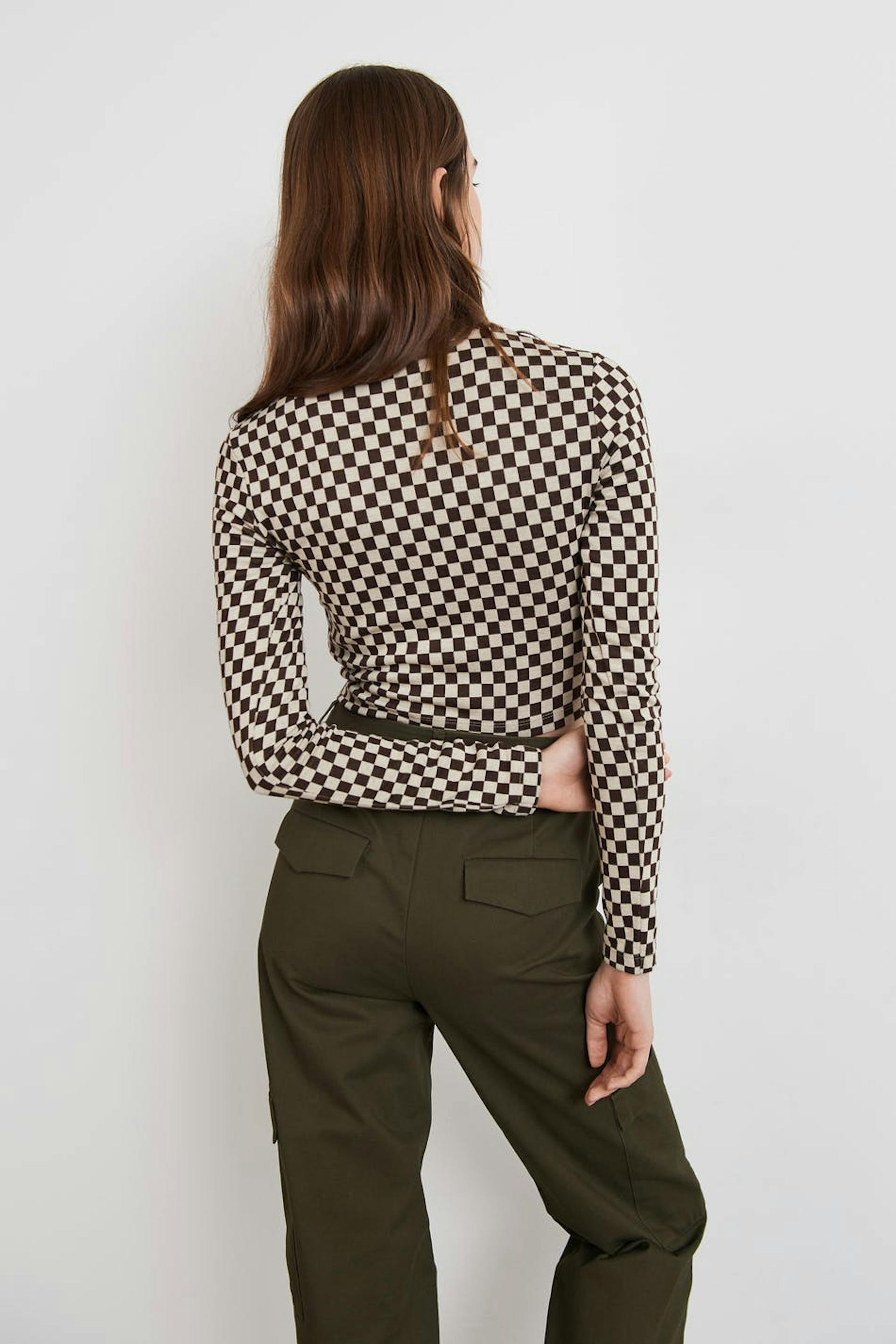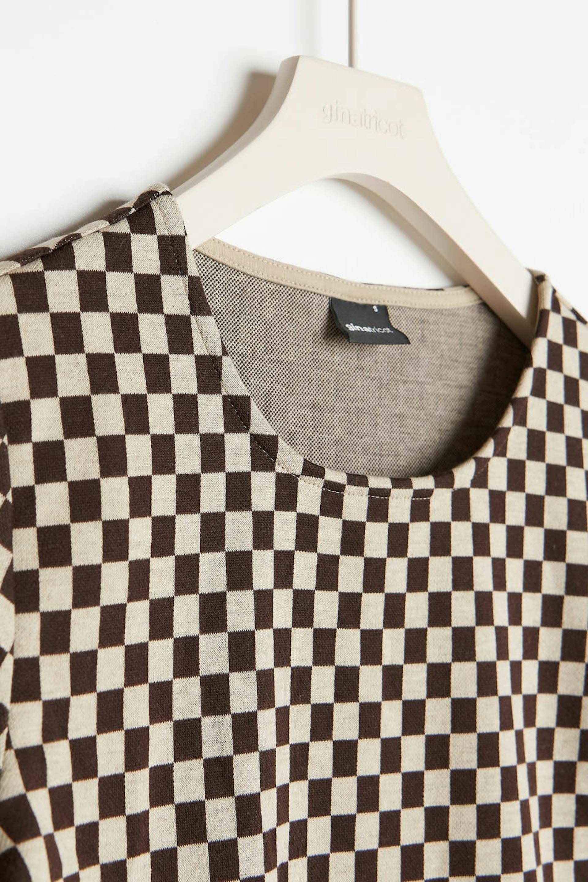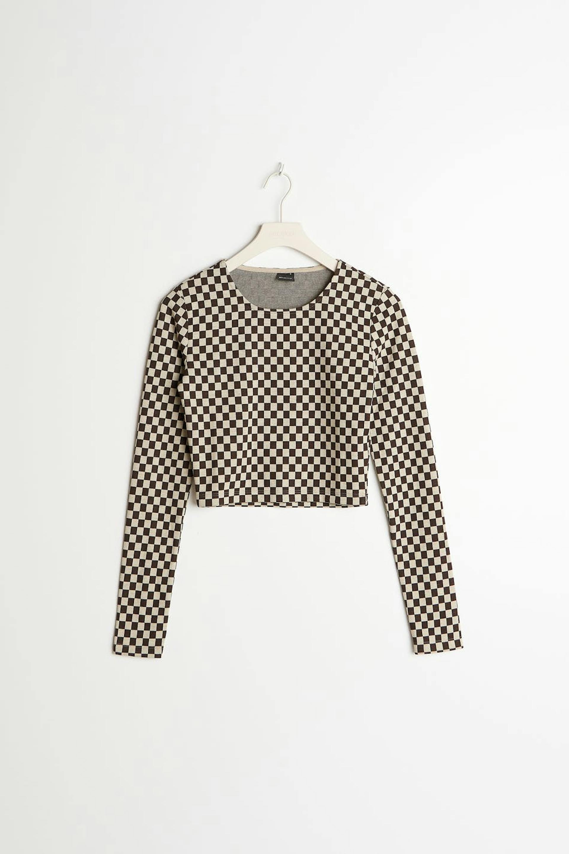 Jacquard patterned top with a fitted fit. The top is brown, white and chequered. It has long sleeves, a crew neckline and a cropped length.