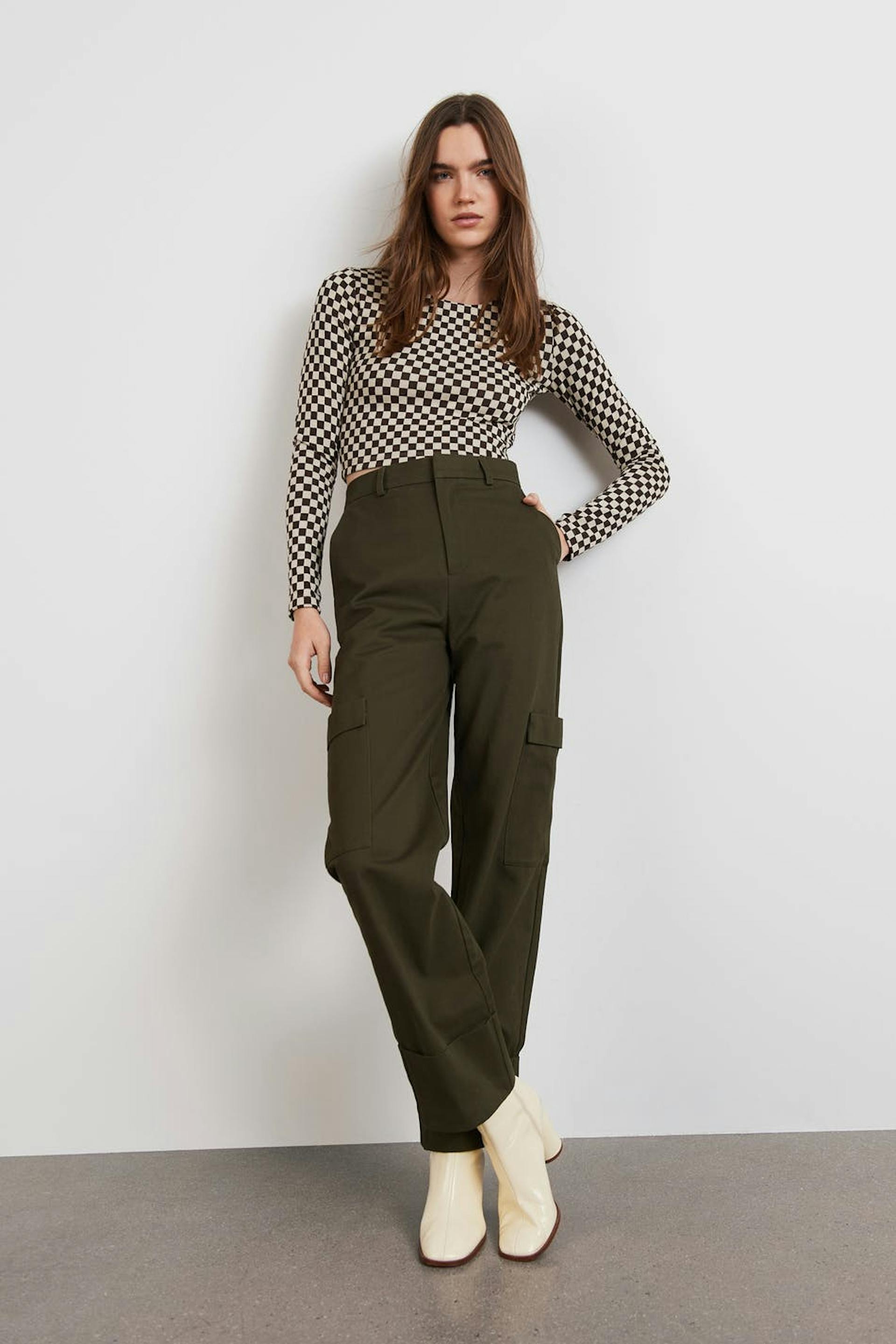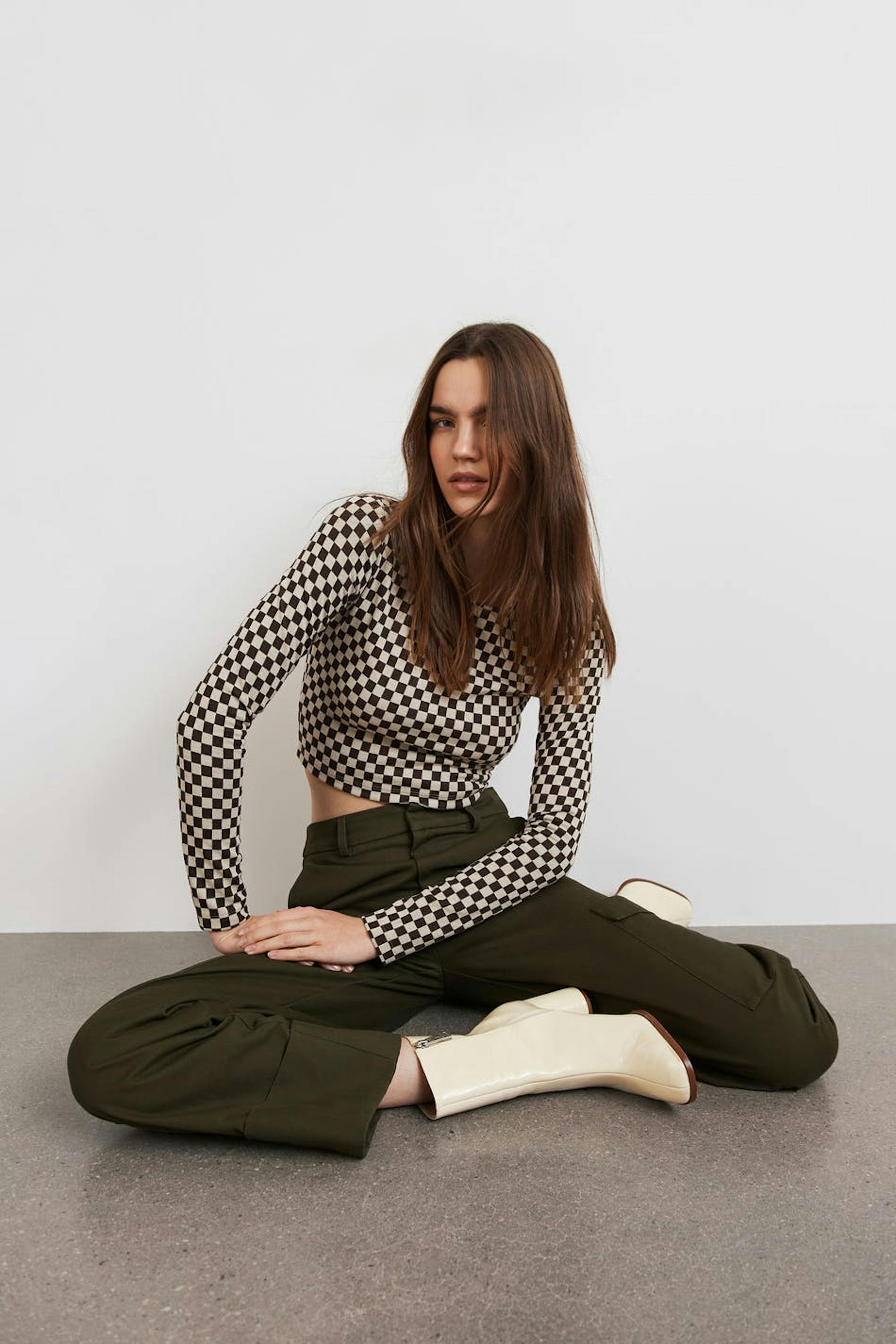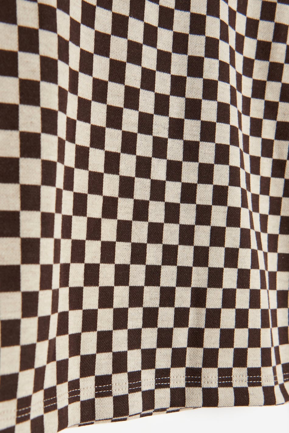 Jacquard patterned top with a fitted fit. The top is brown, white and chequered. It has long sleeves, a crew neckline and a cropped length.
