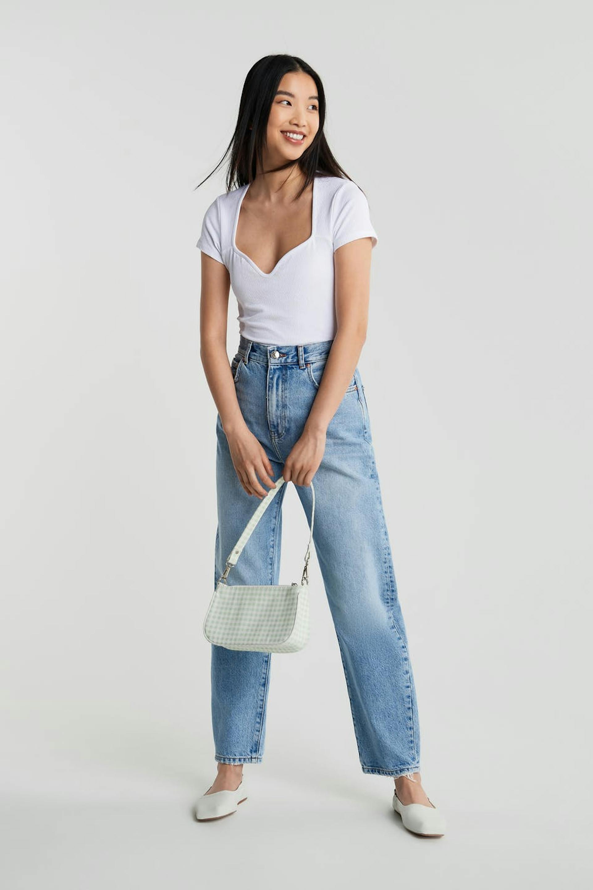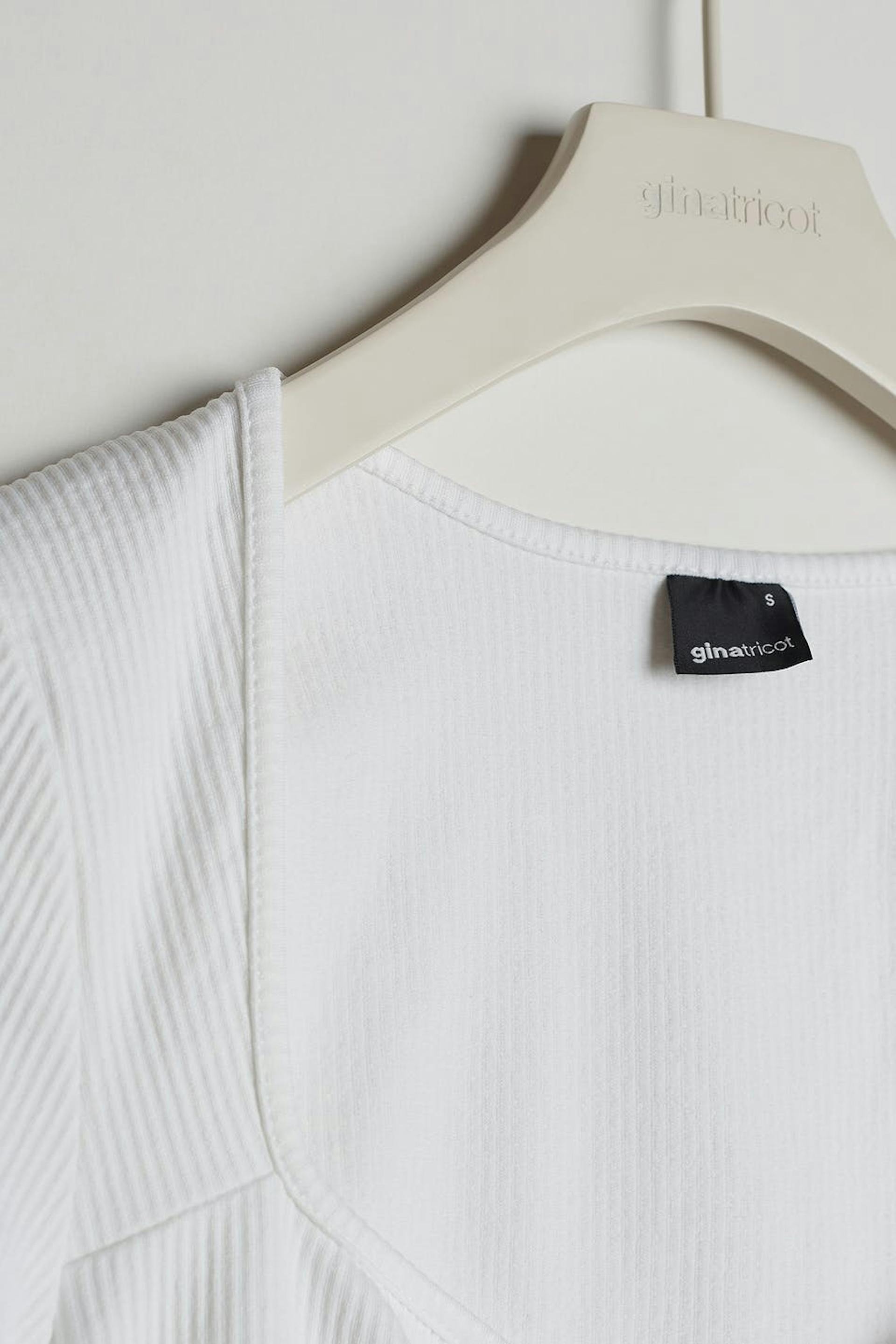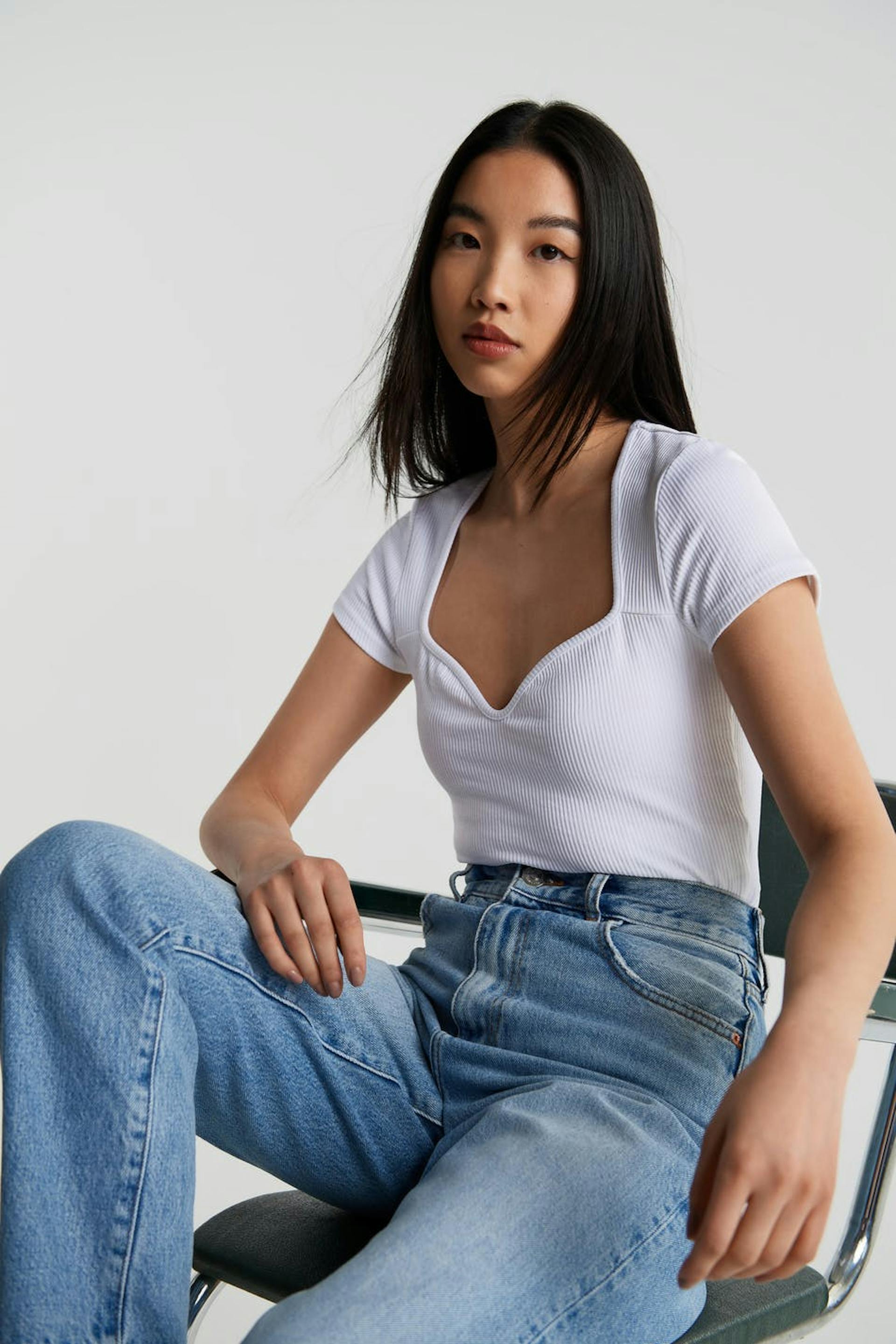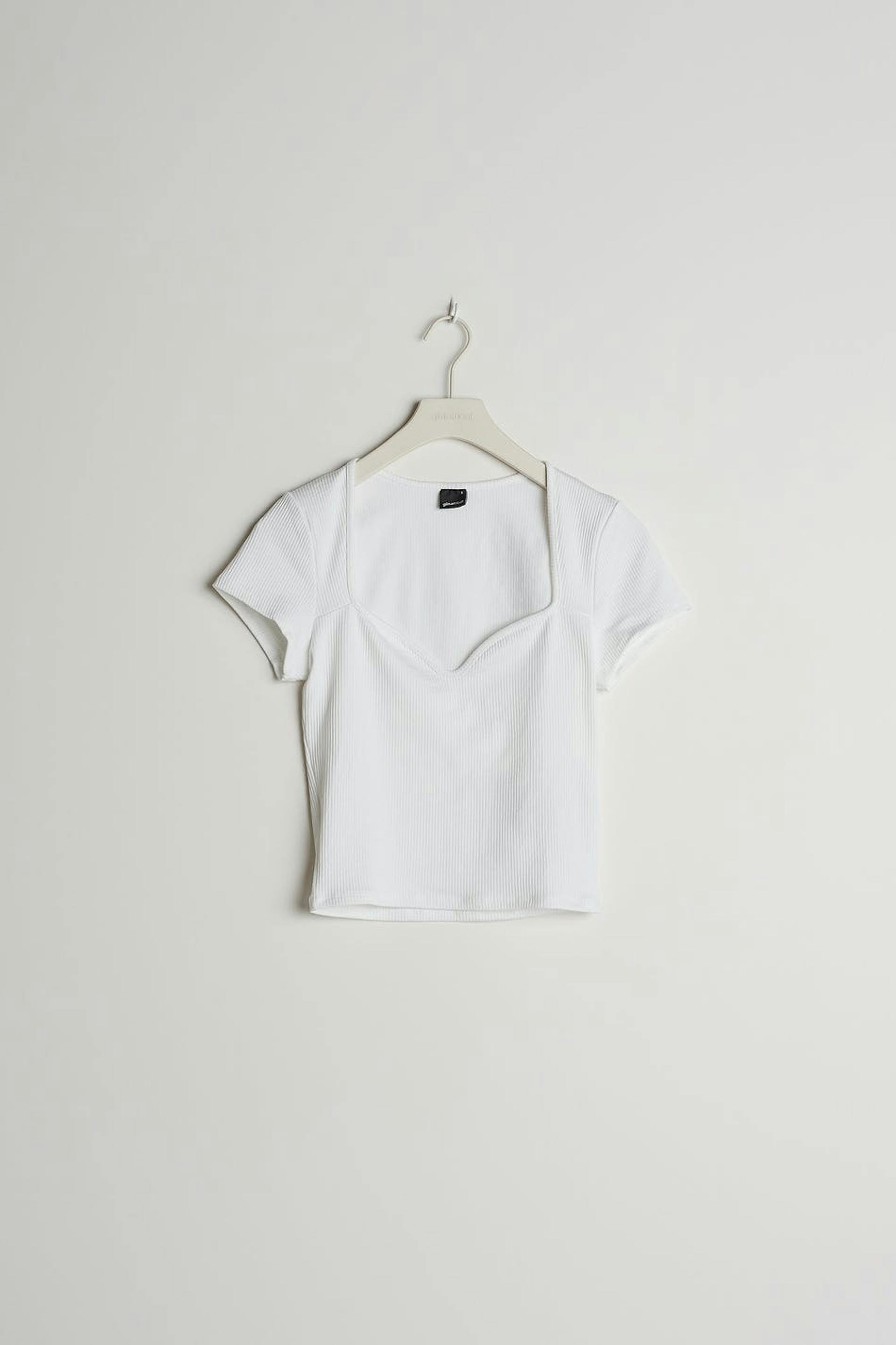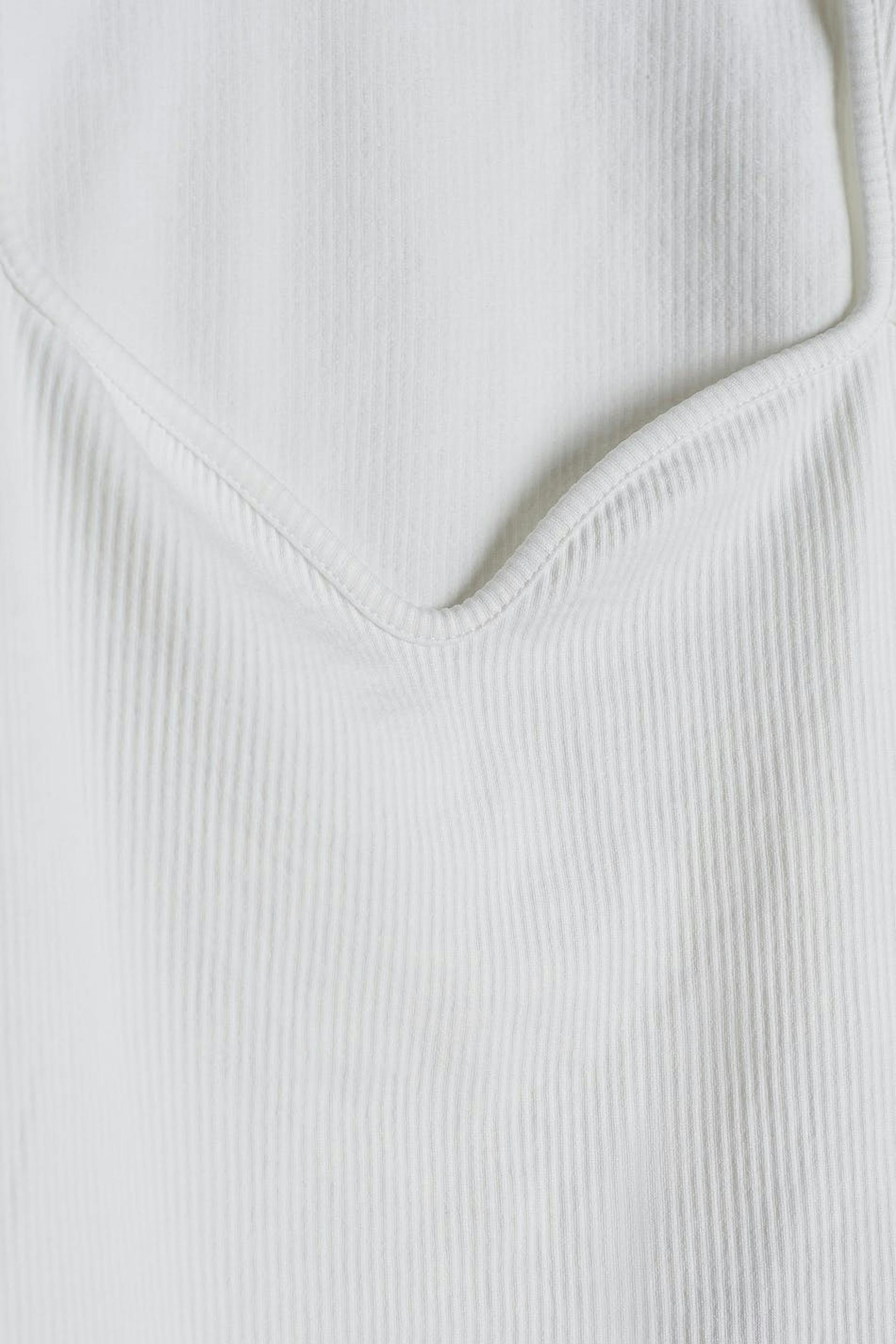Short-sleeved top with a fitted fit. The top is white and ribbed and has a sweetheart neckline.