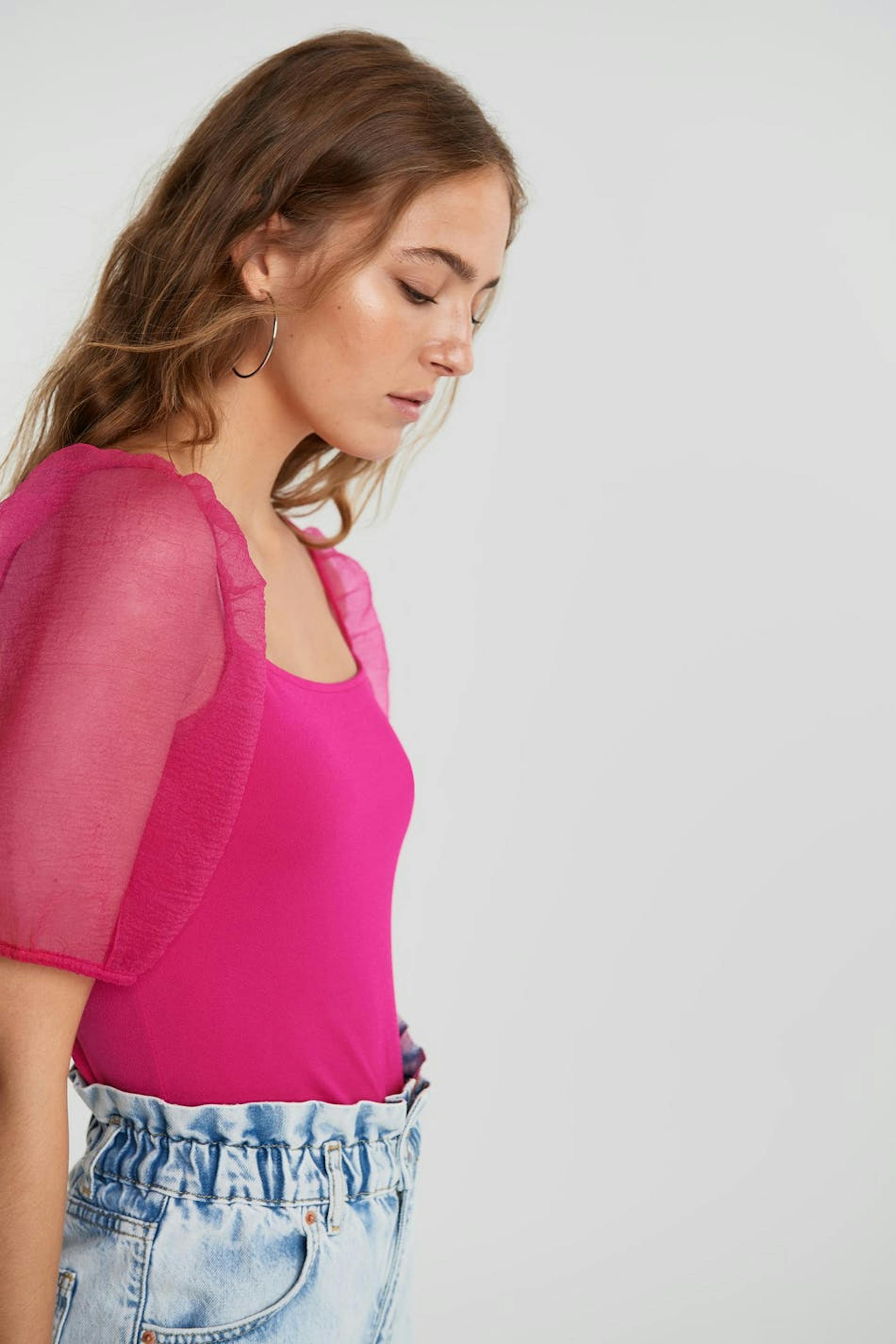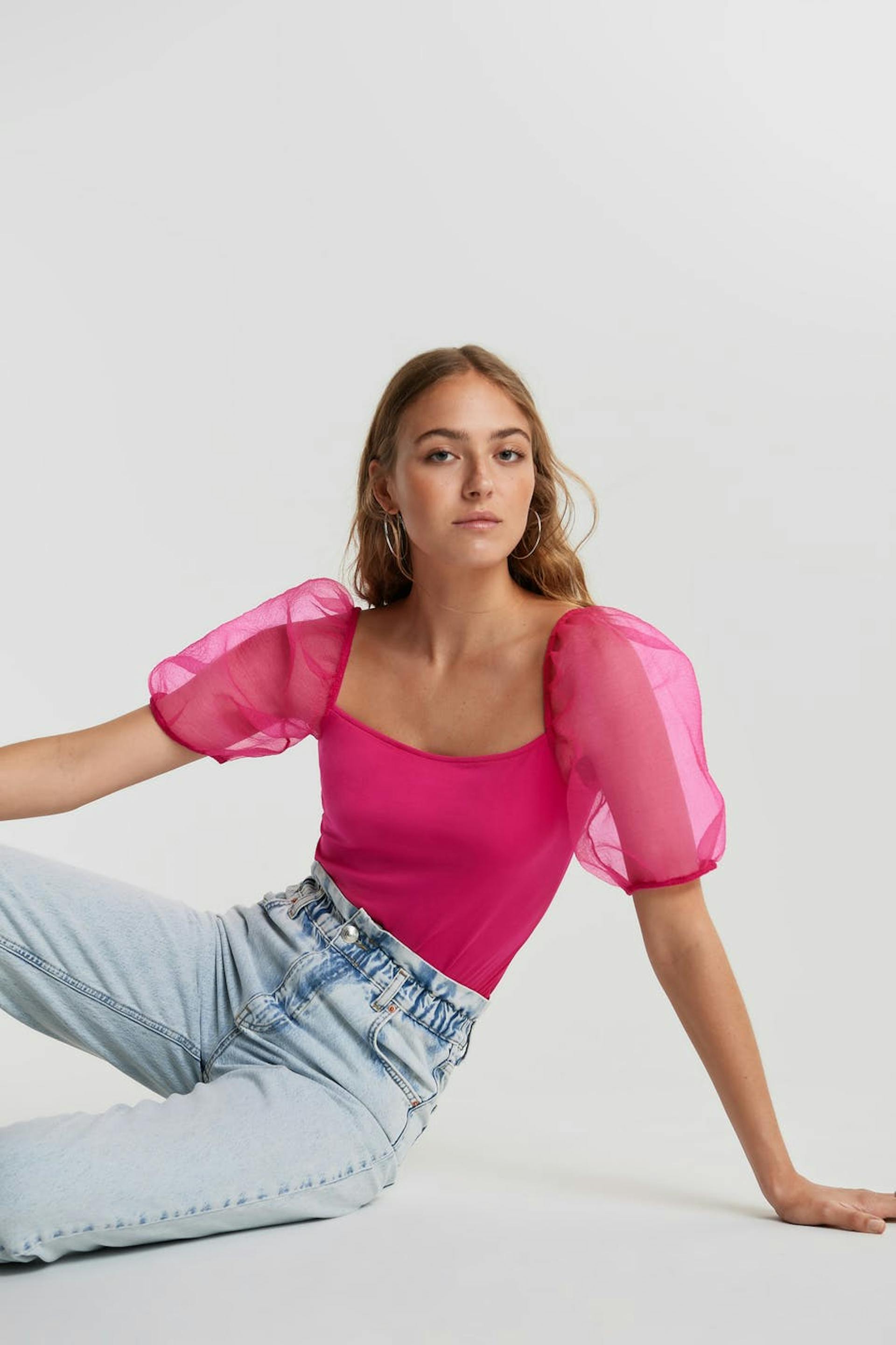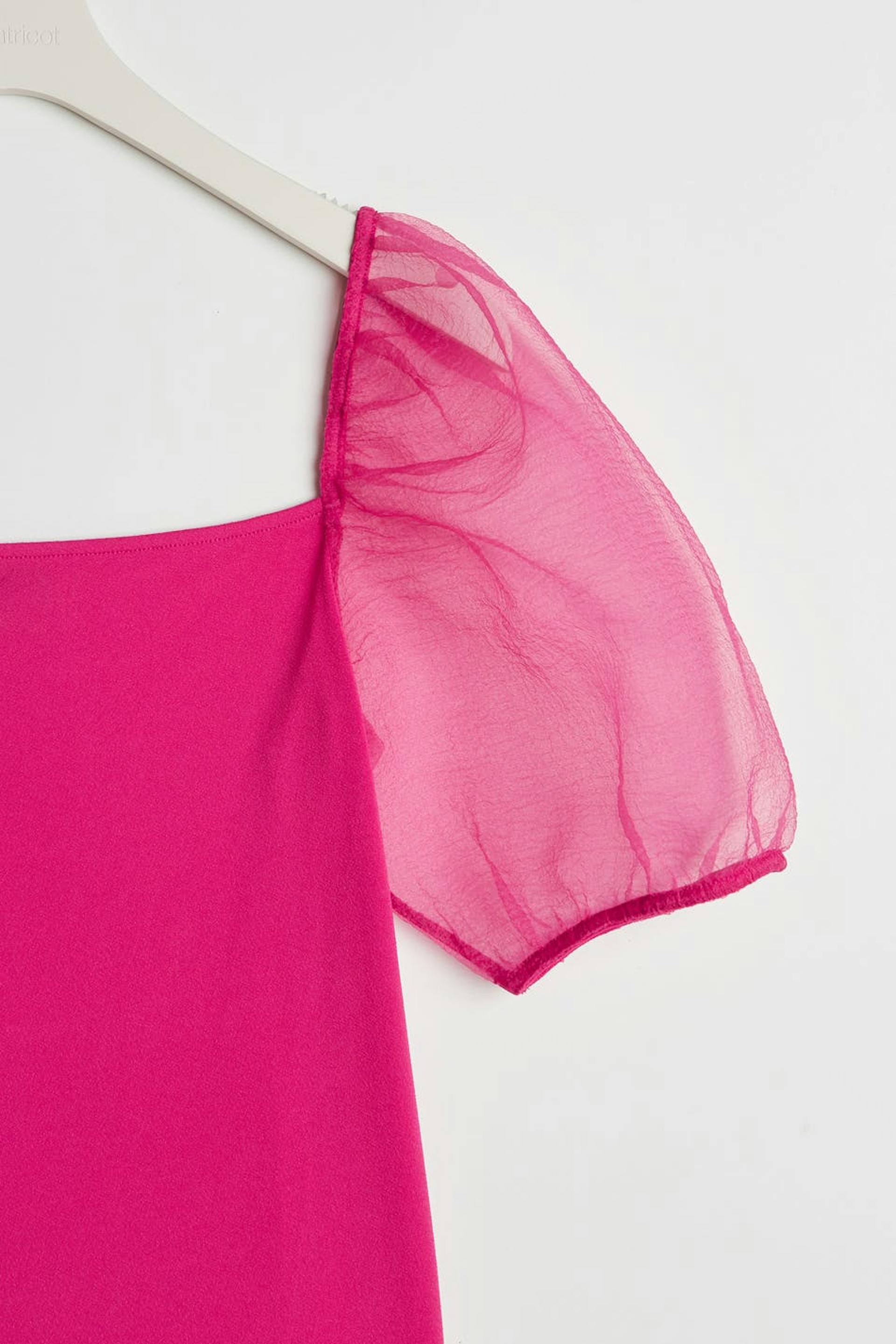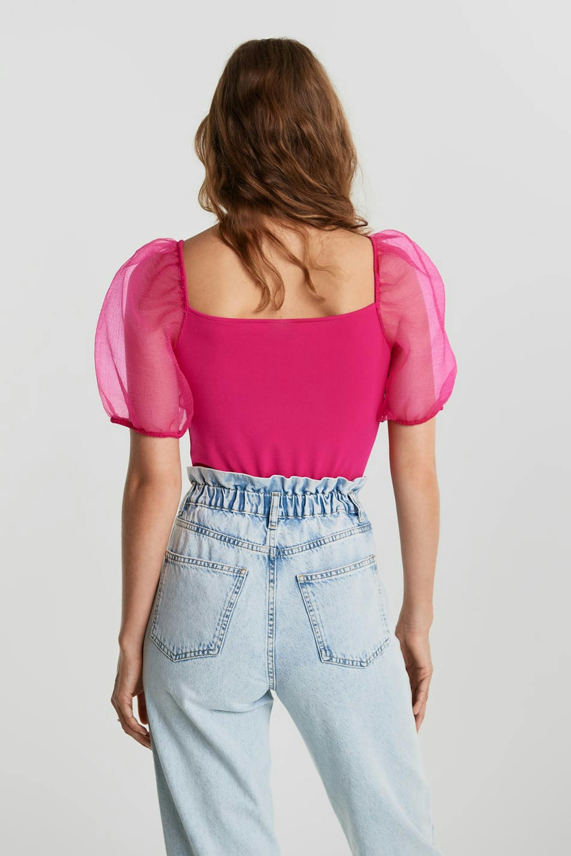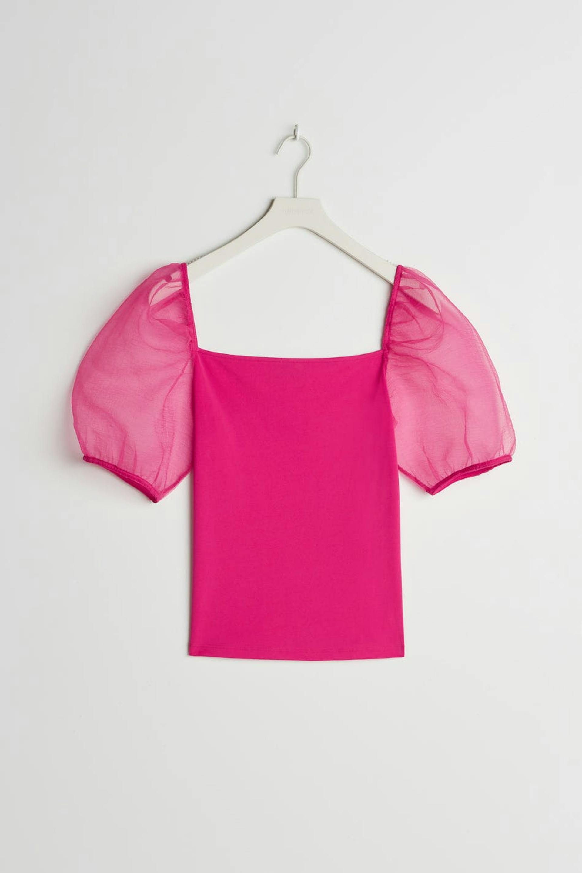 Top with a regular fit. The top is perfect for the party and pink and has short puff sleeves in organza. It is made of jersey.