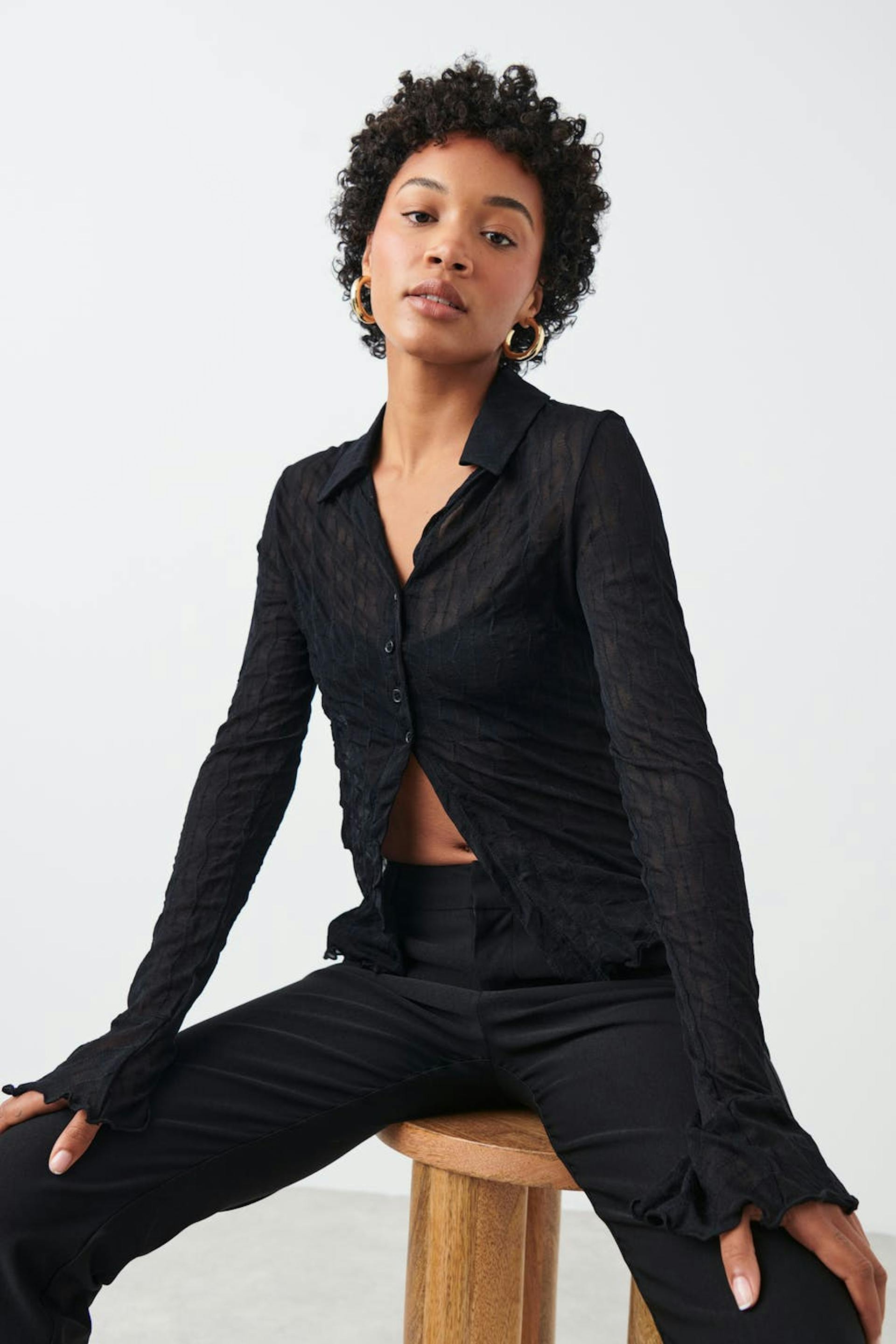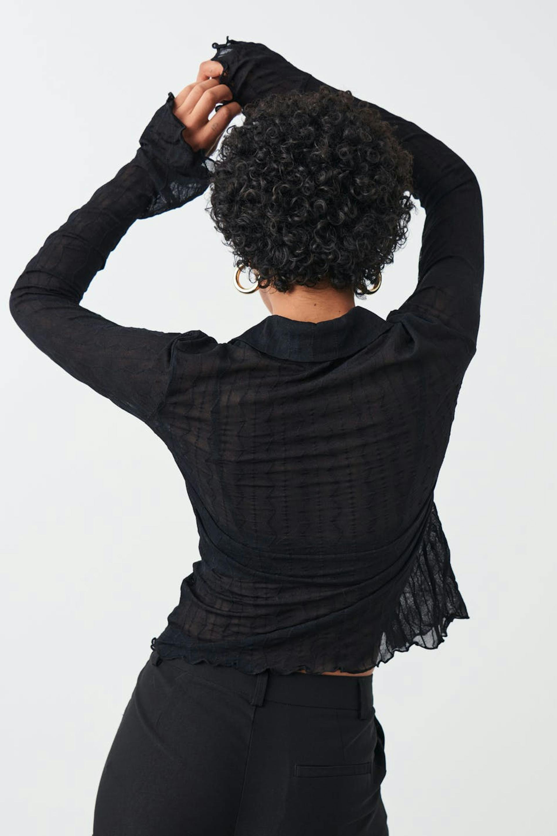 Long-sleeved mesh top with buttoning at the front. The top is black and has figure-hugging fit. It has collar and sheer quality with texture.