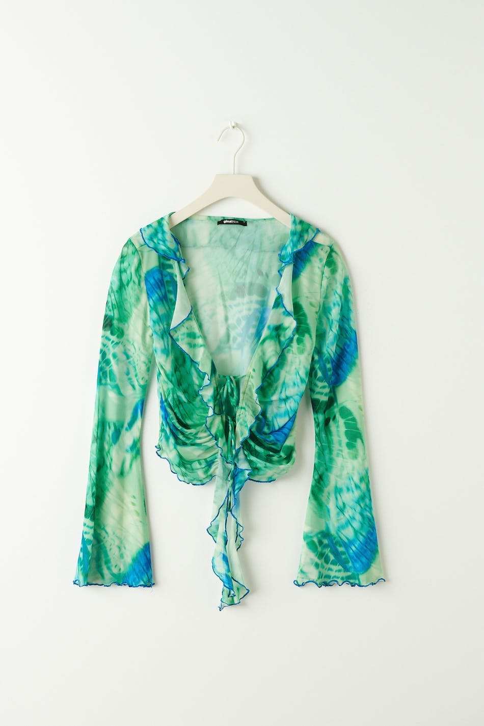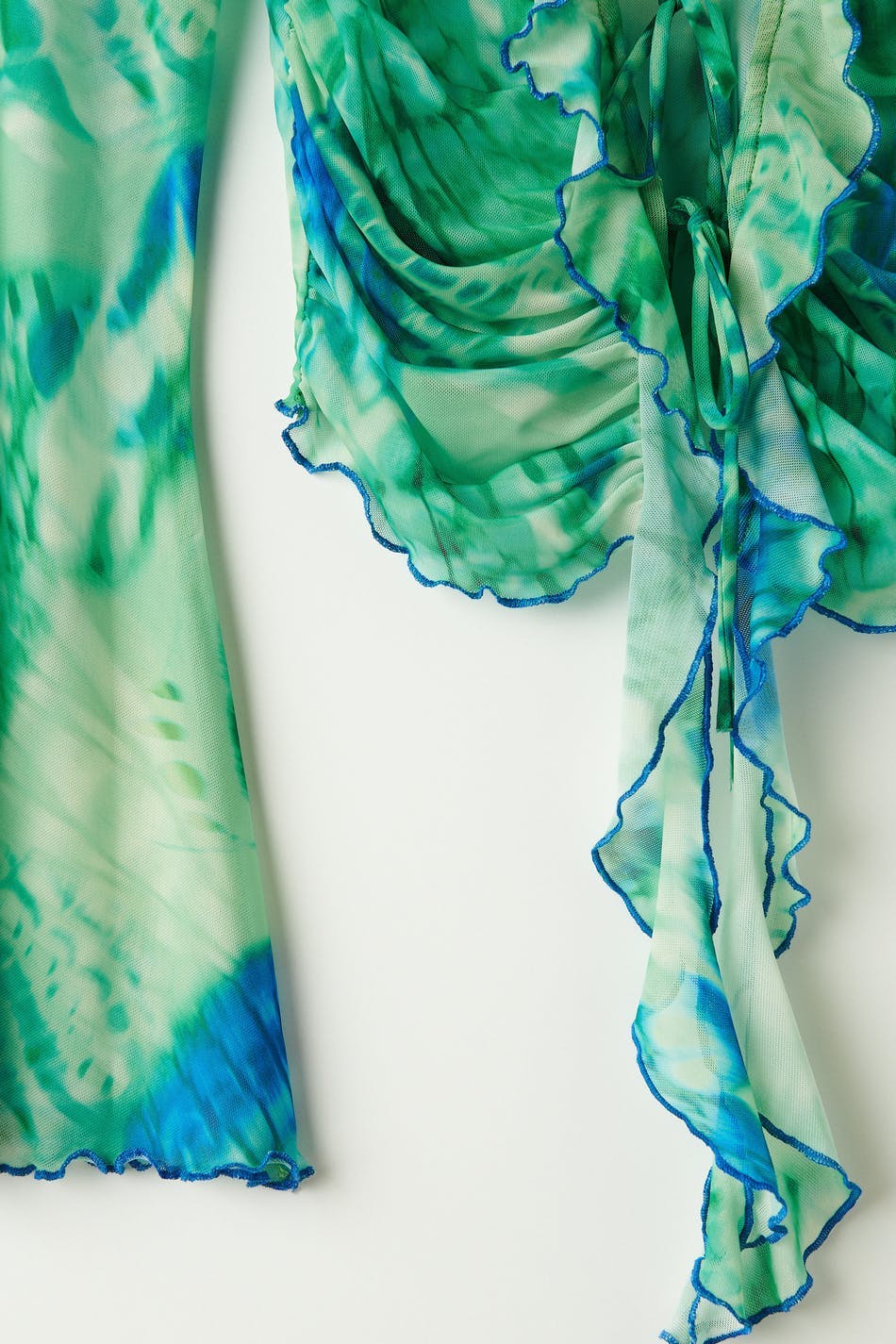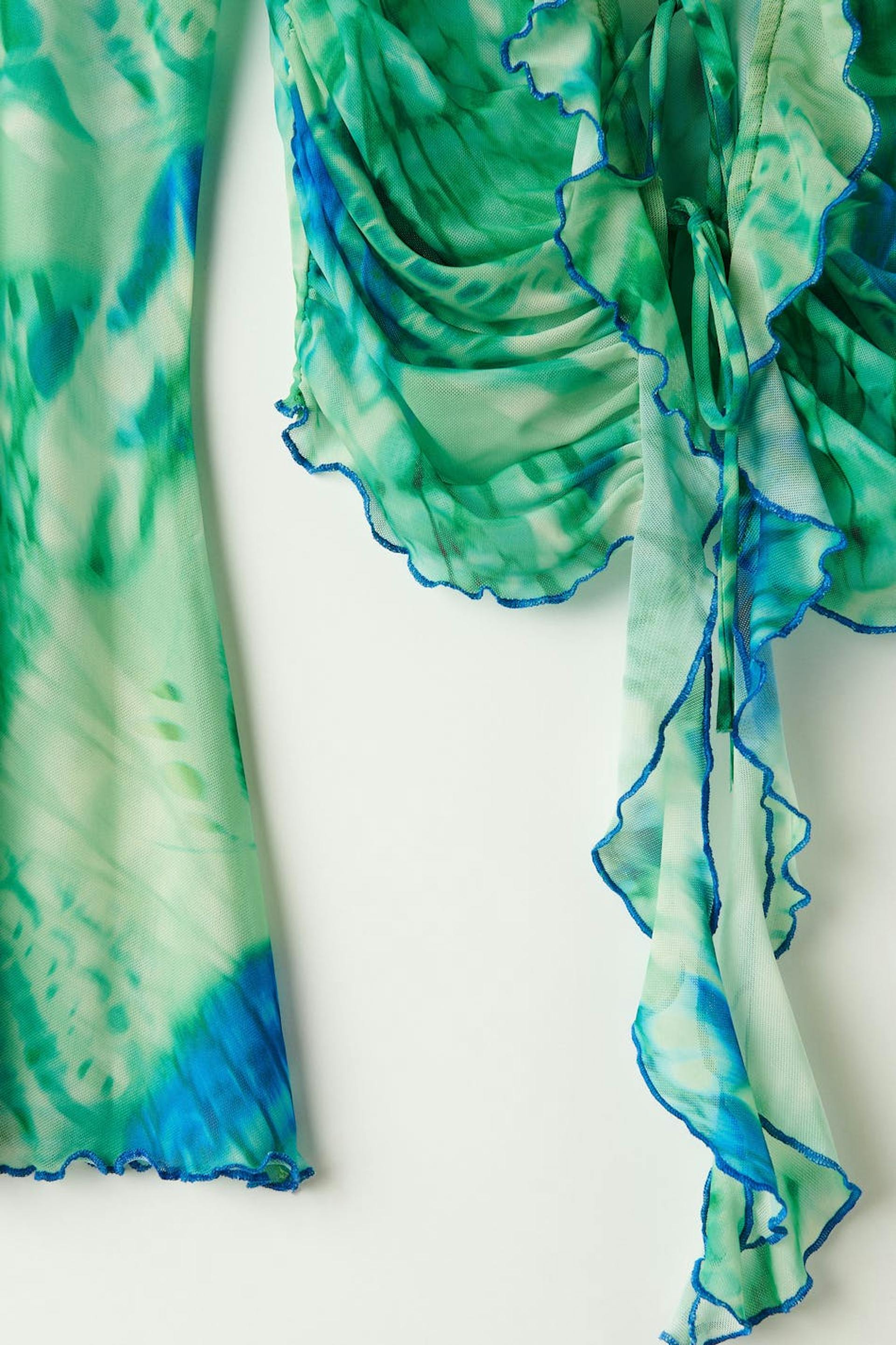 Long-sleeved mesh top with knot closure in front. The top is green and has fitted fit. It has v-neck cut with frill details, lantern sleeves, cropped length and curled hemline.