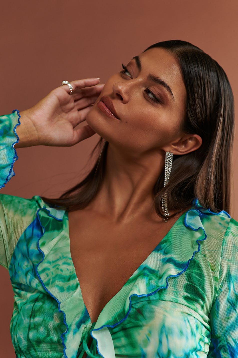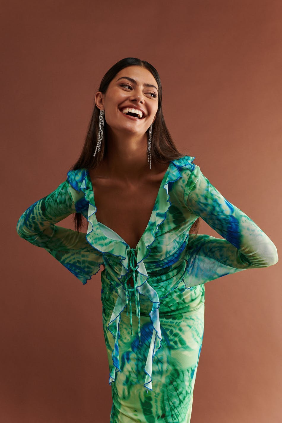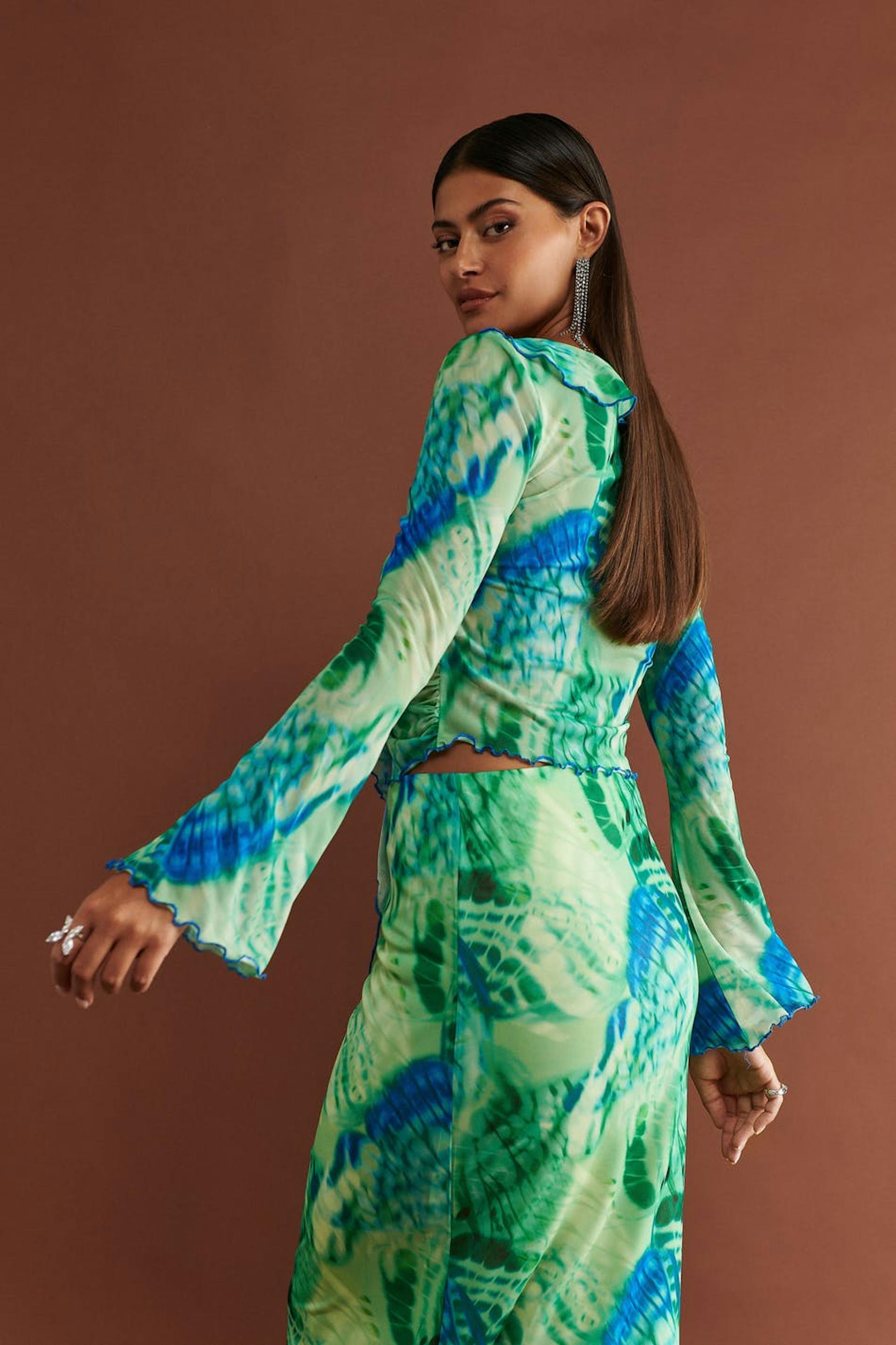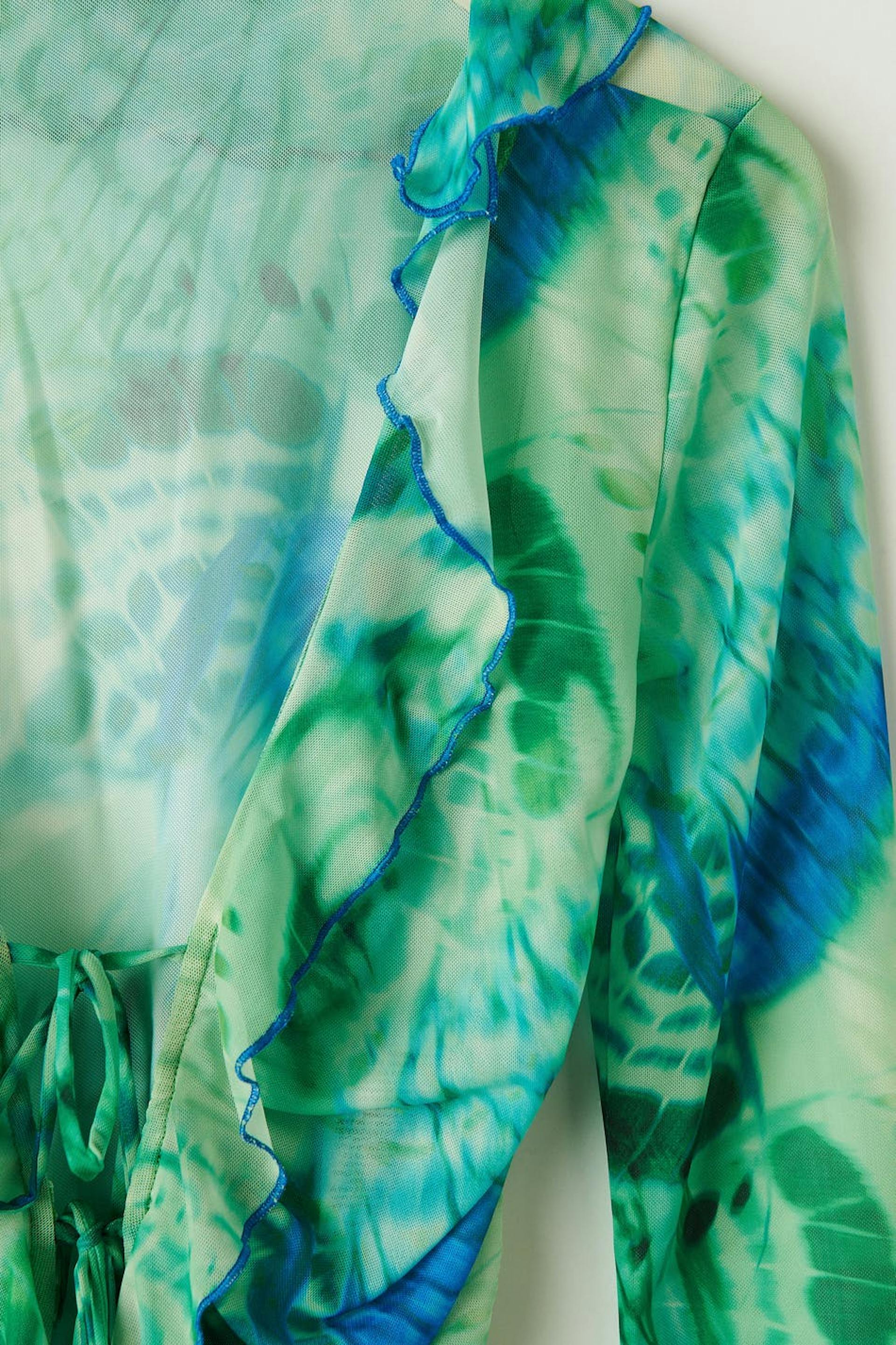 Long-sleeved mesh top with knot closure in front. The top is green and has fitted fit. It has v-neck cut with frill details, lantern sleeves, cropped length and curled hemline.
