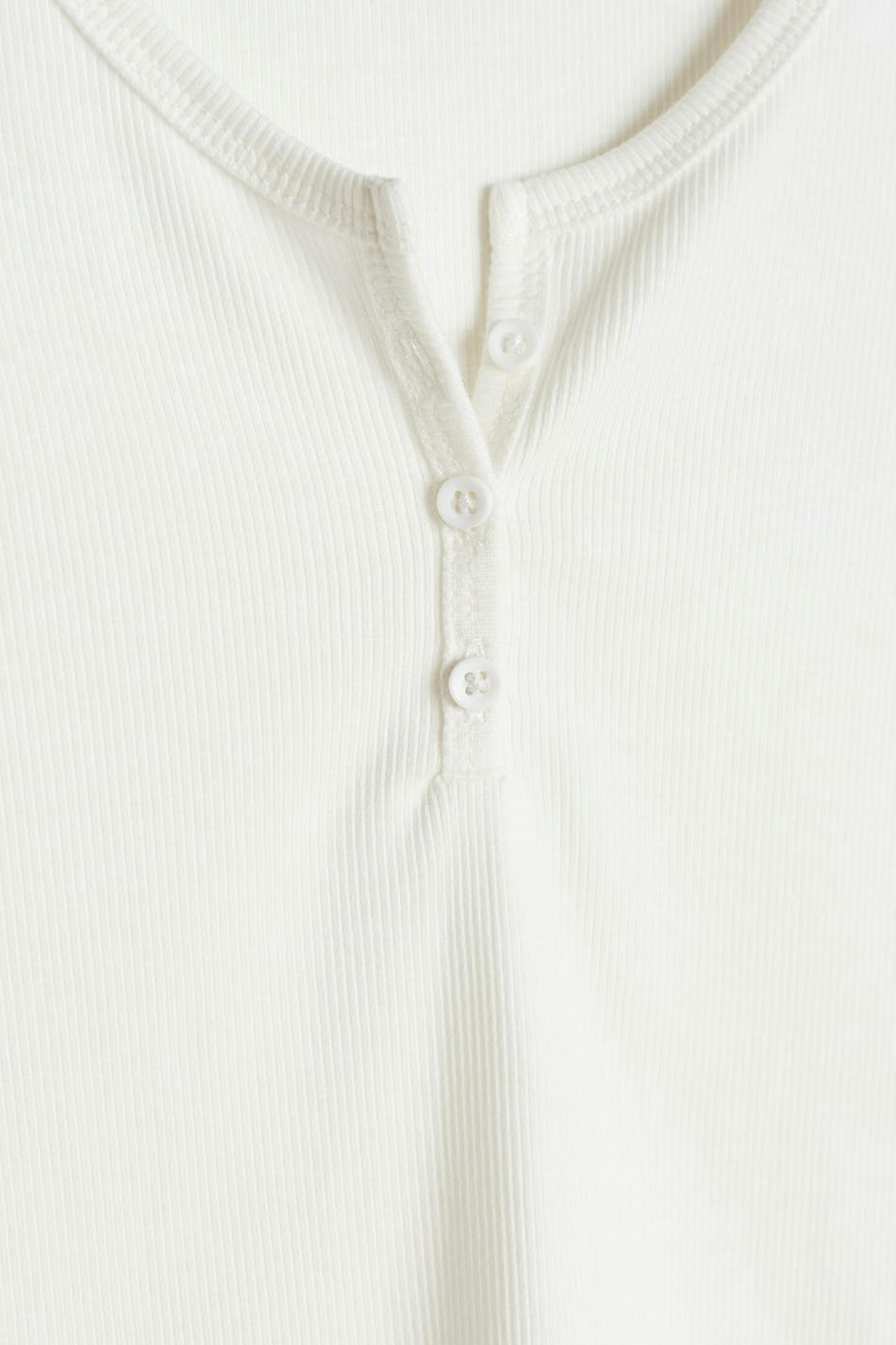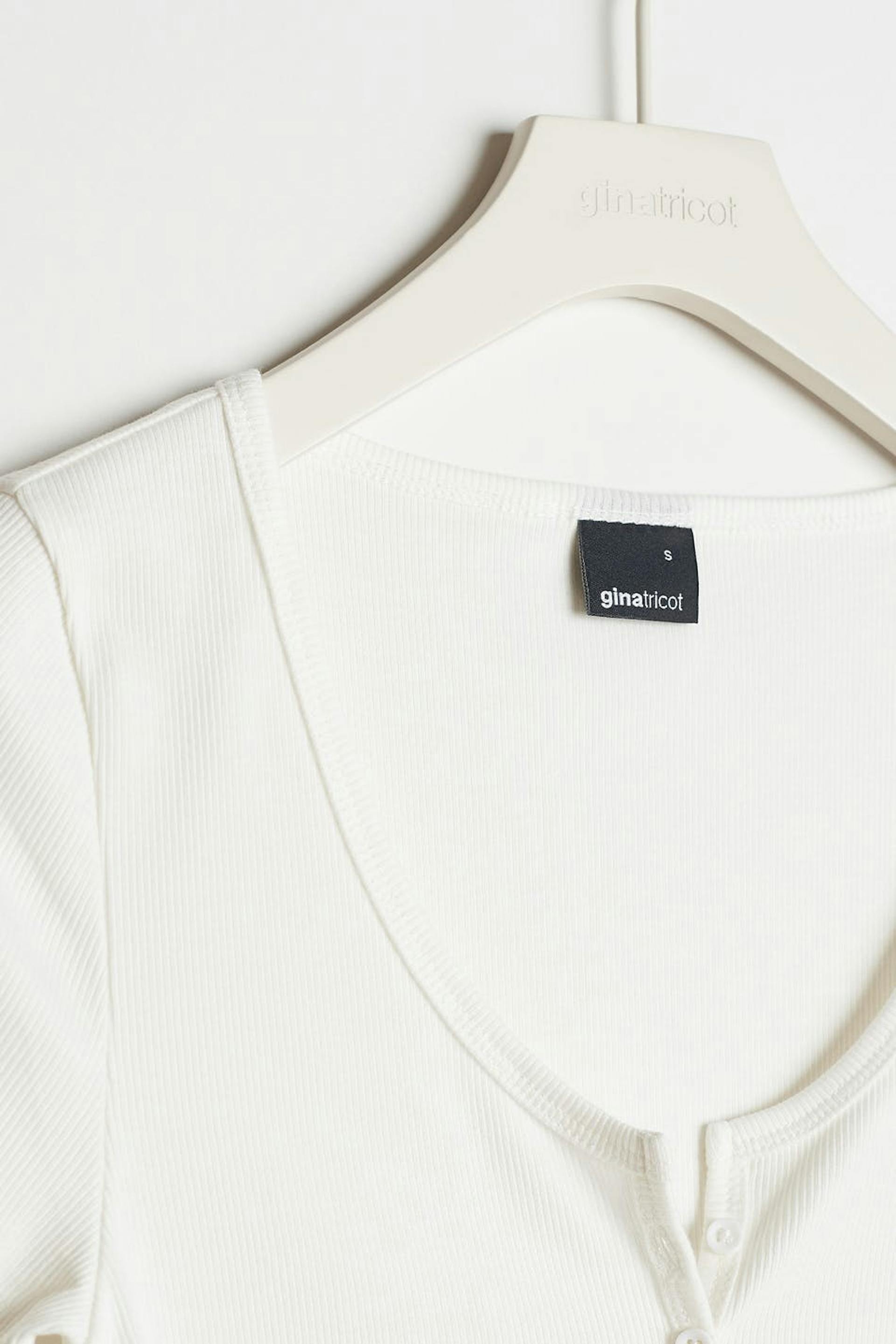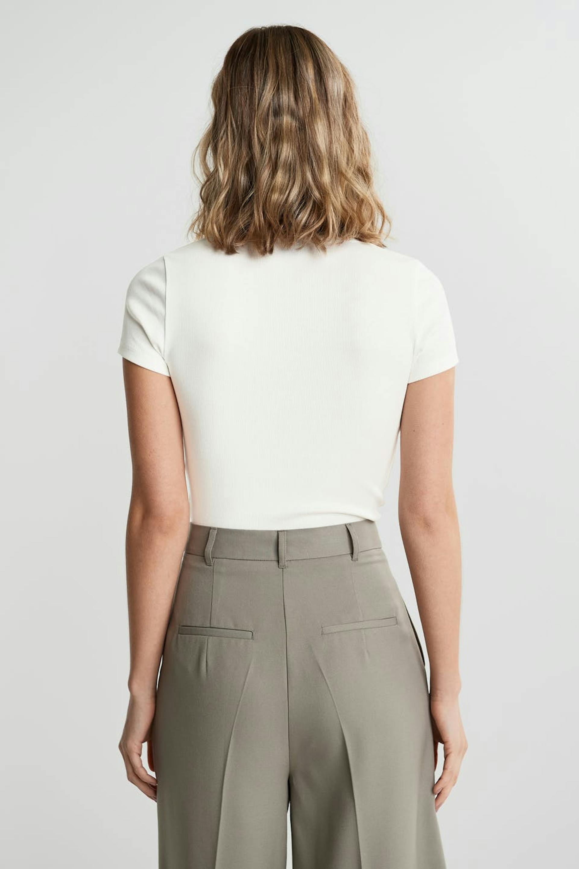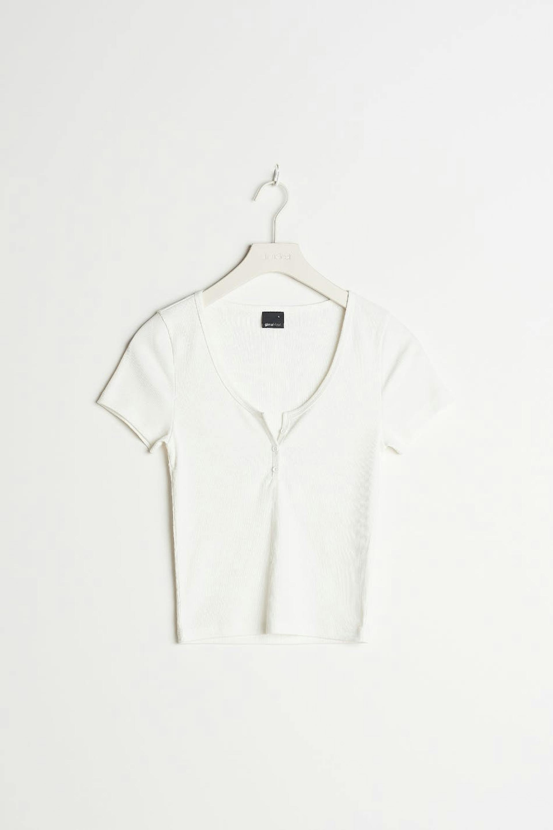 Short top with a fitted fit. The top is white, short-sleeved and ribbed. It has a crew neckline with buttons.