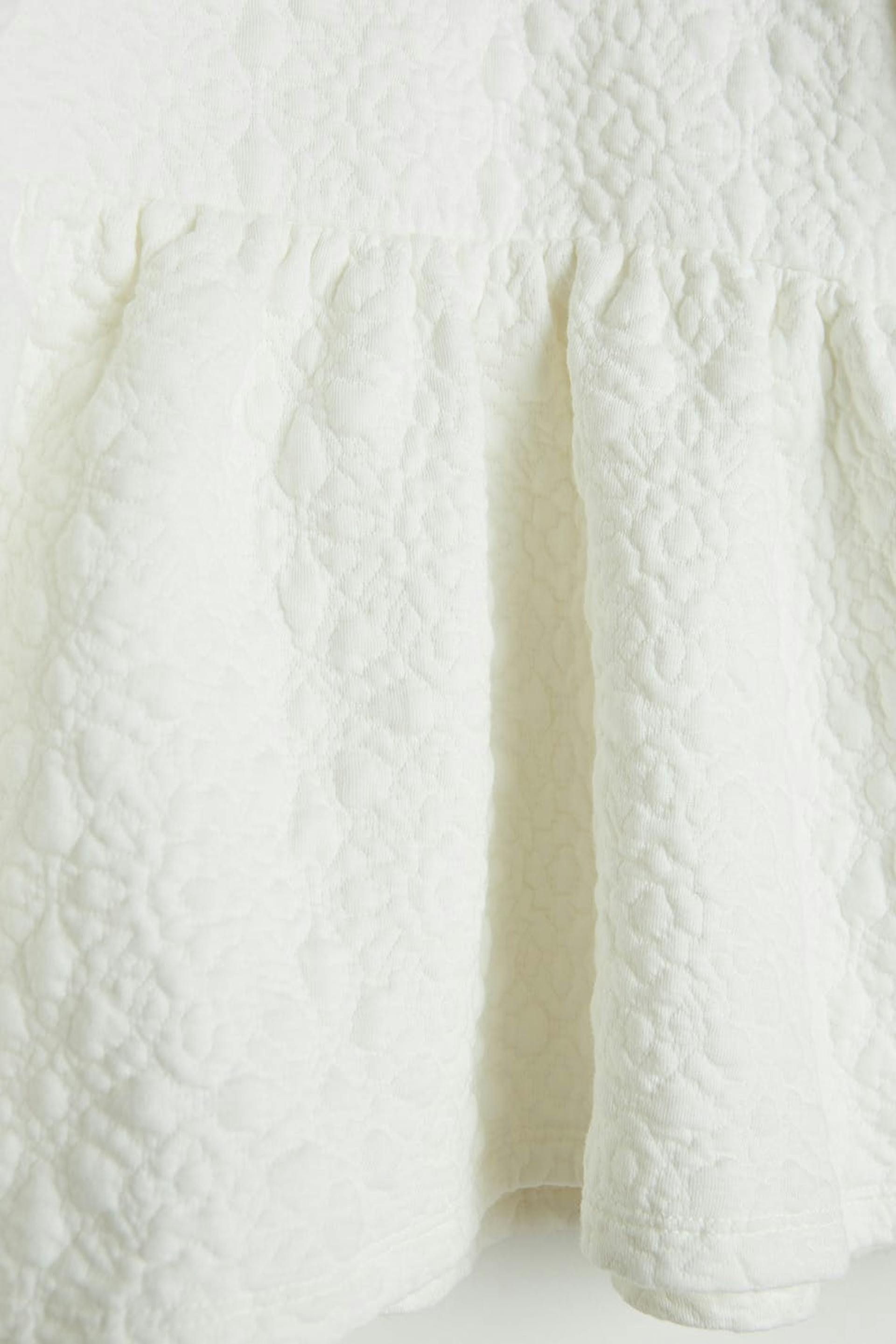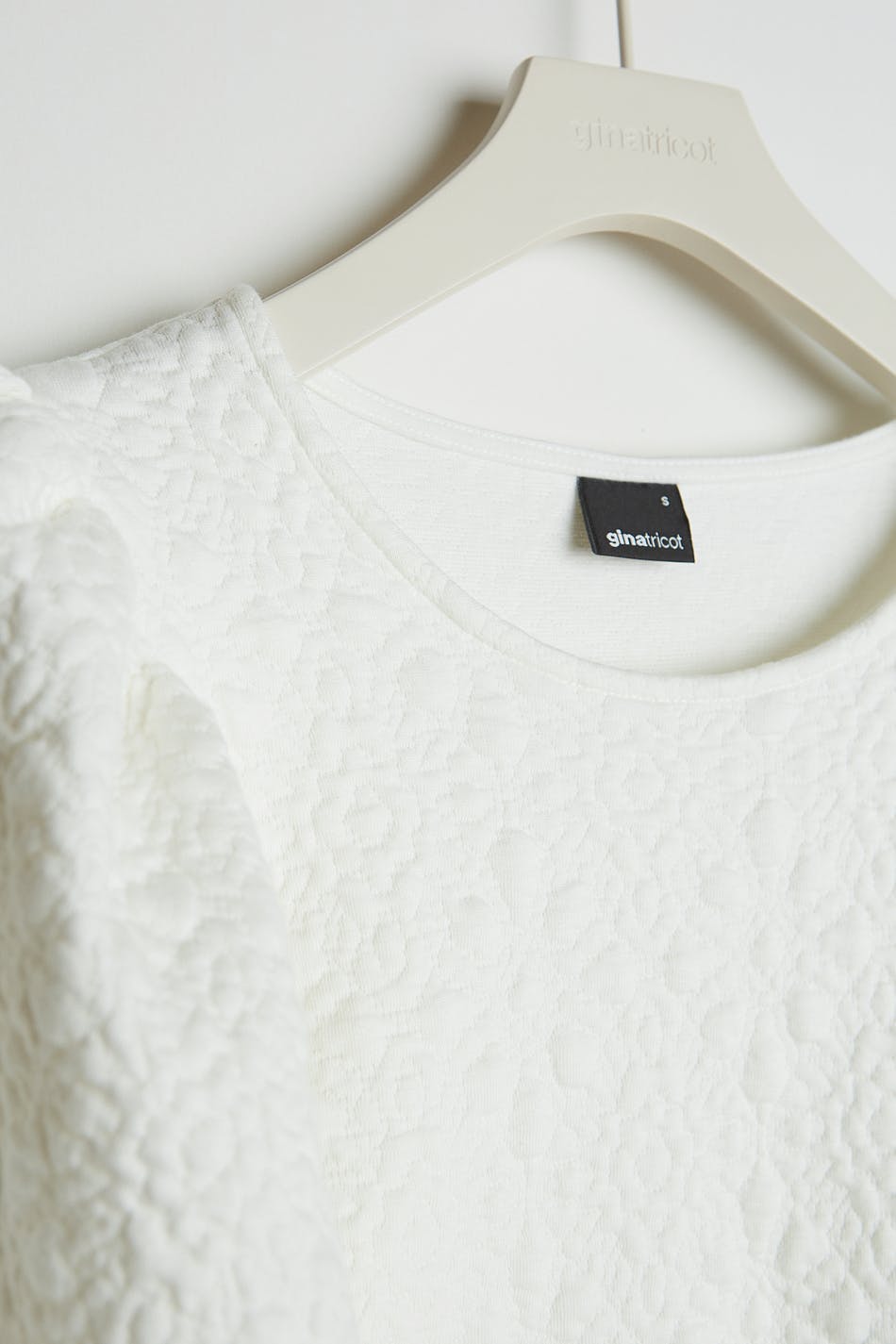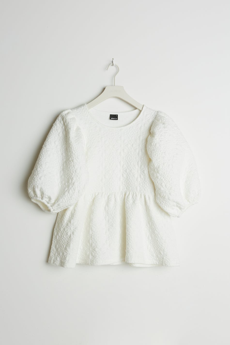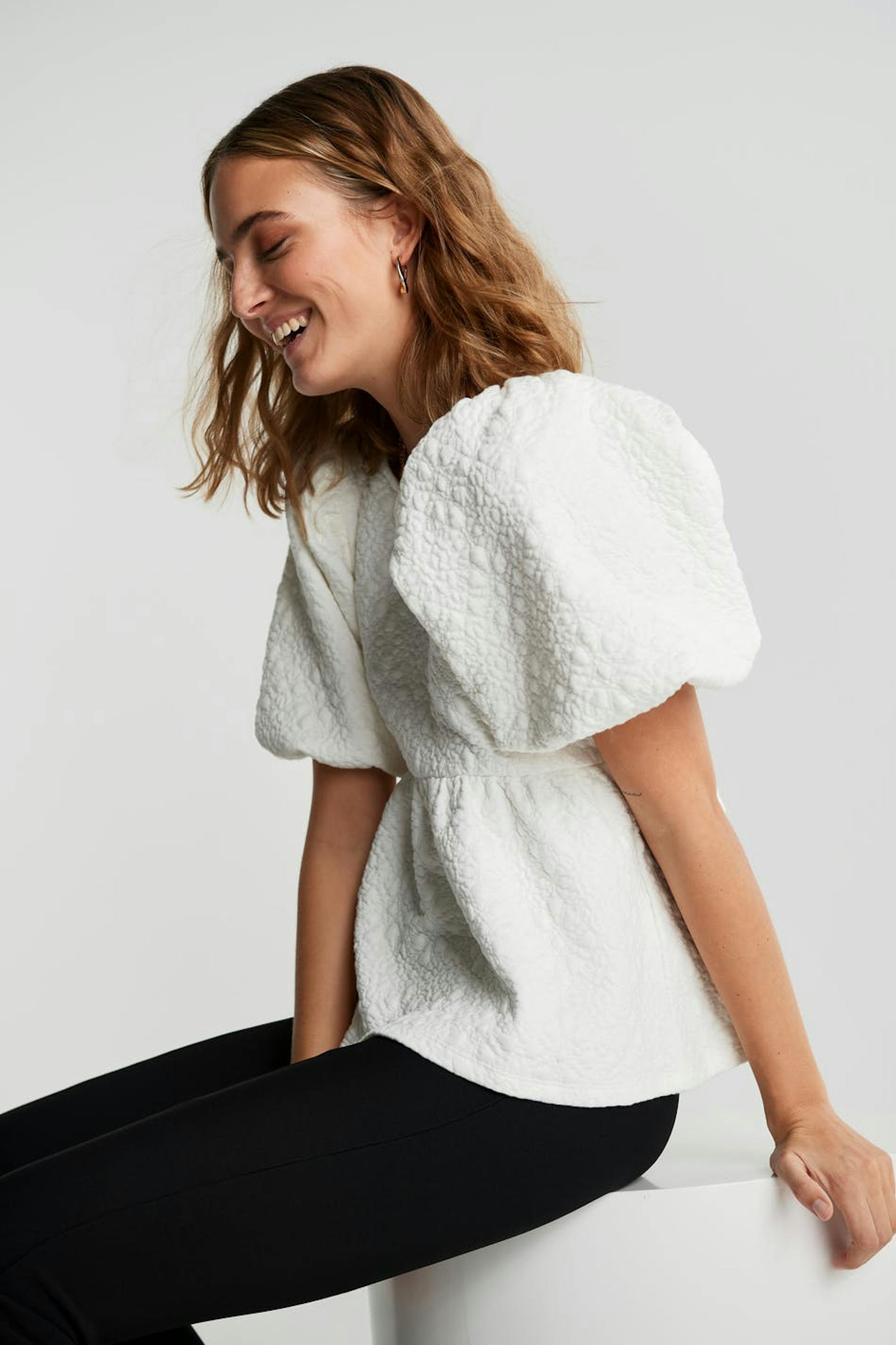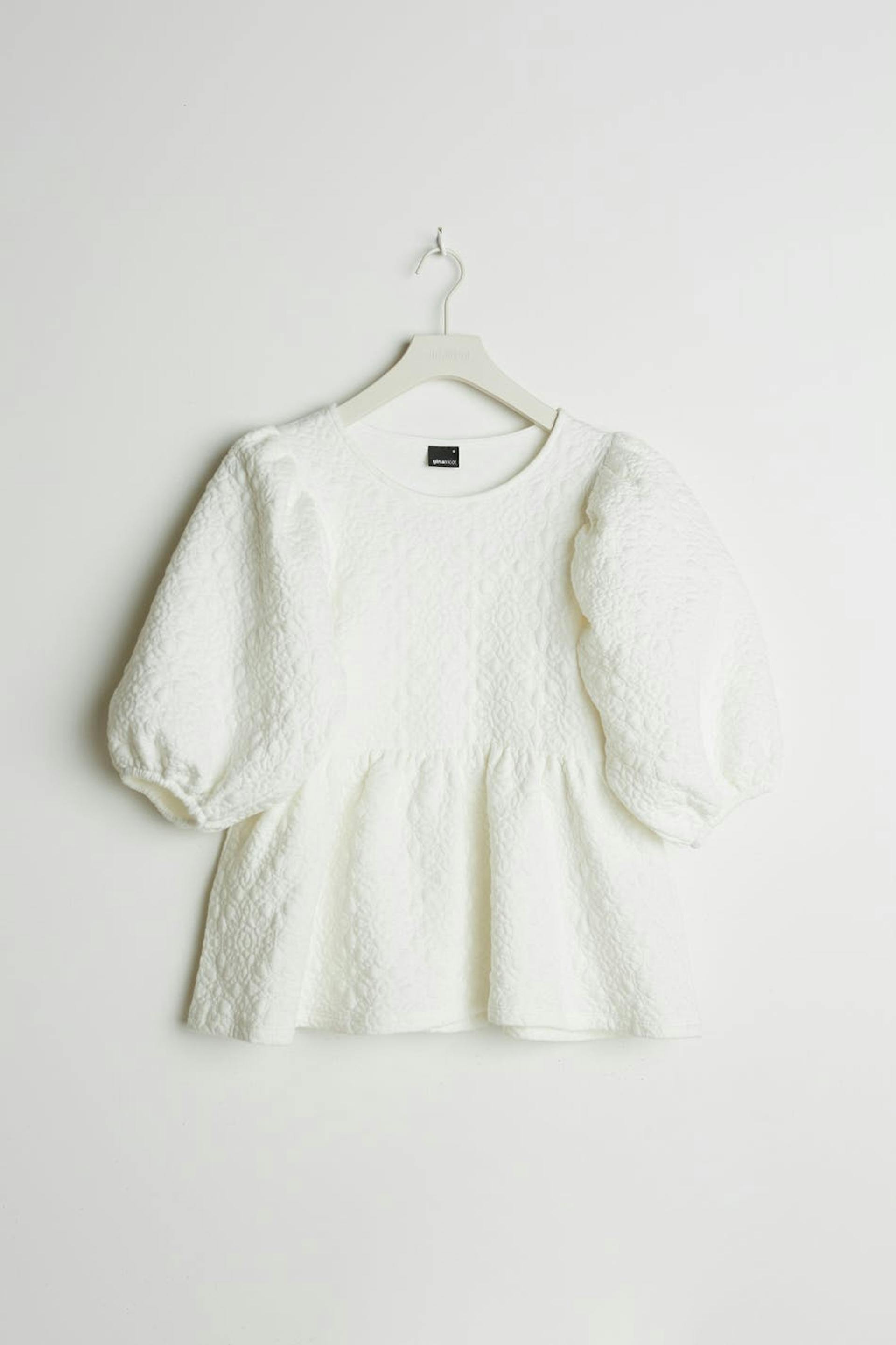 Top with short puff sleeves. The top is white and has a seam at the waist with a peplum design.