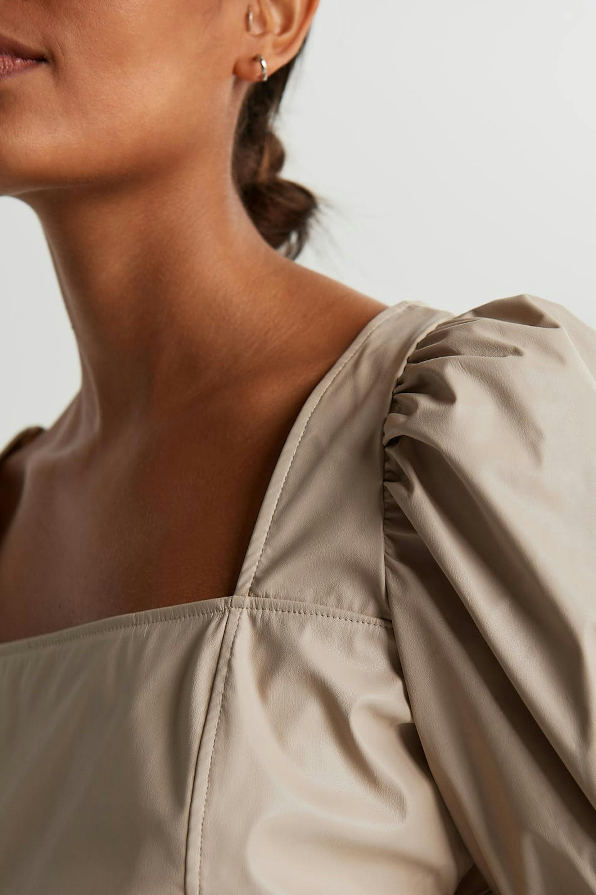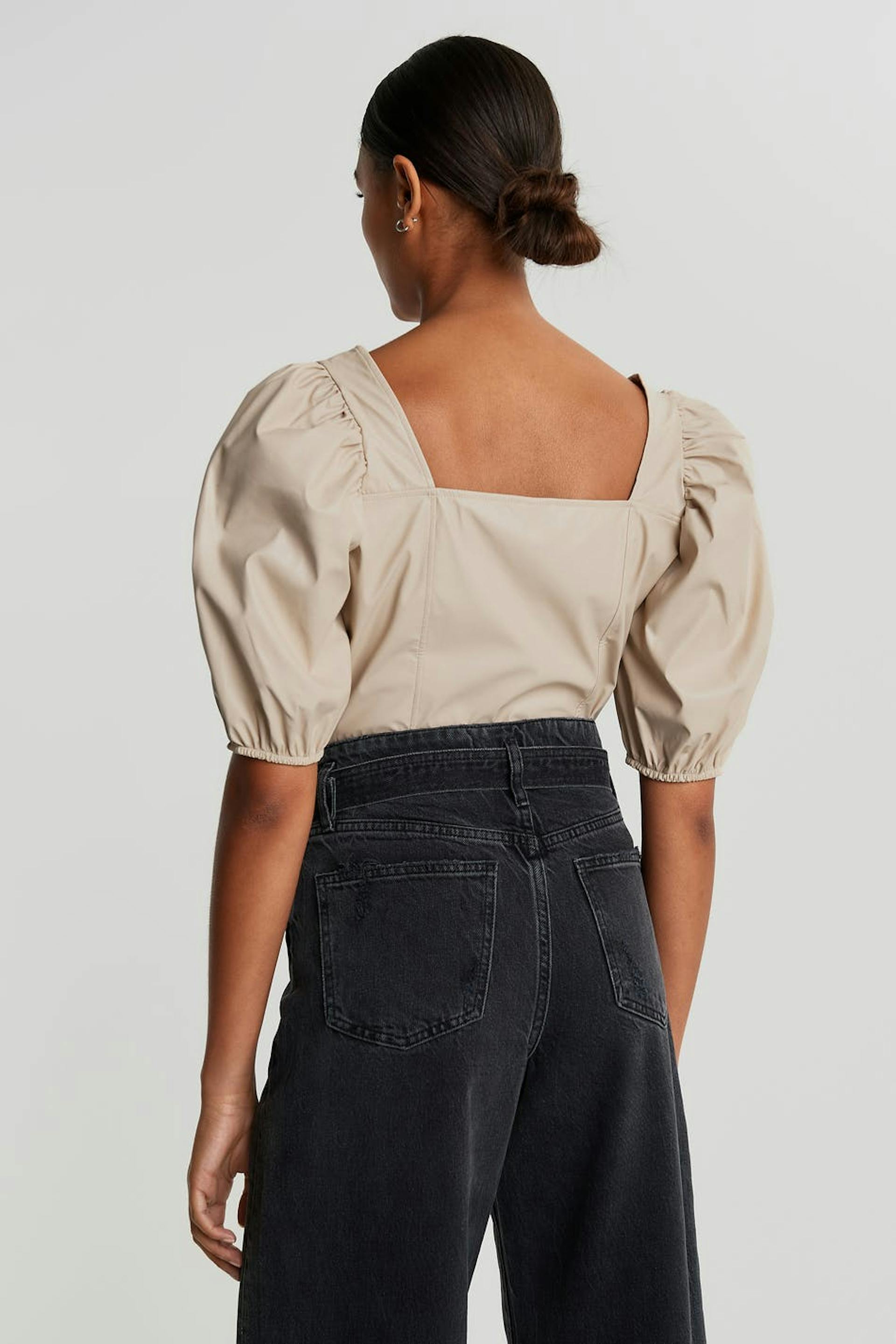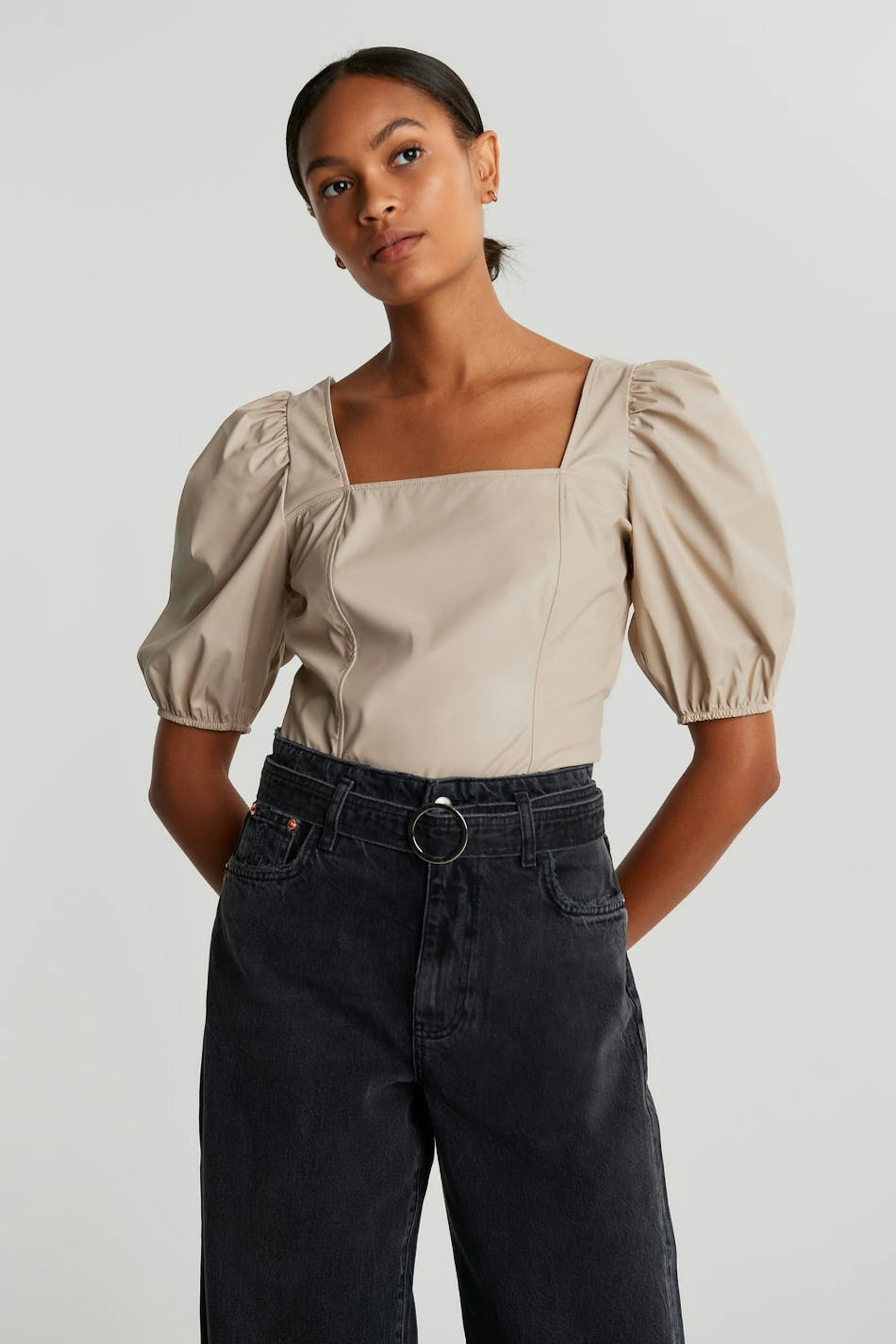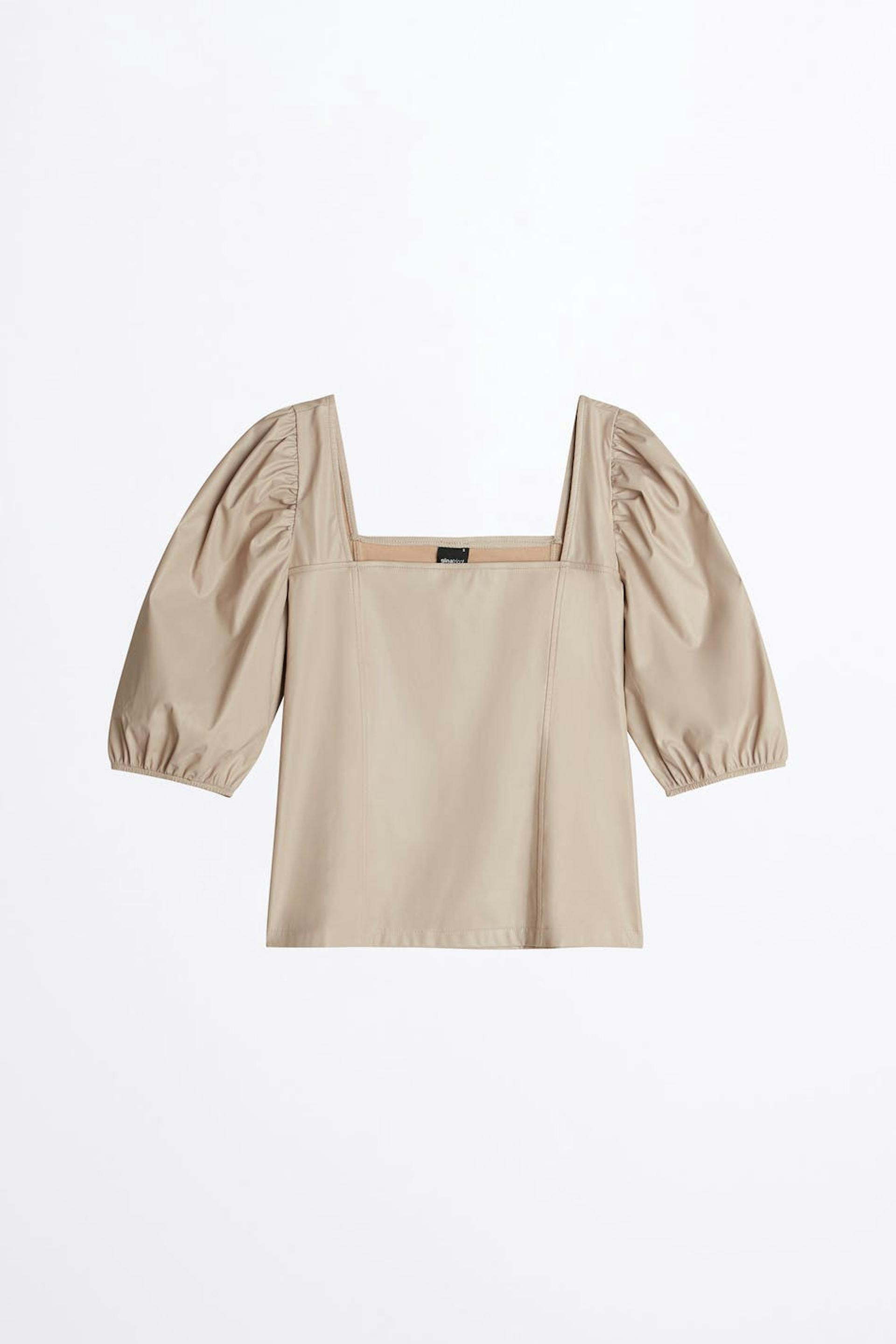 Top with short puff sleeves. The top is beige and has a square neckline. It is made of PU.