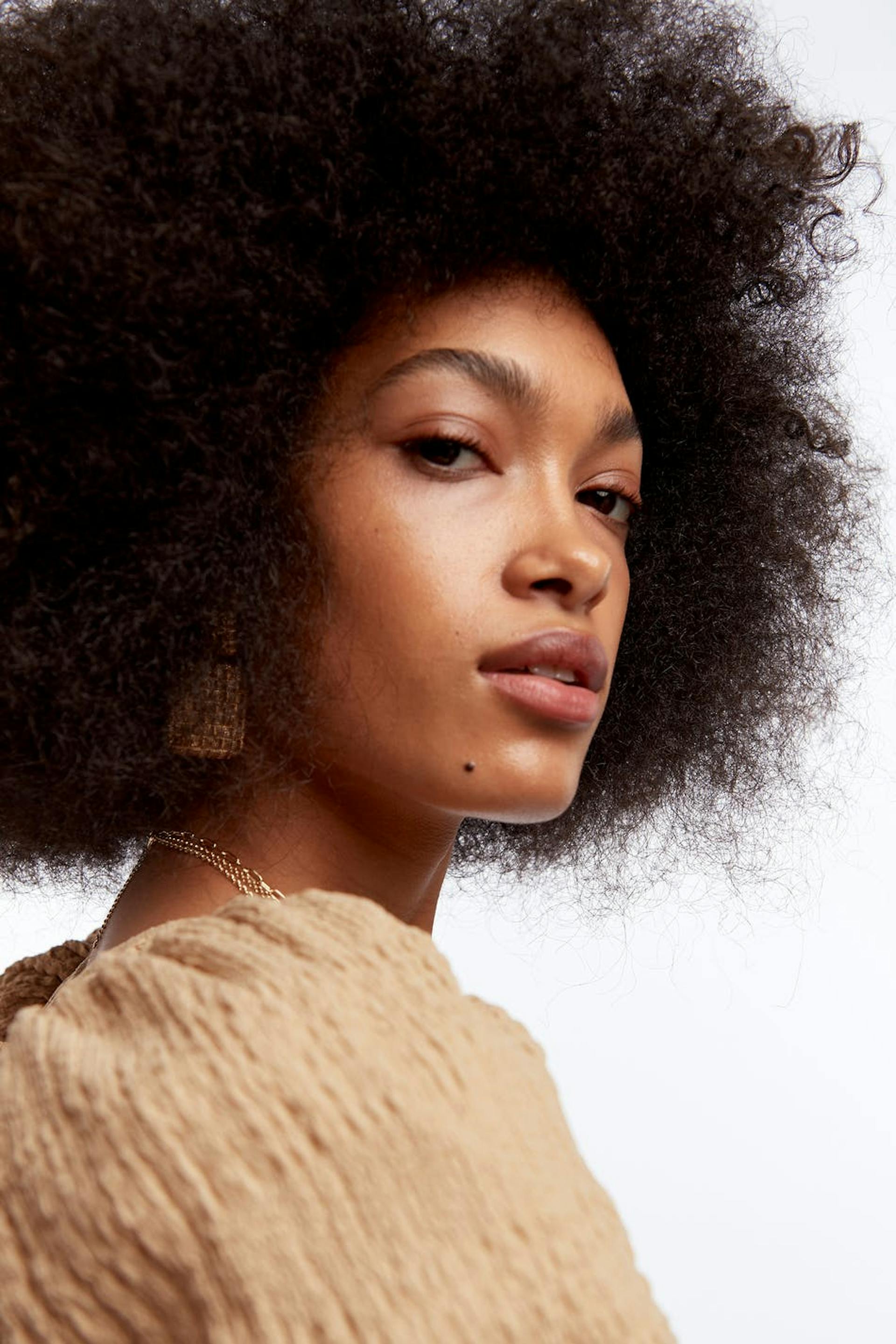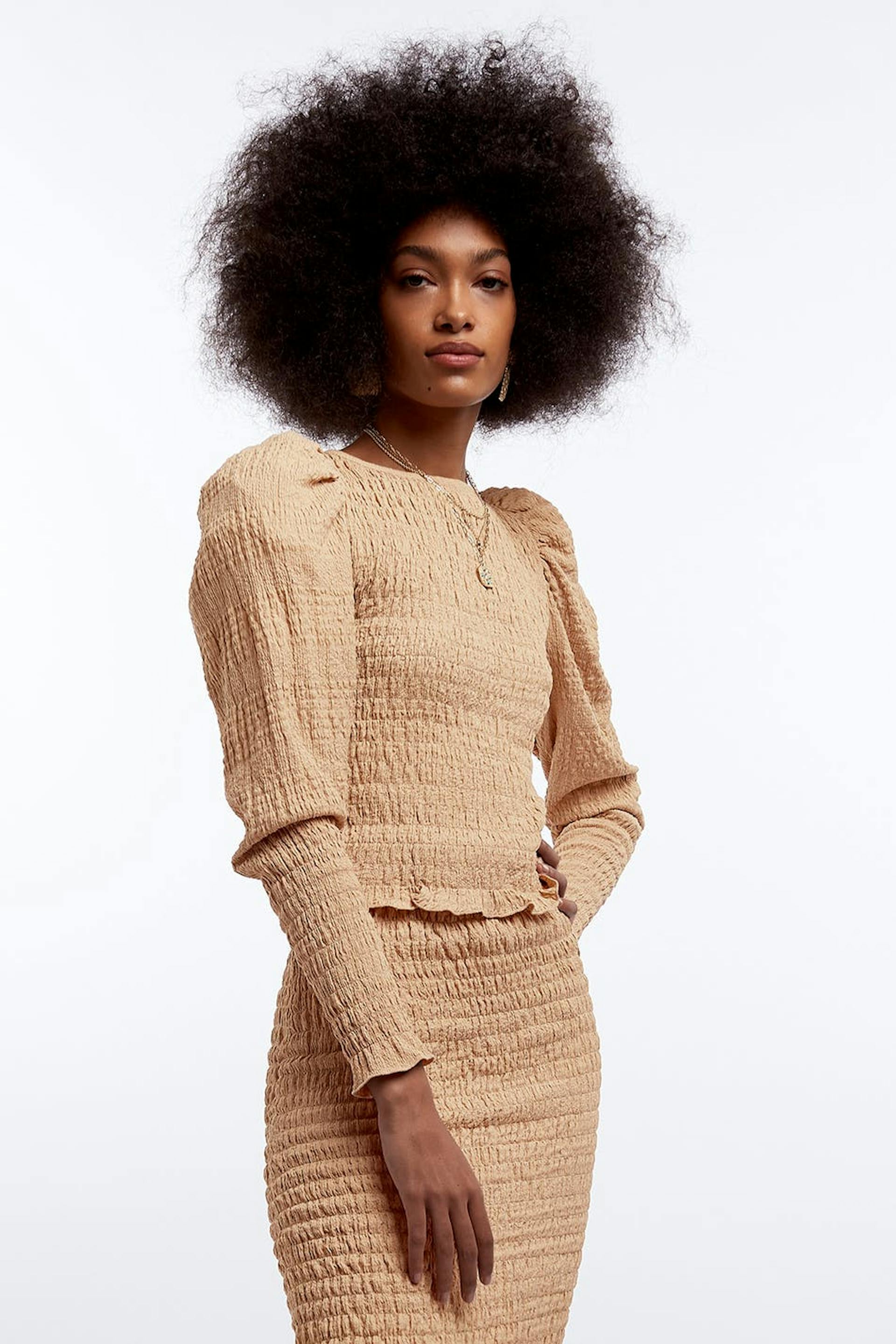Smocked top with a regular fit. The top is beige and has puff sleeves.