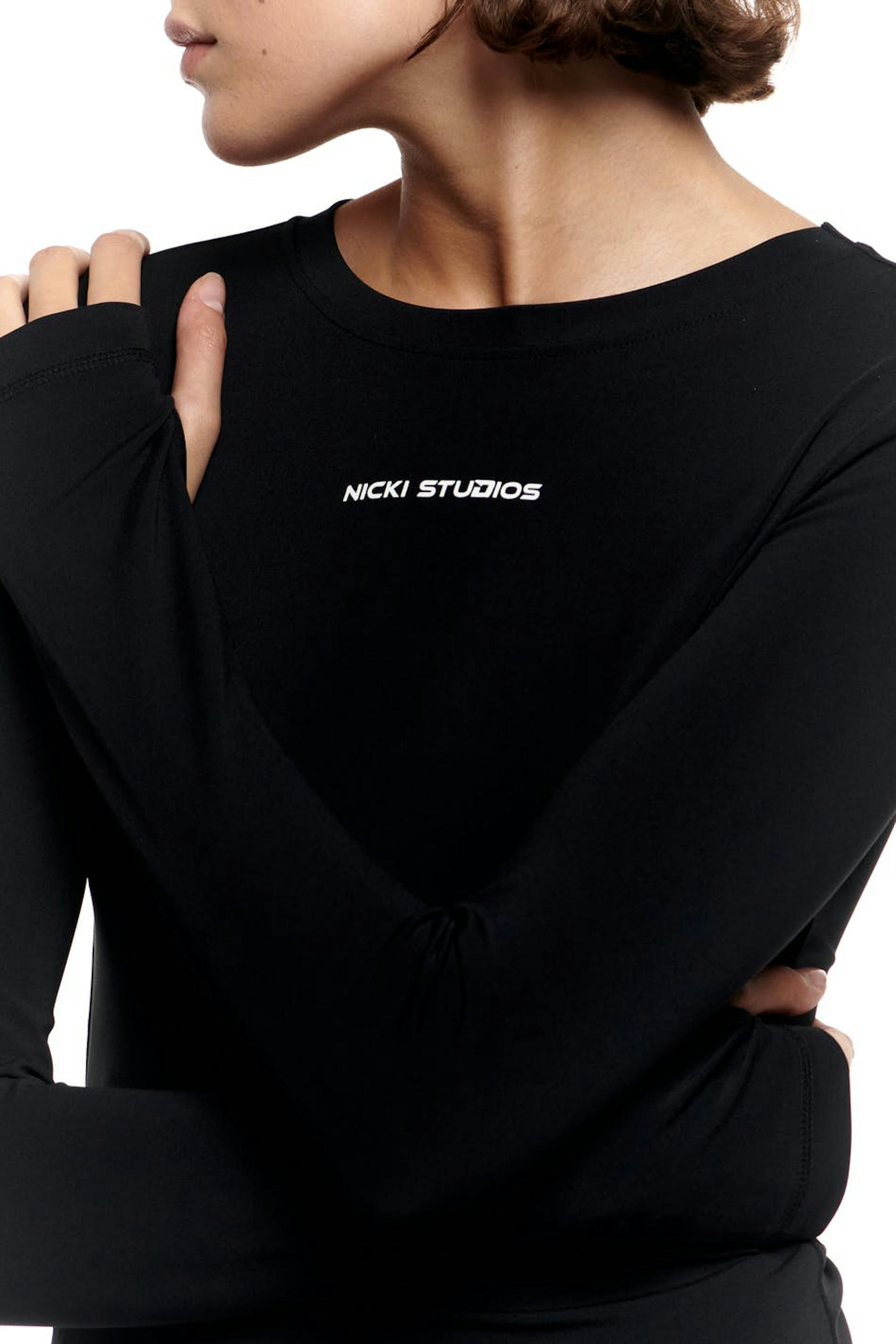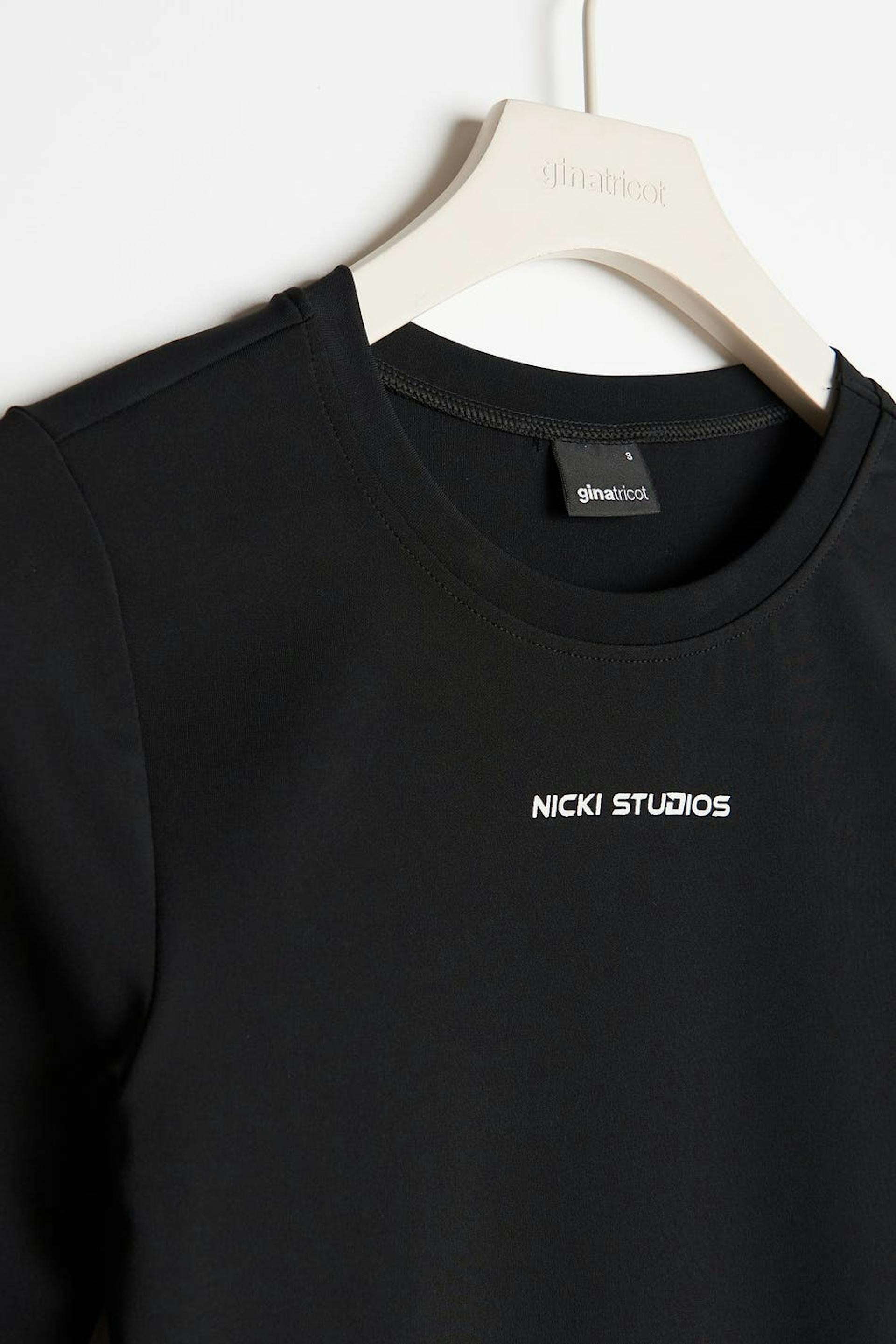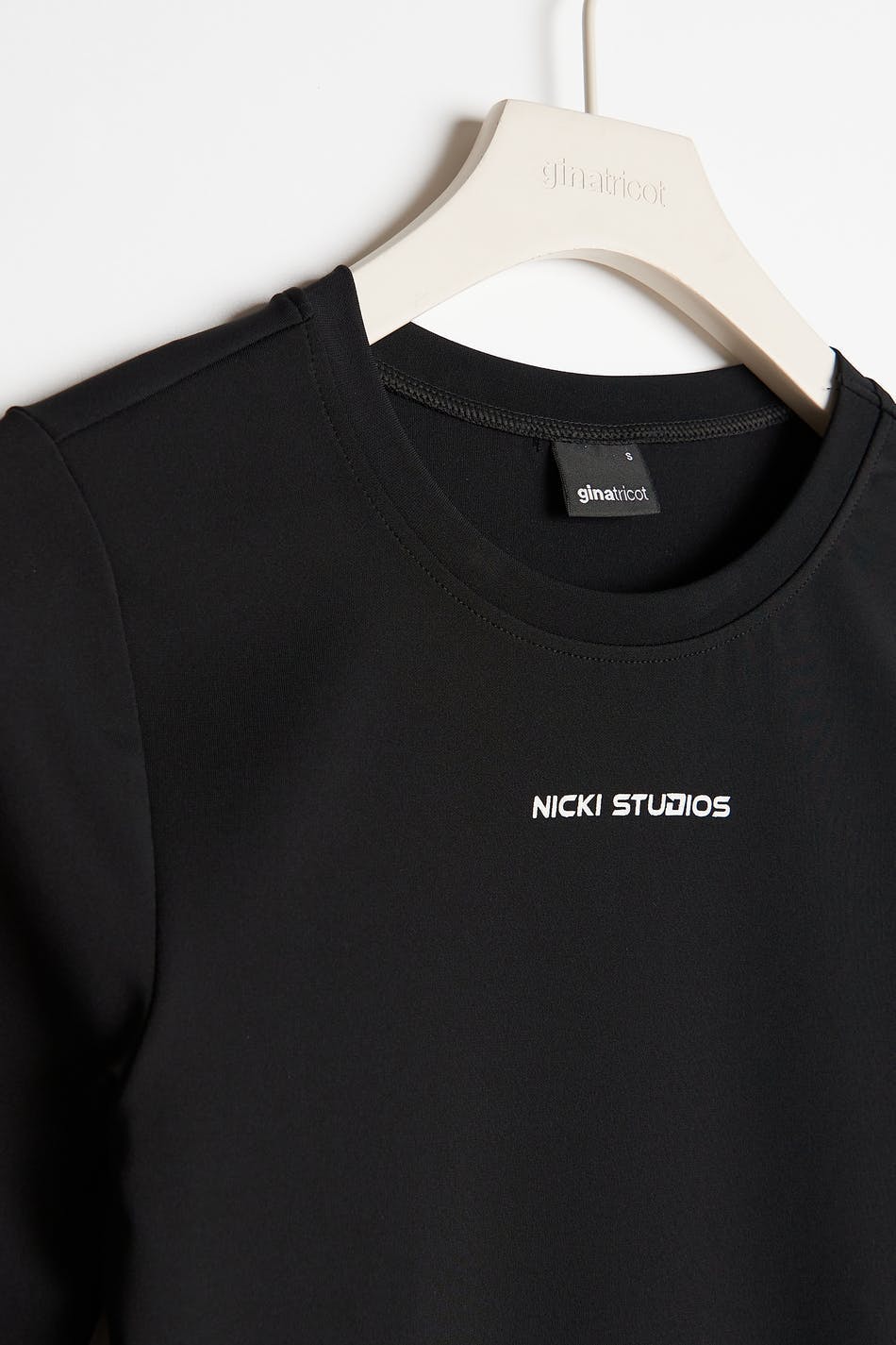 Nicki Studios X Gina Tricot. Long-sleeved workout top with fitted fit. The top is black and has a comfortable, elastic quality in jersey. It has a rounded neckline, a logo print at the front and thumbholes on the sleeve ends.