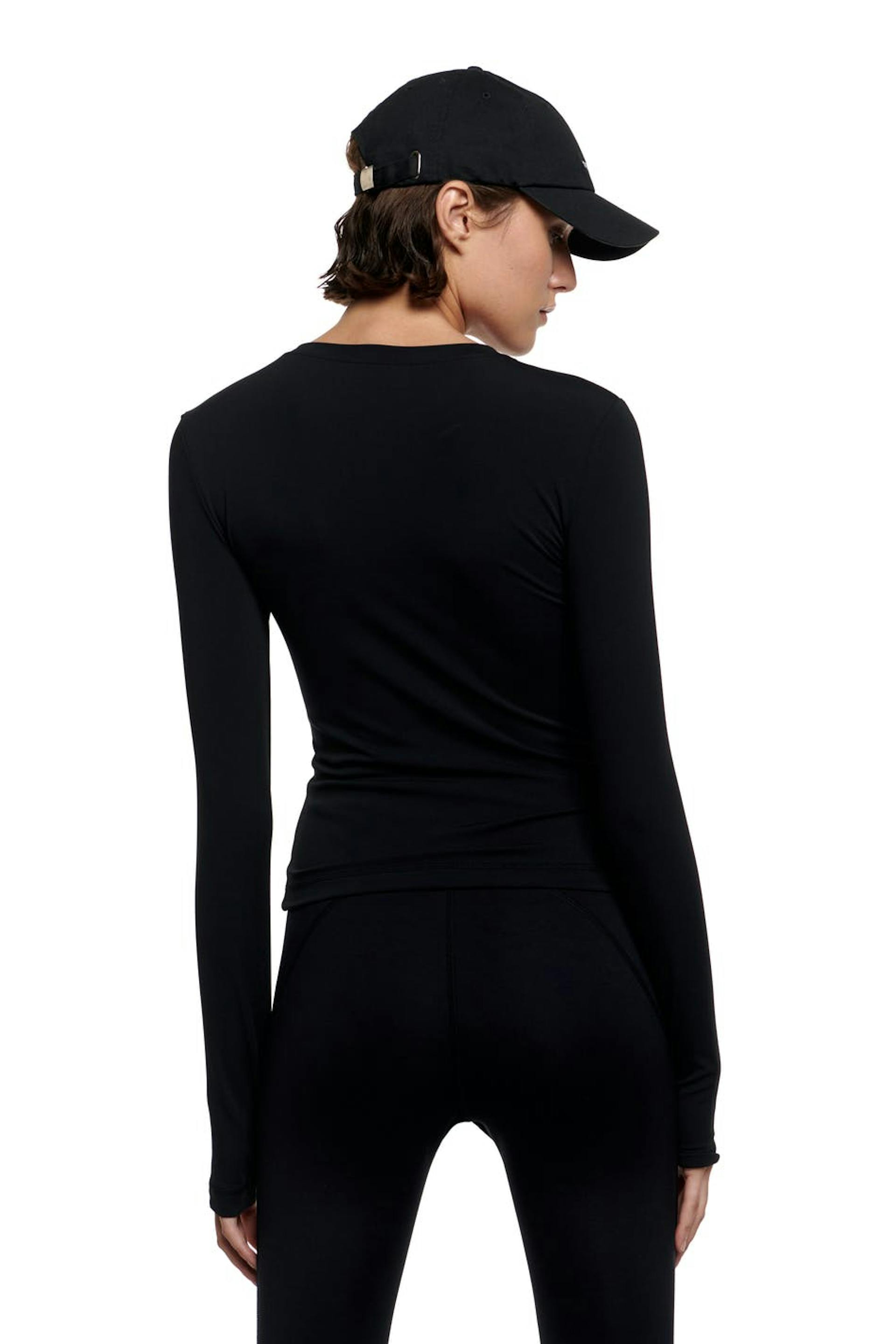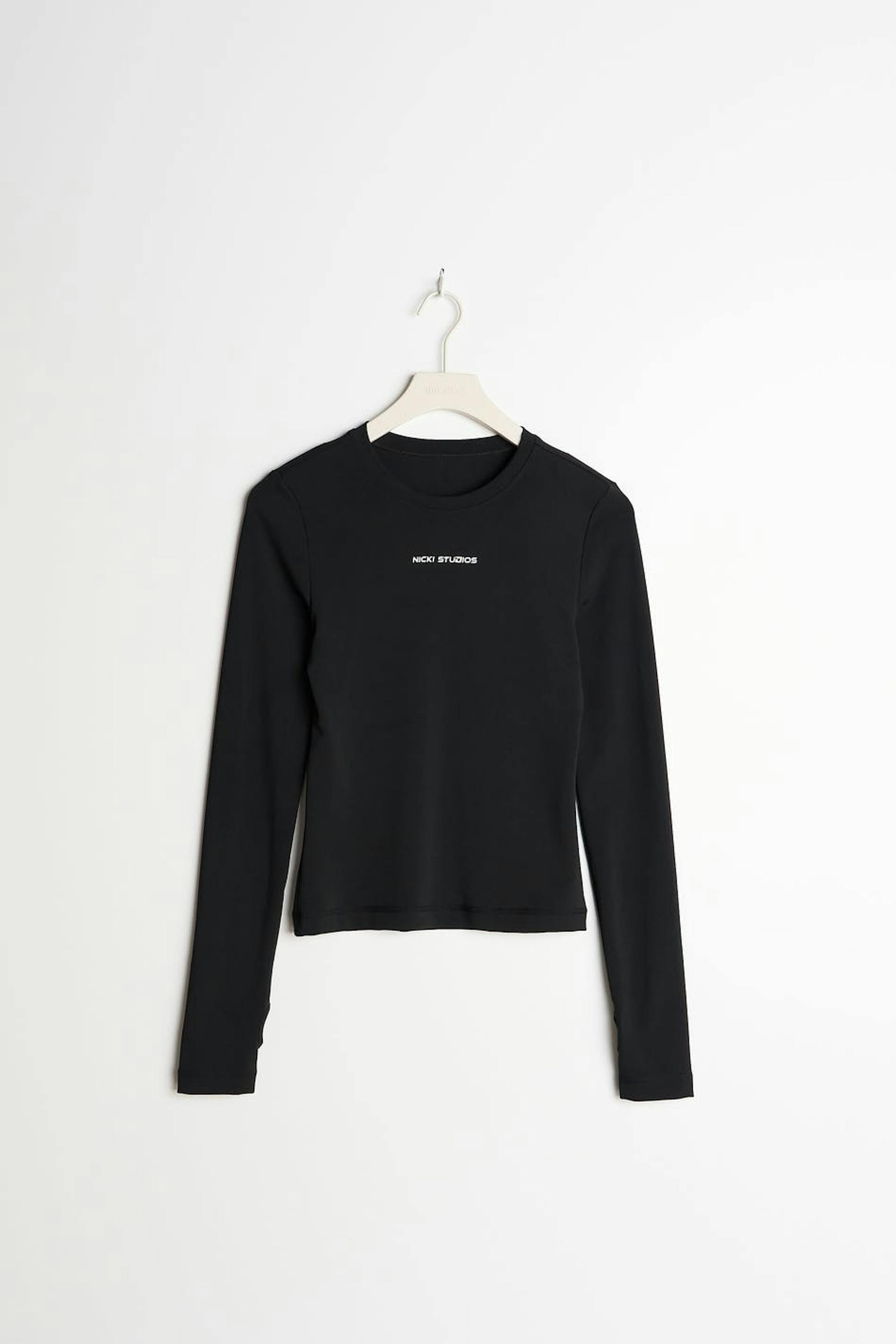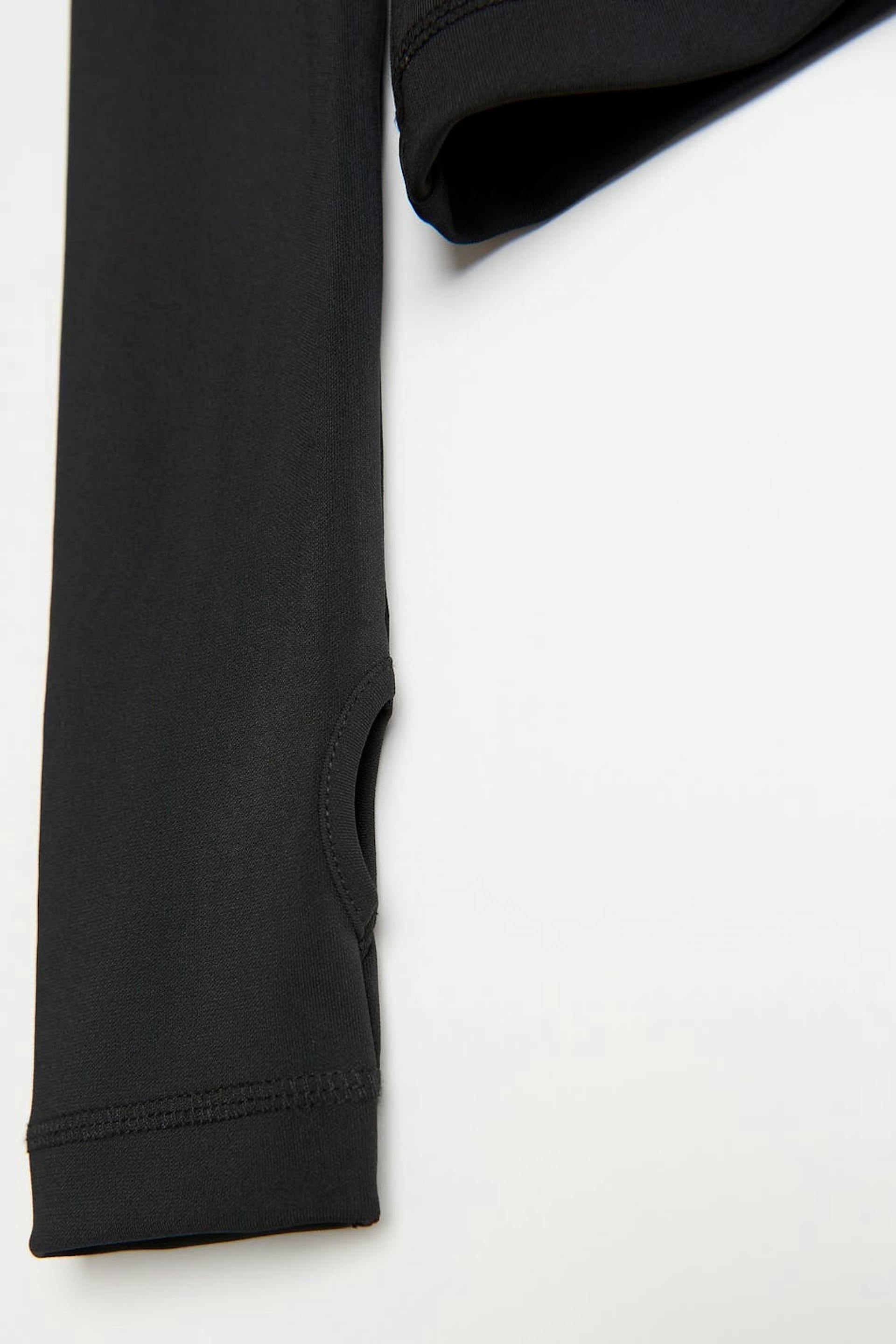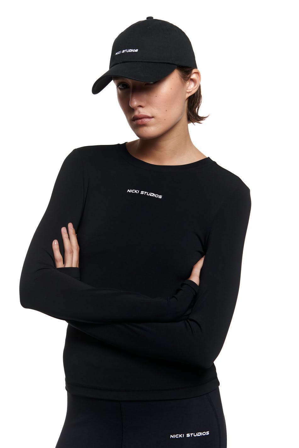 Nicki Studios X Gina Tricot. Long-sleeved workout top with fitted fit. The top is black and has a comfortable, elastic quality in jersey. It has a rounded neckline, a logo print at the front and thumbholes on the sleeve ends.