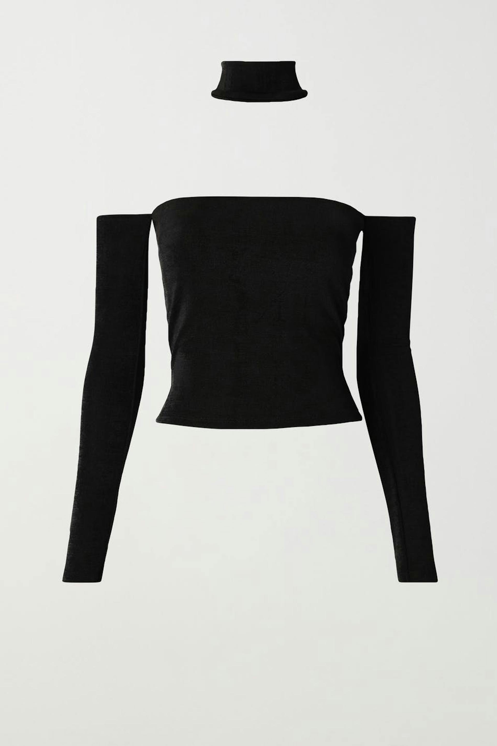 Long-sleeved off shoulder top with choker. The top is black and has fitted fit.