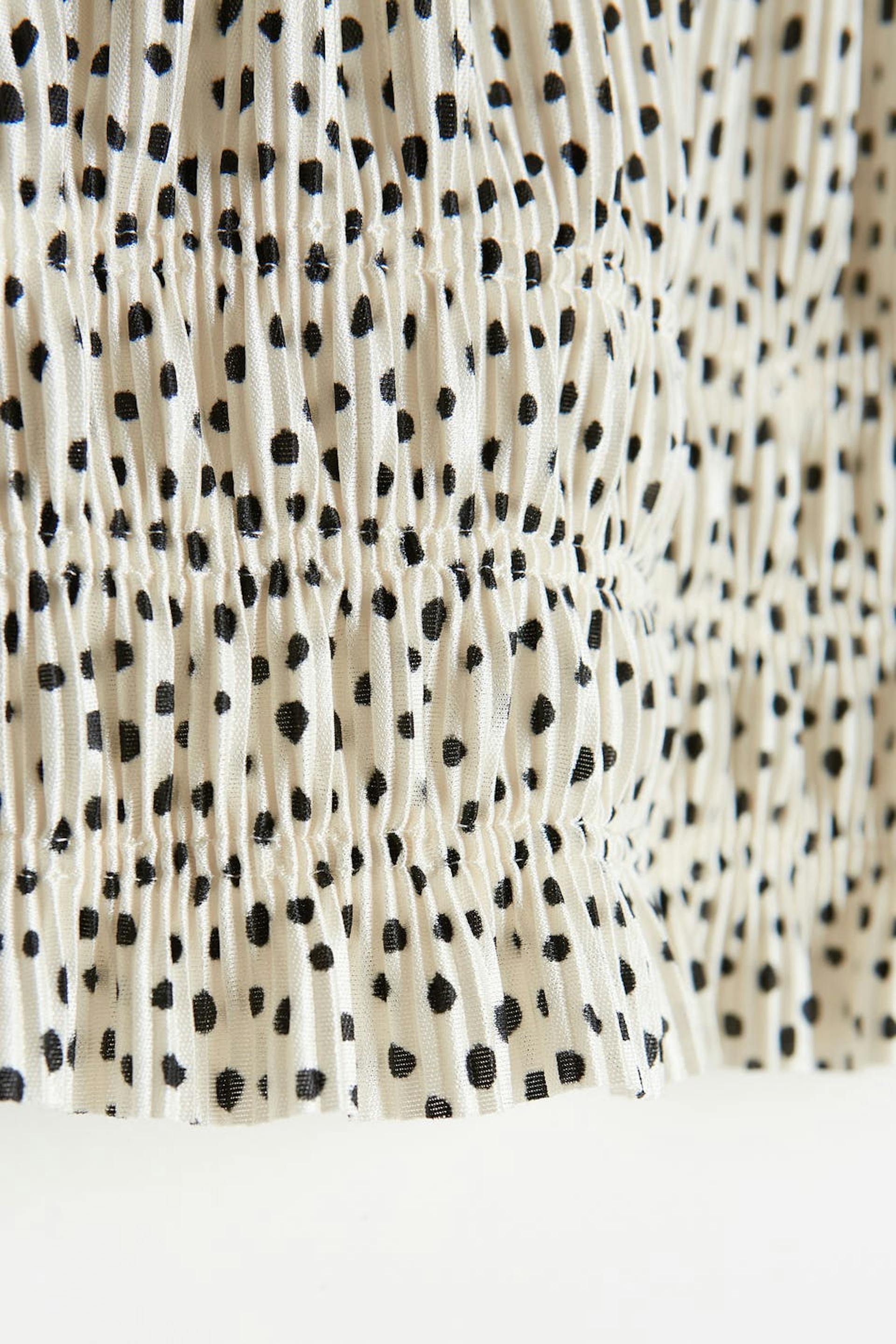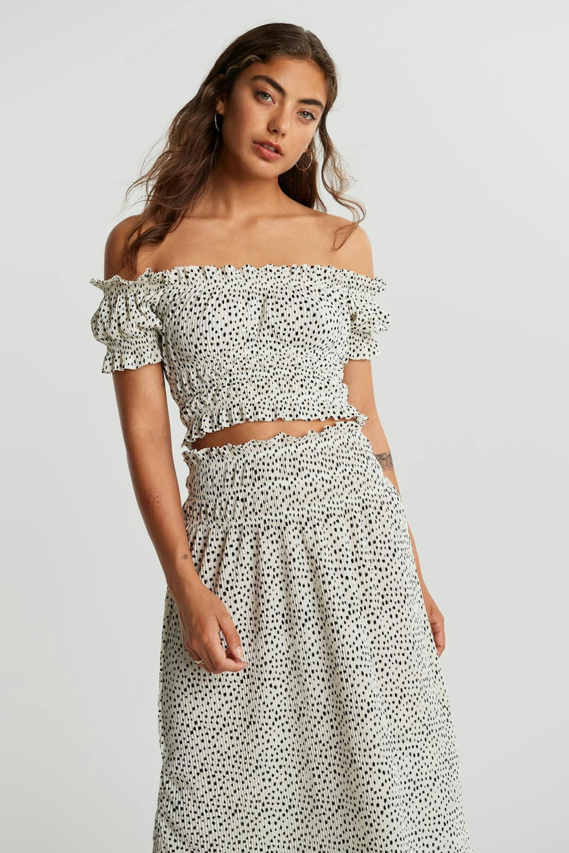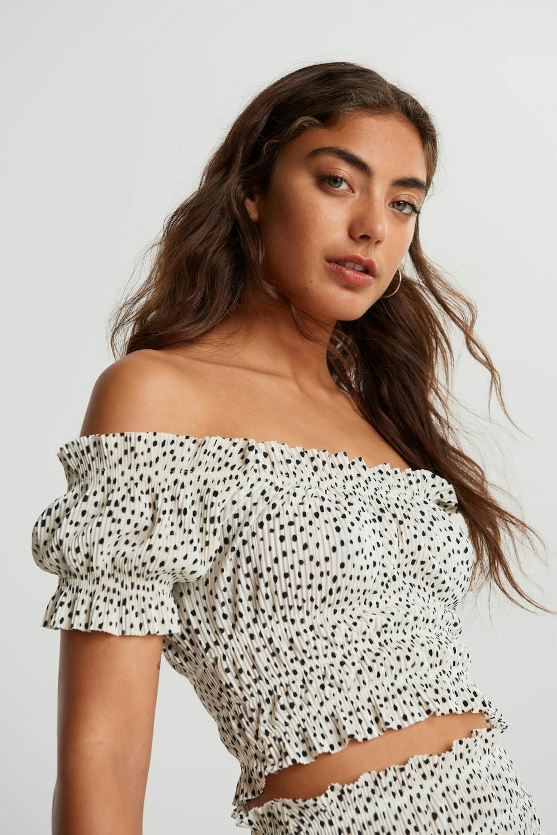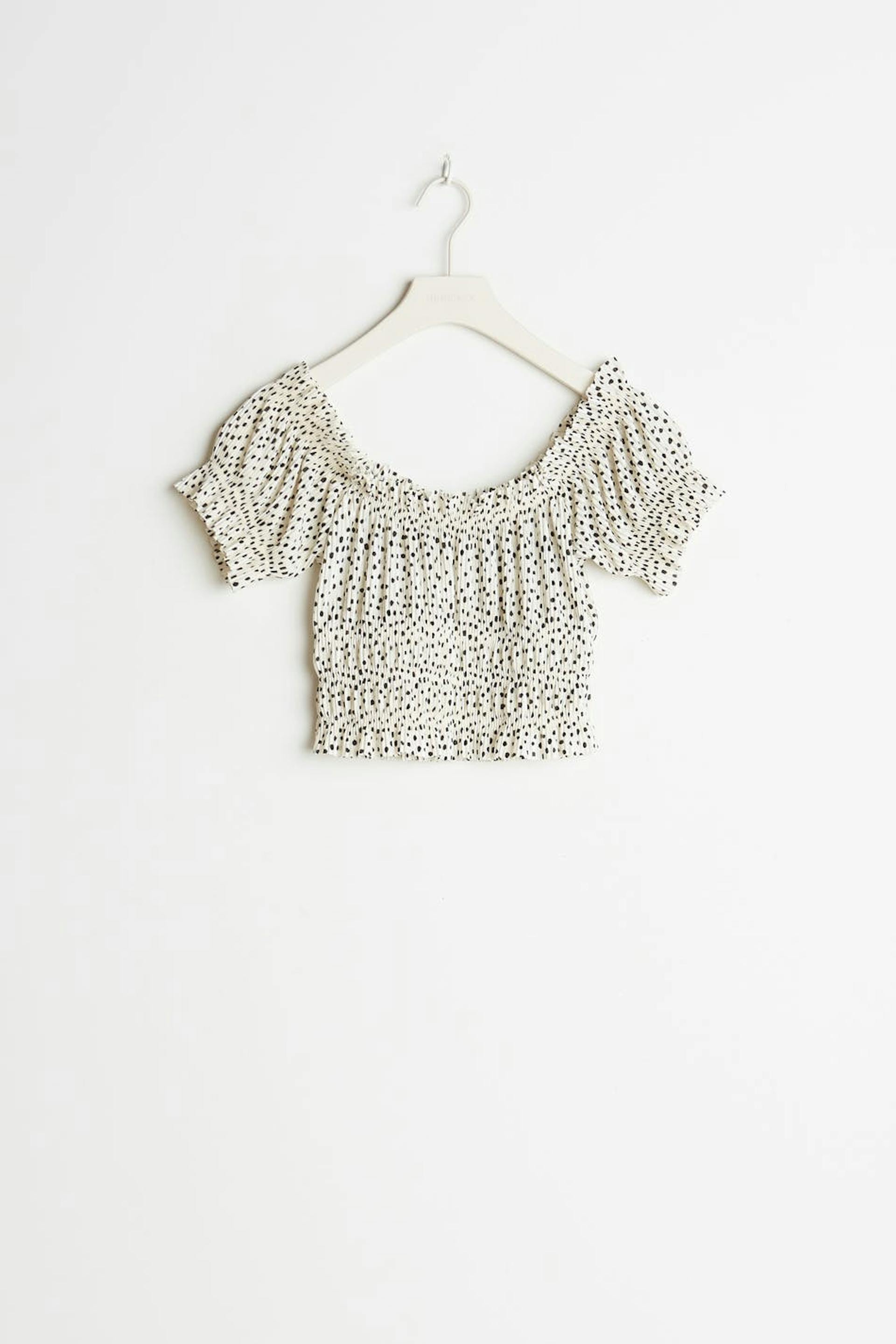 Short off shoulder top with a regular fit. The top is white and has short puff sleeves. It has an elastic band at the hem, over the bust and on the sleeve ends.