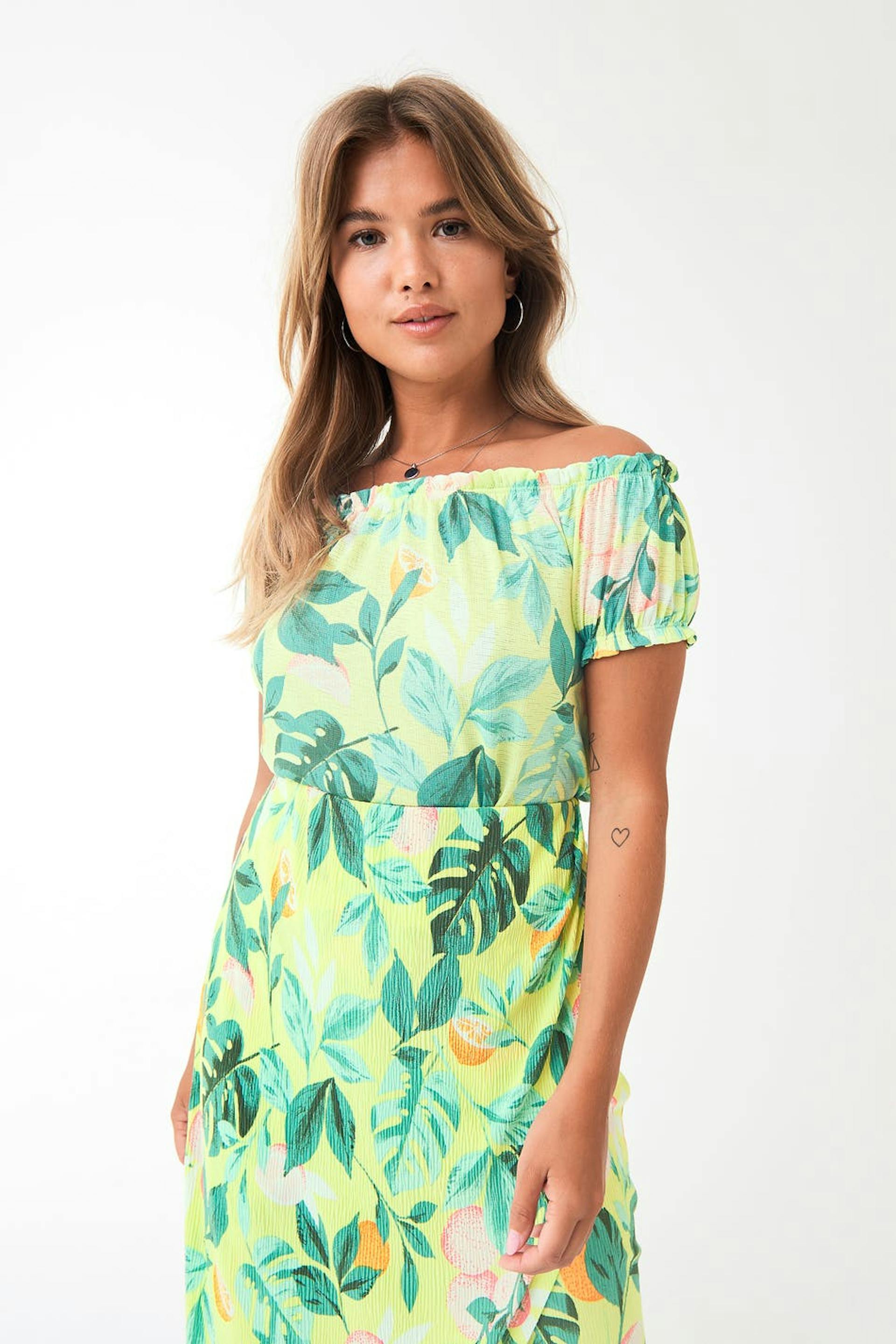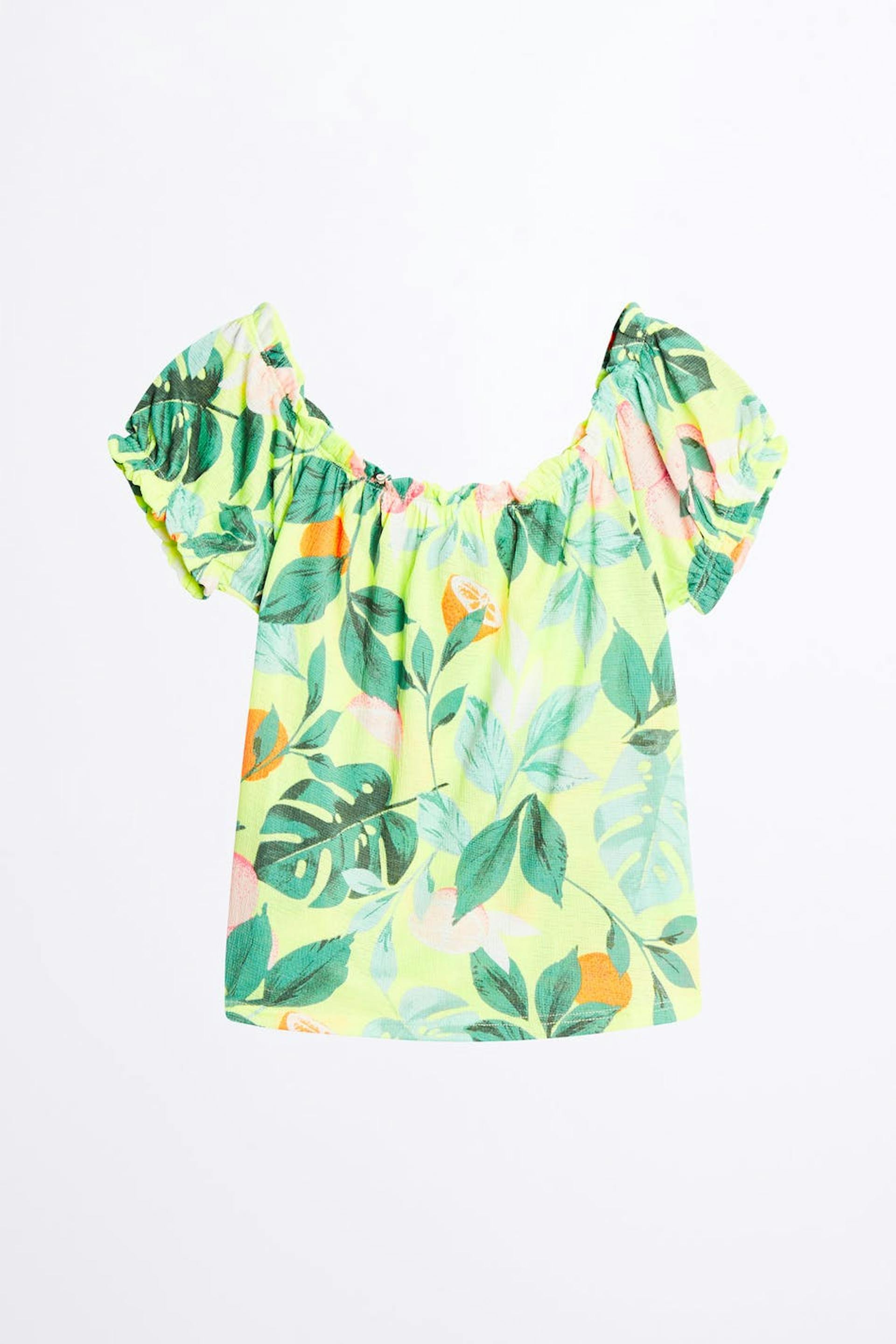 Short-sleeved off shoulder top with a regular fit. The top is green.