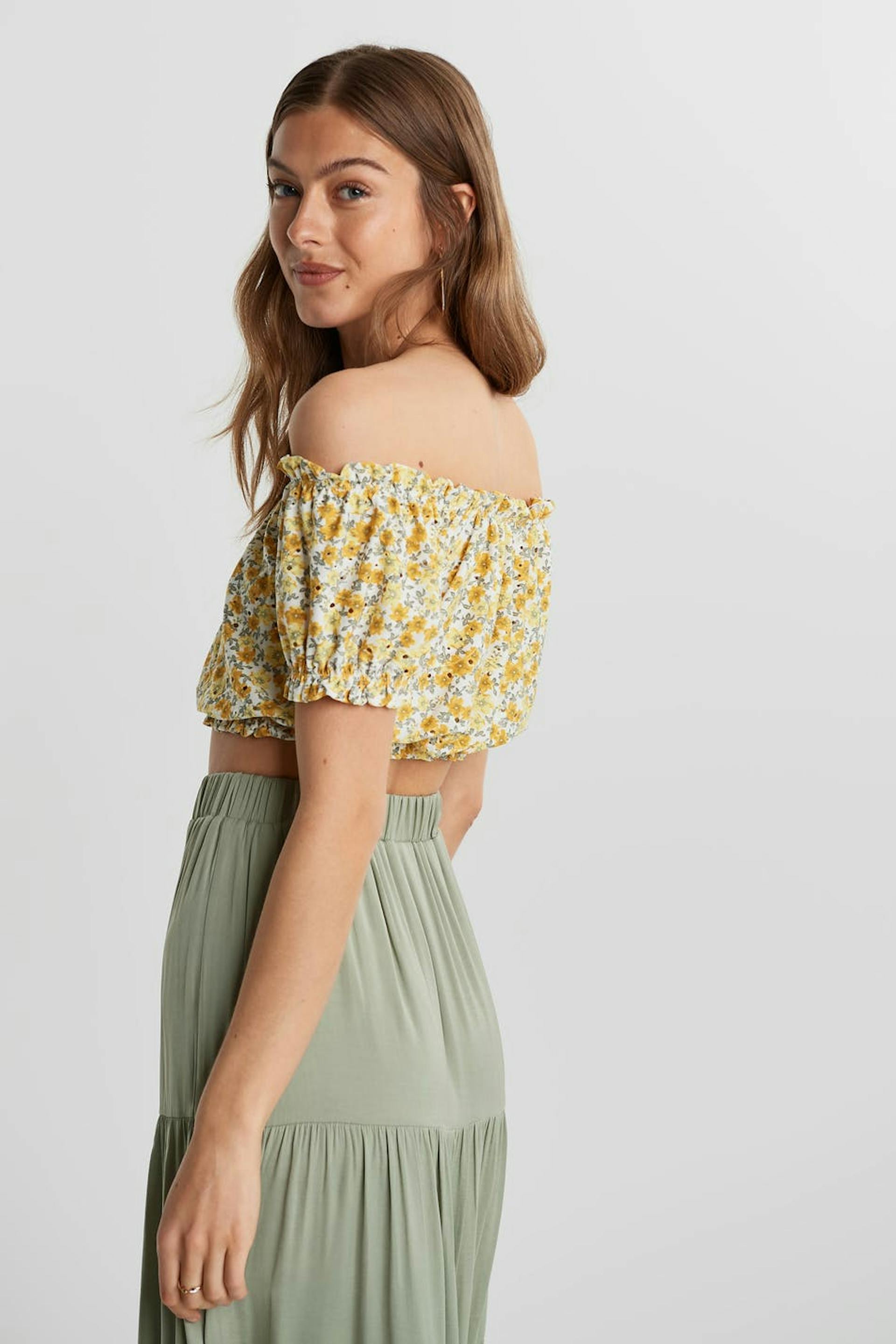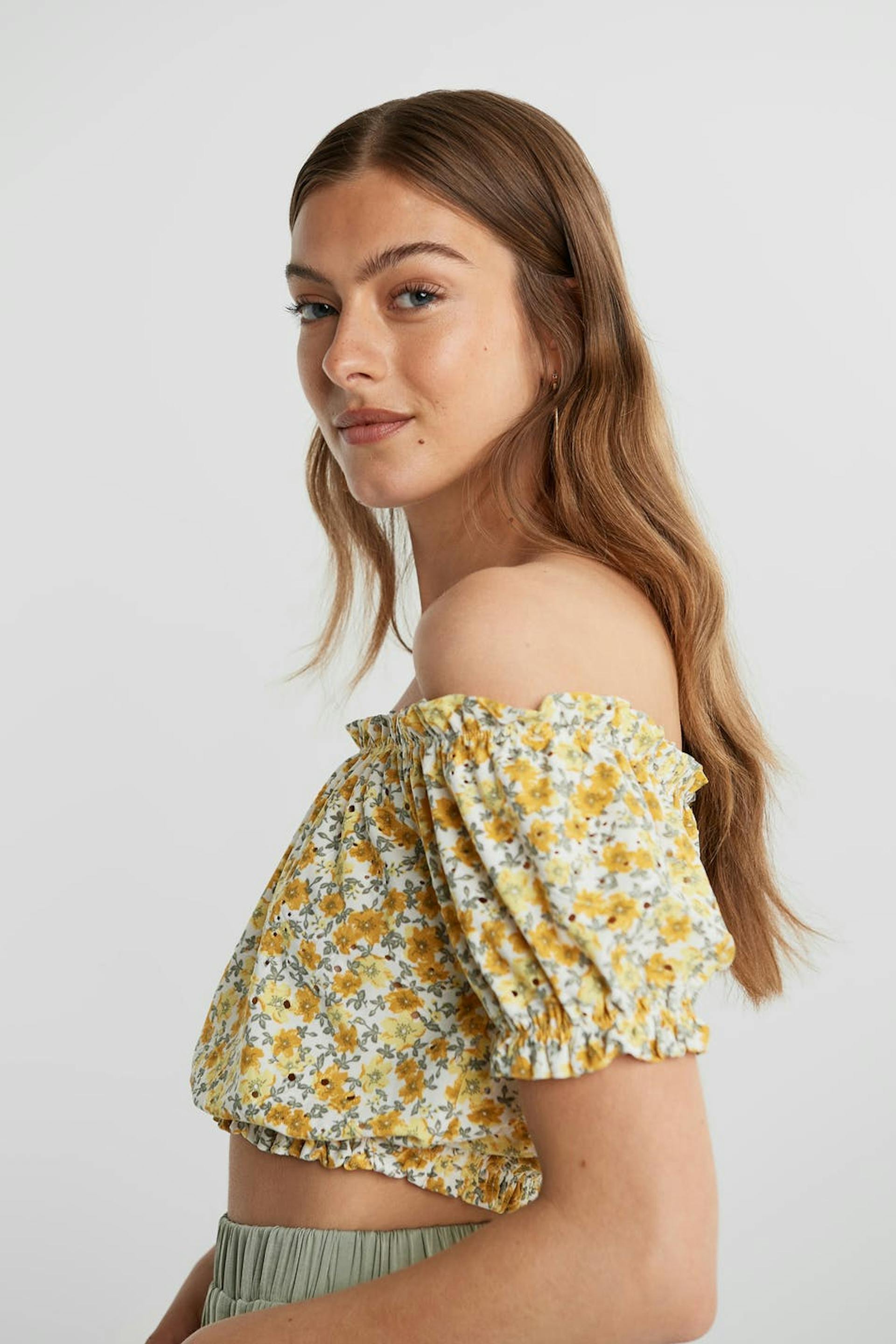 Floral off shoulder top with a regular fit. The top is yellow and short and has short puff sleeves. It has embroidery details.