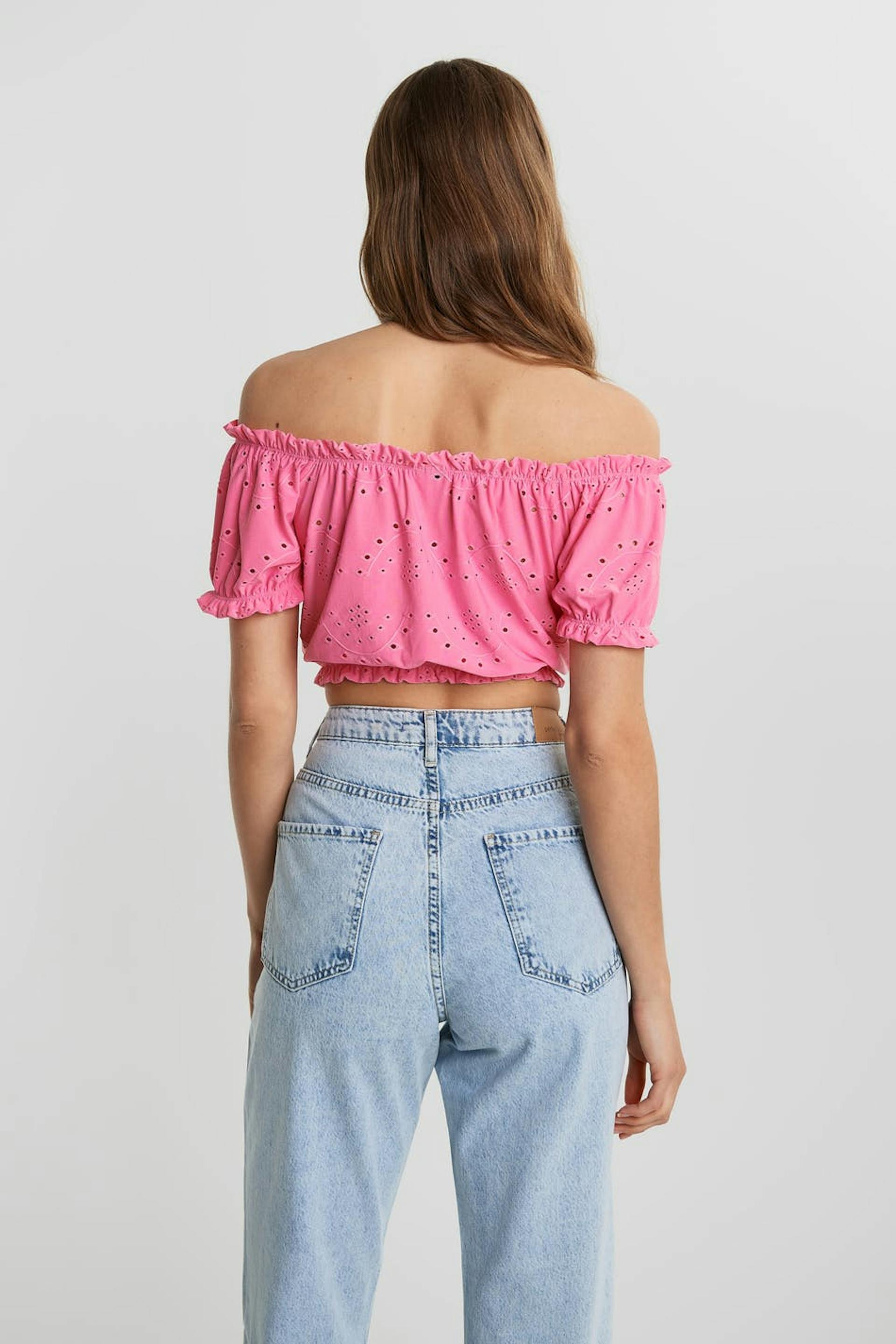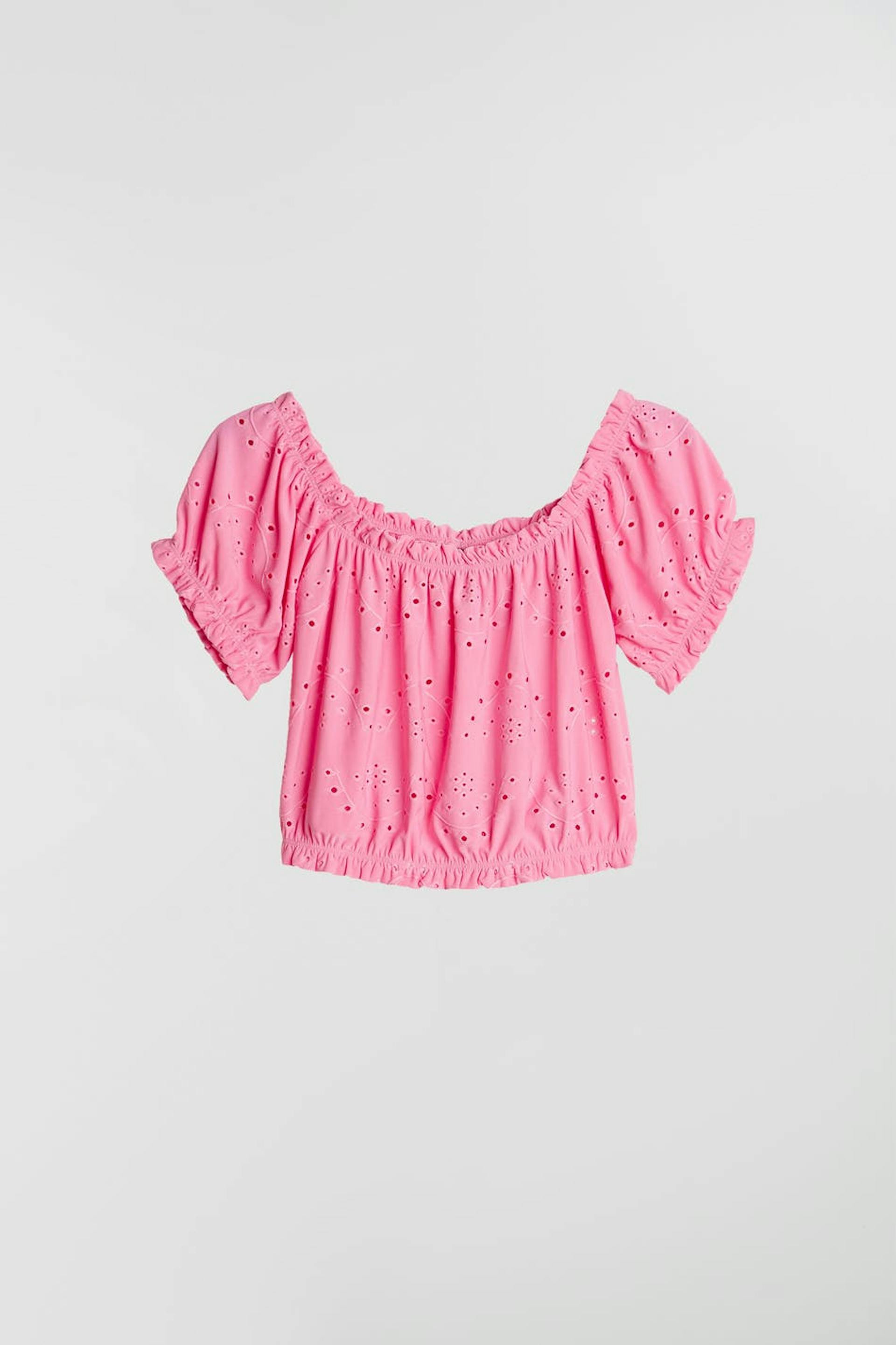 Short off shoulder top with a regular fit. The top is pink and has short puff sleeves. It has embroidery details.