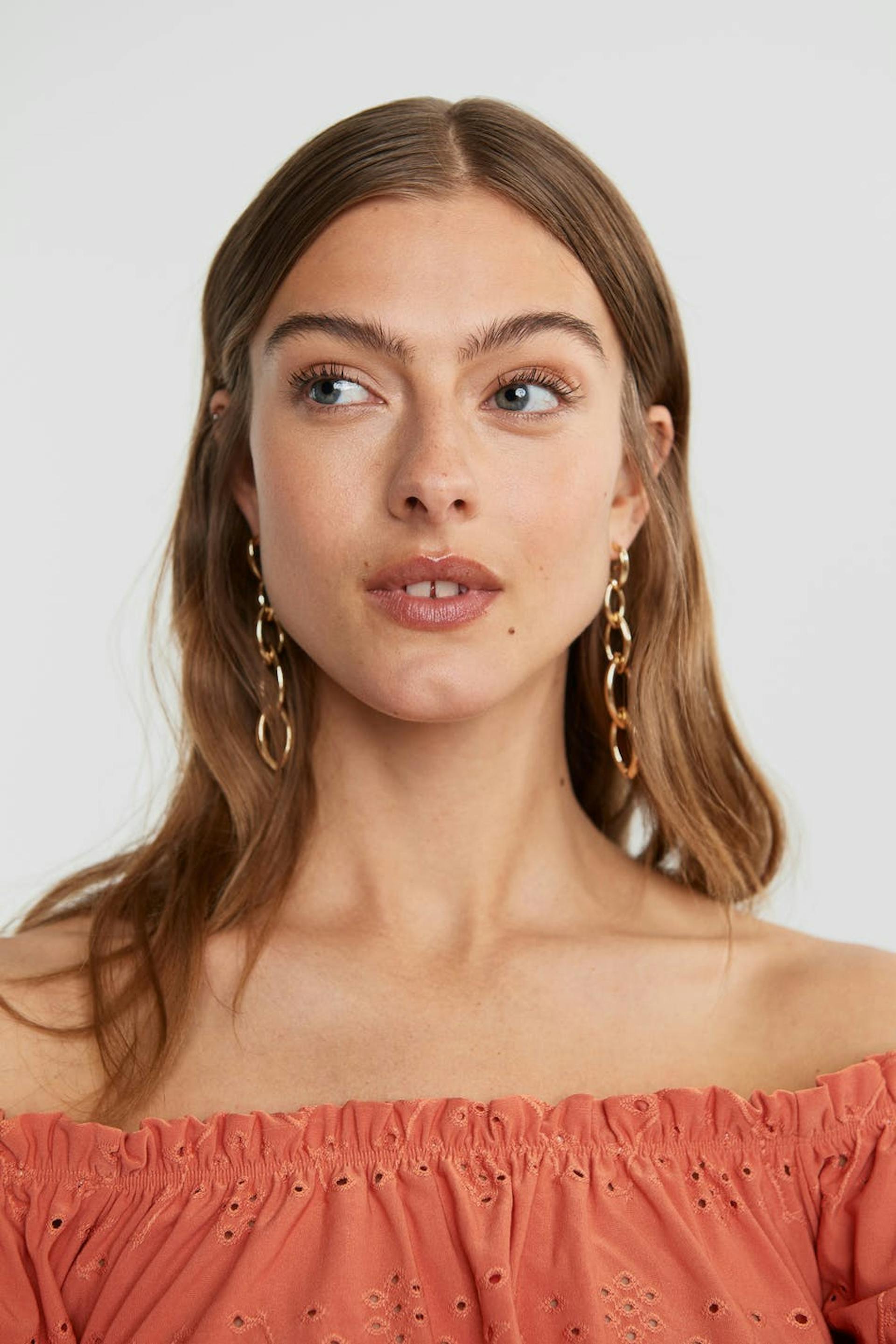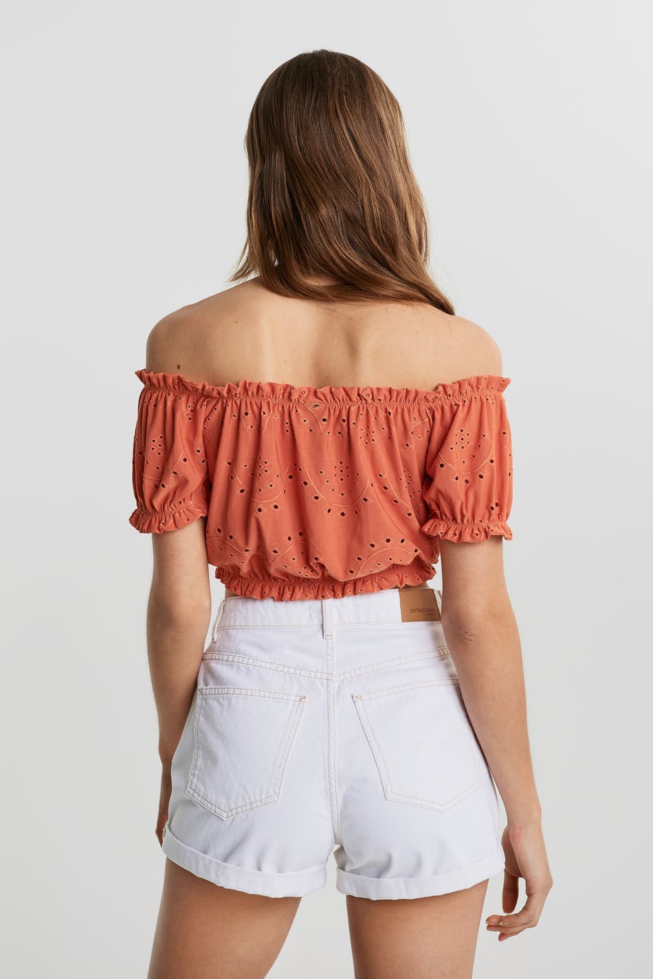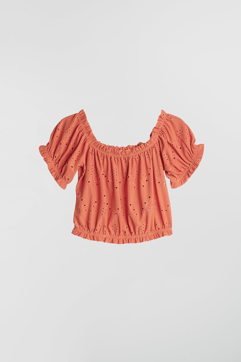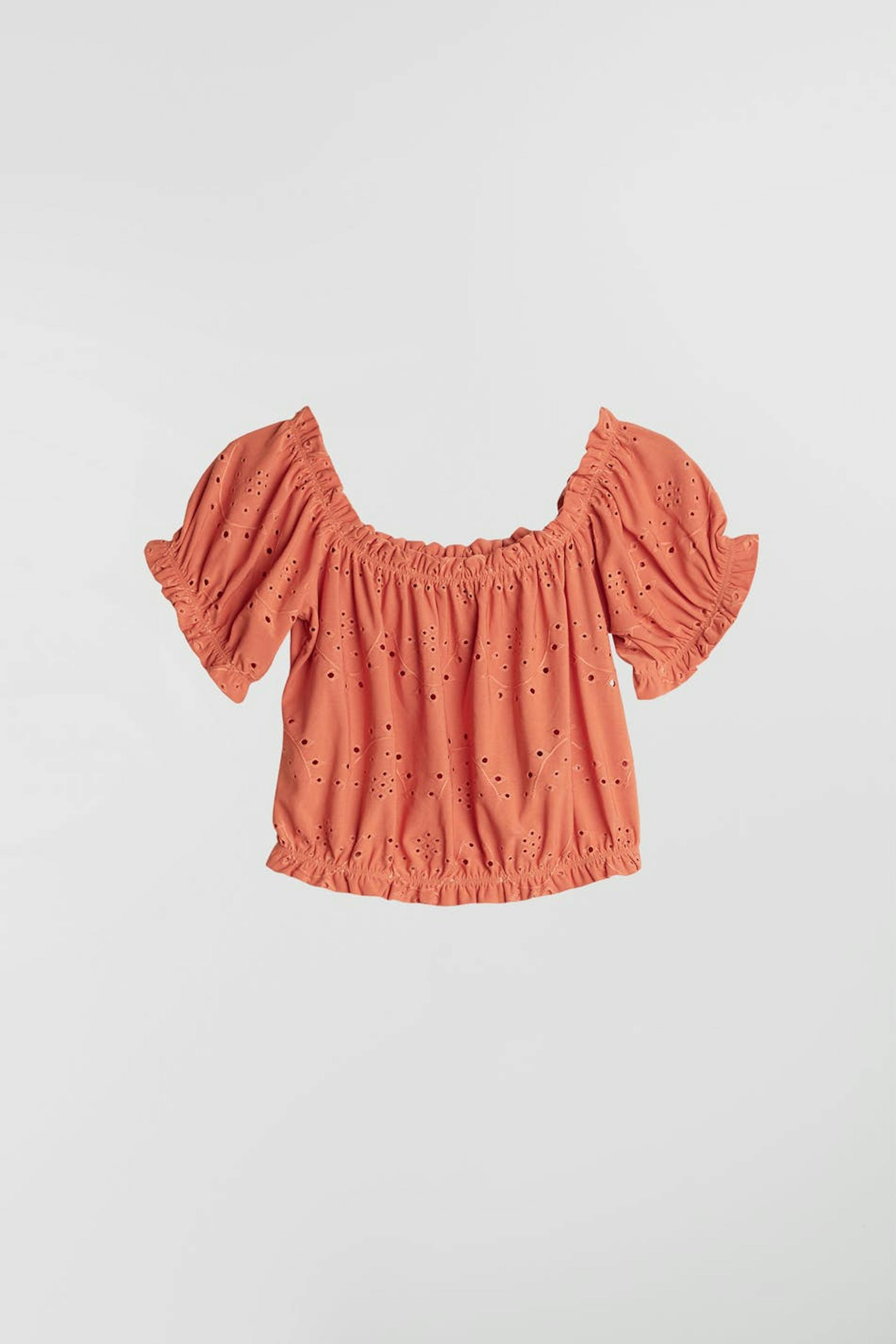Short off shoulder top with a regular fit. The top is orange and has short puff sleeves. It has embroidery details.