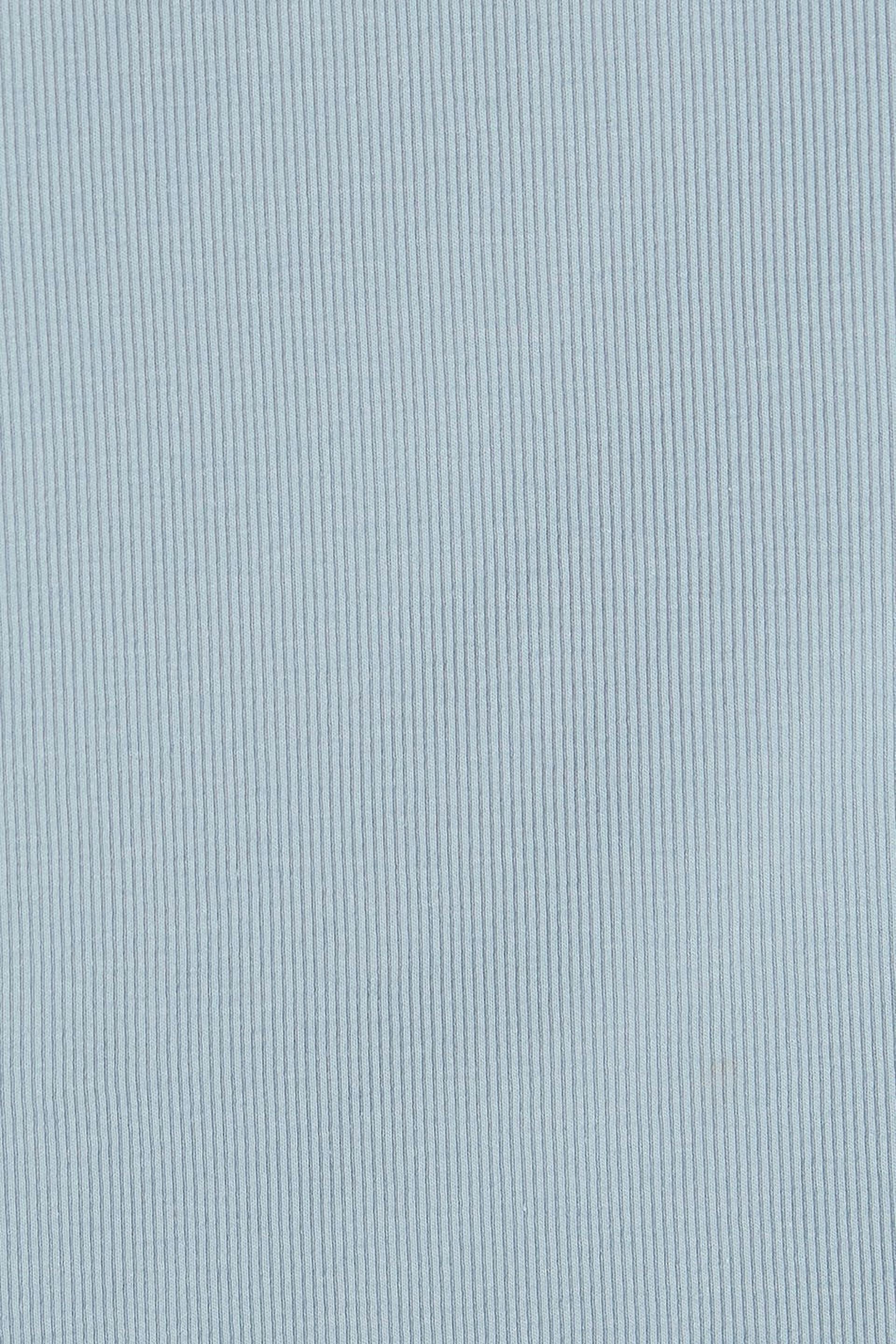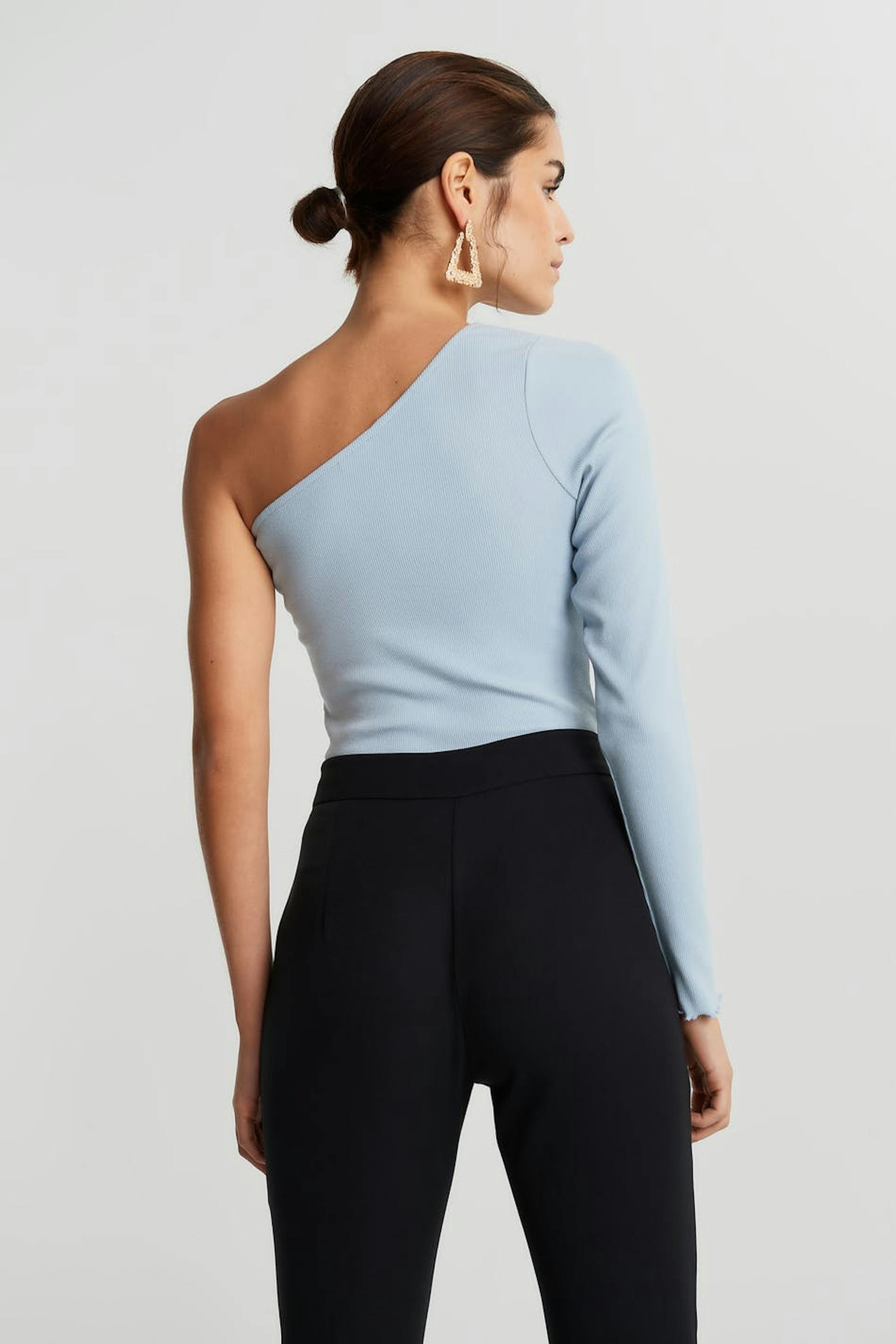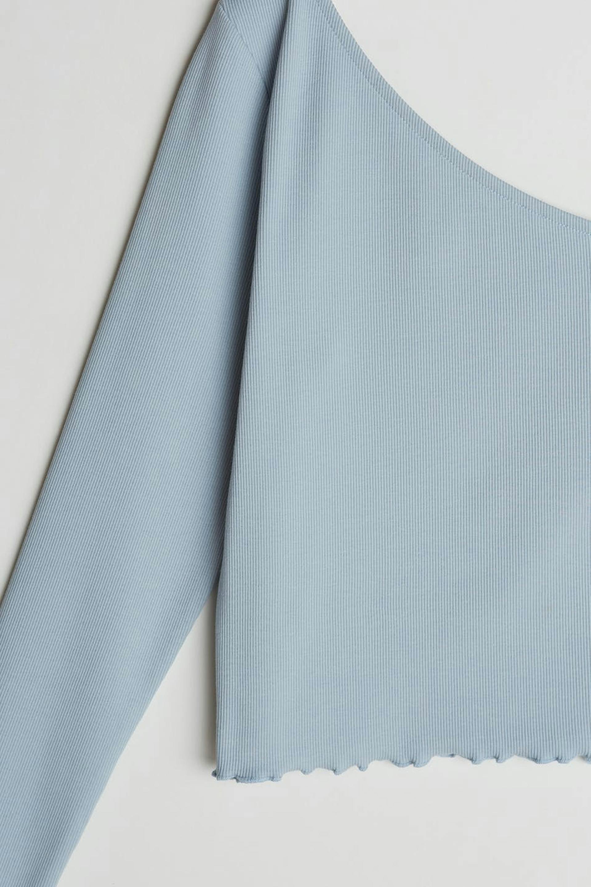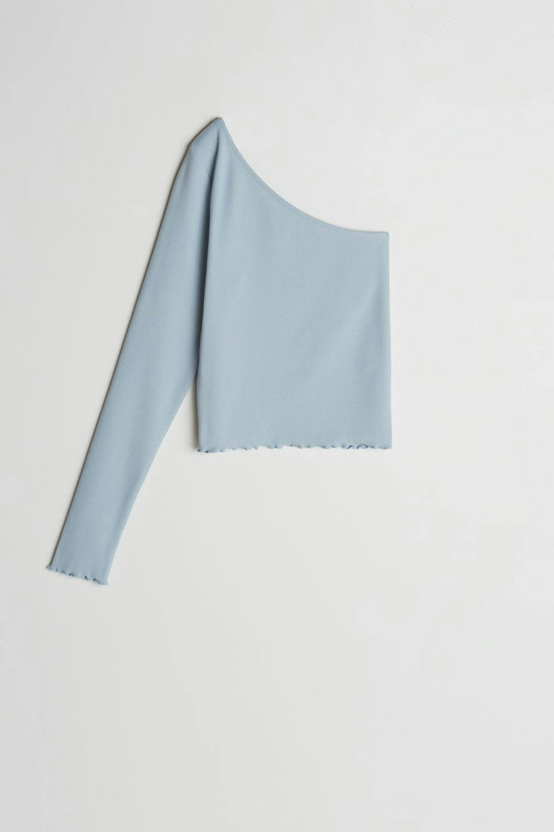 Off-the-shoulder top with a fitted fit. The off-the-shoulder top is blue and has a one shoulder design. It has a long sleeve.