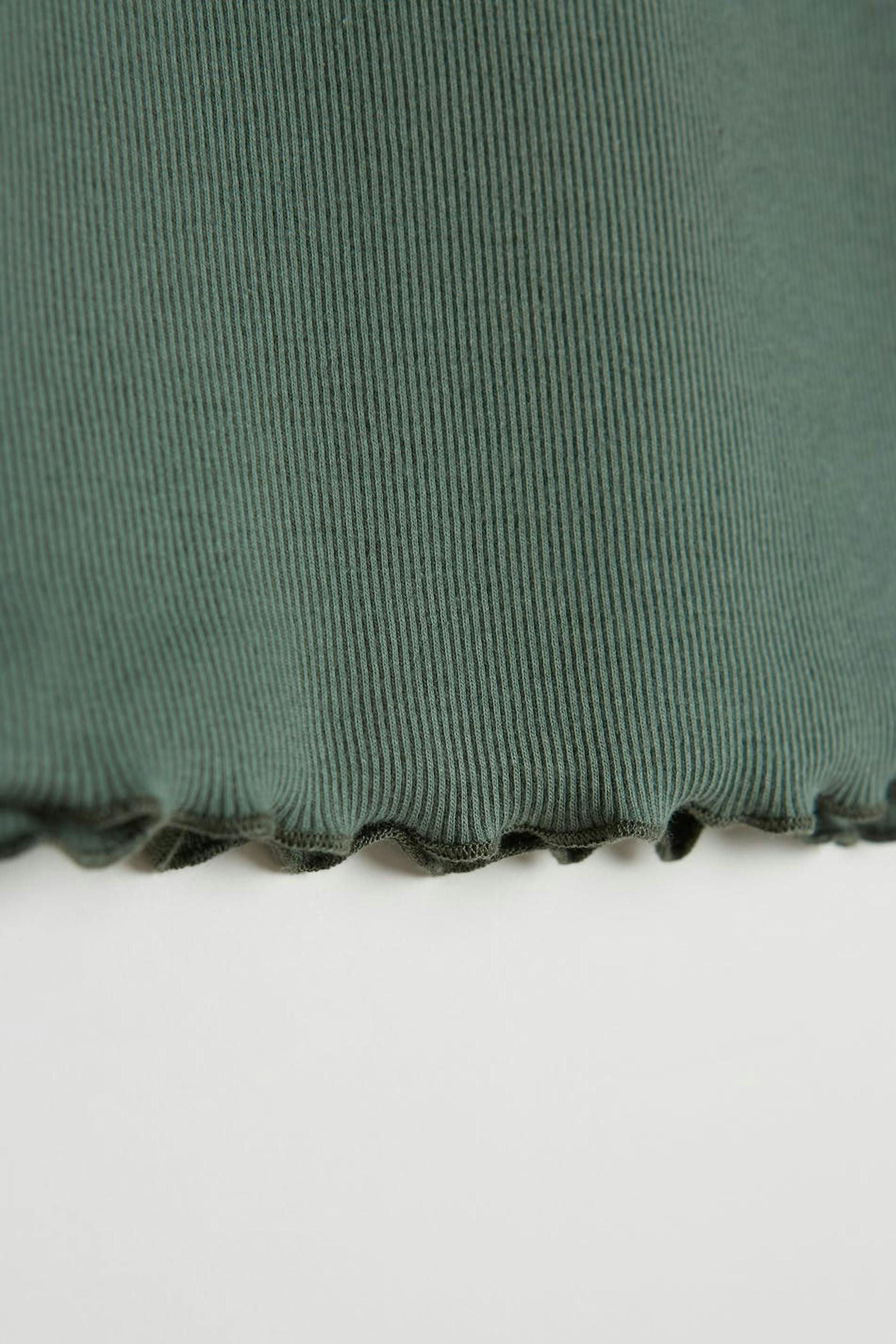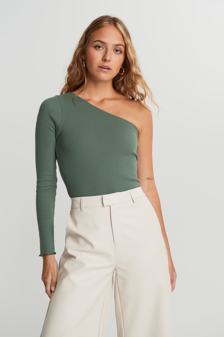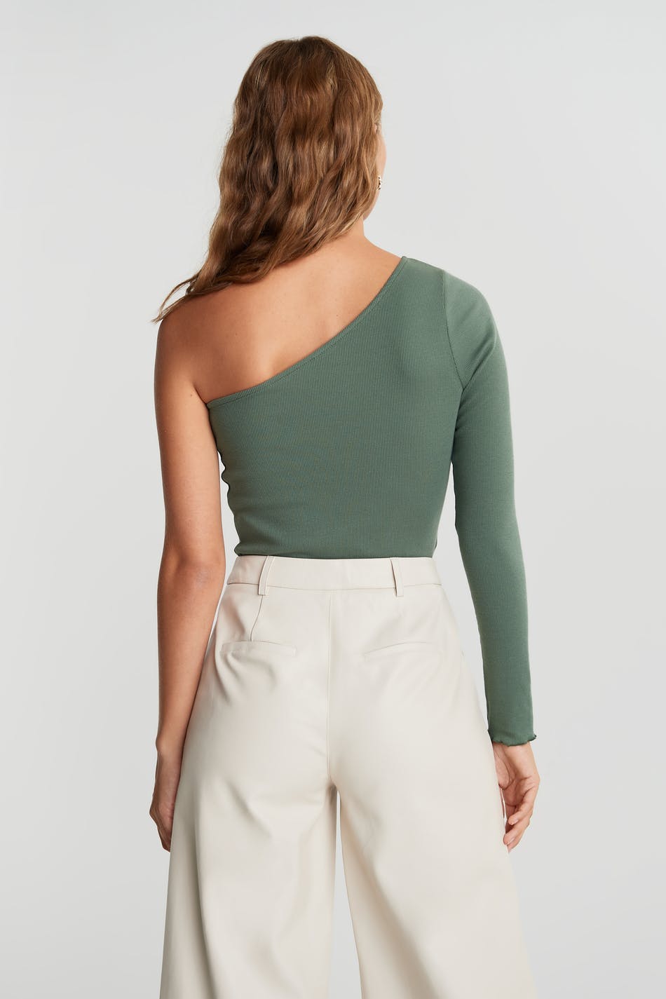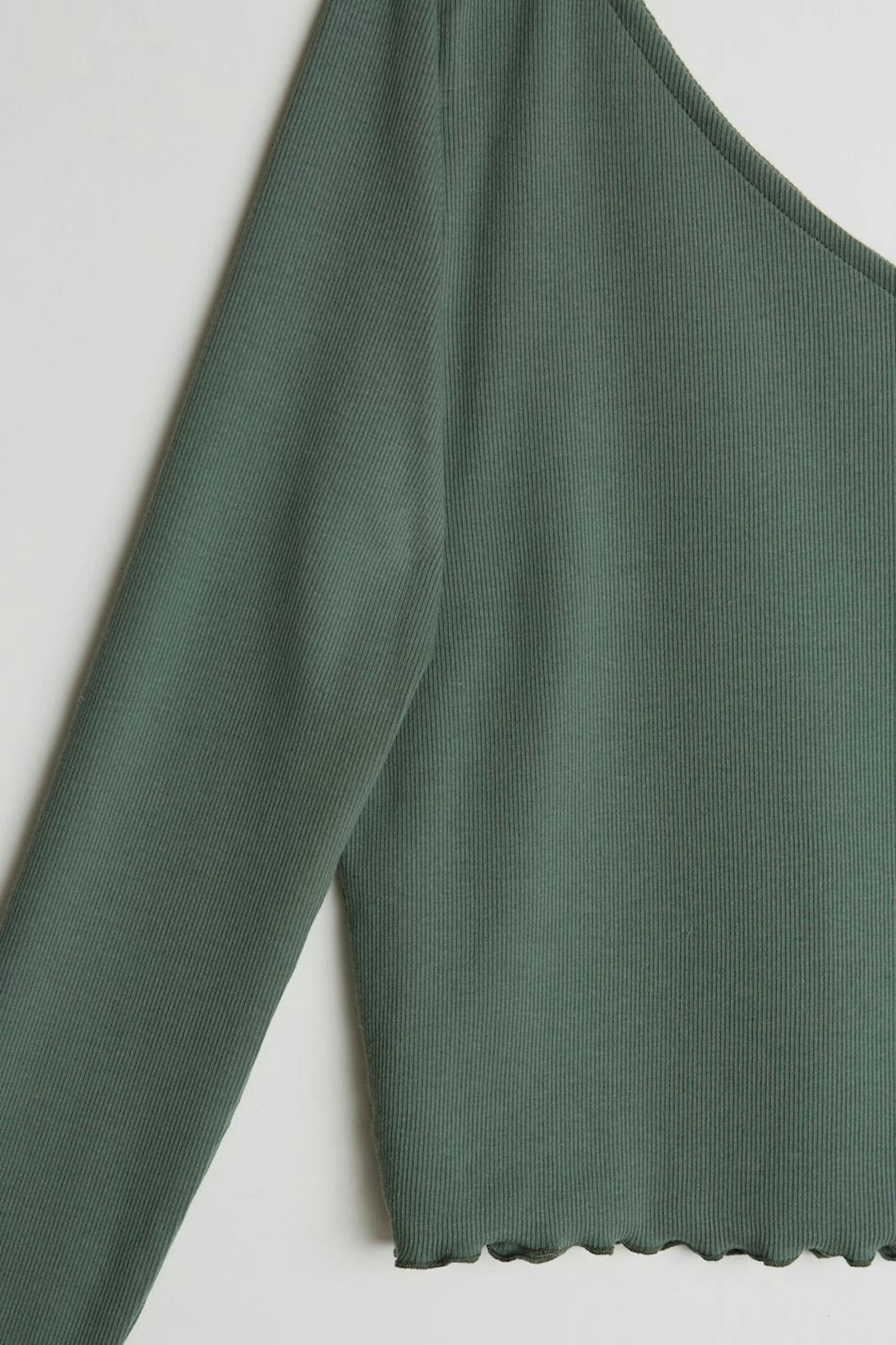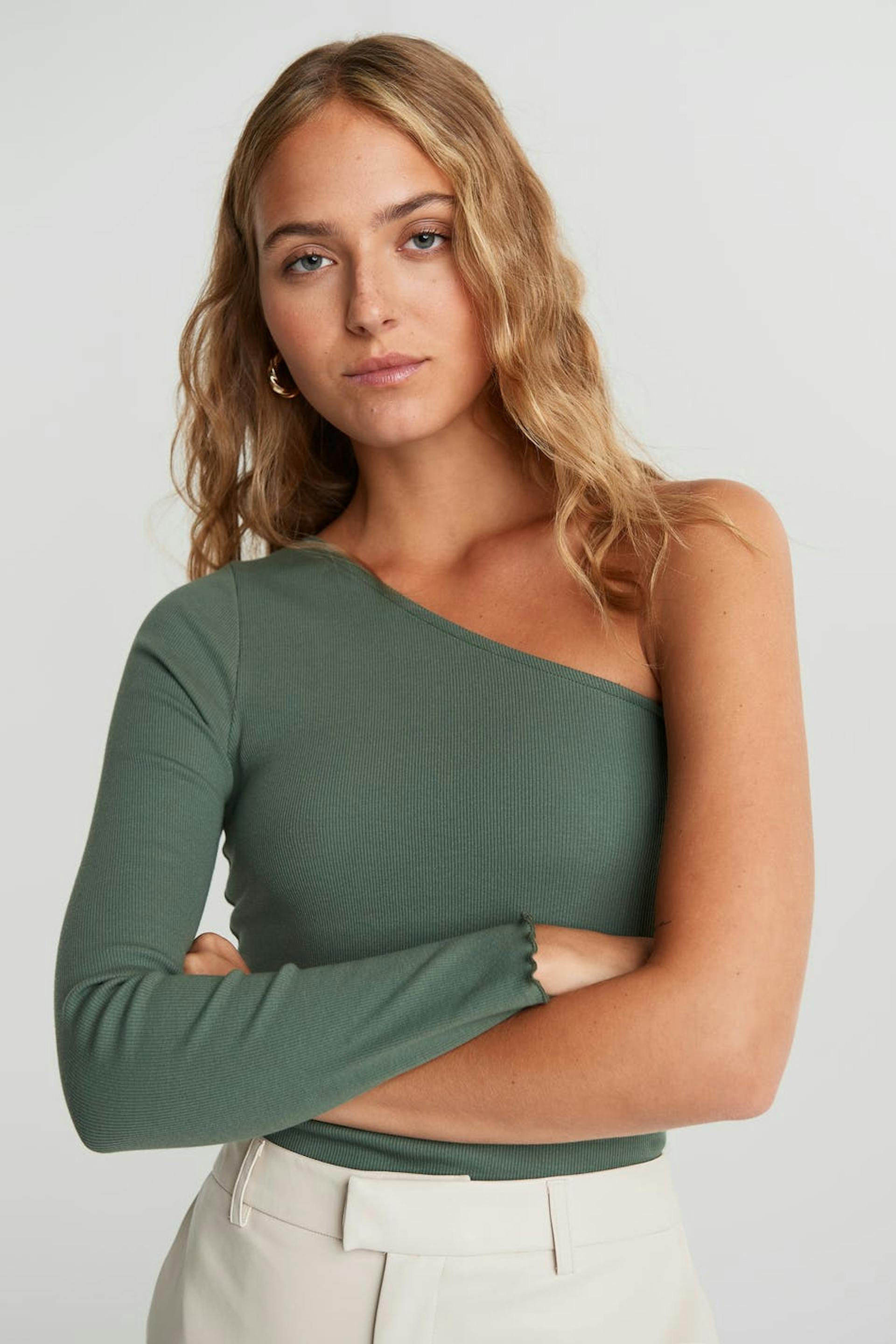 Off-the-shoulder top with a fitted fit. The off-the-shoulder top is green and has a one shoulder design. It has a long sleeve.