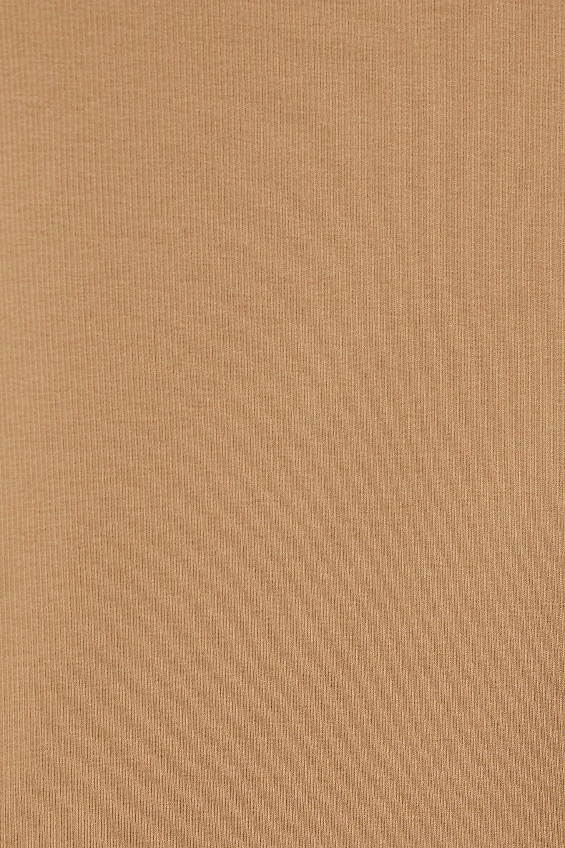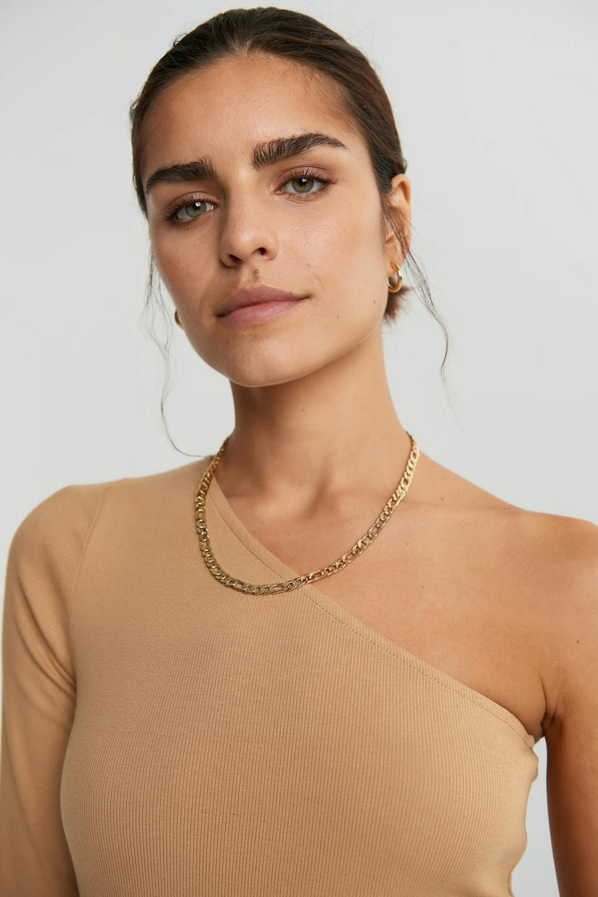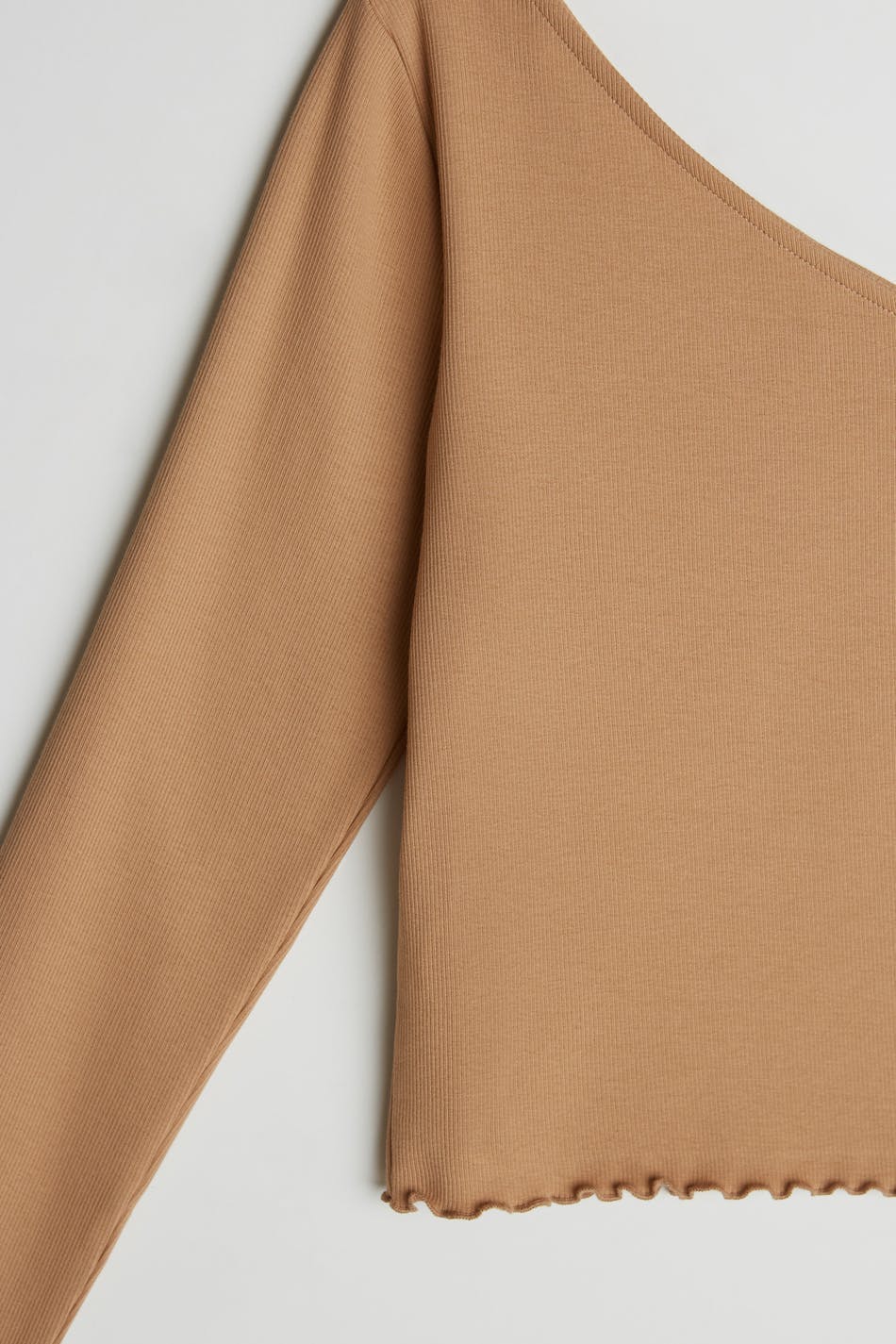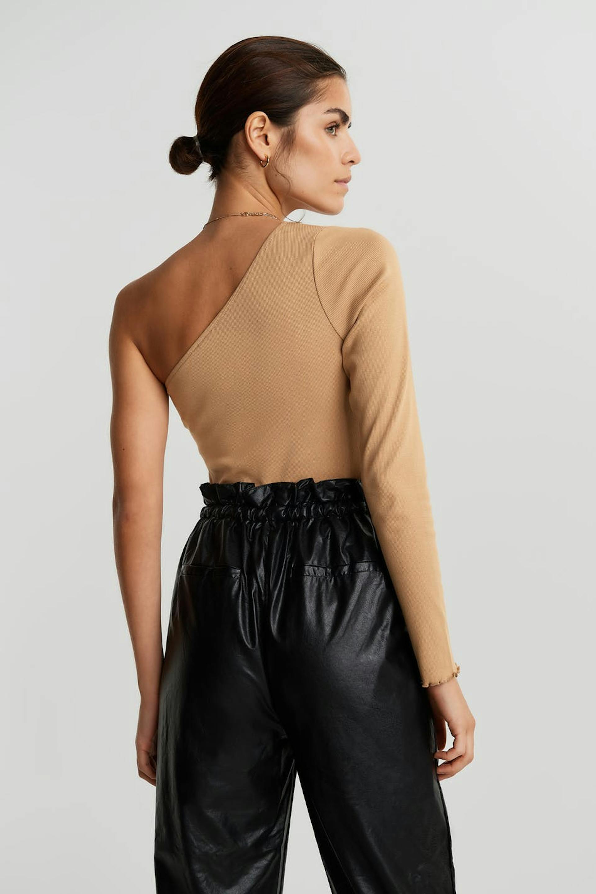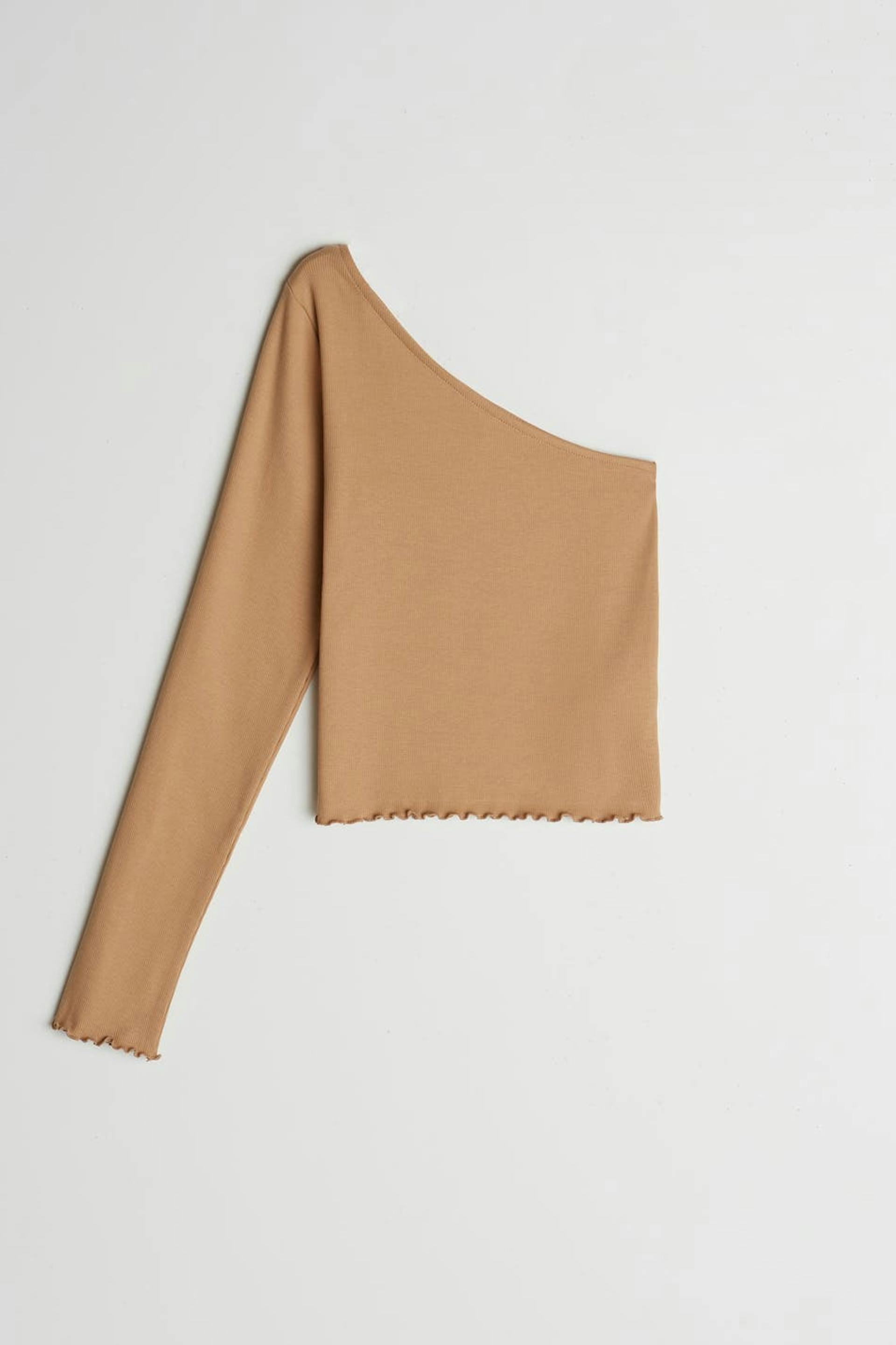 Off-the-shoulder top with a fitted fit. The off-the-shoulder top is beige and has a one shoulder design. It has a long sleeve.