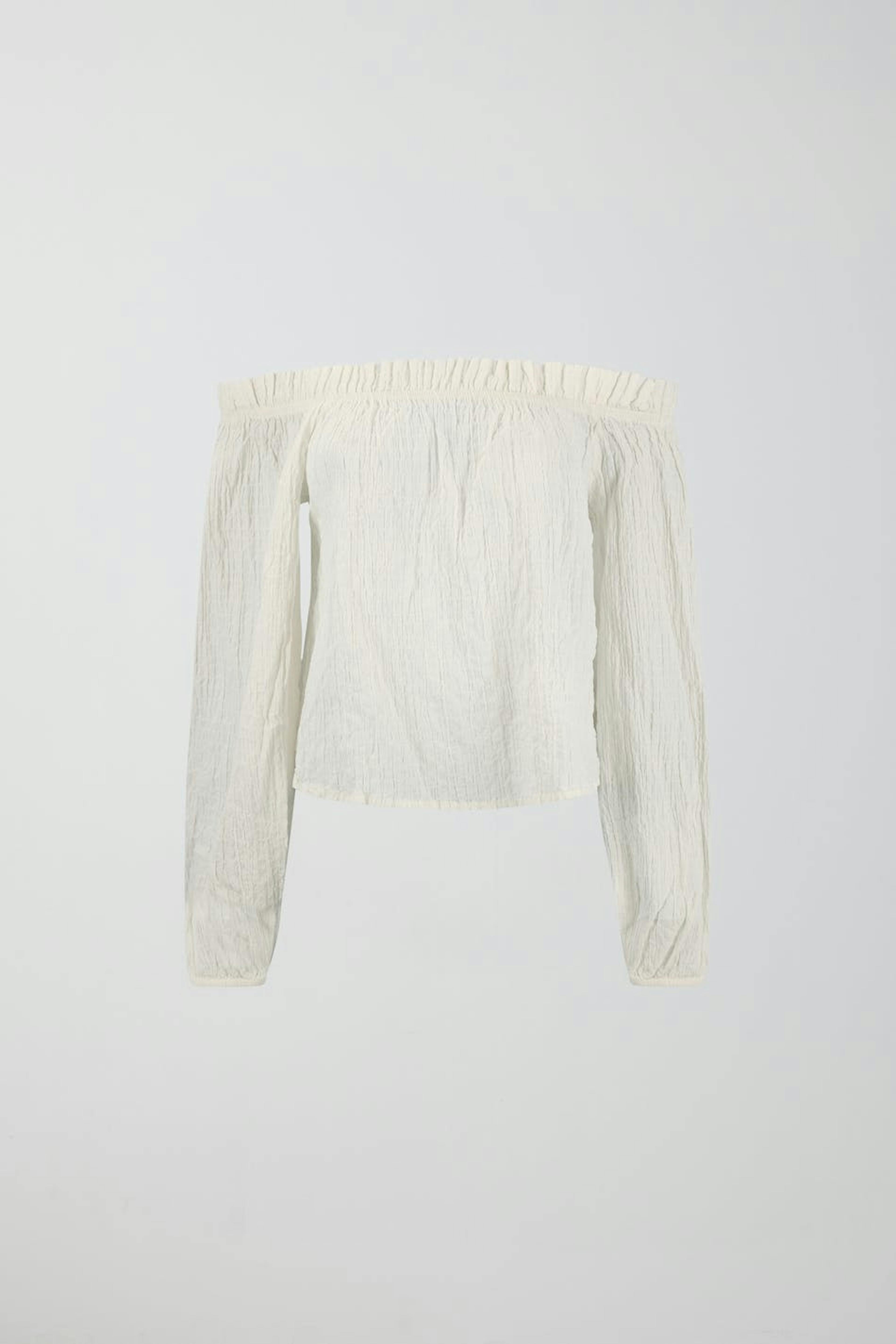 Off-the-shoulder blouse with boxy fit. The blouse is white and has a structured material. It has elasticized cuffs and frills on the neckline.