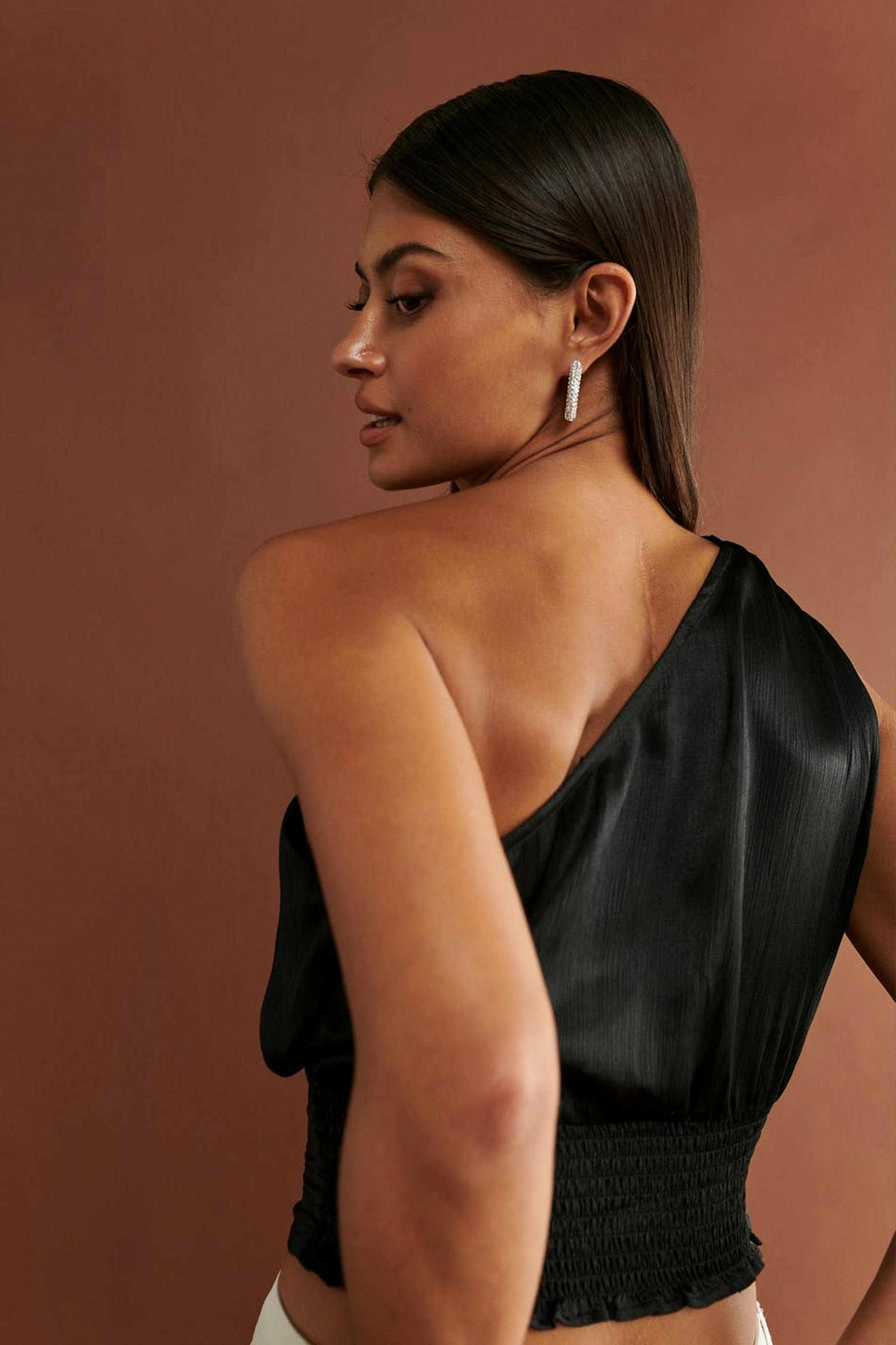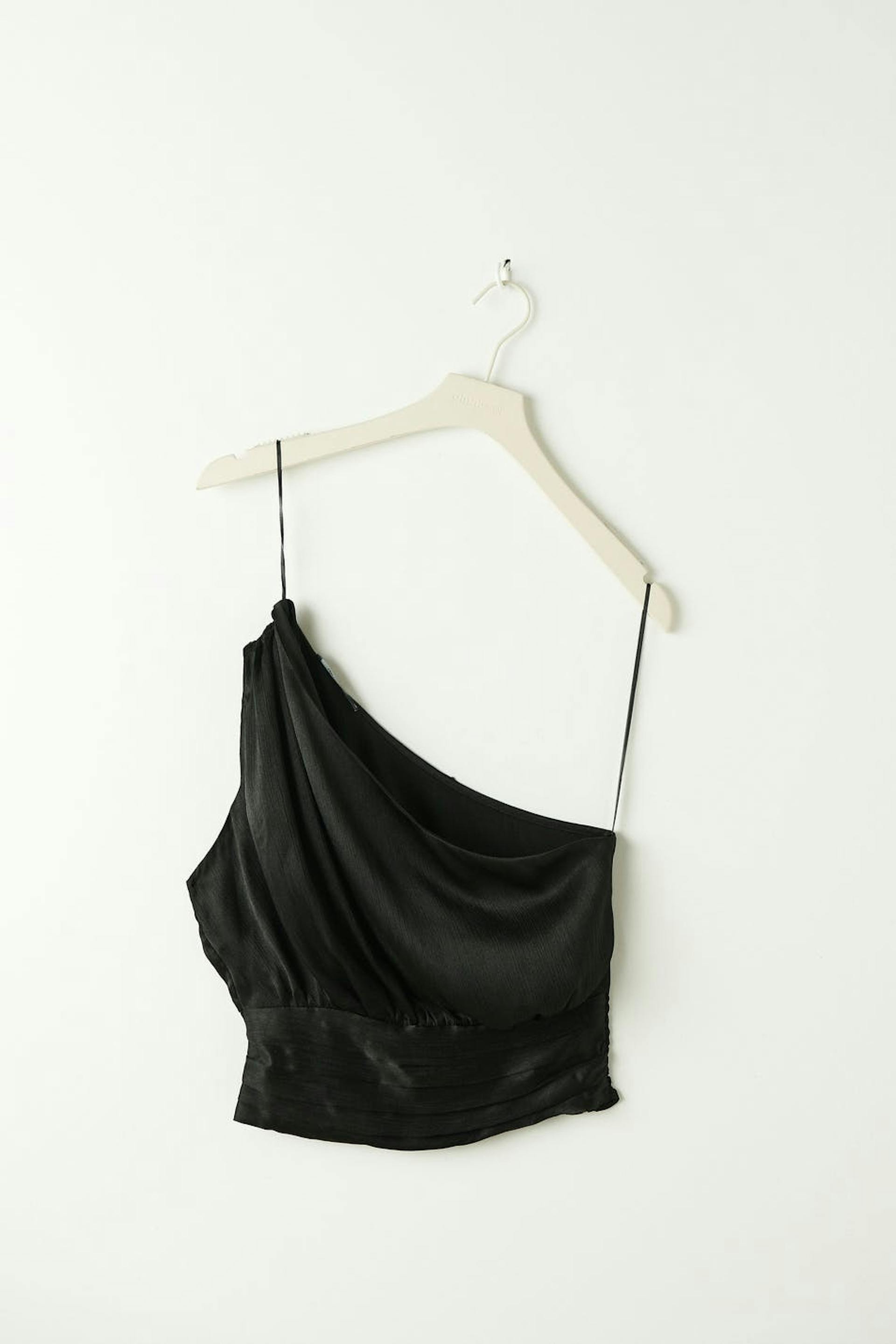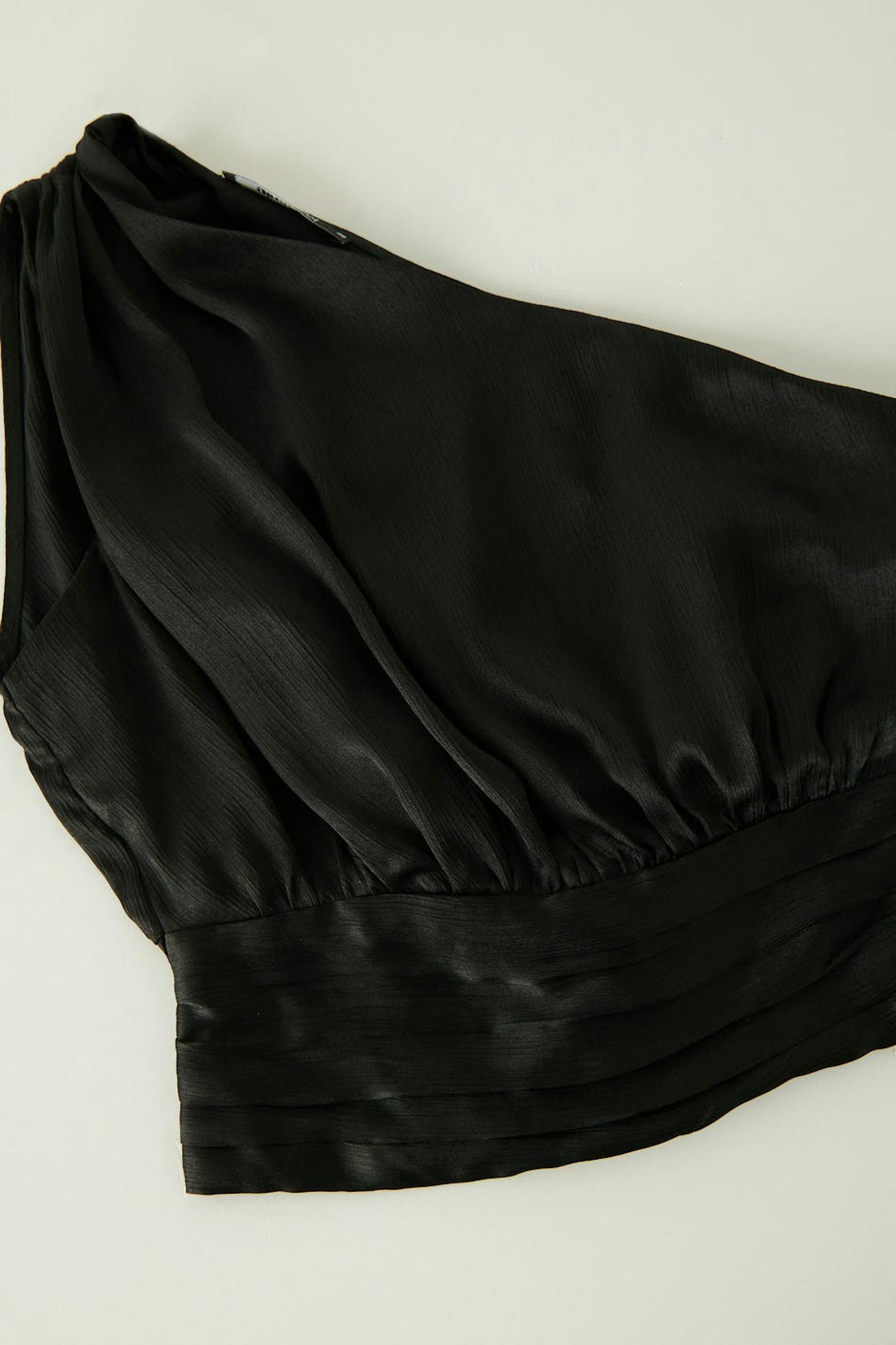 Cropped one shoulder top in satin with gathered effect. The top is perfect for the party, black and sleeveless. It has smocking at the back and a crinkled material.