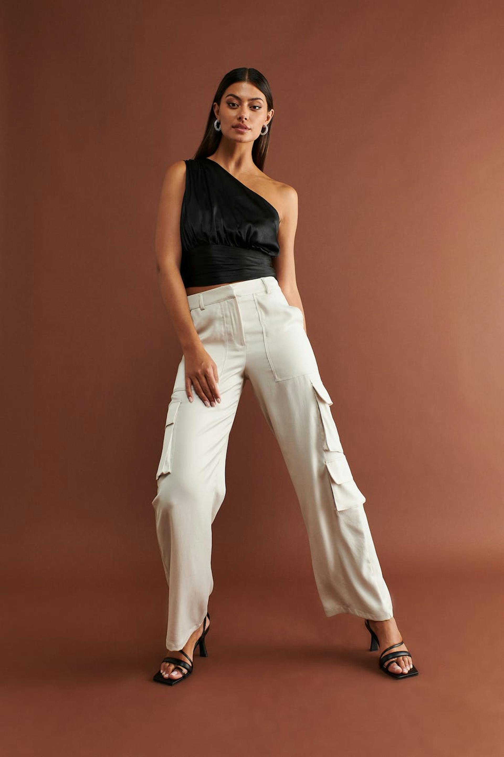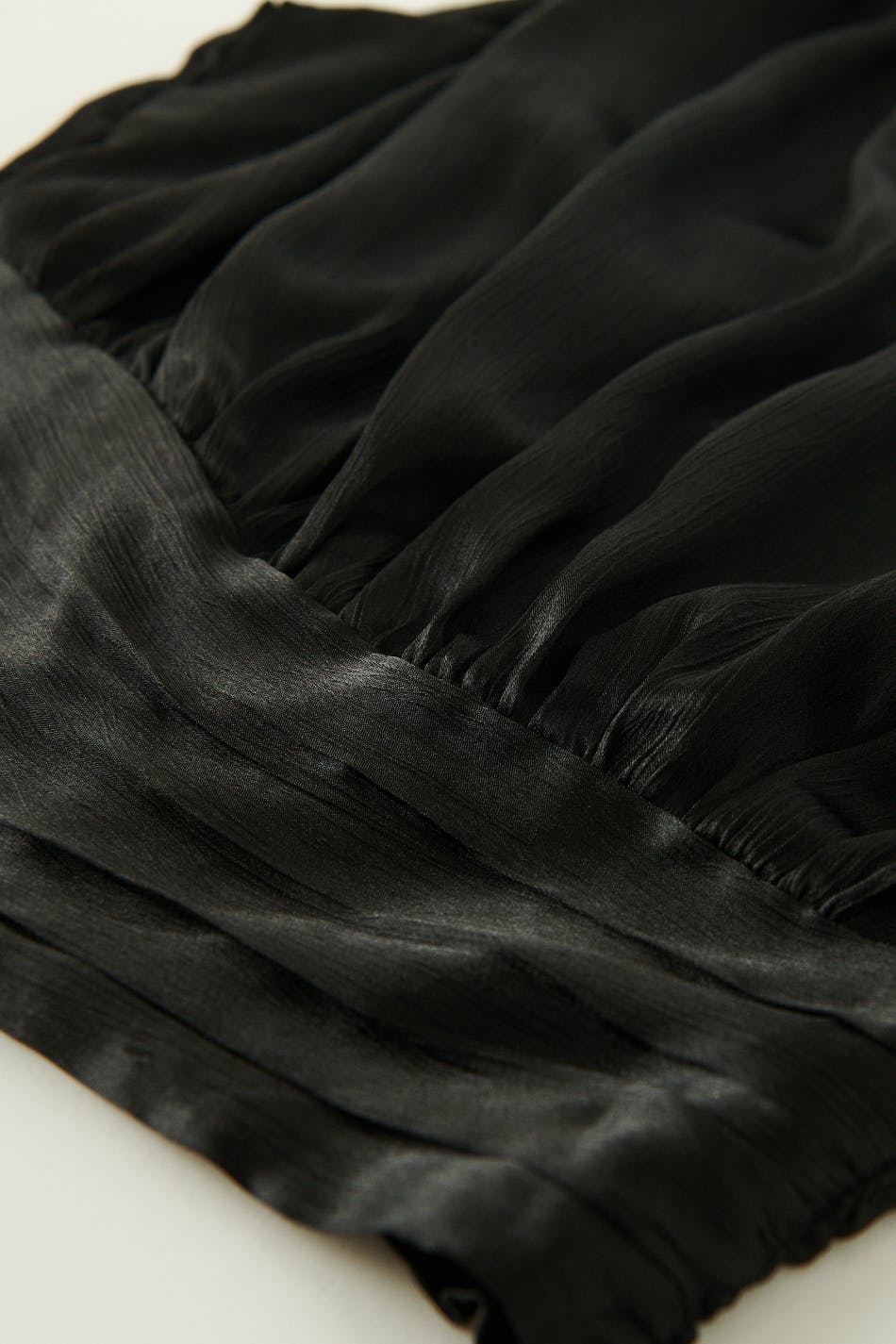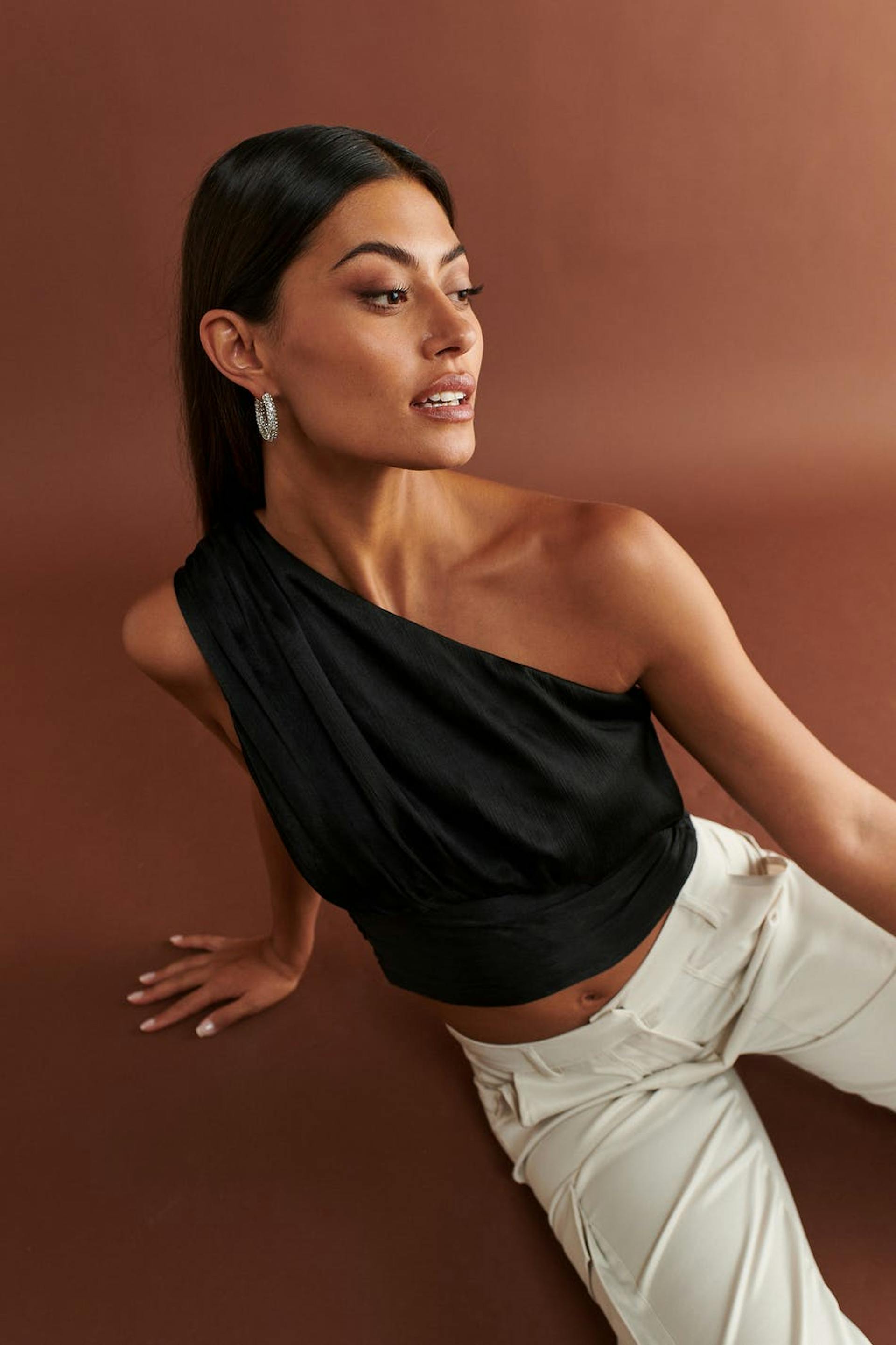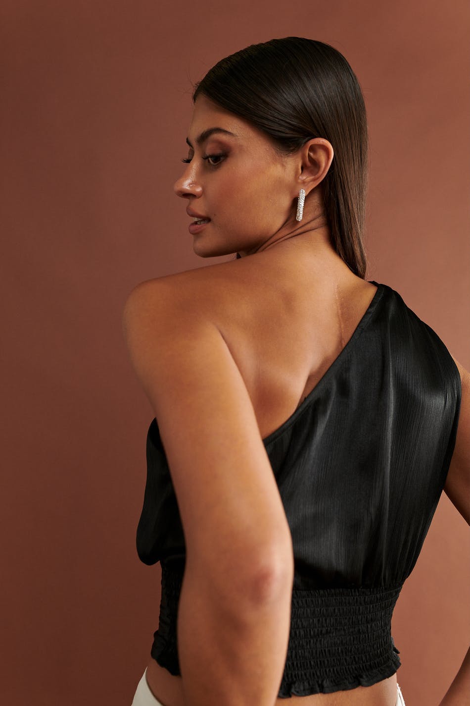 Cropped one shoulder top in satin with gathered effect. The top is perfect for the party, black and sleeveless. It has smocking at the back and a crinkled material.