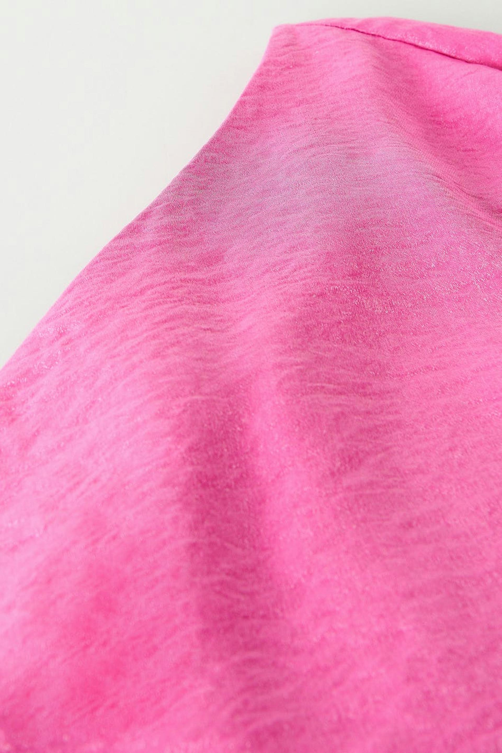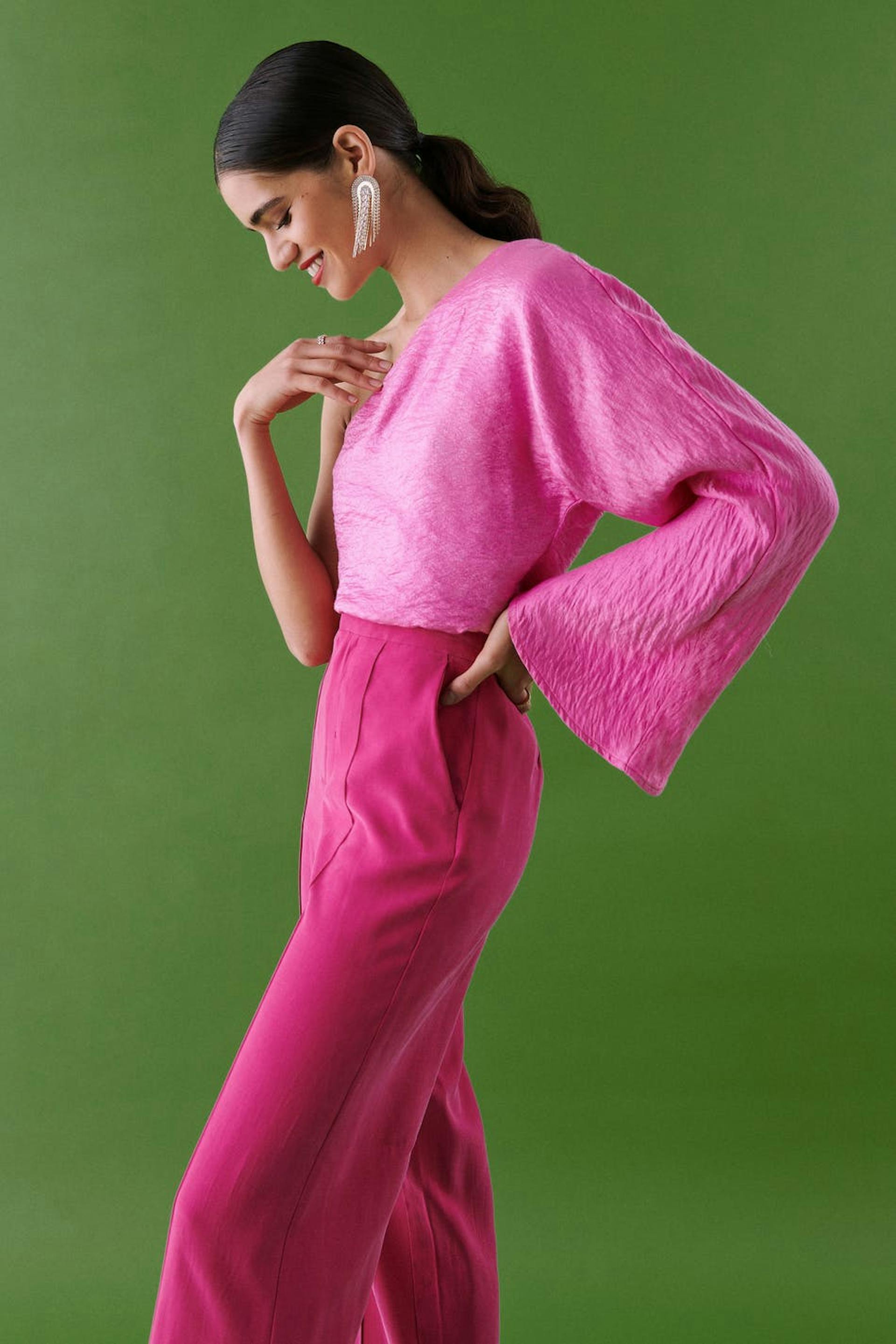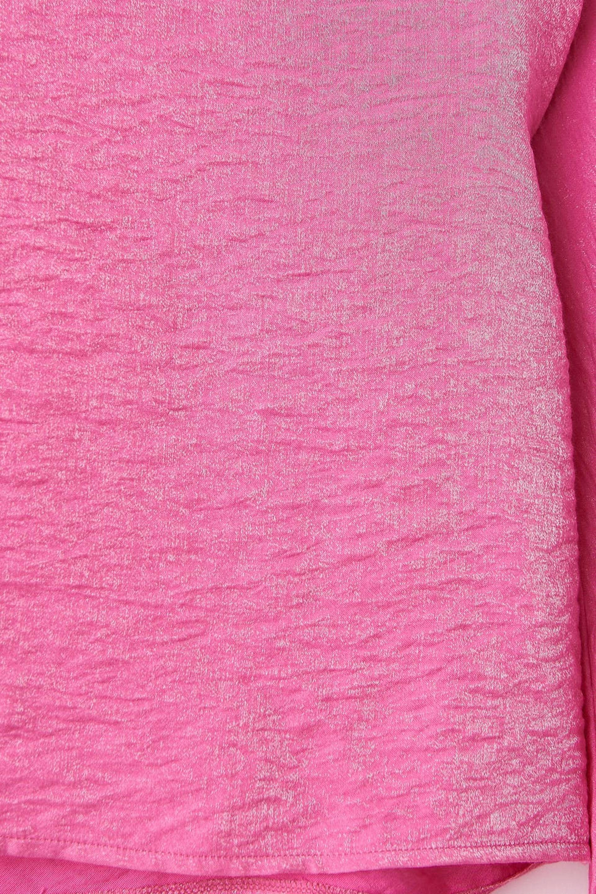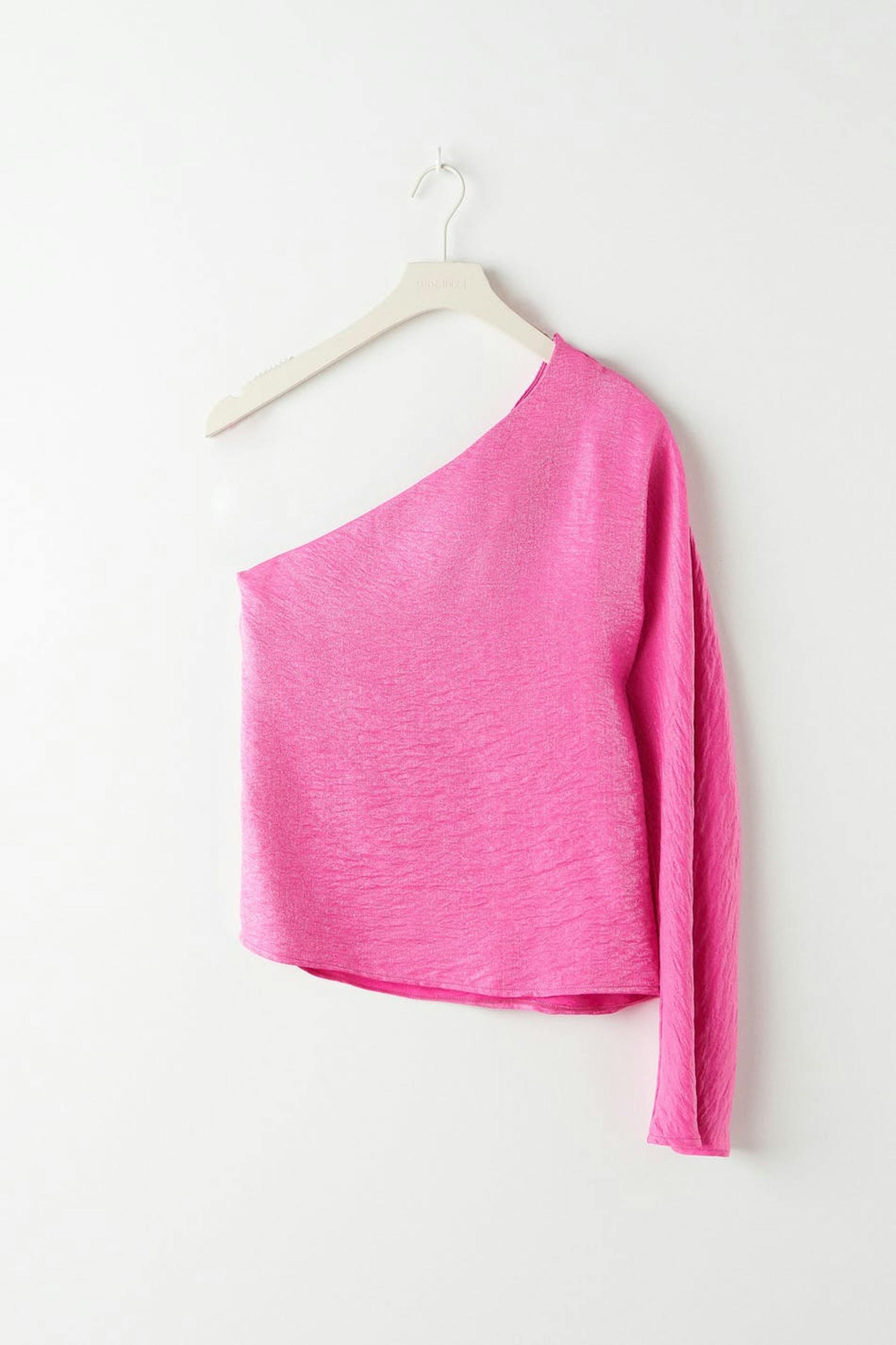 One shoulder top with a wide long sleeve. The top is perfect for the party and pink and has a zip in the side seam.