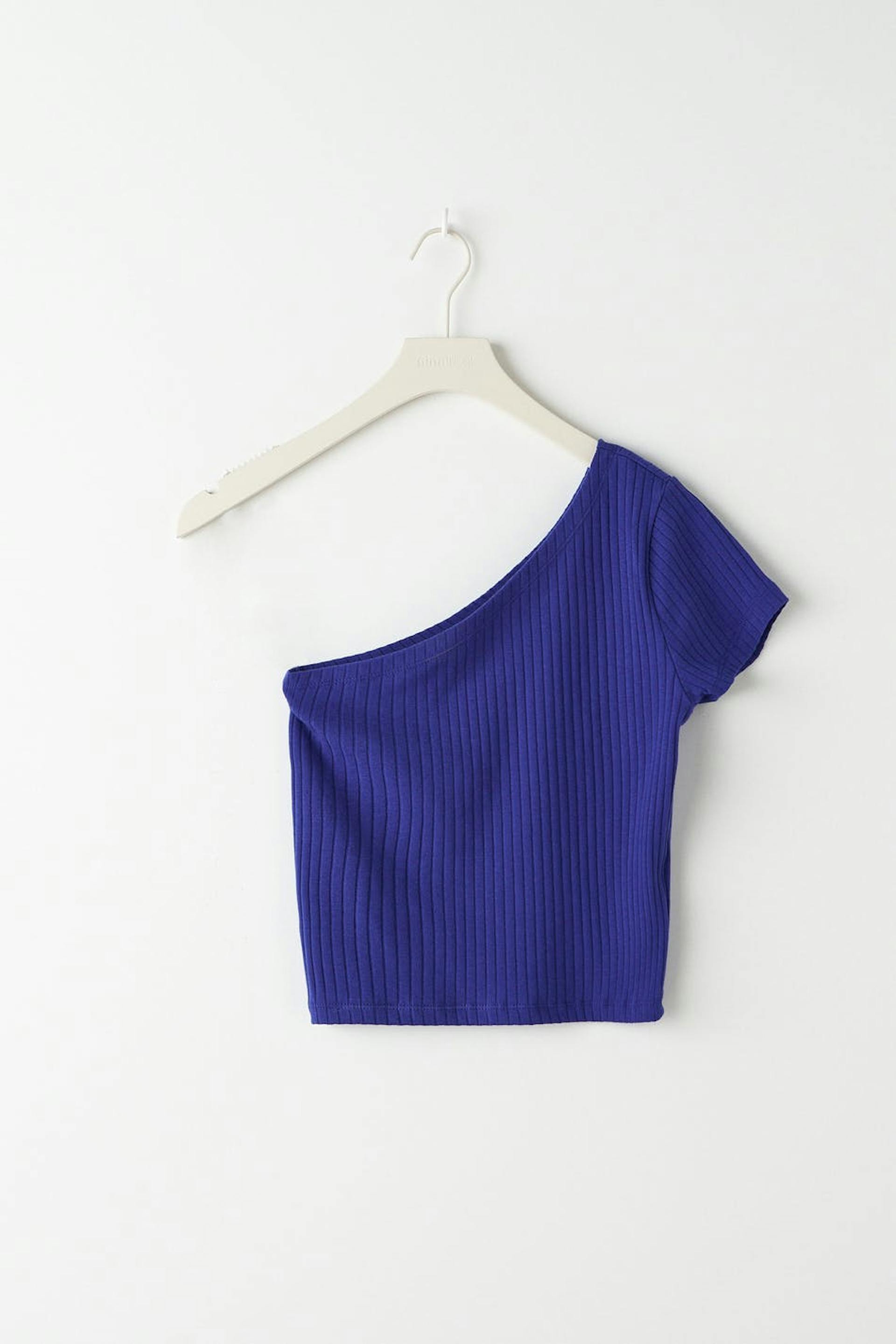 Ribbed off-the-shoulder top in jersey with a fitted fit. The off-the-shoulder top is blue and short-sleeved and has a figure-fit fit.