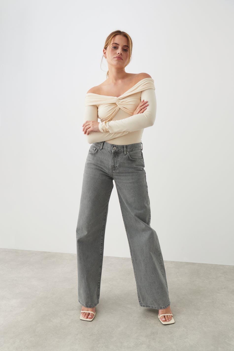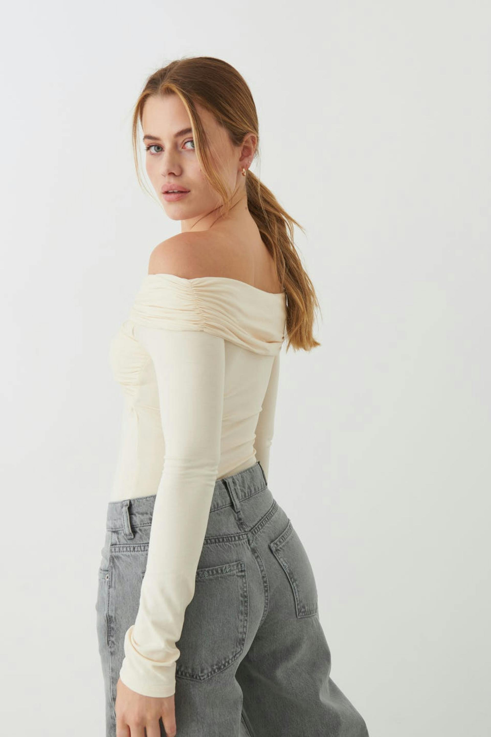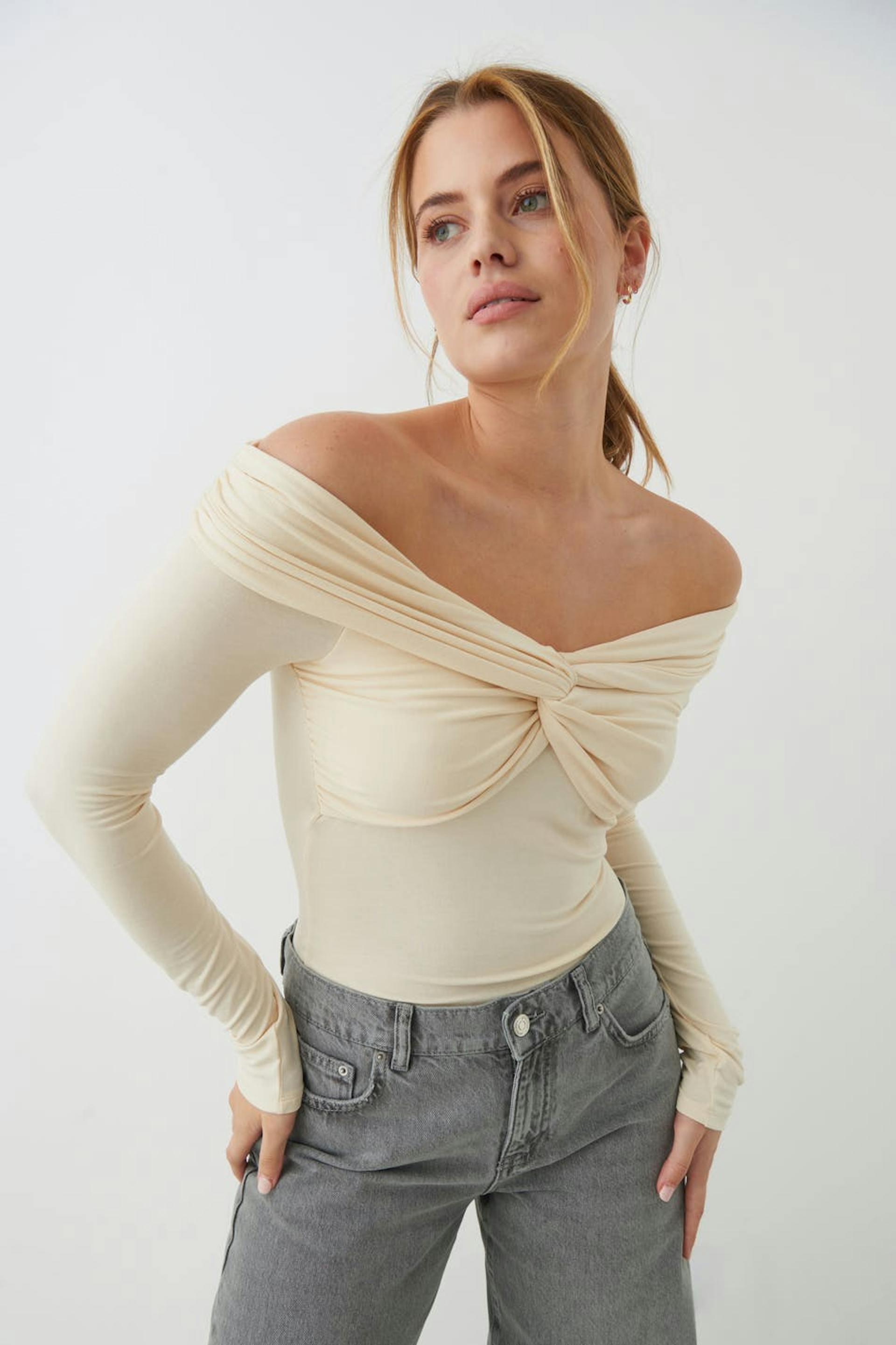 Soft touch – second skin comfort. Long-sleeved off shoulder top in soft viscose with figure-hugging fit. The top is beige and has a wrapover detail with ruching at the front.