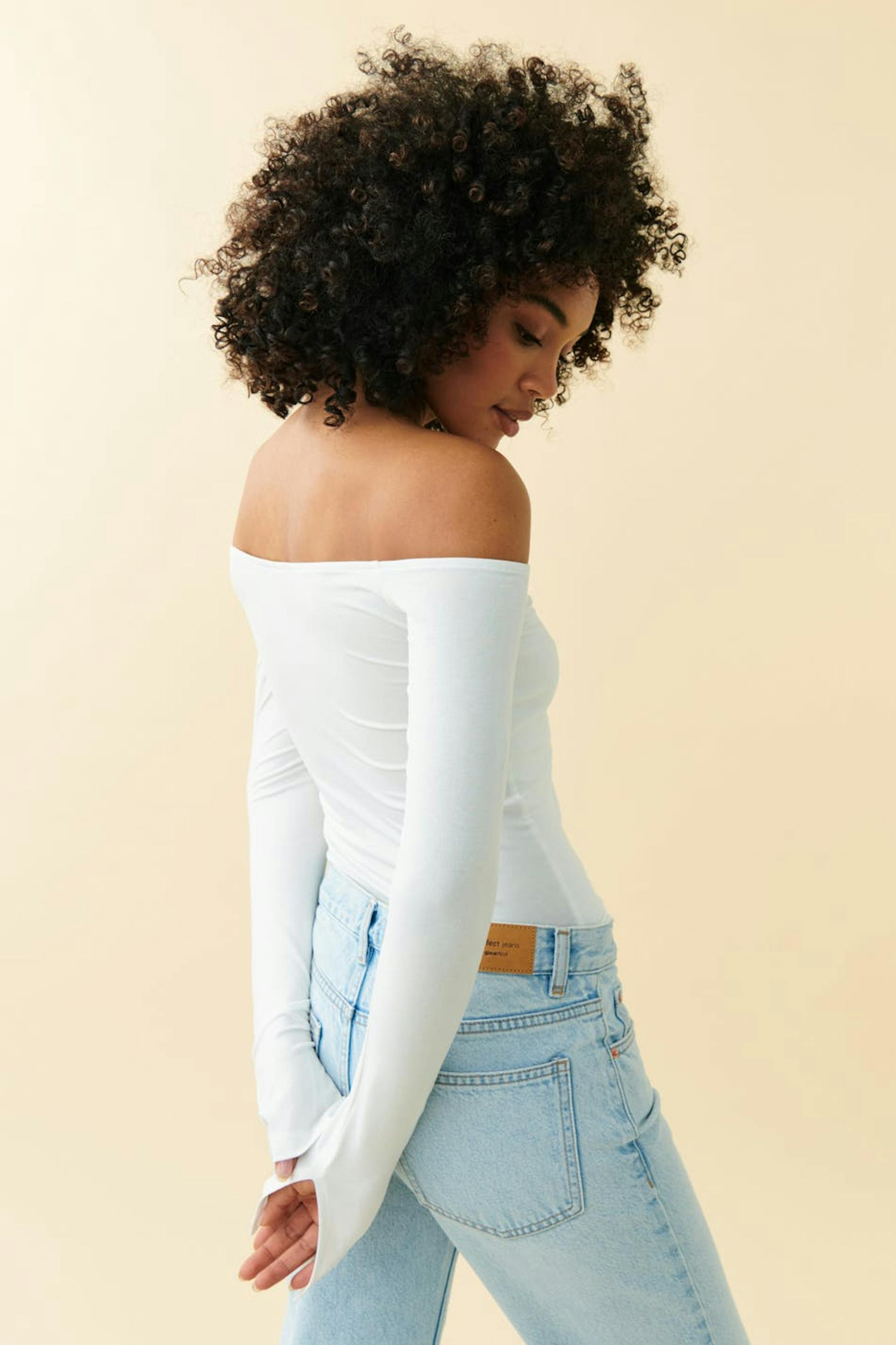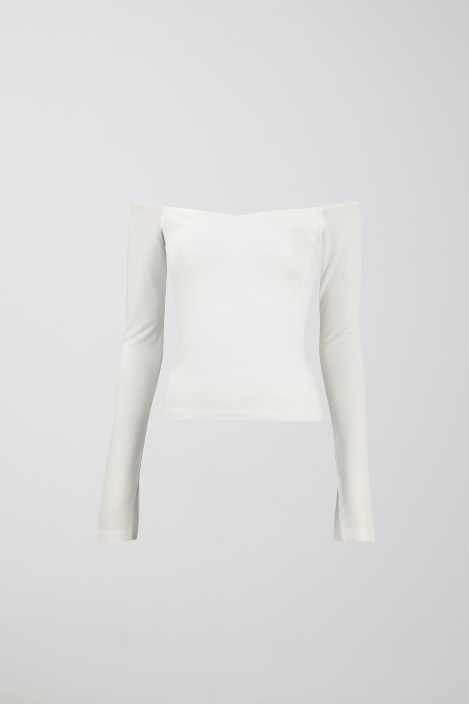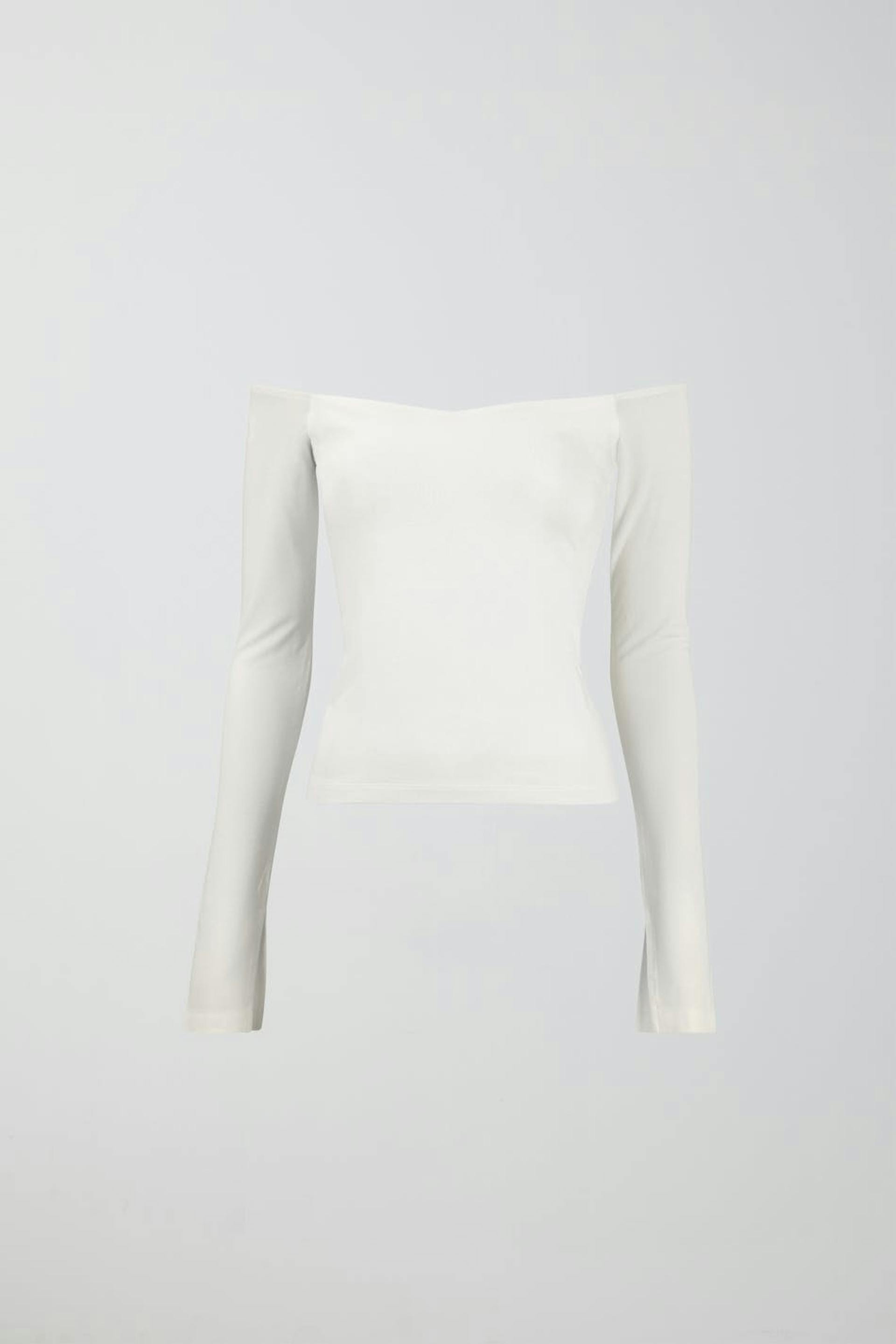Soft touch – second skin comfort. Long-sleeved off shoulder top in soft viscose with slit on the sleeve ends. The top is white and has figure-hugging fit with stretchy quality.